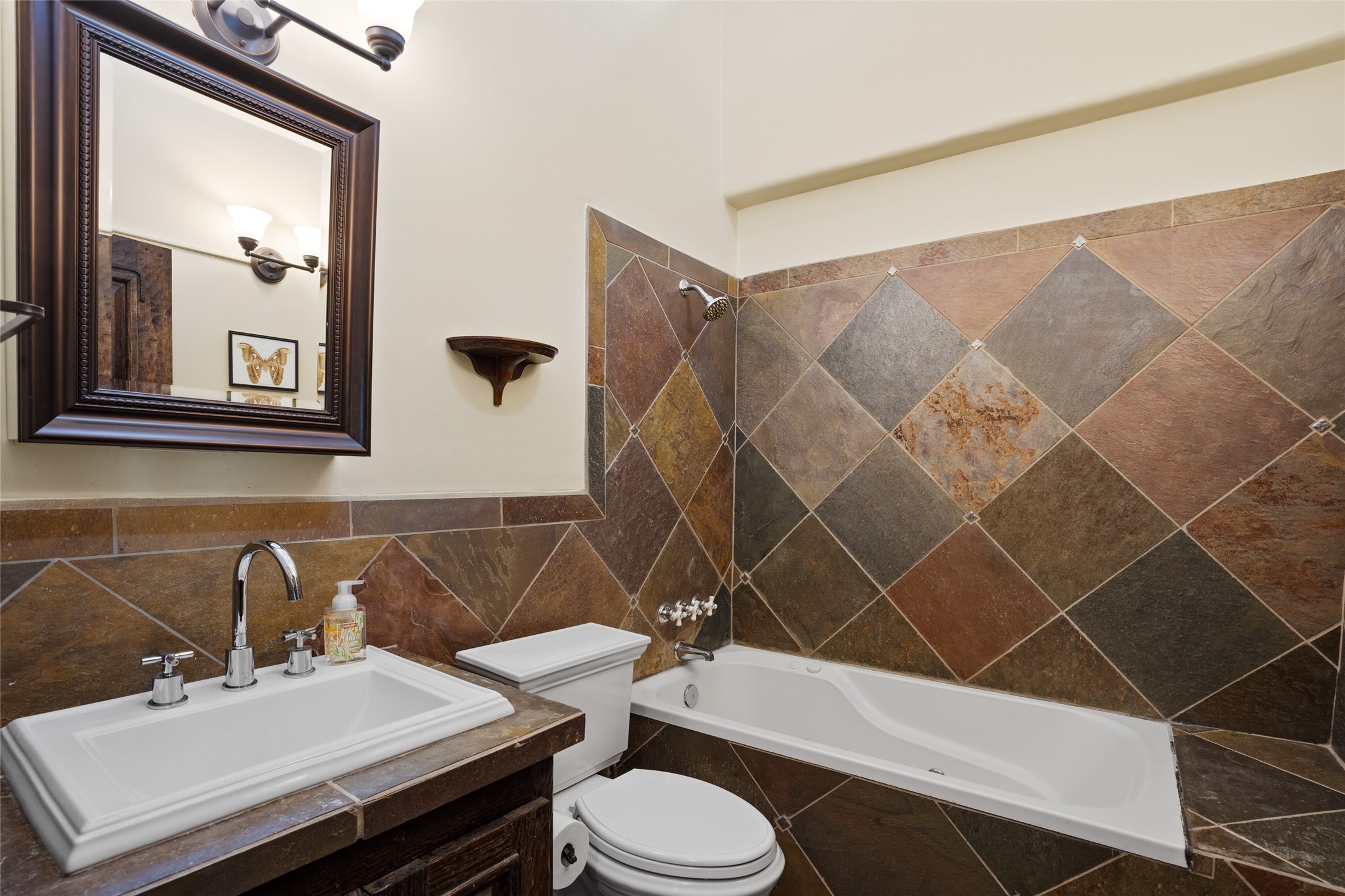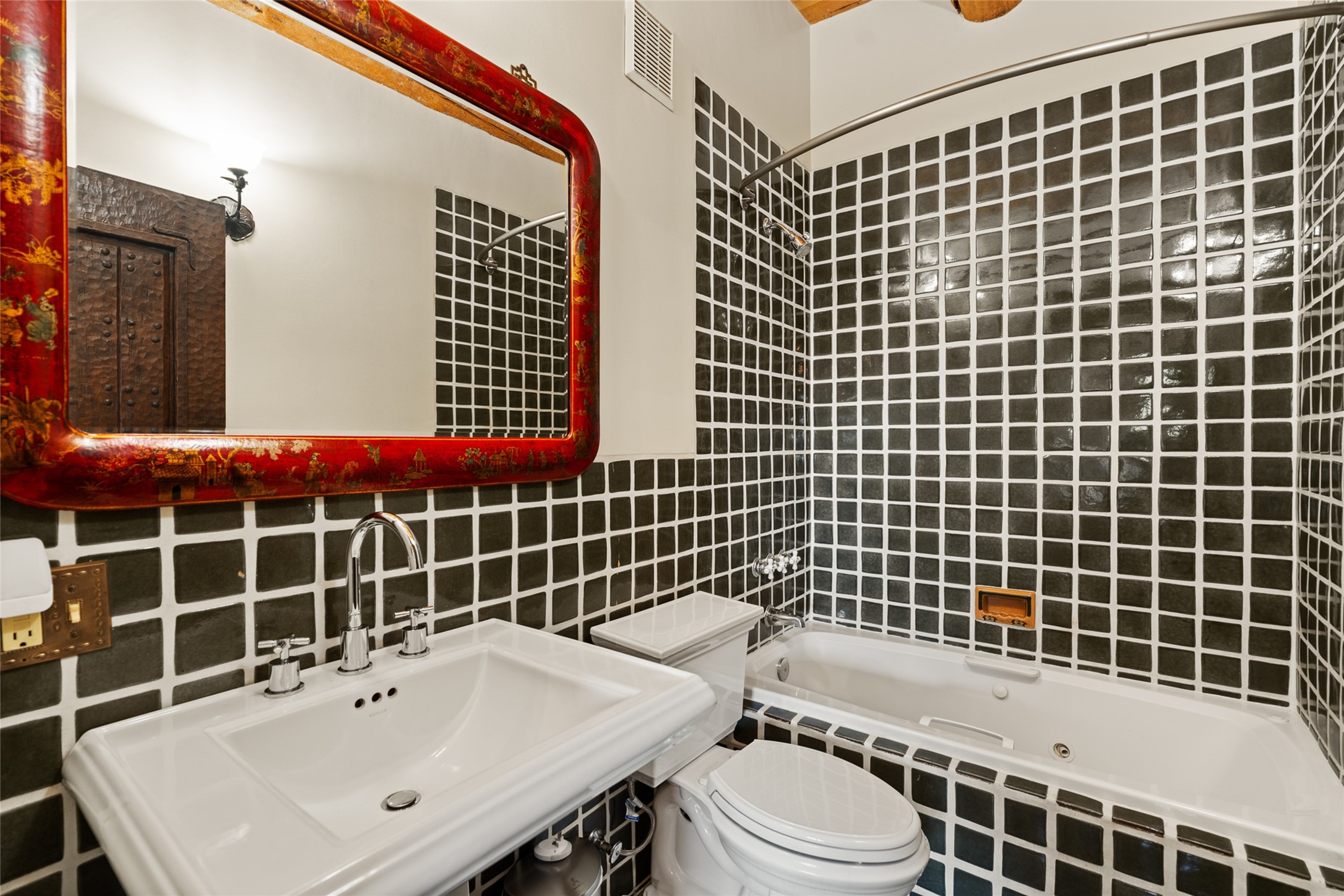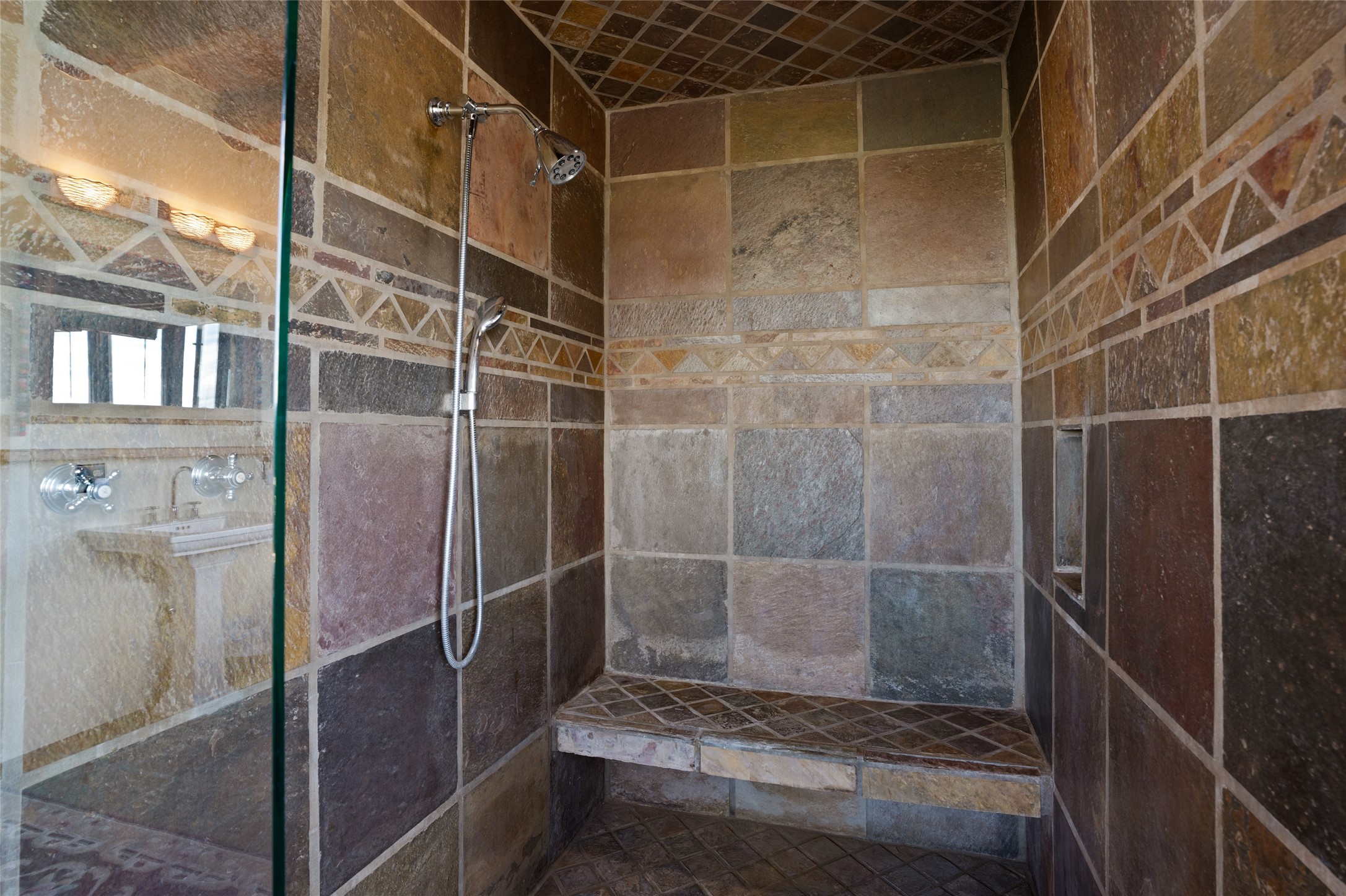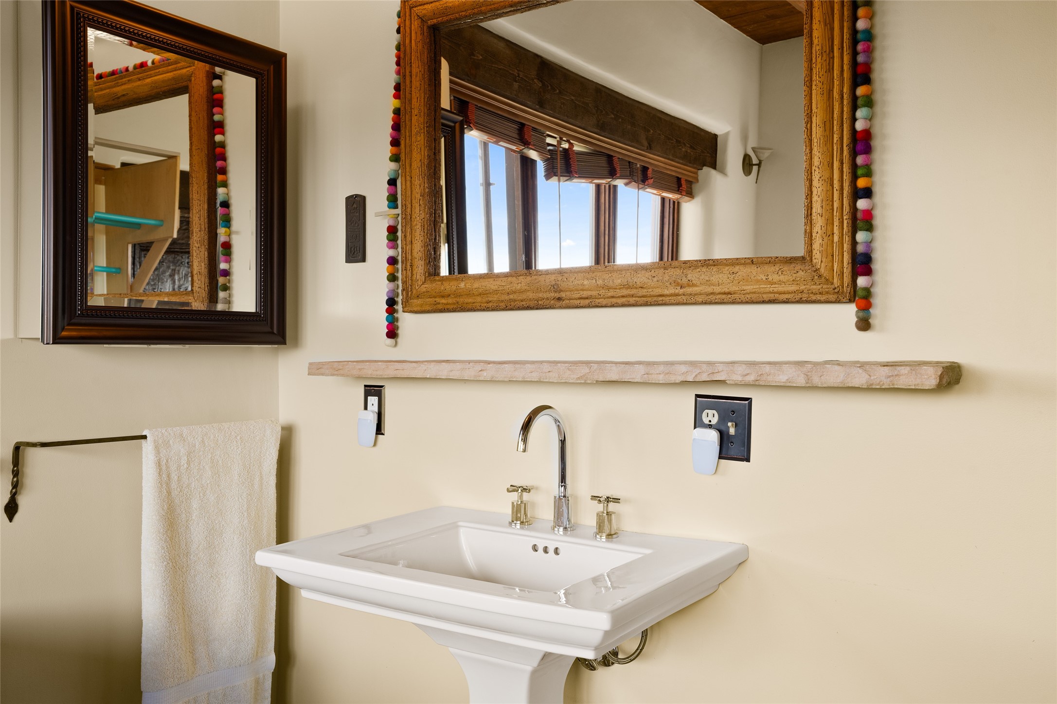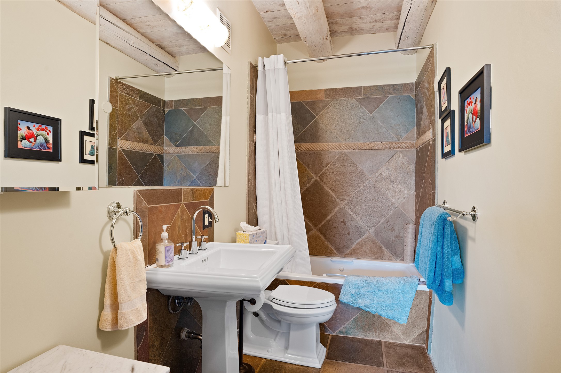 La Querencia is truly a masterful work of art! Built in 1980 with double adobe construction, hand adzed mesquite doors and windows throughout, high coved ceilings with wonderful old vigas, fabulous wrought iron chandeliers, hand cut tin sconces and chandeliers, nichos, curved walls and lovely slate stone tile flooring. It sits on 11.5 horse friendly acres, with an acre of fenced paddock space and tac room as well as proximity to BLM land and huge views to both the Sangre and Jemez mountain ranges. The 4,203 sq ft main house has radiant heat as well as mini splits in all the main rooms for both cooling and heat. Passing through the arched front gate and by the sparkling pool, one enters through magnificent French doors into a large entry/dining room with a fireplace, vigas and latilla ceiling, and views to both sunrise and sunset. Off the entry through incredible tall curved mesquite doors lies the living room with floor to ceiling bookcases, kiva fireplace and 3 sets of French doors opening to the wrap around covered portal for indoor/outdoor living. Down a curved hallway is the primary bedroom suite with an office or sitting space, tall kiva fireplace and large en suite bath with a Japanese soaking tub, spacious shower and his and hers walk in closets. The French doors from the main bedroom open again to the covered portal for nighttime soaking and stargazing from the new Hotspring spa. Down another curved hallway off the entry/dining is a chef's kitchen newly redone with quartz countertops, new cabinets with the same classic cut tin decorative fronts, new sinks, Miele dishwasher, Sub Zero full fridge and freezer. There are also 2 ovens and a 6 burner plus griddle cooktop. The cut tin chandeliers complete the scene and French doors to the covered portal make for easy outdoor grilling and dining. Following the hallway down the other side of the house is the laundry, family/media room and 3 guest bedrooms each with their own bath. The house is oriented around the South facing swimming pool and enclosed courtyard for enjoying protected outdoor seating and swimming. The swimming pool has new pumps, controller and filter, heat pump and sub panel. And the main house has a new boiler, tankless hot water heater and toilets, sinks and faucets have been replaced.The 1297 sq ft 2 bedroom 2 bath casita is pumice poured construction and is nicely separated from the main house for privacy for guests or caretaker, while close to the main 2 car garage. The living space in the guesthouse has great views, kiva fireplace and a new induction cooktop. The two bedrooms each have their own en suite baths, large walk in closets and the second bedroom has outdoor access for privacy for both bedrooms. There is also a new boiler for the radiant heat, tankless hot water heater and mini splits for heat and cooling in all the rooms. A studio/workshop/RV garage was built in 2020 and an extra garage done in 2023 - both close to the horse area. There was also a separate permitted drive added for both RV and horse trailer access. The studio/workshop/ RV garage has Anderson windows and also a mini split for heat and cooling, so could make a very cool artist's studio. The land is beautiful with flower gardens, aspens, fruit trees and a little grassy space all enjoyed off the covered wrap around portal. Don't worry about watering! There is a private well with a new well pit, pressure and pump tank and a whole house generator in case the power goes out, the water won't! This is an incredible estate - spectacular views, profound quiet, friendly neighbors and all about 20 minutes to town!