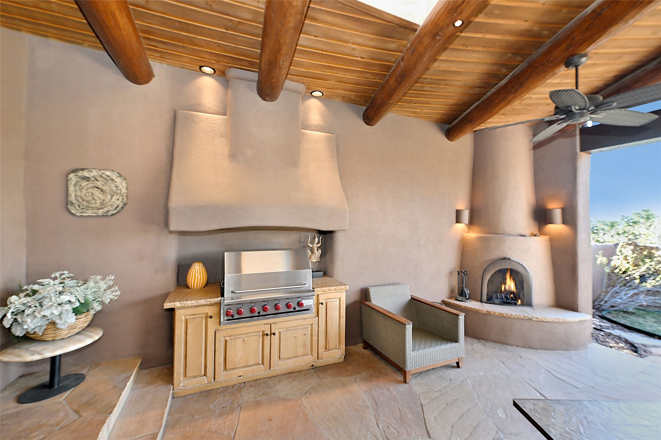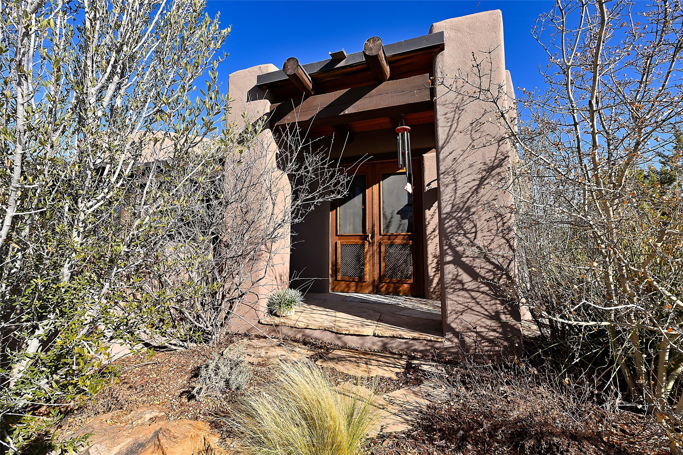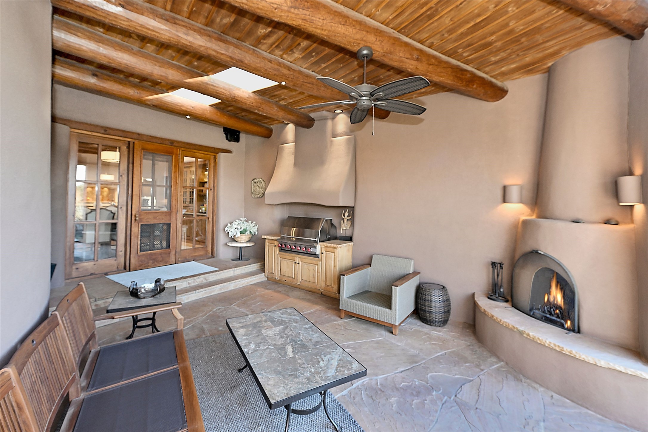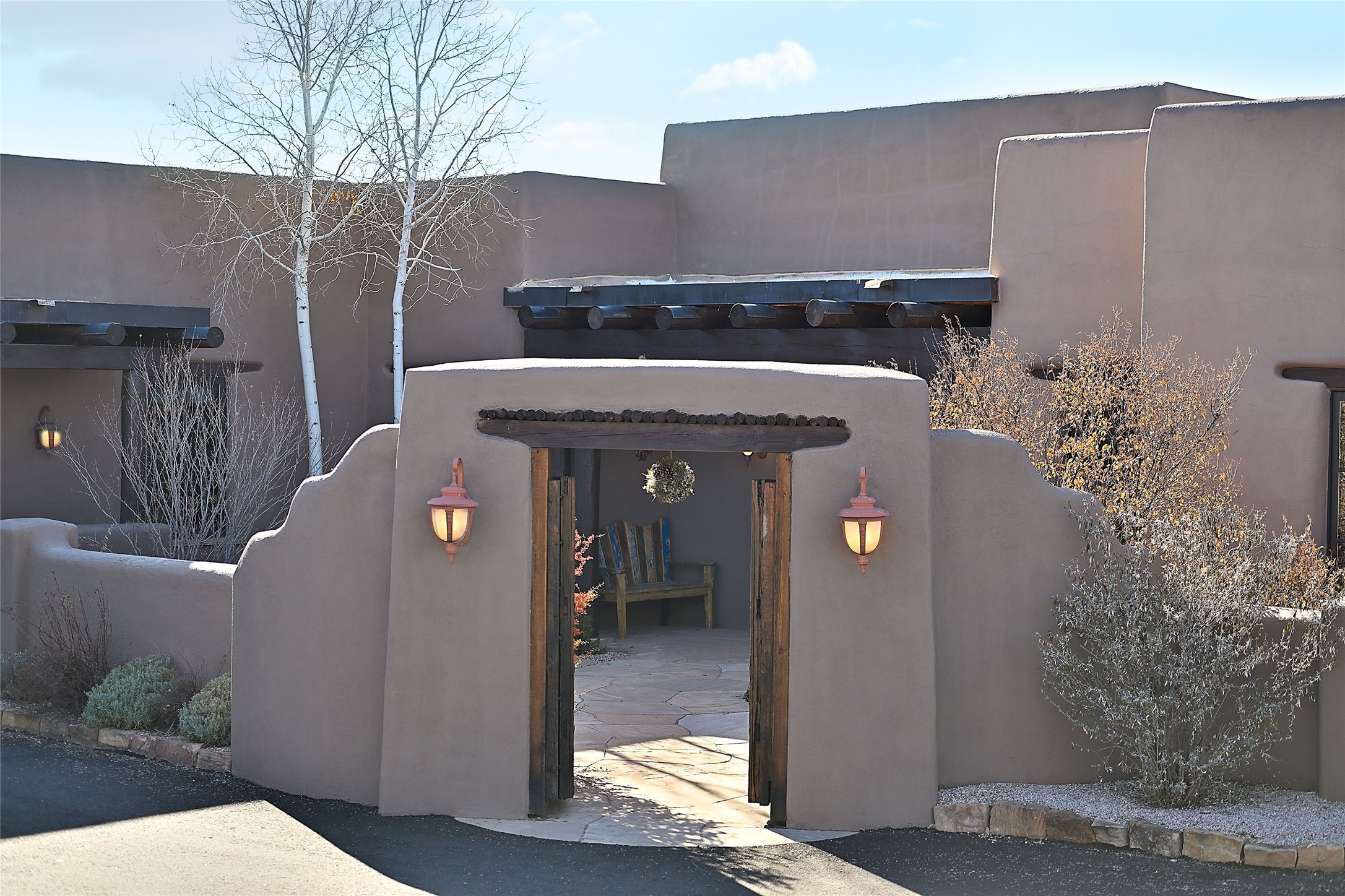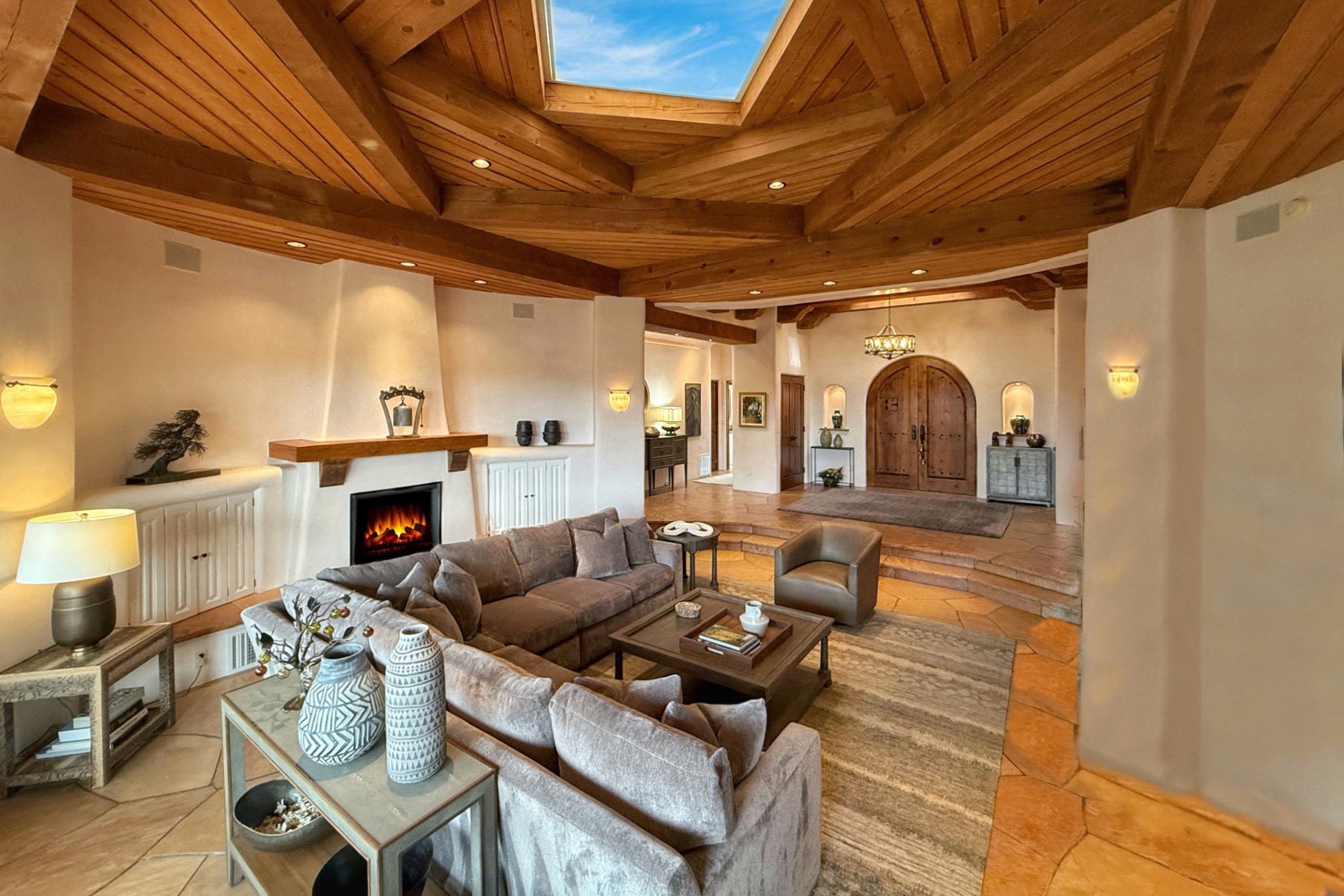 Santa Fe charm with lots of natural light in the prestigious Las Campanas community. This custom-built home combines luxury, privacy and contemporary comfort within a secure, gated setting. Its thoughtful design and high-end finishes offer an elevated living experience throughout. Upon entering, you'll be welcomed by a spacious, open layout with coved ceilings, flagstone floors and a seamless transition between indoor and outdoor spaces. The living room features expansive windows framing breathtaking western views, a striking wood ceiling design, a skylight and a wood-burning fireplace. A curved banco and soaring ceilings enhance the room's inviting atmosphere. The updated chef's kitchen boasts top-tier appliances including a 6-burner Wolf range and double oven and a Sub-Zero fridge and wine fridge. These state-of-the-art appliances are seamlessly integrated into custom cabinetry, creating a cohesive and functional space. The kitchen also features luxurious Taj Mahal quartzite countertops with a leather finish and a large island for meal prep and socializing. A spacious butler's pantry with desk space offers additional convenience. The adjacent dining room includes built-in cabinetry and opens to a wrap-around covered portal, ideal for alfresco dining. The outdoor space is complemented by a wood-burning kiva fireplace and a built-in Wolf grill--perfect for relaxing or entertaining. This home is designed for ultimate privacy, with a separate two-bedroom, two-bathroom guest wing. The primary bedroom offers a spacious and tranquil experience, a wood-burning kiva fireplace, upgraded windows and a private patio for enhanced comfort and seclusion. The luxurious en-suite bathroom includes a skylight, dual vanities, a stunning walk-in shower and BainUltra jetted soaking tub for spa-like enjoyment. A bonus room at the front of the house offers the flexibility of an extra bedroom, office space or TV room. The opportunities for outdoor living in this property are exceptional, with mature landscaping, multiple private patios off both guest bedrooms and the primary suite offering serene spaces for quiet reflection or enjoyment of the surroundings. The house features retractable custom wind and solar screens designed to afford protection from the elements without compromising the view and offering the ability to create the feeling of an outdoor room. Upgrades throughout the home ensure modern convenience and style, including a fully renovated kitchen, laundry room and all bathrooms, new appliances, Hunter Douglas window treatments, ceiling fans and new, high-end carpeting in three rooms. Additional updates include upgraded HVAC systems and fully-renovated driveway. Along with an EV charging station, the 3-car garage offers plenty of storage and includes a separate utility room. This beautiful residence combines timeless charm with modern luxury, offering an opportunity to live in one of the most desirable communities in Santa Fe.