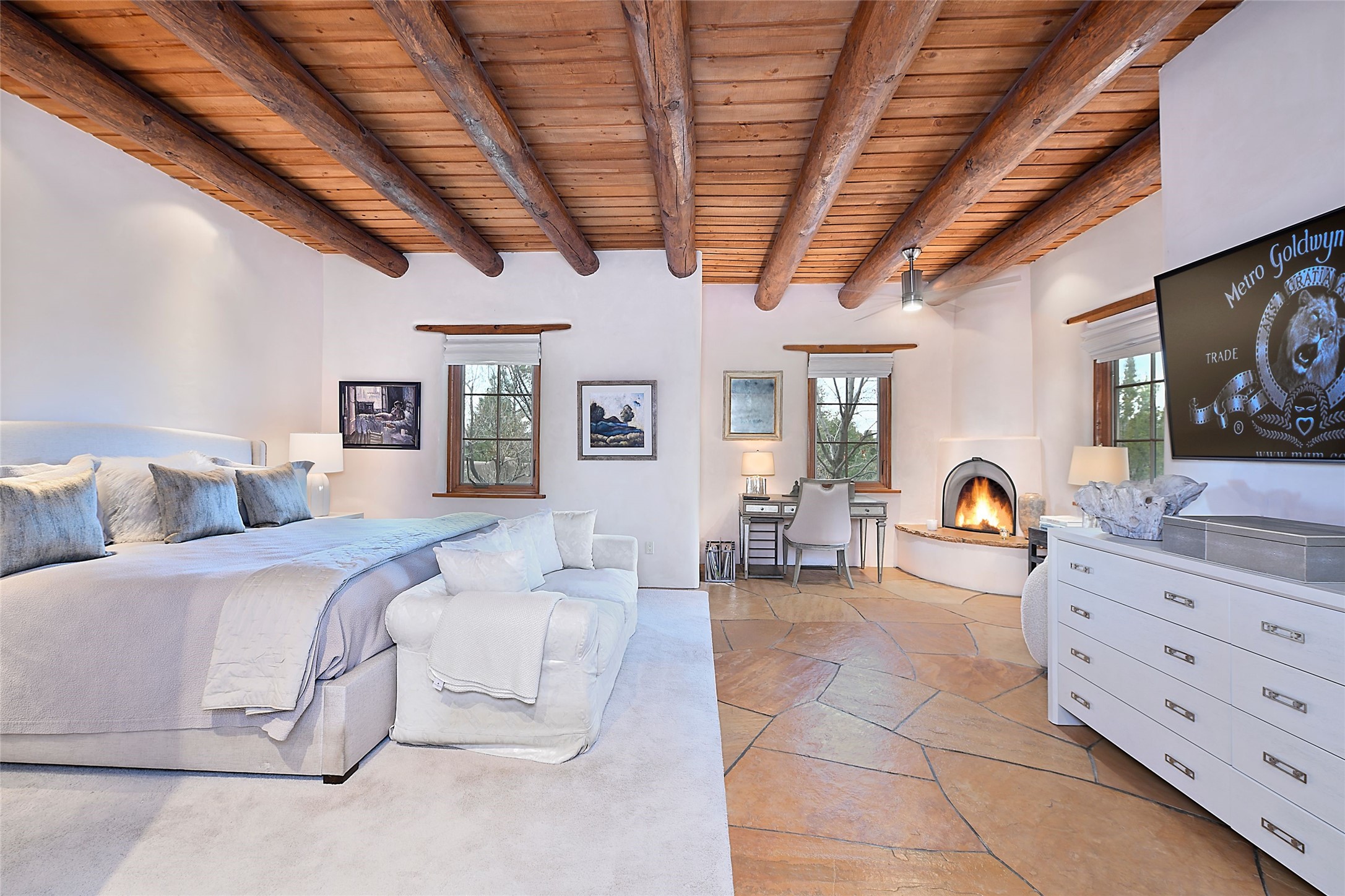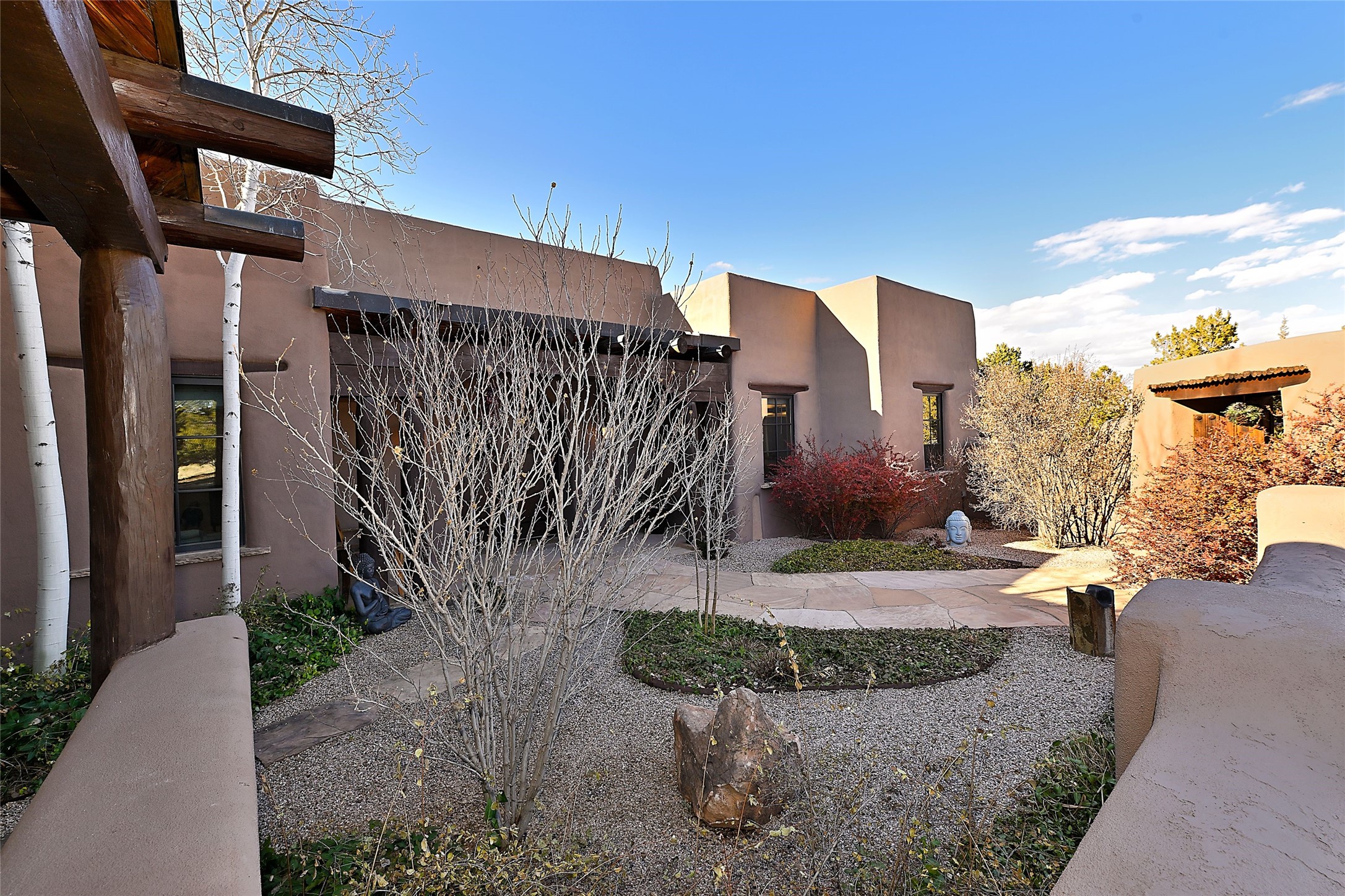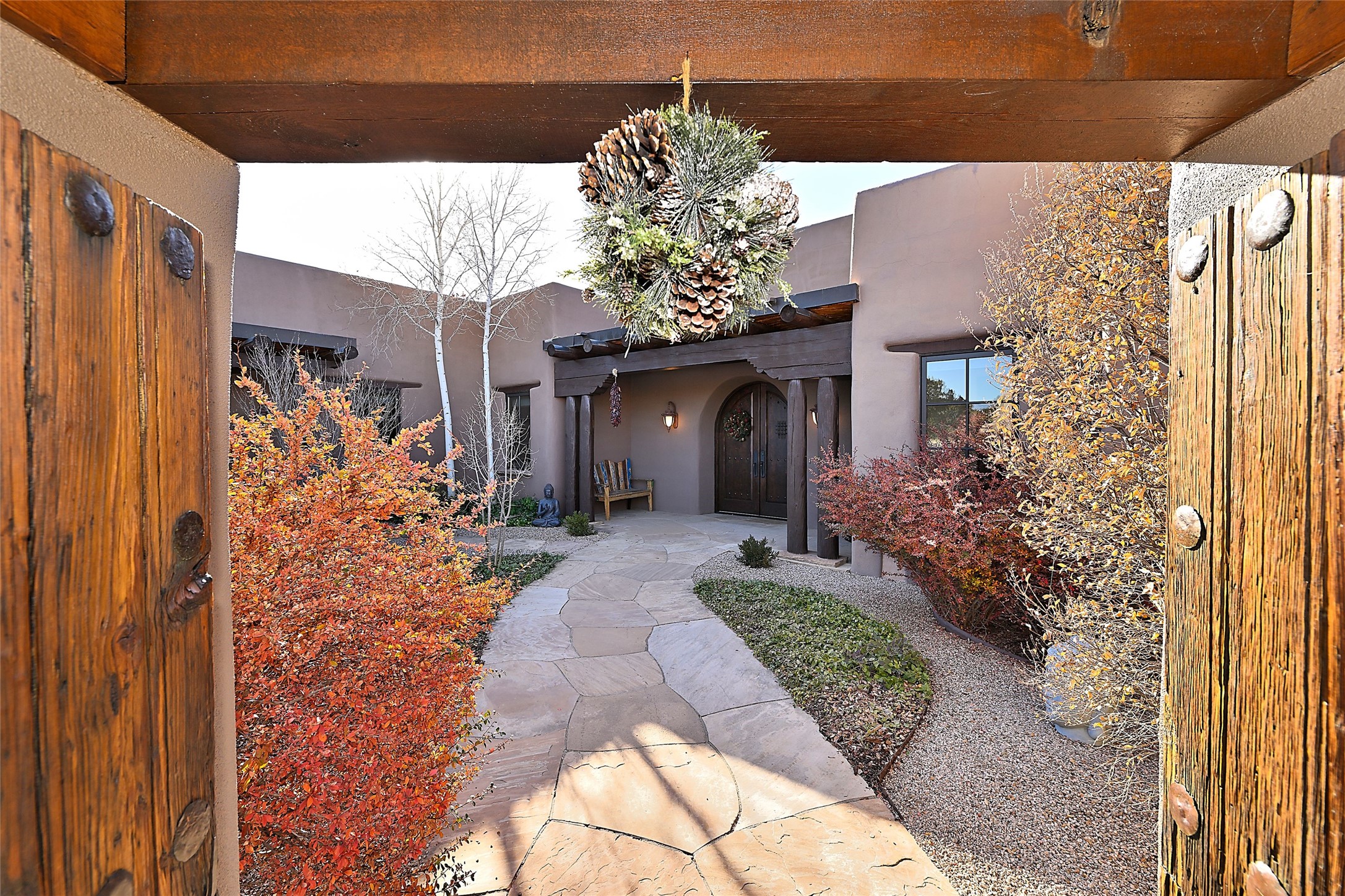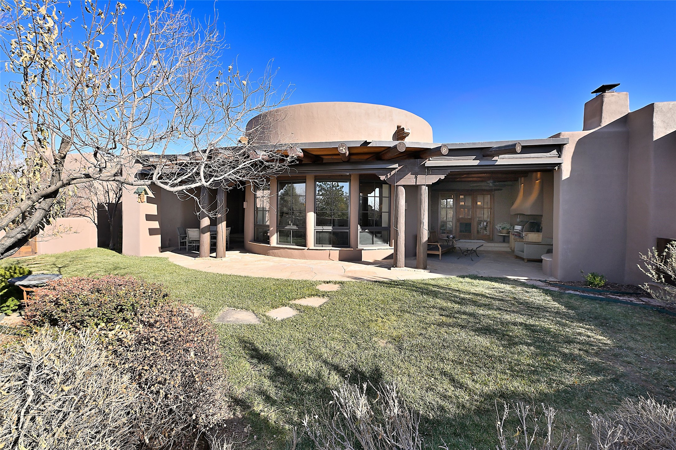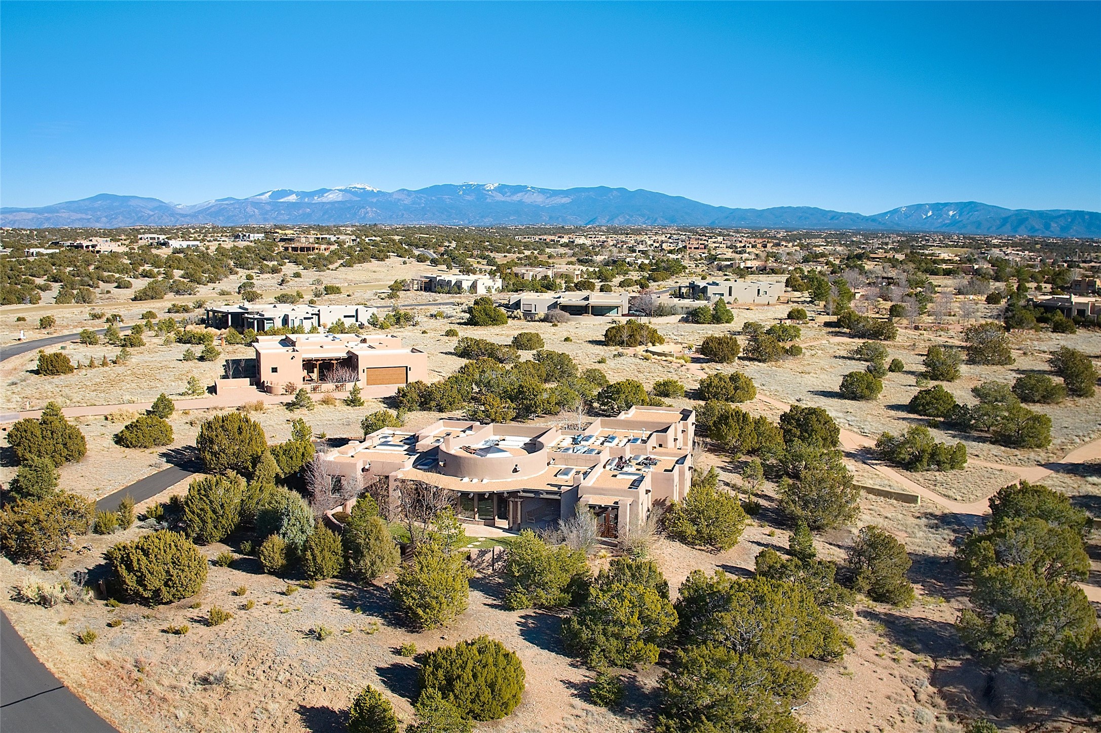 Santa Fe charm with lots of natural light in the prestigious Las Campanas community. This custom-built home combines luxury, privacy and contemporary comfort within a secure, gated setting. Its thoughtful design and high-end finishes offer an elevated living experience throughout. Upon entering, you'll be welcomed by a spacious, open layout with coved ceilings, flagstone floors and a seamless transition between indoor and outdoor spaces. The living room features expansive windows framing breathtaking western views, a striking wood ceiling design, a skylight and a wood-burning fireplace. A curved banco and soaring ceilings enhance the room's inviting atmosphere. The updated chef's kitchen boasts top-tier appliances including a 6-burner Wolf range and double oven and a Sub-Zero fridge and wine fridge. These state-of-the-art appliances are seamlessly integrated into custom cabinetry, creating a cohesive and functional space. The kitchen also features luxurious Taj Mahal quartzite countertops with a leather finish and a large island for meal prep and socializing. A spacious butler's pantry with desk space offers additional convenience. The adjacent dining room includes built-in cabinetry and opens to a wrap-around covered portal, ideal for alfresco dining. The outdoor space is complemented by a wood-burning kiva fireplace and a built-in Wolf grill--perfect for relaxing or entertaining. This home is designed for ultimate privacy, with a separate two-bedroom, two-bathroom guest wing. The primary bedroom offers a spacious and tranquil experience, a wood-burning kiva fireplace, upgraded windows and a private patio for enhanced comfort and seclusion. The luxurious en-suite bathroom includes a skylight, dual vanities, a stunning walk-in shower and BainUltra jetted soaking tub for spa-like enjoyment. A bonus room at the front of the house offers the flexibility of an extra bedroom, office space or TV room. The opportunities for outdoor living in this property are exceptional, with mature landscaping, multiple private patios off both guest bedrooms and the primary suite offering serene spaces for quiet reflection or enjoyment of the surroundings. The house features retractable custom wind and solar screens designed to afford protection from the elements without compromising the view and offering the ability to create the feeling of an outdoor room. Upgrades throughout the home ensure modern convenience and style, including a fully renovated kitchen, laundry room and all bathrooms, new appliances, Hunter Douglas window treatments, ceiling fans and new, high-end carpeting in three rooms. Additional updates include upgraded HVAC systems and fully-renovated driveway. Along with an EV charging station, the 3-car garage offers plenty of storage and includes a separate utility room. This beautiful residence combines timeless charm with modern luxury, offering an opportunity to live in one of the most desirable communities in Santa Fe.