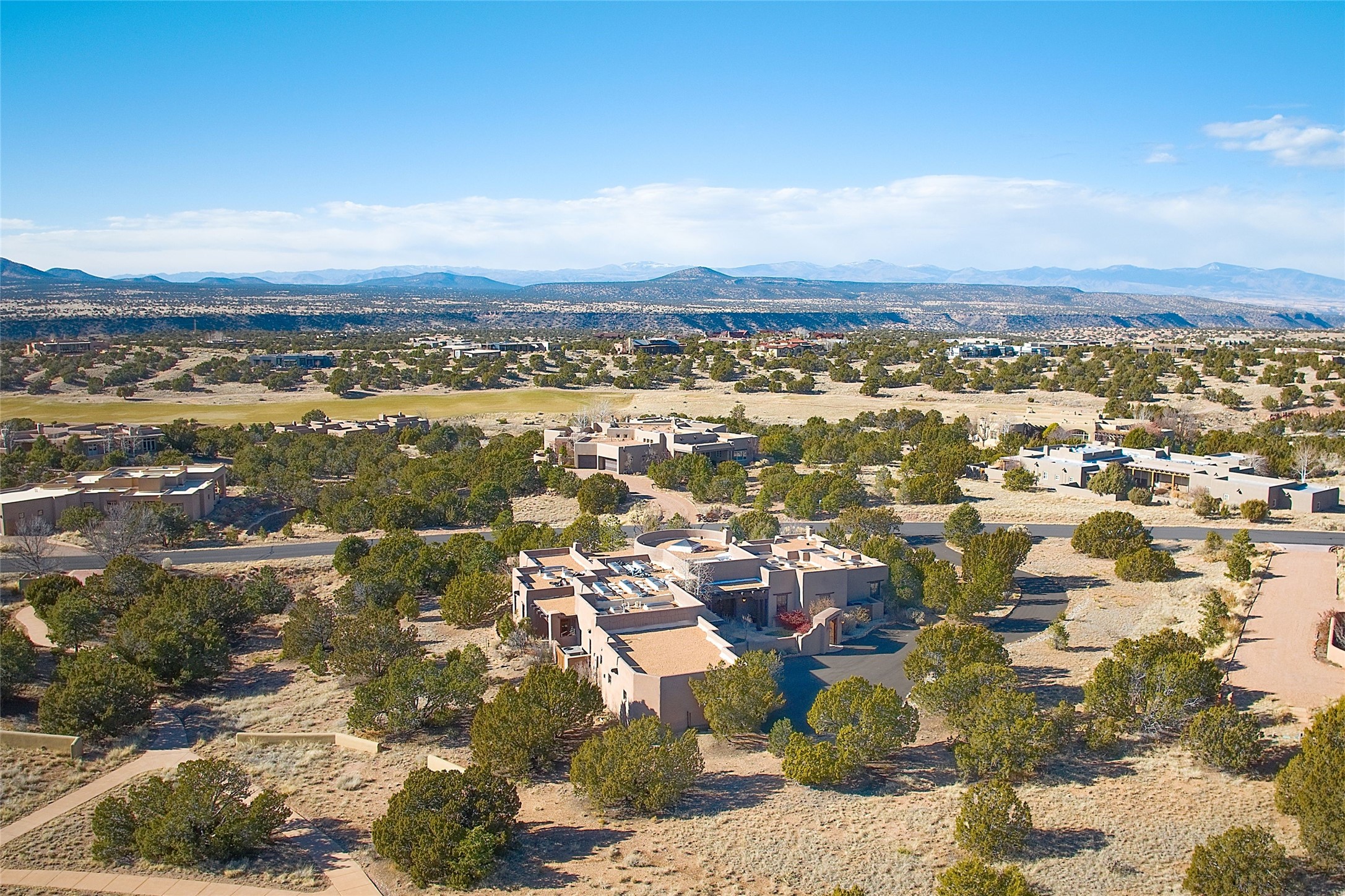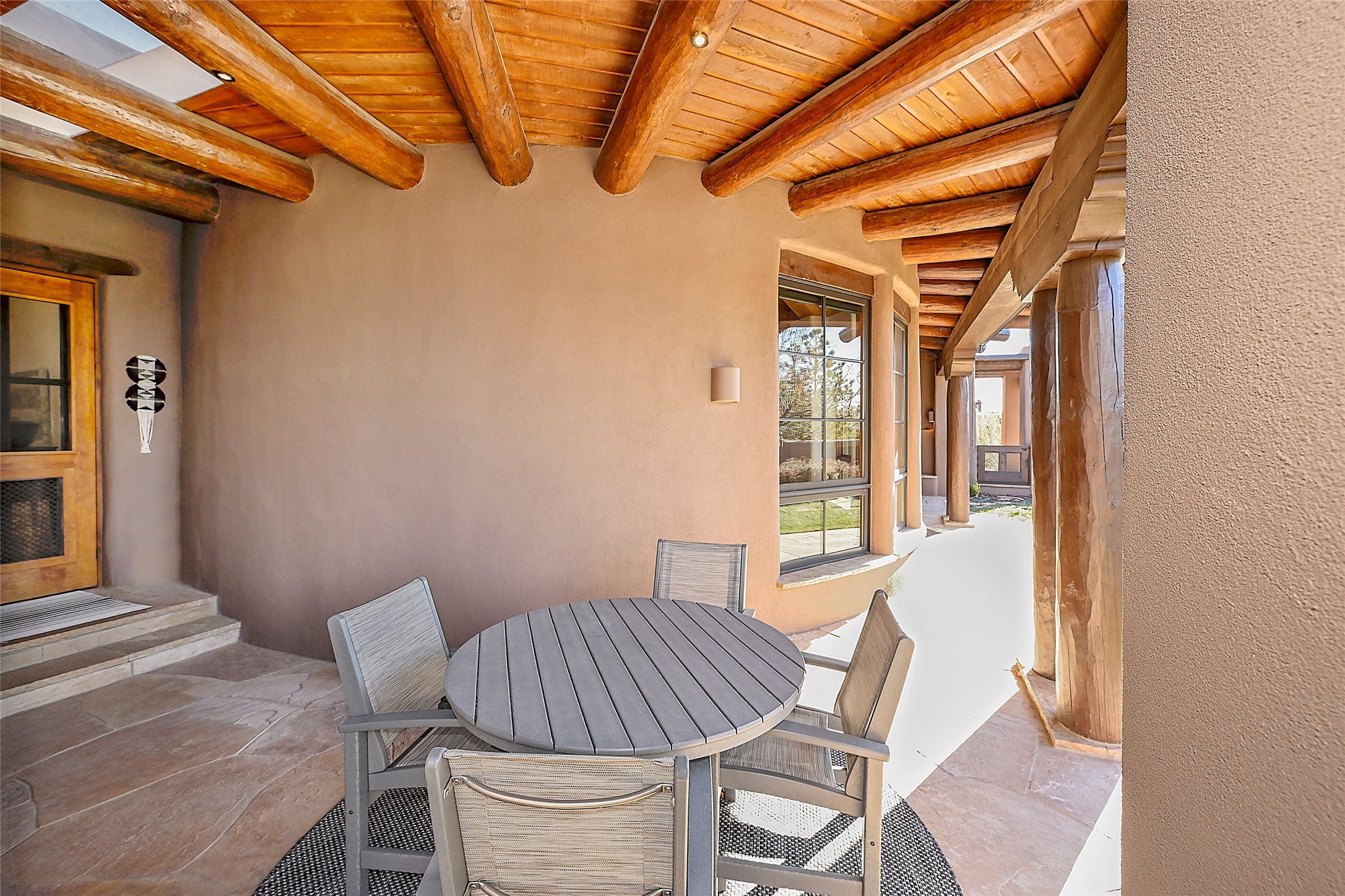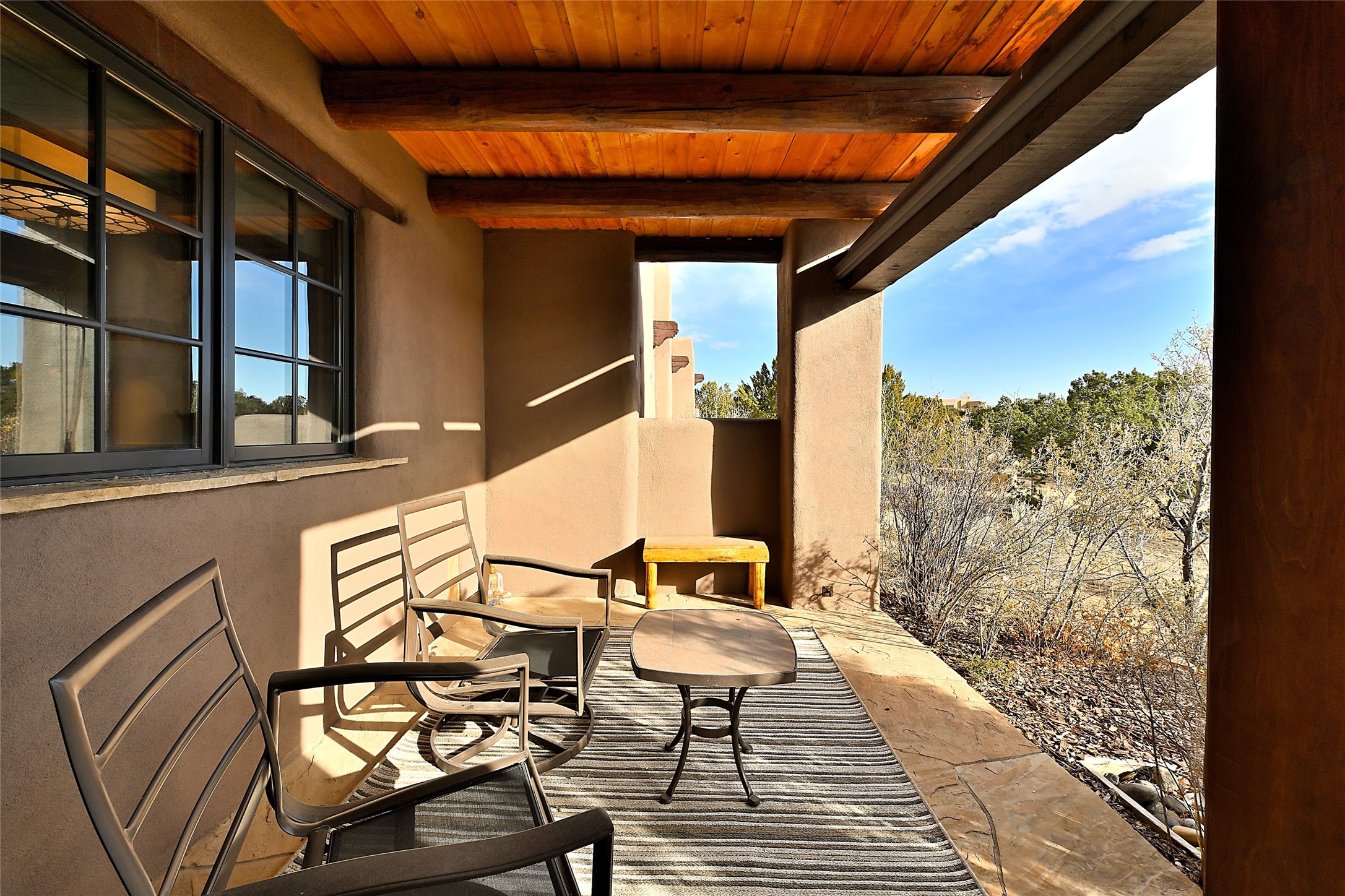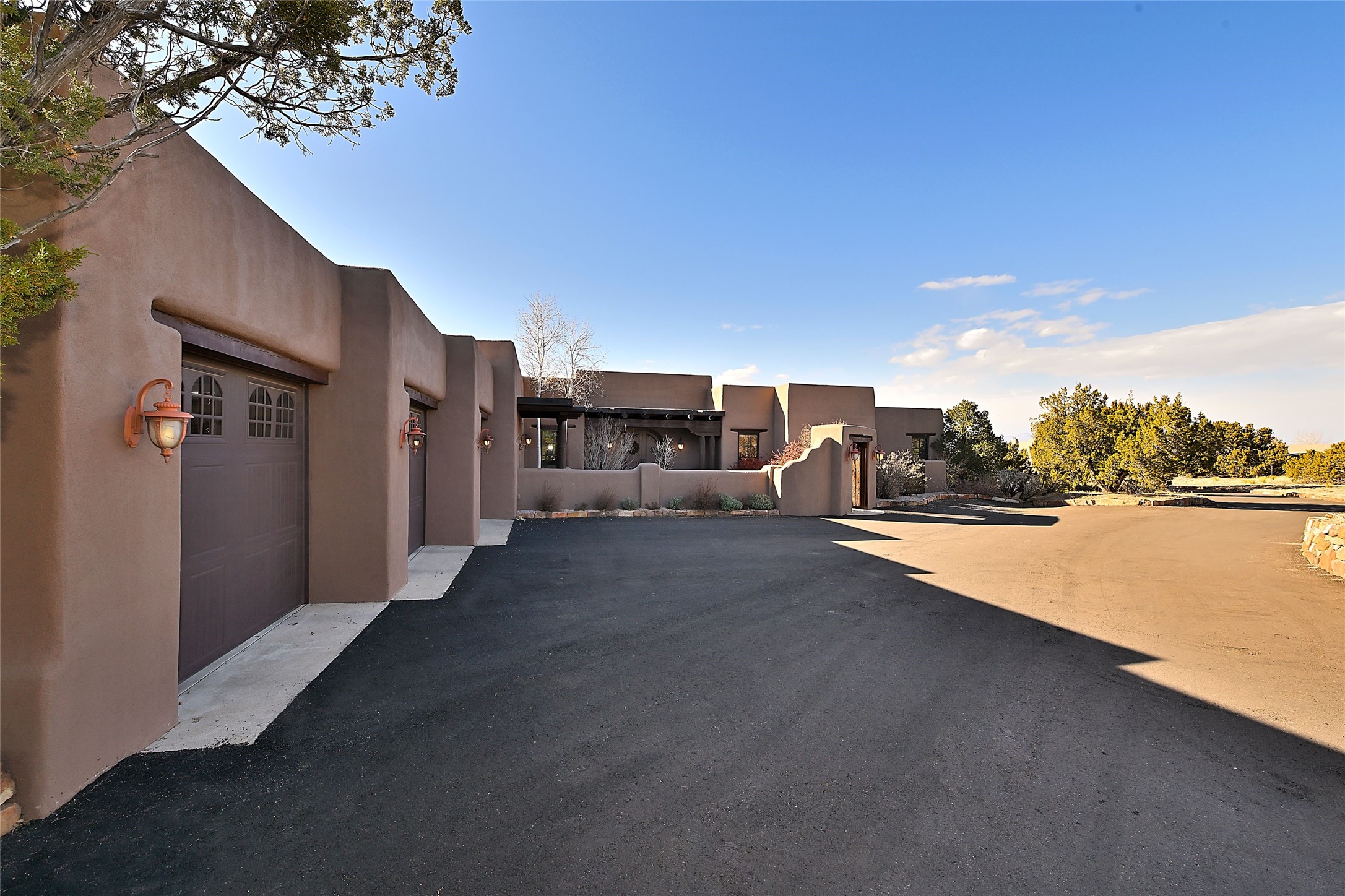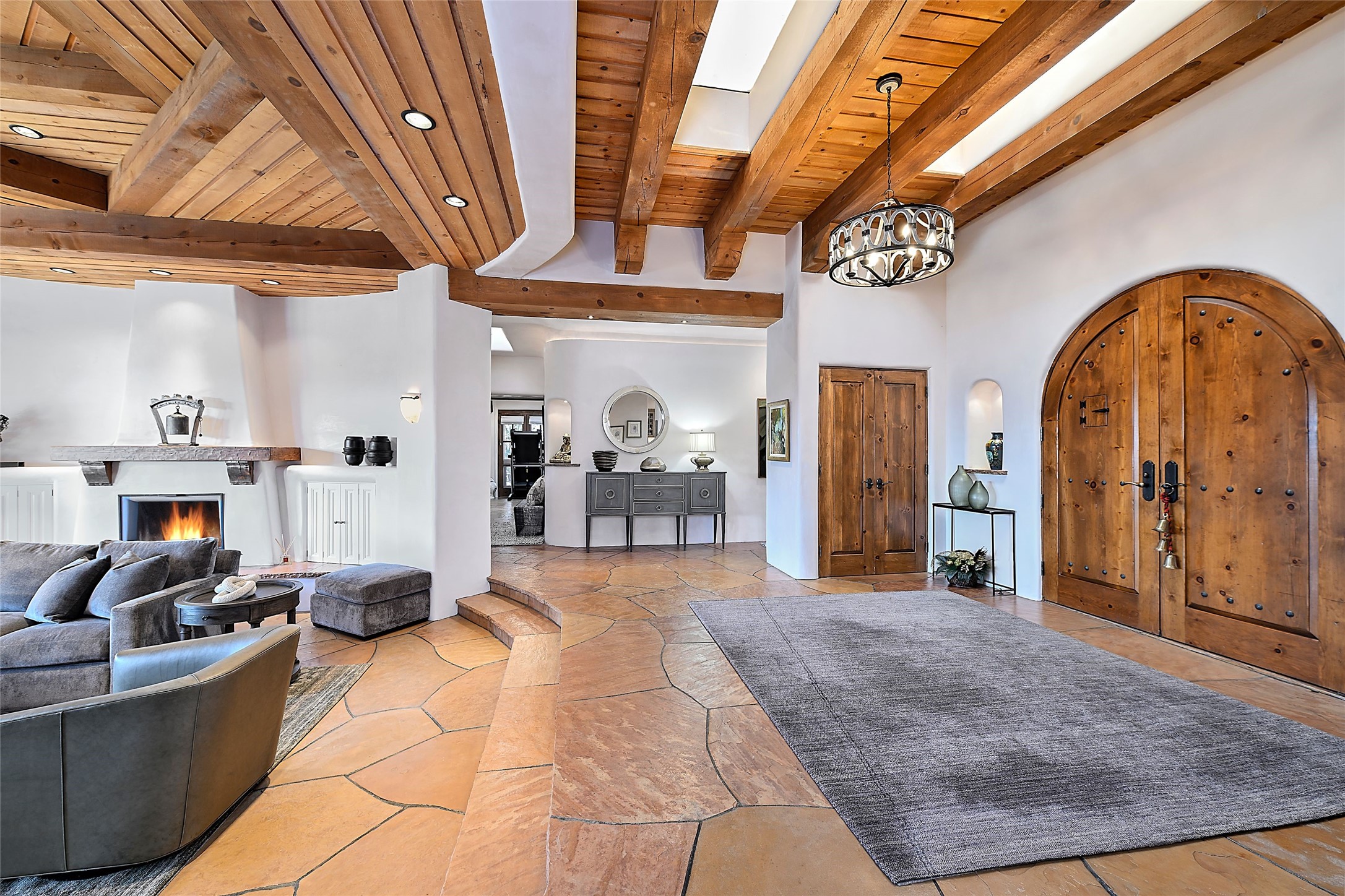Santa Fe charm with lots of natural light in the prestigious Las Campanas community. This custom-built home combines luxury, privacy and contemporary comfort within a secure, gated setting. Its thoughtful design and high-end finishes offer an elevated living experience throughout. Upon entering, you'll be welcomed by a spacious, open layout with coved ceilings, flagstone floors and a seamless transition between indoor and outdoor spaces. The living room features expansive windows framing breathtaking western views, a striking wood ceiling design, a skylight and a wood-burning fireplace. A curved banco and soaring ceilings enhance the room's inviting atmosphere. The updated chef's kitchen boasts top-tier appliances including a 6-burner Wolf range and double oven and a Sub-Zero fridge and wine fridge. These state-of-the-art appliances are seamlessly integrated into custom cabinetry, creating a cohesive and functional space. The kitchen also features luxurious Taj Mahal quartzite countertops with a leather finish and a large island for meal prep and socializing. A spacious butler's pantry with desk space offers additional convenience. The adjacent dining room includes built-in cabinetry and opens to a wrap-around covered portal, ideal for alfresco dining. The outdoor space is complemented by a wood-burning kiva fireplace and a built-in Wolf grill--perfect for relaxing or entertaining. This home is designed for ultimate privacy, with a separate two-bedroom, two-bathroom guest wing. The primary bedroom offers a spacious and tranquil experience, a wood-burning kiva fireplace, upgraded windows and a private patio for enhanced comfort and seclusion. The luxurious en-suite bathroom includes a skylight, dual vanities, a stunning walk-in shower and BainUltra jetted soaking tub for spa-like enjoyment. A bonus room at the front of the house offers the flexibility of an extra bedroom, office space or TV room. The opportunities for outdoor living in this property are exceptional, with mature landscaping, multiple private patios off both guest bedrooms and the primary suite offering serene spaces for quiet reflection or enjoyment of the surroundings. The house features retractable custom wind and solar screens designed to afford protection from the elements without compromising the view and offering the ability to create the feeling of an outdoor room. Upgrades throughout the home ensure modern convenience and style, including a fully renovated kitchen, laundry room and all bathrooms, new appliances, Hunter Douglas window treatments, ceiling fans and new, high-end carpeting in three rooms. Additional updates include upgraded HVAC systems and fully-renovated driveway. Along with an EV charging station, the 3-car garage offers plenty of storage and includes a separate utility room. This beautiful residence combines timeless charm with modern luxury, offering an opportunity to live in one of the most desirable communities in Santa Fe.