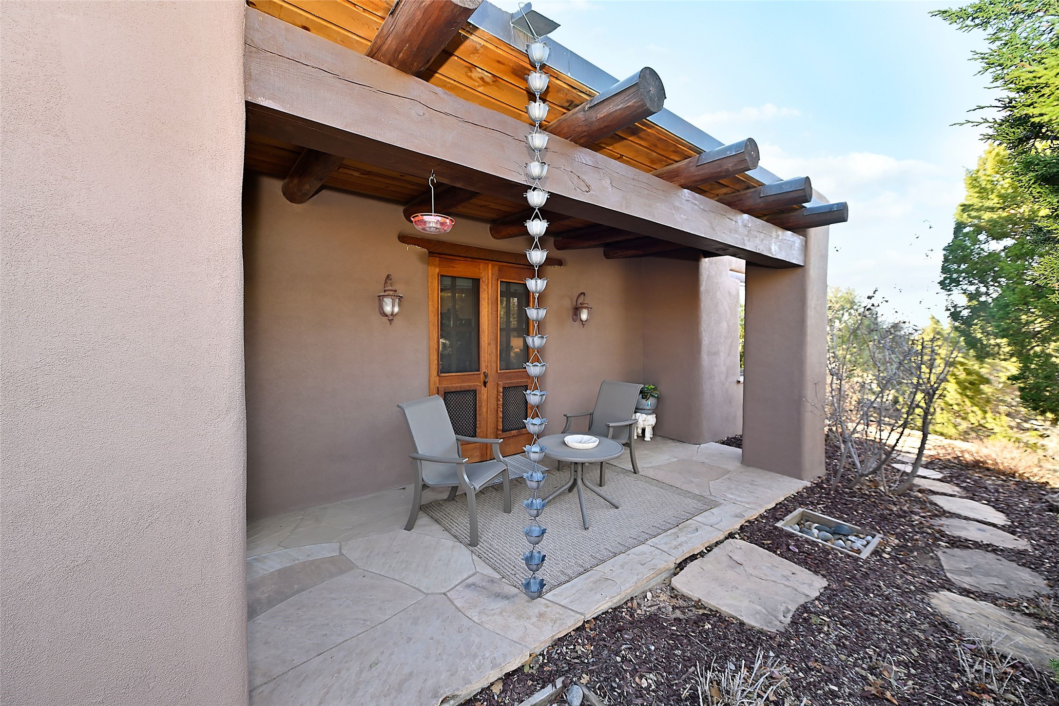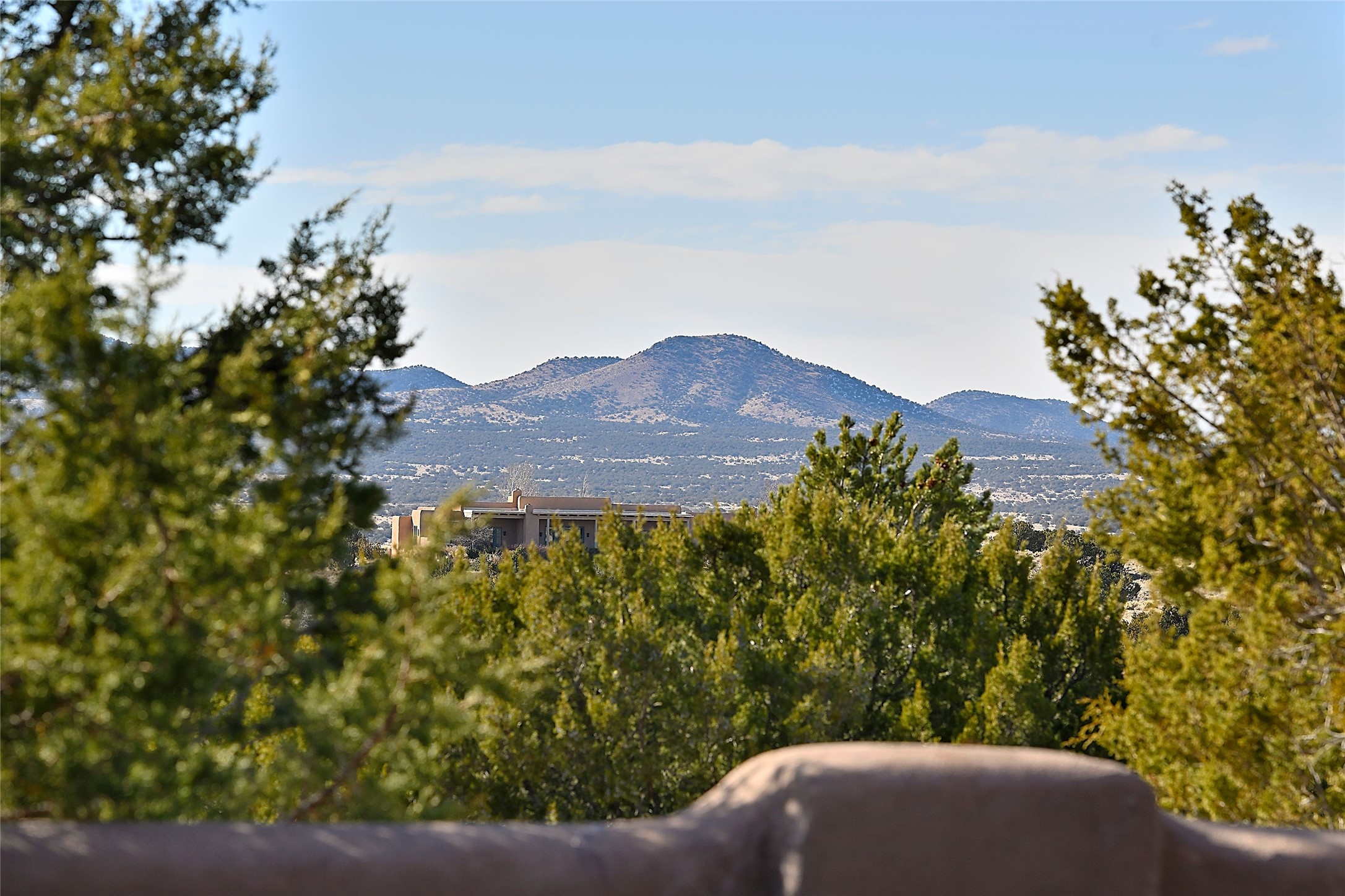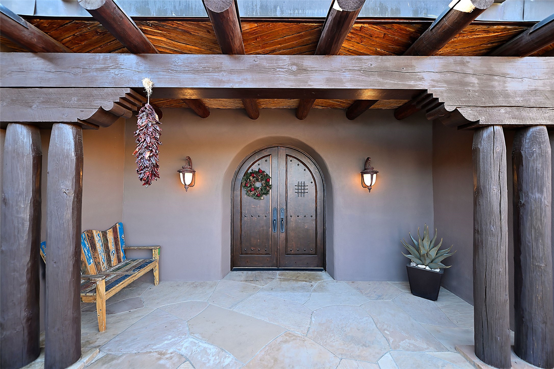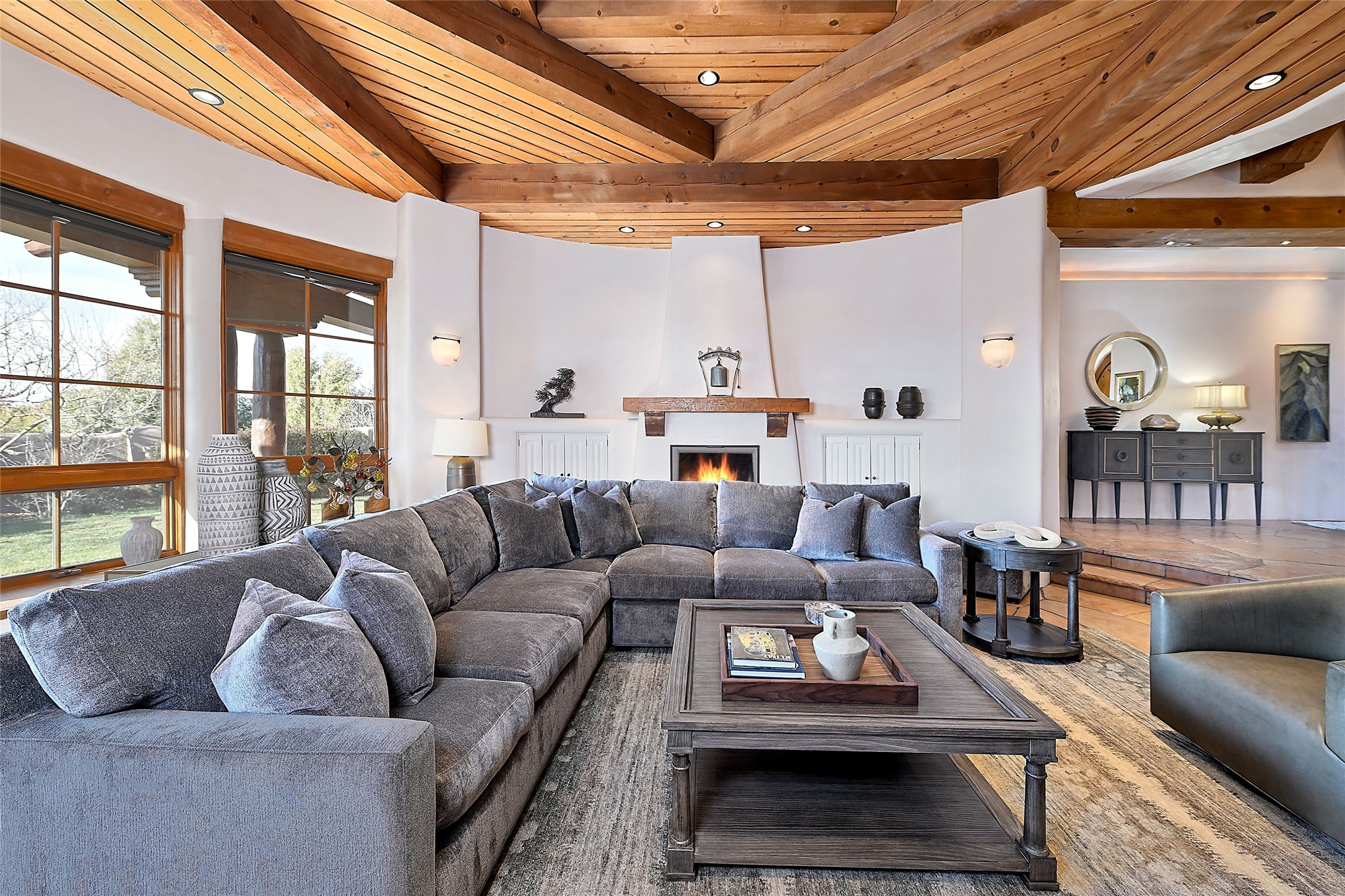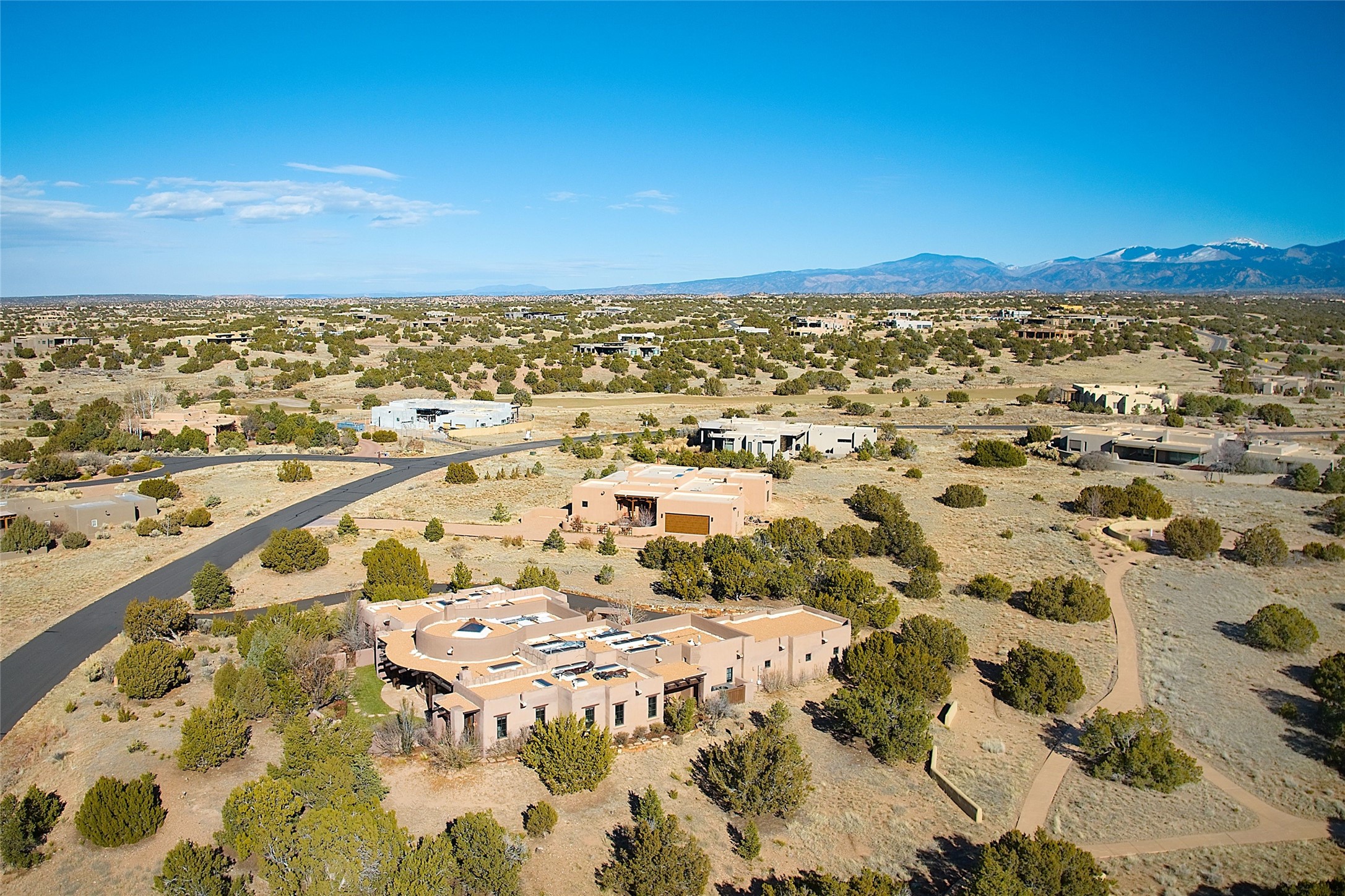 Santa Fe charm with lots of natural light in the prestigious Las Campanas community. This custom-built home combines luxury, privacy and contemporary comfort within a secure, gated setting. Its thoughtful design and high-end finishes offer an elevated living experience throughout. Upon entering, you'll be welcomed by a spacious, open layout with coved ceilings, flagstone floors and a seamless transition between indoor and outdoor spaces. The living room features expansive windows framing breathtaking western views, a striking wood ceiling design, a skylight and a wood-burning fireplace. A curved banco and soaring ceilings enhance the room's inviting atmosphere. The updated chef's kitchen boasts top-tier appliances including a 6-burner Wolf range and double oven and a Sub-Zero fridge and wine fridge. These state-of-the-art appliances are seamlessly integrated into custom cabinetry, creating a cohesive and functional space. The kitchen also features luxurious Taj Mahal quartzite countertops with a leather finish and a large island for meal prep and socializing. A spacious butler's pantry with desk space offers additional convenience. The adjacent dining room includes built-in cabinetry and opens to a wrap-around covered portal, ideal for alfresco dining. The outdoor space is complemented by a wood-burning kiva fireplace and a built-in Wolf grill--perfect for relaxing or entertaining. This home is designed for ultimate privacy, with a separate two-bedroom, two-bathroom guest wing. The primary bedroom offers a spacious and tranquil experience, a wood-burning kiva fireplace, upgraded windows and a private patio for enhanced comfort and seclusion. The luxurious en-suite bathroom includes a skylight, dual vanities, a stunning walk-in shower and BainUltra jetted soaking tub for spa-like enjoyment. A bonus room at the front of the house offers the flexibility of an extra bedroom, office space or TV room. The opportunities for outdoor living in this property are exceptional, with mature landscaping, multiple private patios off both guest bedrooms and the primary suite offering serene spaces for quiet reflection or enjoyment of the surroundings. The house features retractable custom wind and solar screens designed to afford protection from the elements without compromising the view and offering the ability to create the feeling of an outdoor room. Upgrades throughout the home ensure modern convenience and style, including a fully renovated kitchen, laundry room and all bathrooms, new appliances, Hunter Douglas window treatments, ceiling fans and new, high-end carpeting in three rooms. Additional updates include upgraded HVAC systems and fully-renovated driveway. Along with an EV charging station, the 3-car garage offers plenty of storage and includes a separate utility room. This beautiful residence combines timeless charm with modern luxury, offering an opportunity to live in one of the most desirable communities in Santa Fe.