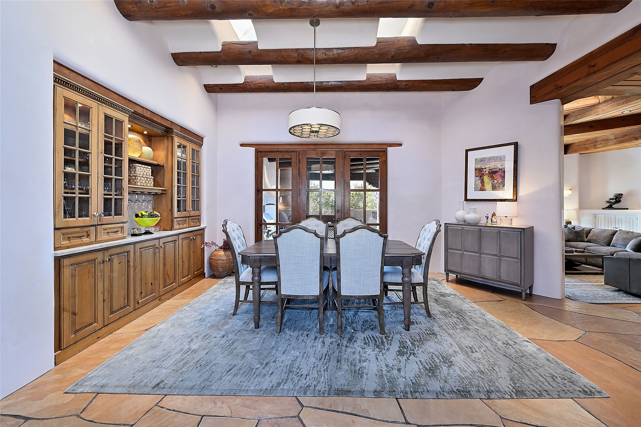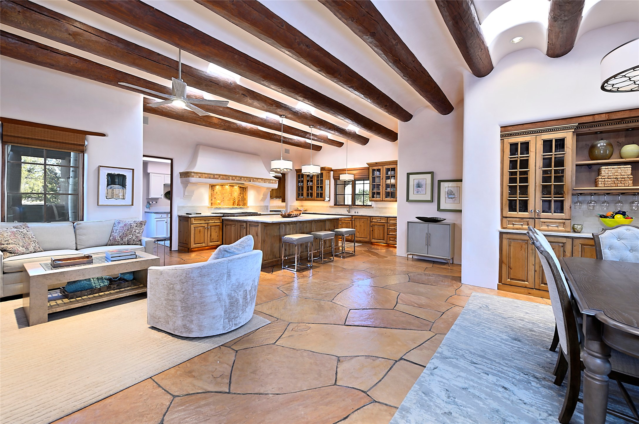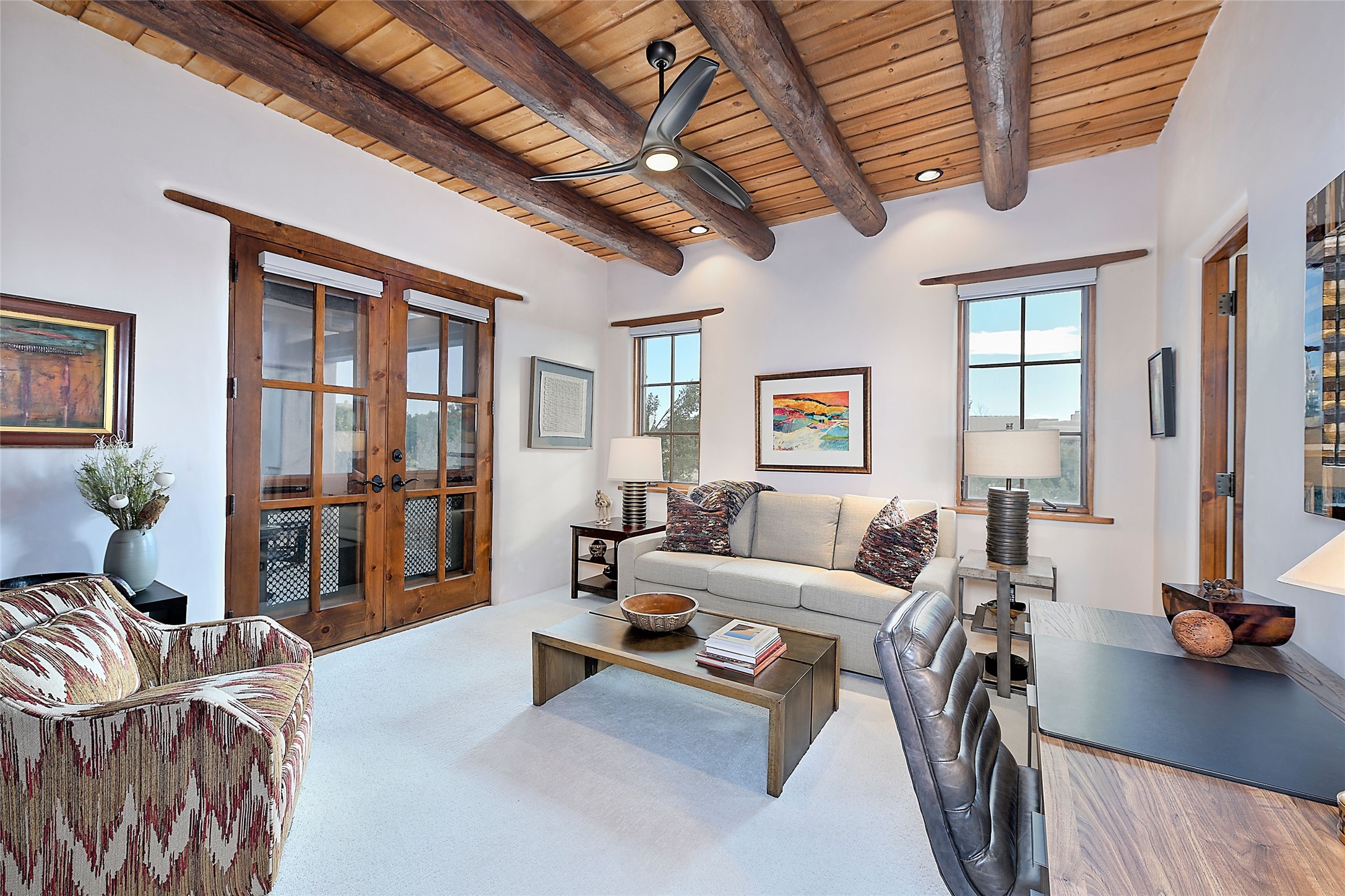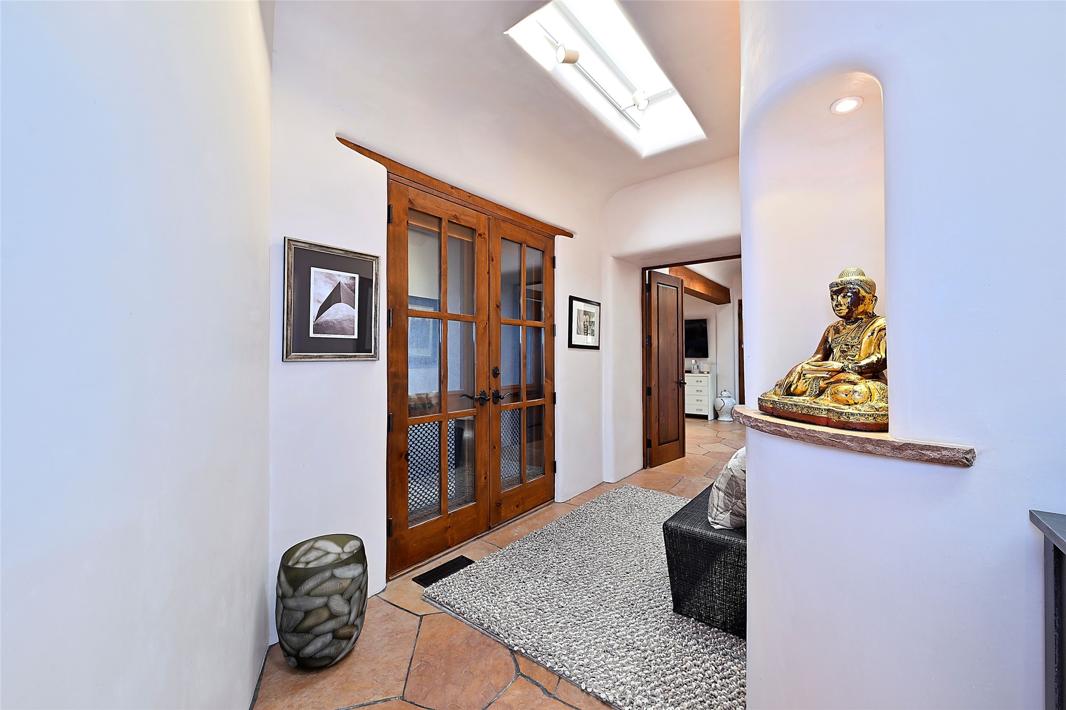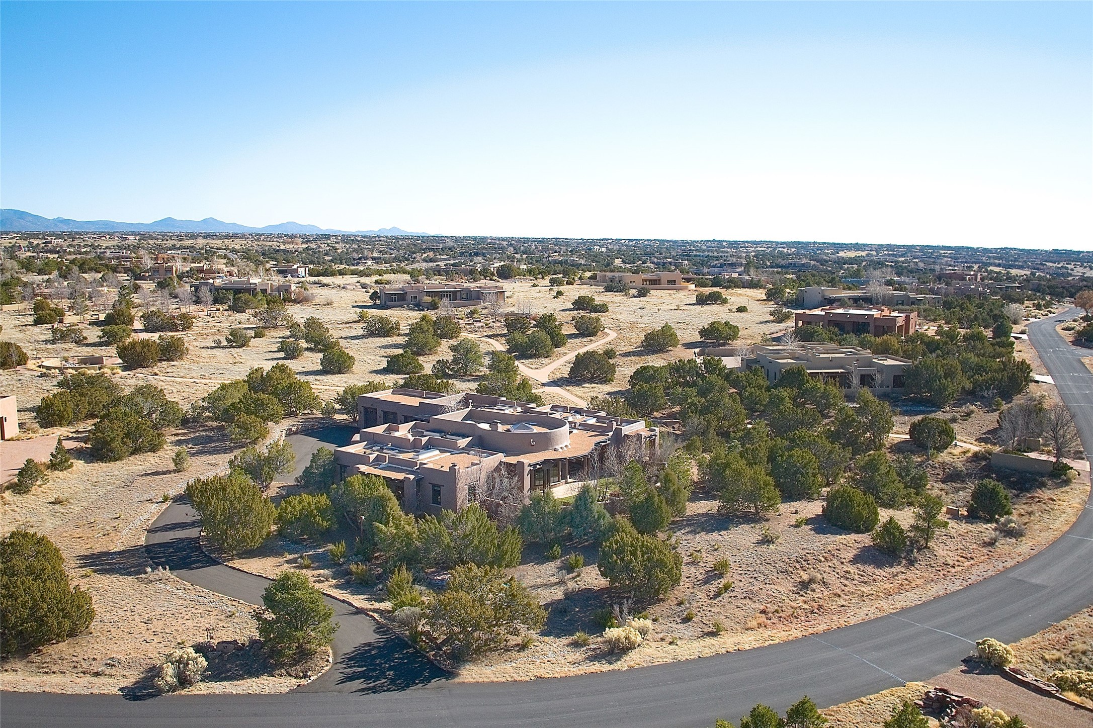 Santa Fe charm with lots of natural light in the prestigious Las Campanas community. This custom-built home combines luxury, privacy and contemporary comfort within a secure, gated setting. Its thoughtful design and high-end finishes offer an elevated living experience throughout. Upon entering, you'll be welcomed by a spacious, open layout with coved ceilings, flagstone floors and a seamless transition between indoor and outdoor spaces. The living room features expansive windows framing breathtaking western views, a striking wood ceiling design, a skylight and a wood-burning fireplace. A curved banco and soaring ceilings enhance the room's inviting atmosphere. The updated chef's kitchen boasts top-tier appliances including a 6-burner Wolf range and double oven and a Sub-Zero fridge and wine fridge. These state-of-the-art appliances are seamlessly integrated into custom cabinetry, creating a cohesive and functional space. The kitchen also features luxurious Taj Mahal quartzite countertops with a leather finish and a large island for meal prep and socializing. A spacious butler's pantry with desk space offers additional convenience. The adjacent dining room includes built-in cabinetry and opens to a wrap-around covered portal, ideal for alfresco dining. The outdoor space is complemented by a wood-burning kiva fireplace and a built-in Wolf grill--perfect for relaxing or entertaining. This home is designed for ultimate privacy, with a separate two-bedroom, two-bathroom guest wing. The primary bedroom offers a spacious and tranquil experience, a wood-burning kiva fireplace, upgraded windows and a private patio for enhanced comfort and seclusion. The luxurious en-suite bathroom includes a skylight, dual vanities, a stunning walk-in shower and BainUltra jetted soaking tub for spa-like enjoyment. A bonus room at the front of the house offers the flexibility of an extra bedroom, office space or TV room. The opportunities for outdoor living in this property are exceptional, with mature landscaping, multiple private patios off both guest bedrooms and the primary suite offering serene spaces for quiet reflection or enjoyment of the surroundings. The house features retractable custom wind and solar screens designed to afford protection from the elements without compromising the view and offering the ability to create the feeling of an outdoor room. Upgrades throughout the home ensure modern convenience and style, including a fully renovated kitchen, laundry room and all bathrooms, new appliances, Hunter Douglas window treatments, ceiling fans and new, high-end carpeting in three rooms. Additional updates include upgraded HVAC systems and fully-renovated driveway. Along with an EV charging station, the 3-car garage offers plenty of storage and includes a separate utility room. This beautiful residence combines timeless charm with modern luxury, offering an opportunity to live in one of the most desirable communities in Santa Fe.