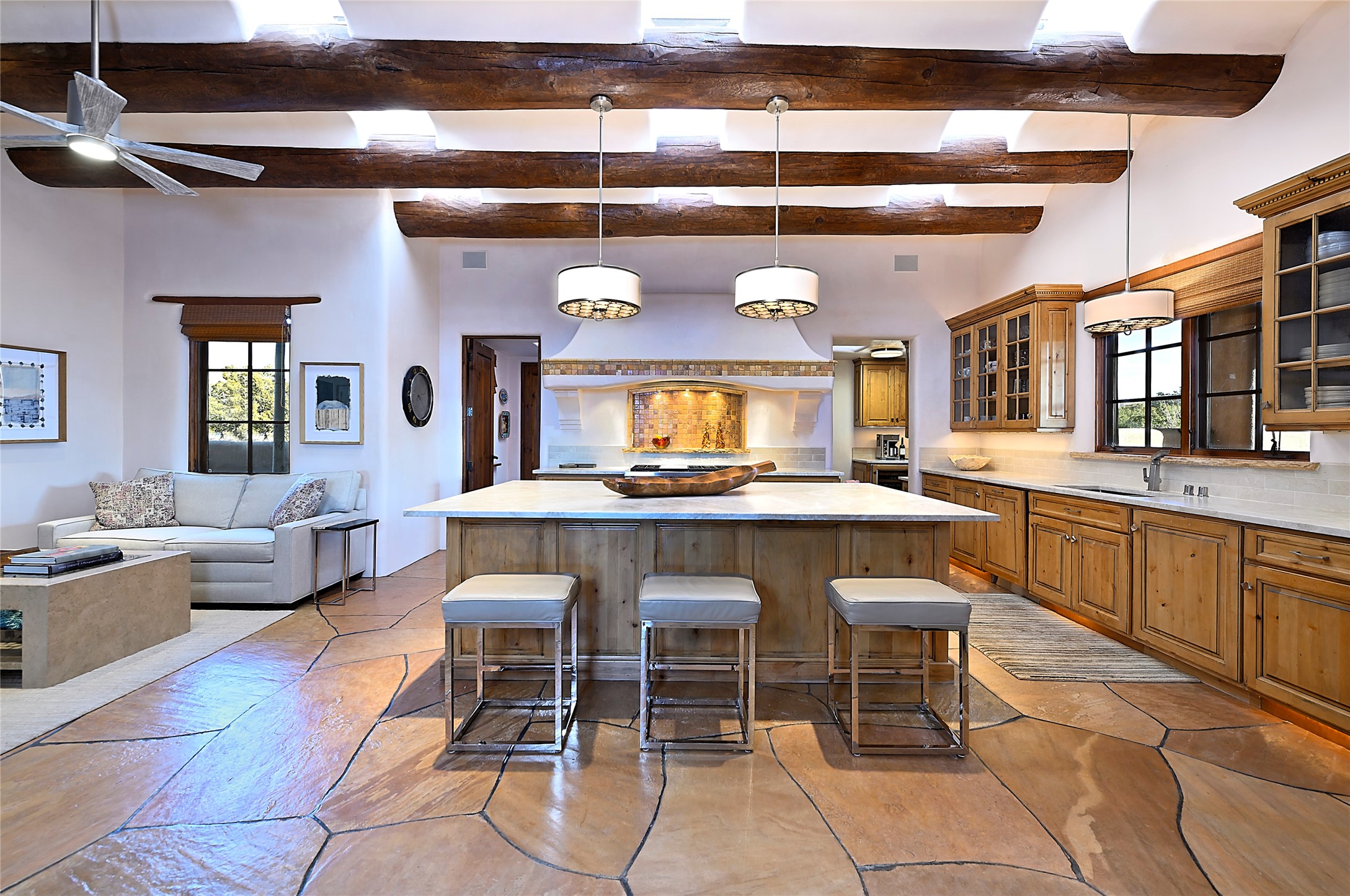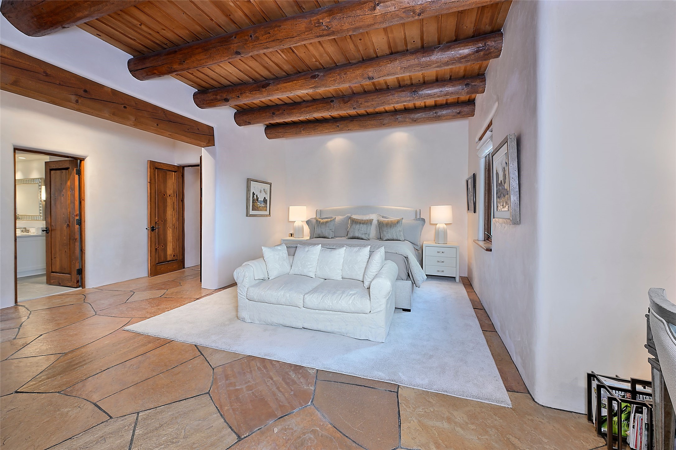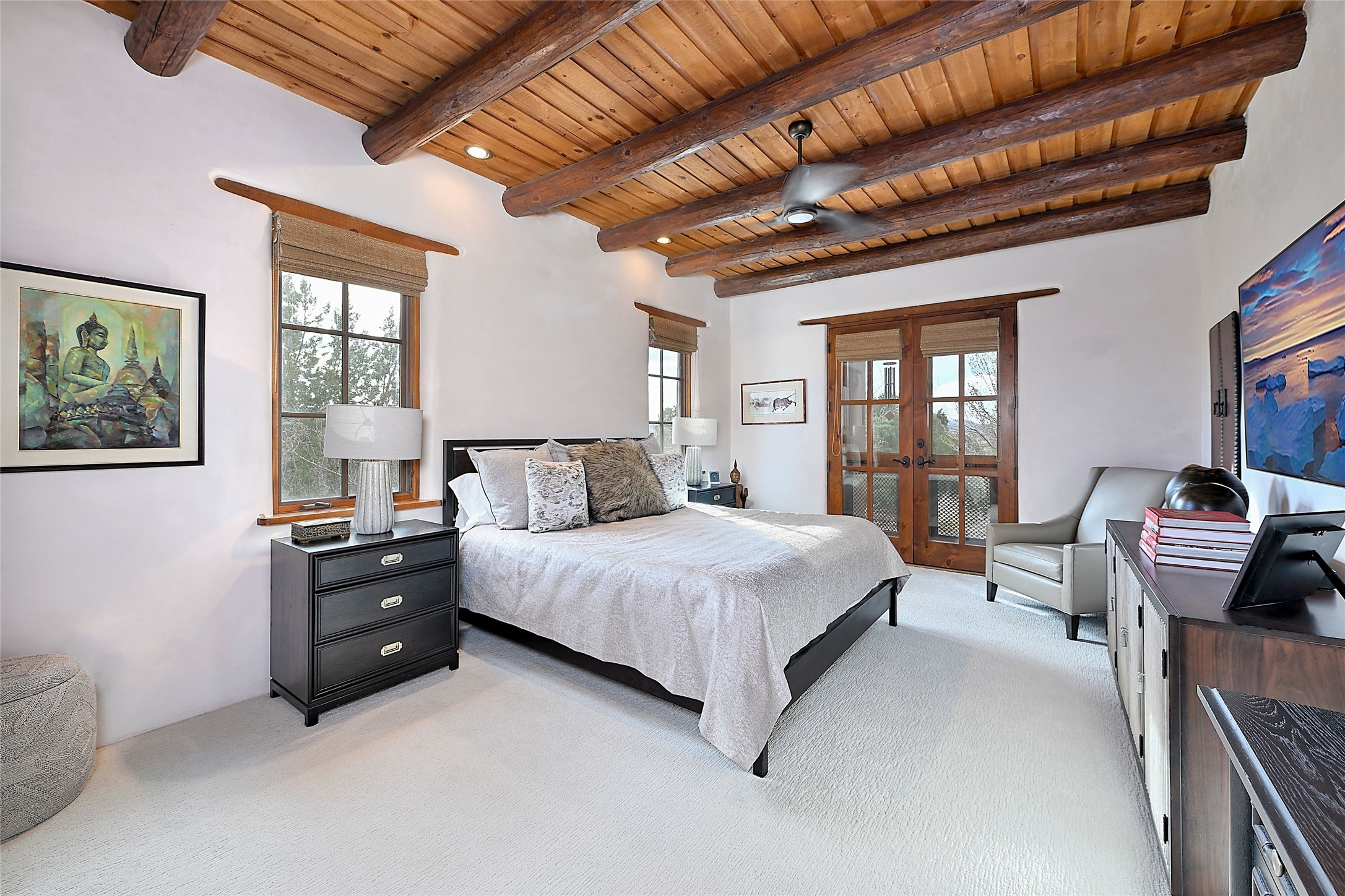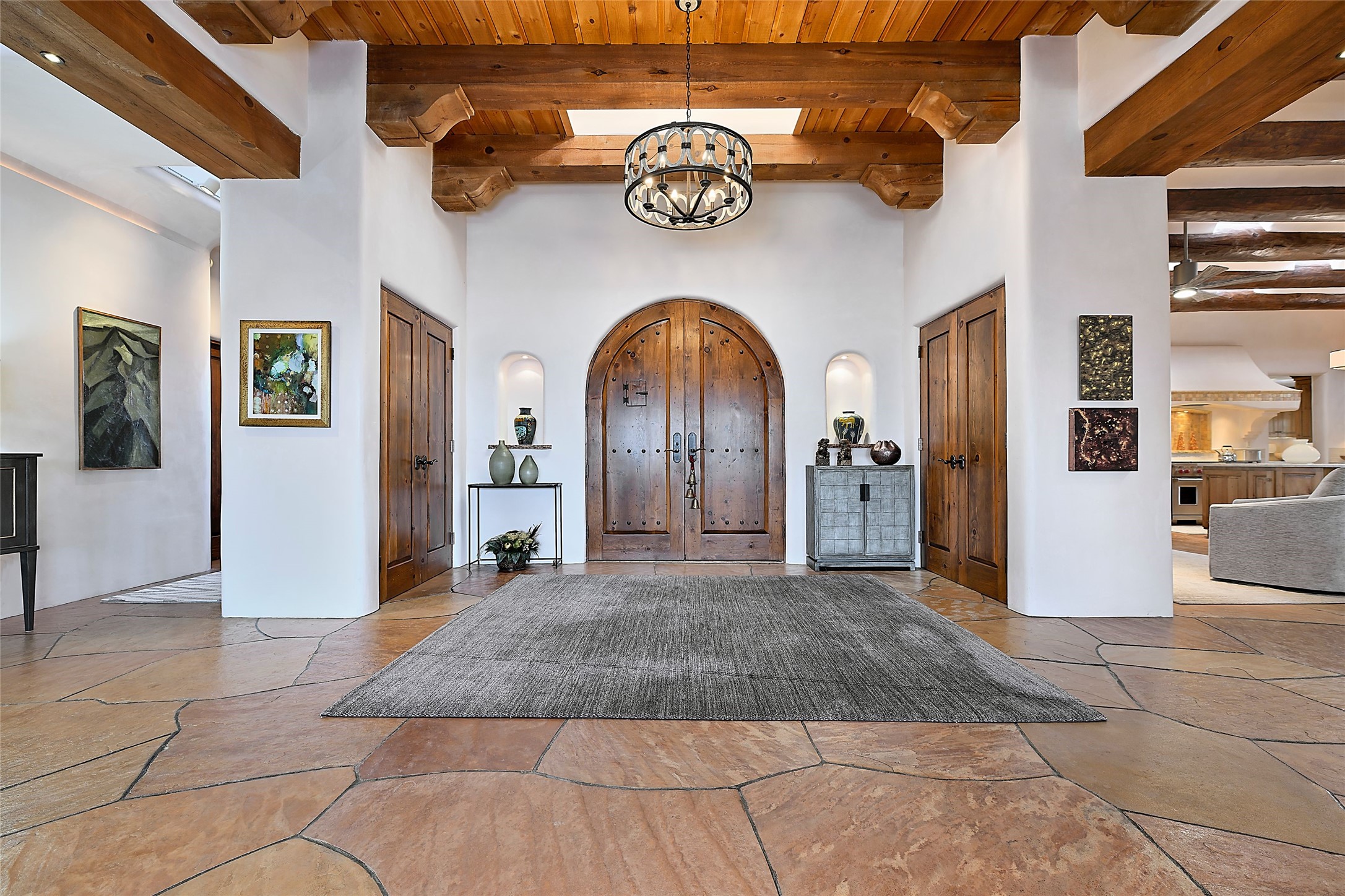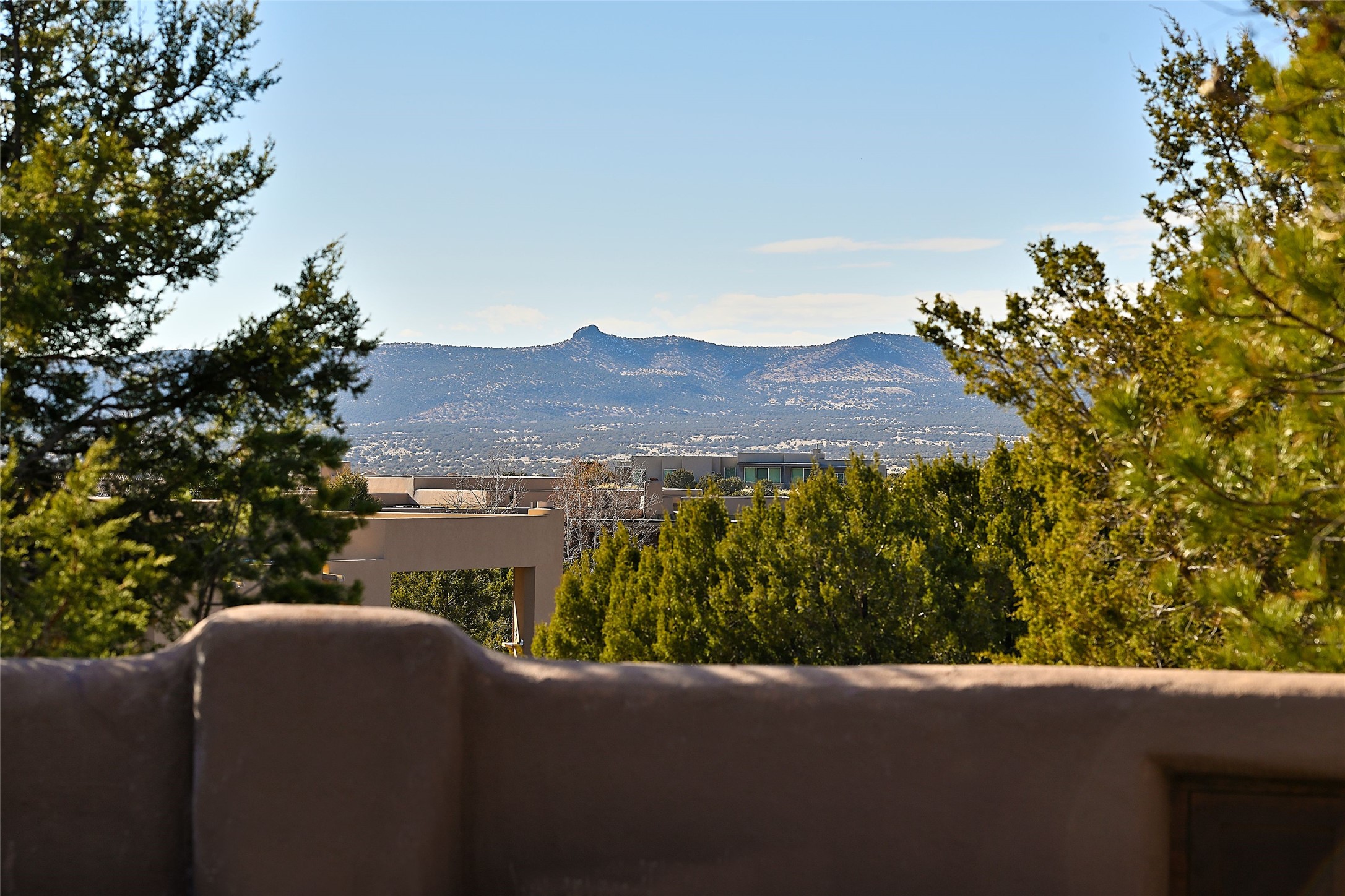 Santa Fe charm with lots of natural light in the prestigious Las Campanas community. This custom-built home combines luxury, privacy and contemporary comfort within a secure, gated setting. Its thoughtful design and high-end finishes offer an elevated living experience throughout. Upon entering, you'll be welcomed by a spacious, open layout with coved ceilings, flagstone floors and a seamless transition between indoor and outdoor spaces. The living room features expansive windows framing breathtaking western views, a striking wood ceiling design, a skylight and a wood-burning fireplace. A curved banco and soaring ceilings enhance the room's inviting atmosphere. The updated chef's kitchen boasts top-tier appliances including a 6-burner Wolf range and double oven and a Sub-Zero fridge and wine fridge. These state-of-the-art appliances are seamlessly integrated into custom cabinetry, creating a cohesive and functional space. The kitchen also features luxurious Taj Mahal quartzite countertops with a leather finish and a large island for meal prep and socializing. A spacious butler's pantry with desk space offers additional convenience. The adjacent dining room includes built-in cabinetry and opens to a wrap-around covered portal, ideal for alfresco dining. The outdoor space is complemented by a wood-burning kiva fireplace and a built-in Wolf grill--perfect for relaxing or entertaining. This home is designed for ultimate privacy, with a separate two-bedroom, two-bathroom guest wing. The primary bedroom offers a spacious and tranquil experience, a wood-burning kiva fireplace, upgraded windows and a private patio for enhanced comfort and seclusion. The luxurious en-suite bathroom includes a skylight, dual vanities, a stunning walk-in shower and BainUltra jetted soaking tub for spa-like enjoyment. A bonus room at the front of the house offers the flexibility of an extra bedroom, office space or TV room. The opportunities for outdoor living in this property are exceptional, with mature landscaping, multiple private patios off both guest bedrooms and the primary suite offering serene spaces for quiet reflection or enjoyment of the surroundings. The house features retractable custom wind and solar screens designed to afford protection from the elements without compromising the view and offering the ability to create the feeling of an outdoor room. Upgrades throughout the home ensure modern convenience and style, including a fully renovated kitchen, laundry room and all bathrooms, new appliances, Hunter Douglas window treatments, ceiling fans and new, high-end carpeting in three rooms. Additional updates include upgraded HVAC systems and fully-renovated driveway. Along with an EV charging station, the 3-car garage offers plenty of storage and includes a separate utility room. This beautiful residence combines timeless charm with modern luxury, offering an opportunity to live in one of the most desirable communities in Santa Fe.