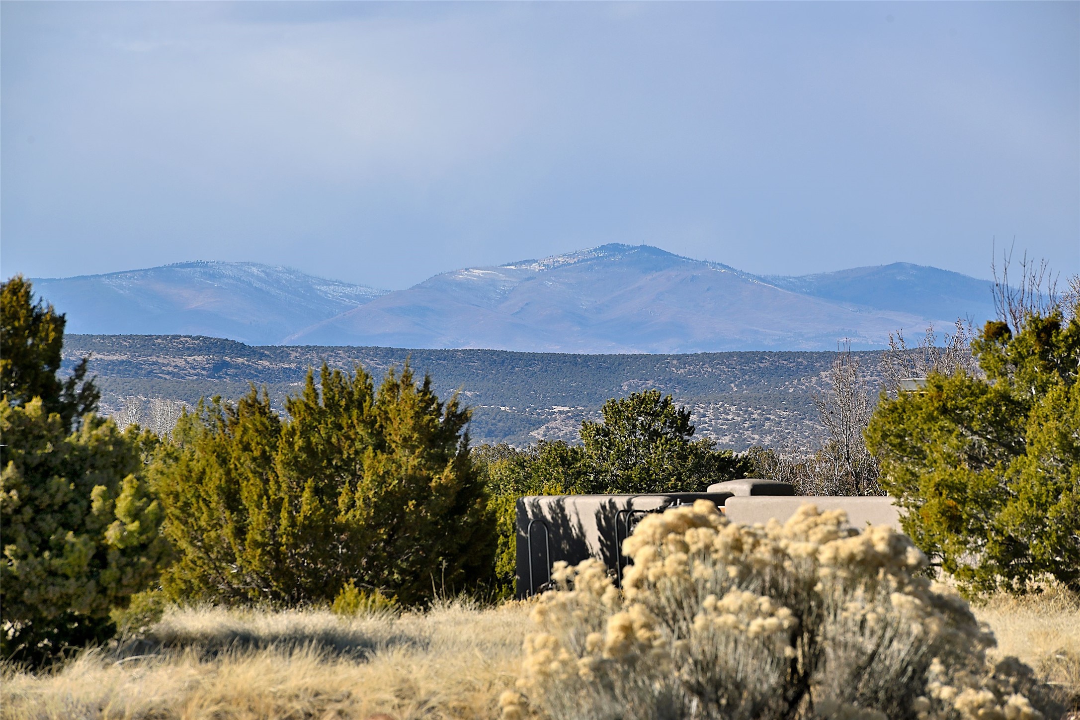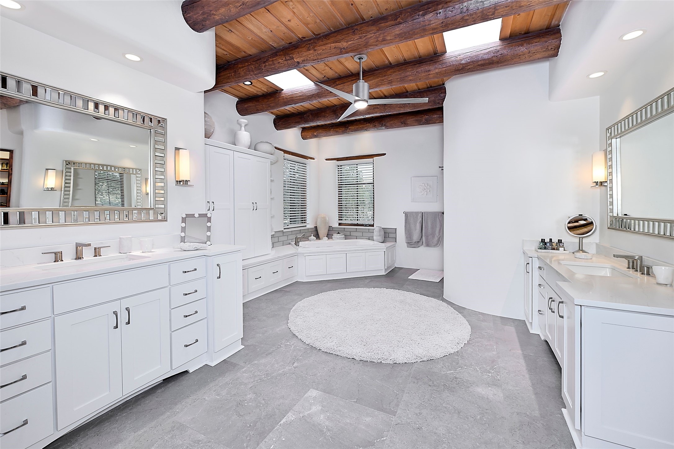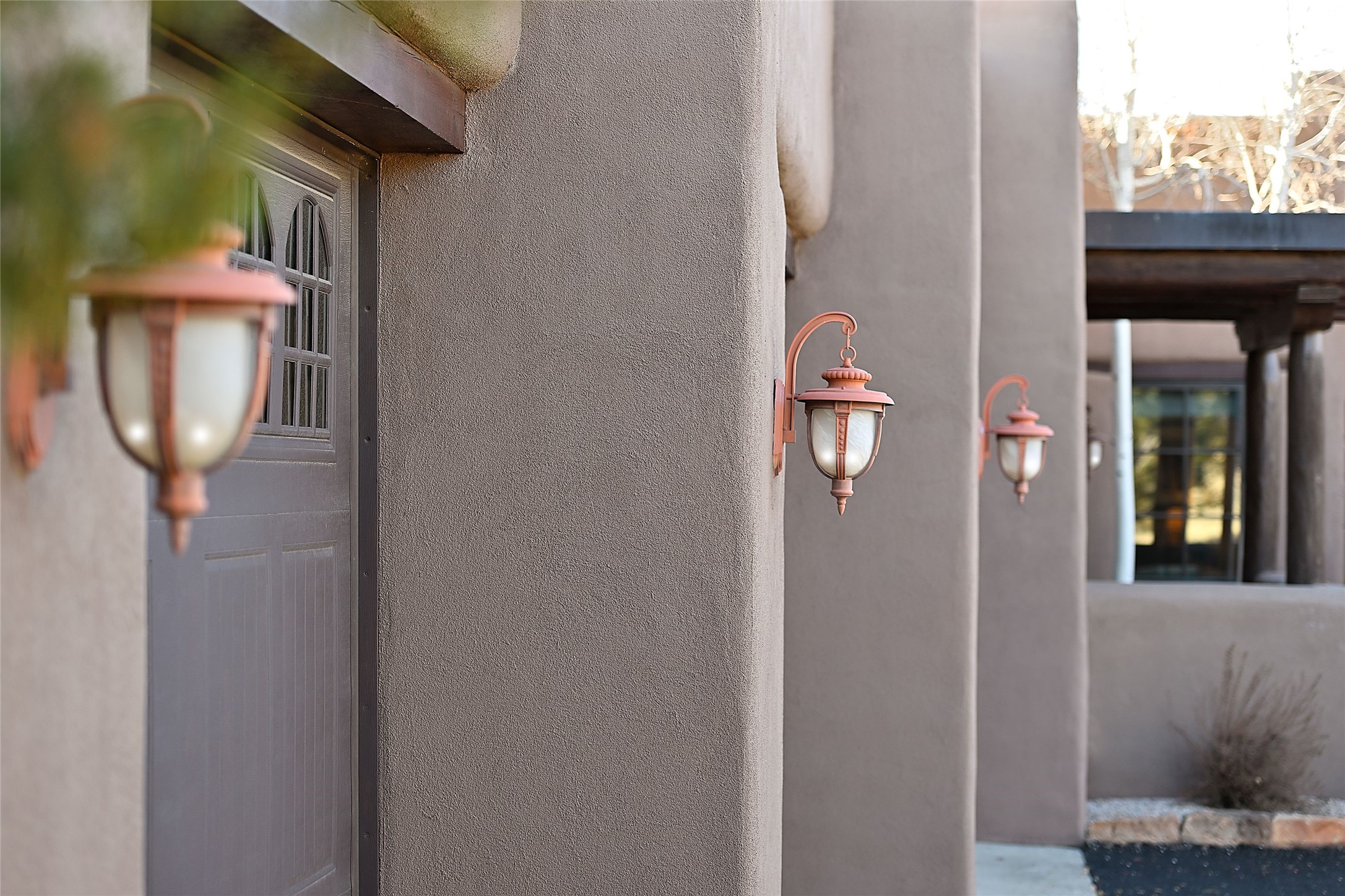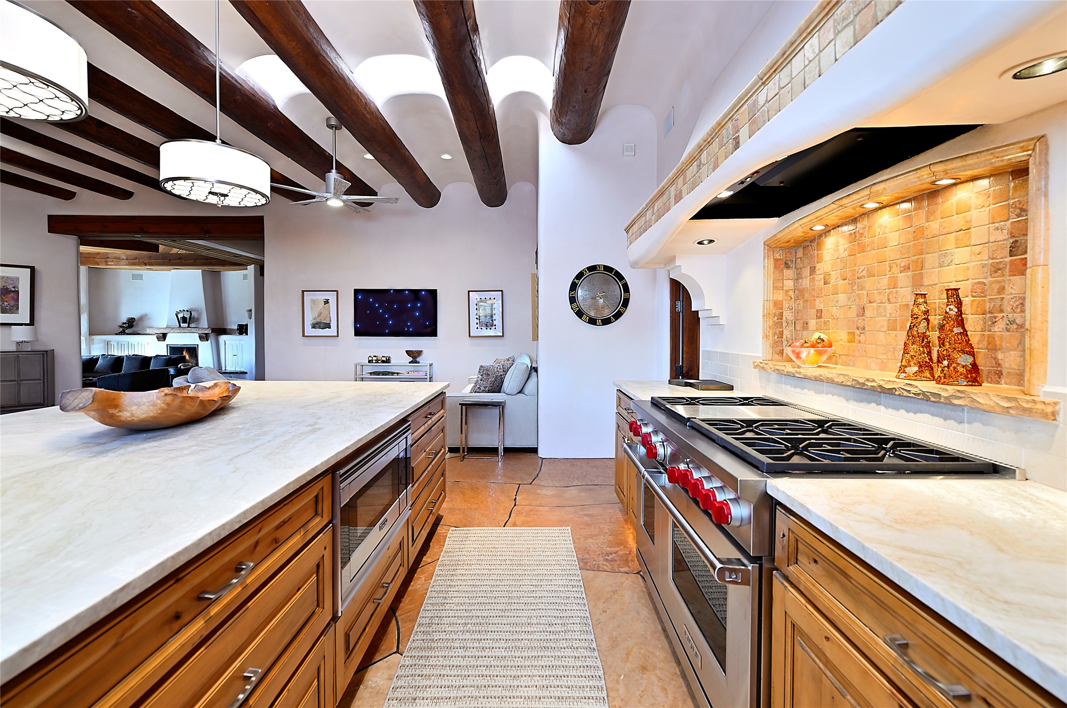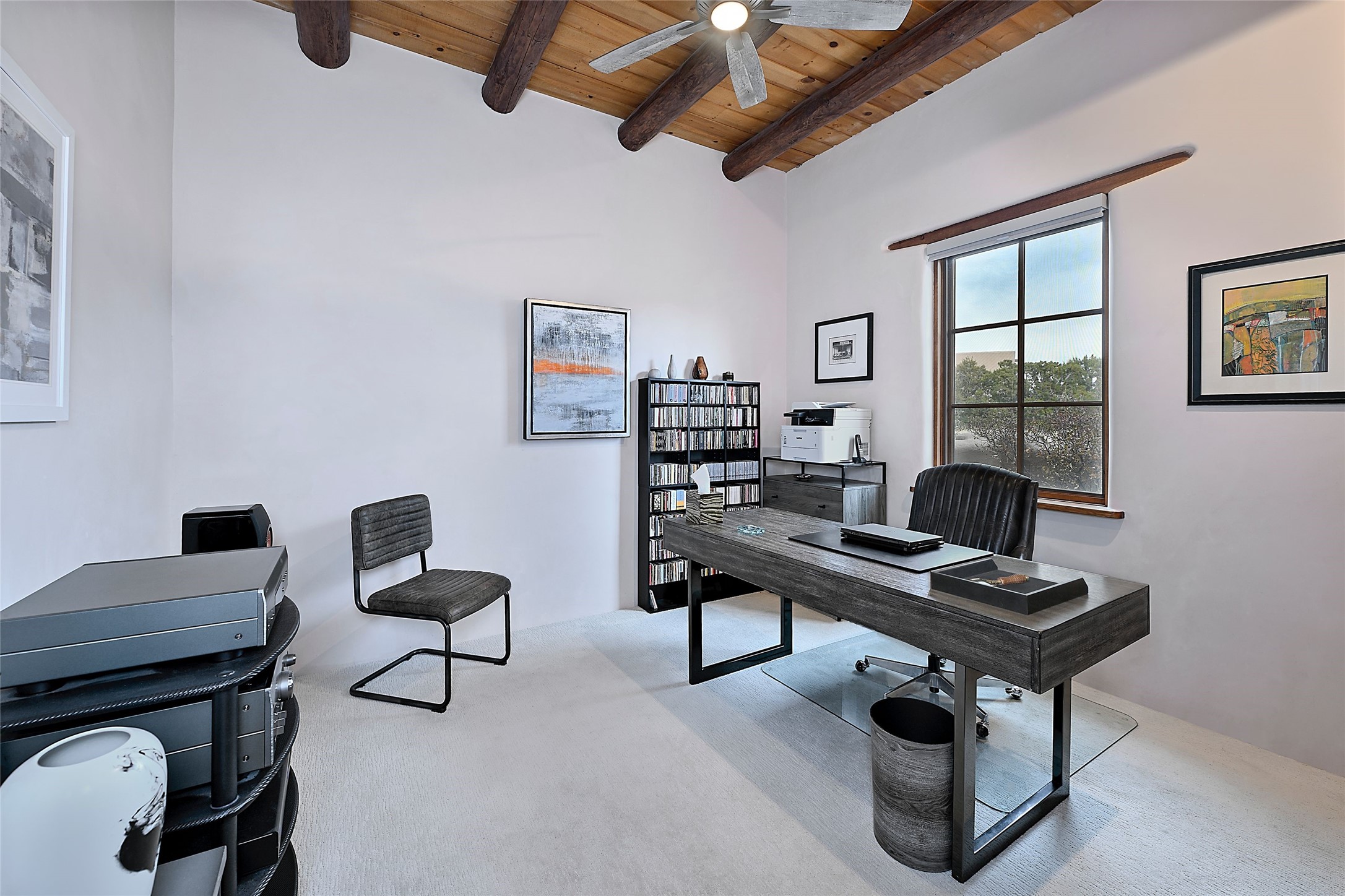 Santa Fe charm with lots of natural light in the prestigious Las Campanas community. This custom-built home combines luxury, privacy and contemporary comfort within a secure, gated setting. Its thoughtful design and high-end finishes offer an elevated living experience throughout. Upon entering, you'll be welcomed by a spacious, open layout with coved ceilings, flagstone floors and a seamless transition between indoor and outdoor spaces. The living room features expansive windows framing breathtaking western views, a striking wood ceiling design, a skylight and a wood-burning fireplace. A curved banco and soaring ceilings enhance the room's inviting atmosphere. The updated chef's kitchen boasts top-tier appliances including a 6-burner Wolf range and double oven and a Sub-Zero fridge and wine fridge. These state-of-the-art appliances are seamlessly integrated into custom cabinetry, creating a cohesive and functional space. The kitchen also features luxurious Taj Mahal quartzite countertops with a leather finish and a large island for meal prep and socializing. A spacious butler's pantry with desk space offers additional convenience. The adjacent dining room includes built-in cabinetry and opens to a wrap-around covered portal, ideal for alfresco dining. The outdoor space is complemented by a wood-burning kiva fireplace and a built-in Wolf grill--perfect for relaxing or entertaining. This home is designed for ultimate privacy, with a separate two-bedroom, two-bathroom guest wing. The primary bedroom offers a spacious and tranquil experience, a wood-burning kiva fireplace, upgraded windows and a private patio for enhanced comfort and seclusion. The luxurious en-suite bathroom includes a skylight, dual vanities, a stunning walk-in shower and BainUltra jetted soaking tub for spa-like enjoyment. A bonus room at the front of the house offers the flexibility of an extra bedroom, office space or TV room. The opportunities for outdoor living in this property are exceptional, with mature landscaping, multiple private patios off both guest bedrooms and the primary suite offering serene spaces for quiet reflection or enjoyment of the surroundings. The house features retractable custom wind and solar screens designed to afford protection from the elements without compromising the view and offering the ability to create the feeling of an outdoor room. Upgrades throughout the home ensure modern convenience and style, including a fully renovated kitchen, laundry room and all bathrooms, new appliances, Hunter Douglas window treatments, ceiling fans and new, high-end carpeting in three rooms. Additional updates include upgraded HVAC systems and fully-renovated driveway. Along with an EV charging station, the 3-car garage offers plenty of storage and includes a separate utility room. This beautiful residence combines timeless charm with modern luxury, offering an opportunity to live in one of the most desirable communities in Santa Fe.