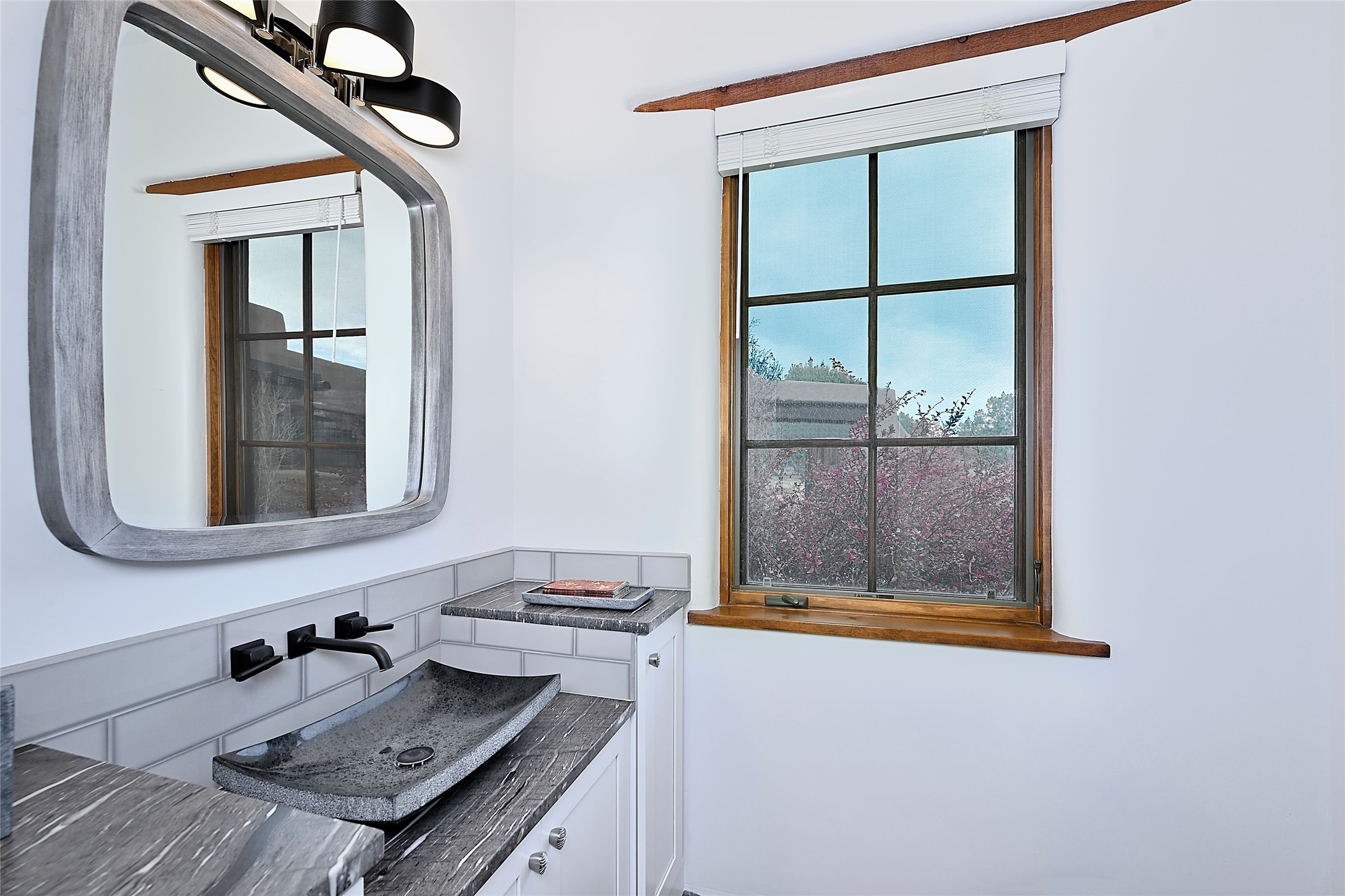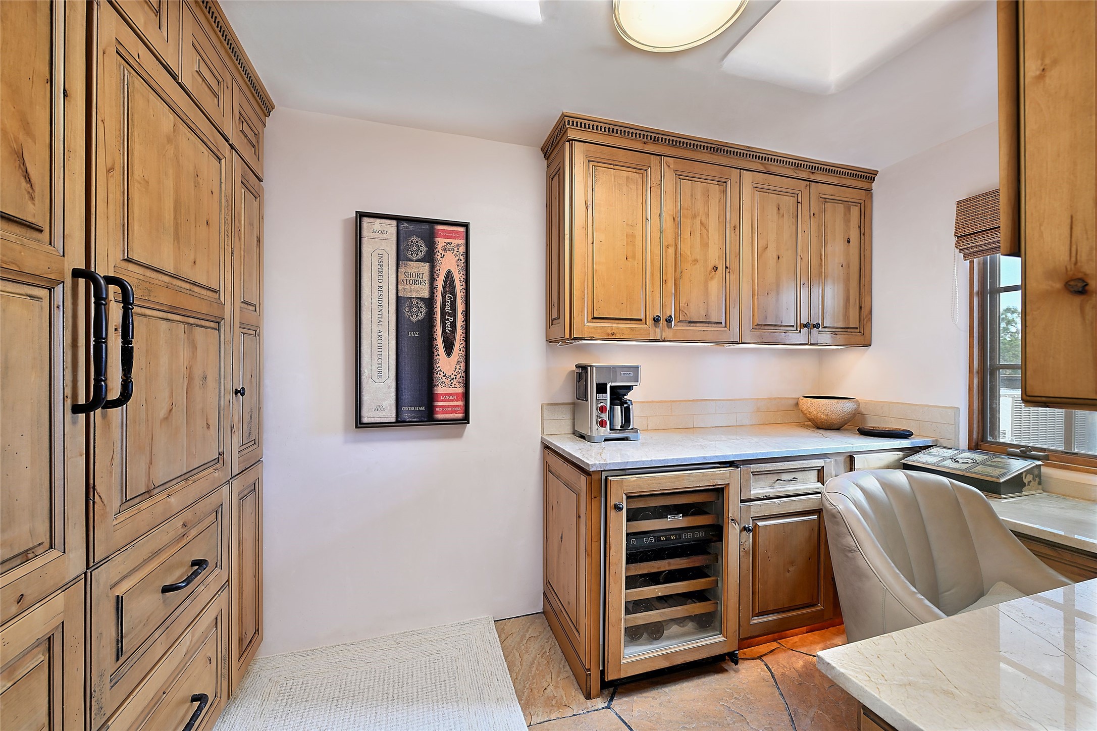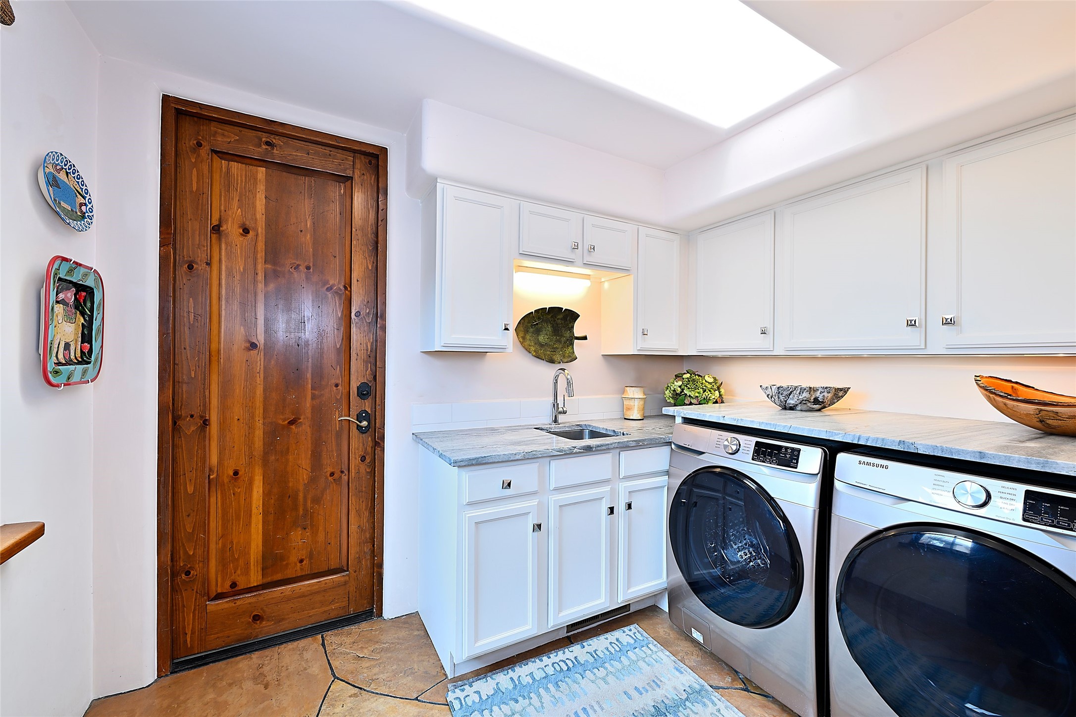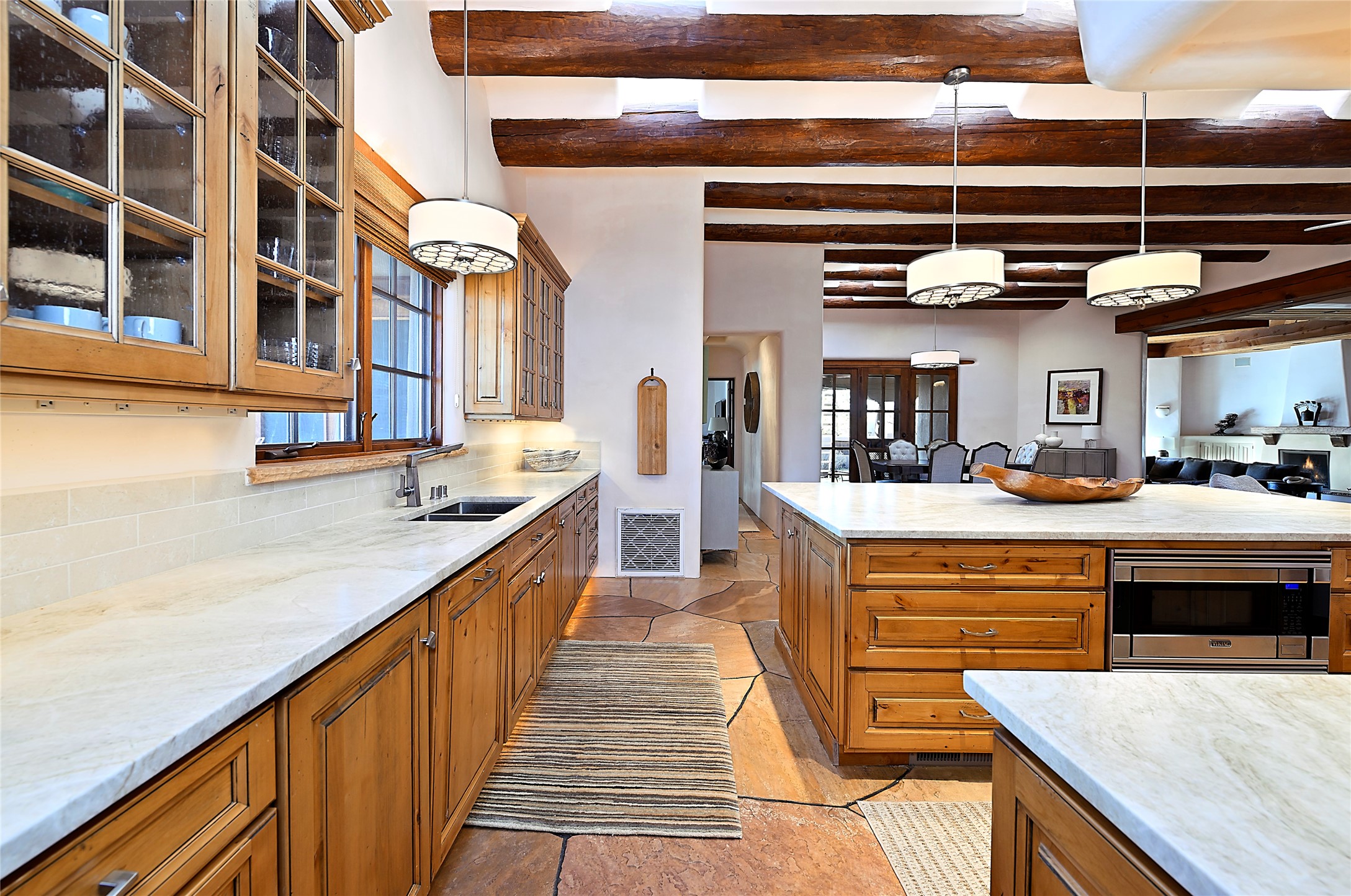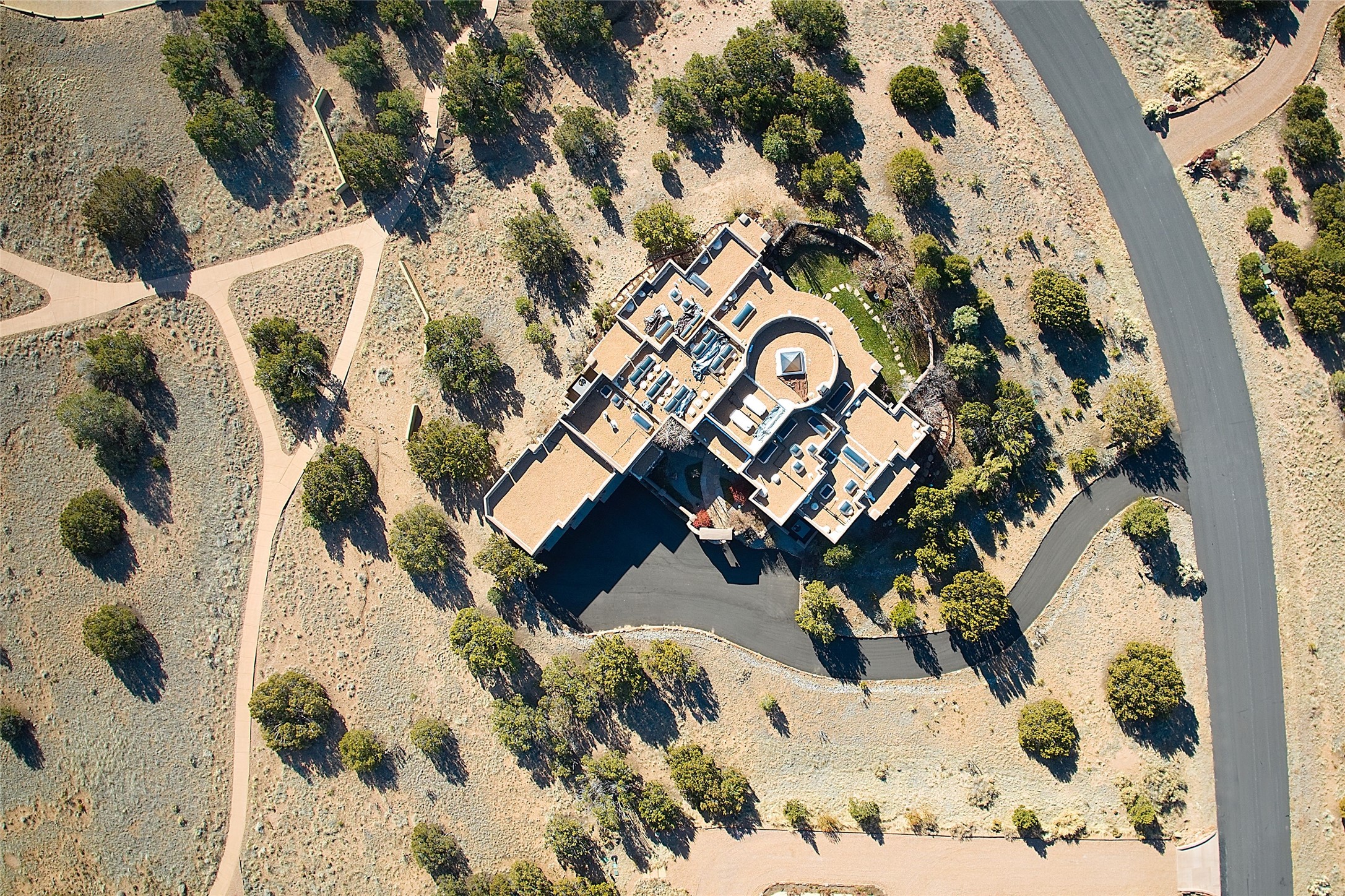 Santa Fe charm with lots of natural light in the prestigious Las Campanas community. This custom-built home combines luxury, privacy and contemporary comfort within a secure, gated setting. Its thoughtful design and high-end finishes offer an elevated living experience throughout. Upon entering, you'll be welcomed by a spacious, open layout with coved ceilings, flagstone floors and a seamless transition between indoor and outdoor spaces. The living room features expansive windows framing breathtaking western views, a striking wood ceiling design, a skylight and a wood-burning fireplace. A curved banco and soaring ceilings enhance the room's inviting atmosphere. The updated chef's kitchen boasts top-tier appliances including a 6-burner Wolf range and double oven and a Sub-Zero fridge and wine fridge. These state-of-the-art appliances are seamlessly integrated into custom cabinetry, creating a cohesive and functional space. The kitchen also features luxurious Taj Mahal quartzite countertops with a leather finish and a large island for meal prep and socializing. A spacious butler's pantry with desk space offers additional convenience. The adjacent dining room includes built-in cabinetry and opens to a wrap-around covered portal, ideal for alfresco dining. The outdoor space is complemented by a wood-burning kiva fireplace and a built-in Wolf grill--perfect for relaxing or entertaining. This home is designed for ultimate privacy, with a separate two-bedroom, two-bathroom guest wing. The primary bedroom offers a spacious and tranquil experience, a wood-burning kiva fireplace, upgraded windows and a private patio for enhanced comfort and seclusion. The luxurious en-suite bathroom includes a skylight, dual vanities, a stunning walk-in shower and BainUltra jetted soaking tub for spa-like enjoyment. A bonus room at the front of the house offers the flexibility of an extra bedroom, office space or TV room. The opportunities for outdoor living in this property are exceptional, with mature landscaping, multiple private patios off both guest bedrooms and the primary suite offering serene spaces for quiet reflection or enjoyment of the surroundings. The house features retractable custom wind and solar screens designed to afford protection from the elements without compromising the view and offering the ability to create the feeling of an outdoor room. Upgrades throughout the home ensure modern convenience and style, including a fully renovated kitchen, laundry room and all bathrooms, new appliances, Hunter Douglas window treatments, ceiling fans and new, high-end carpeting in three rooms. Additional updates include upgraded HVAC systems and fully-renovated driveway. Along with an EV charging station, the 3-car garage offers plenty of storage and includes a separate utility room. This beautiful residence combines timeless charm with modern luxury, offering an opportunity to live in one of the most desirable communities in Santa Fe.