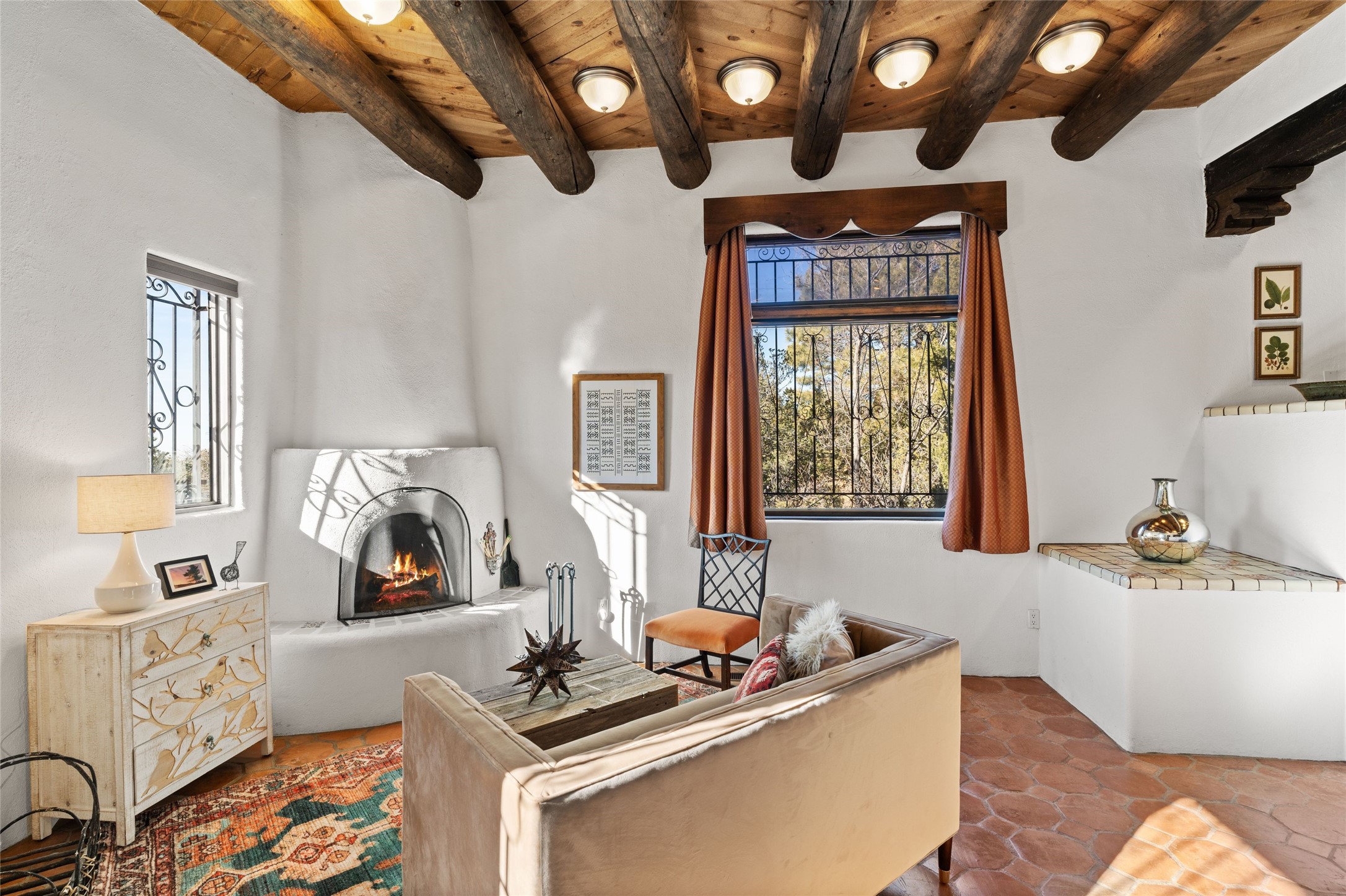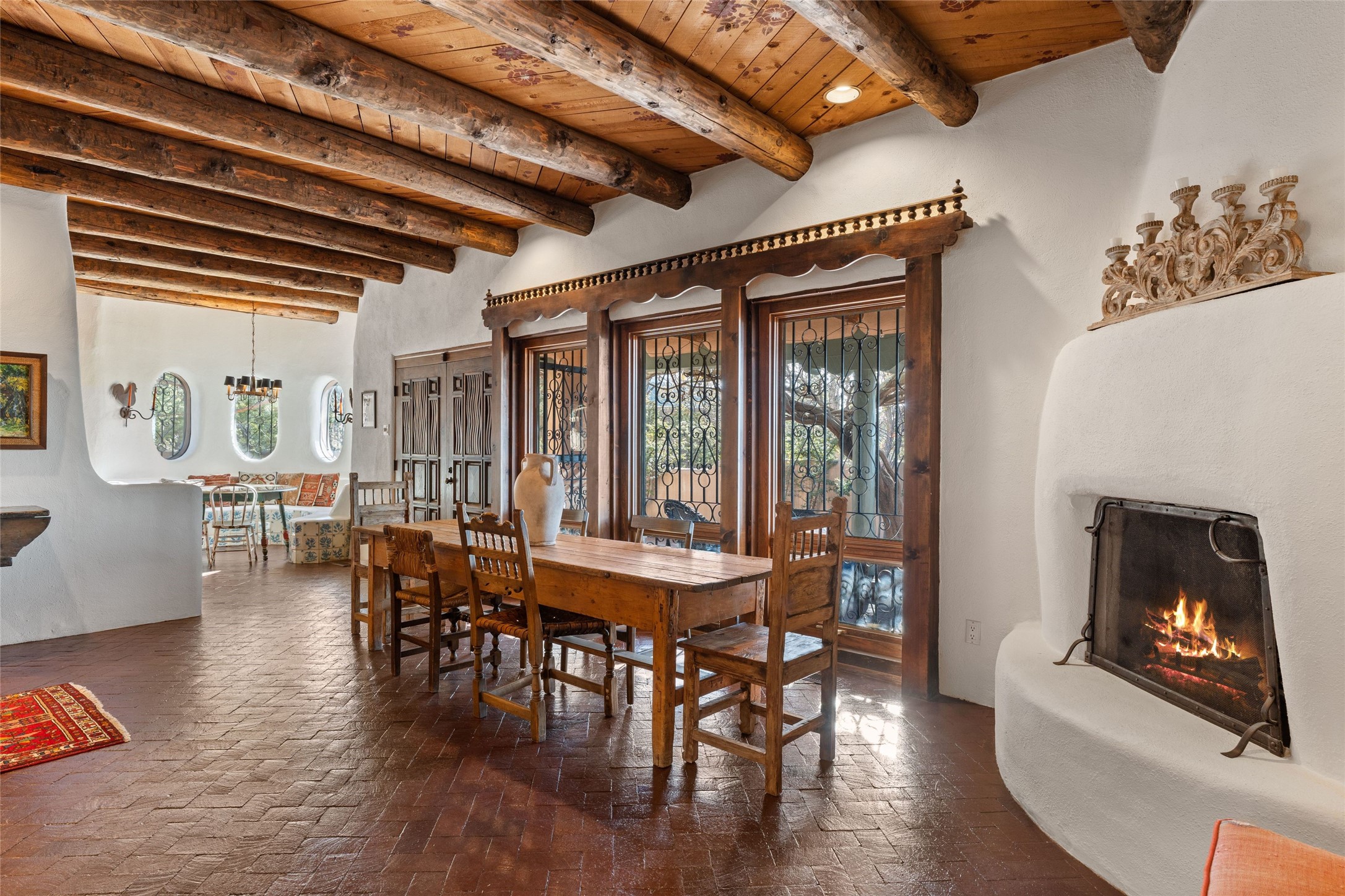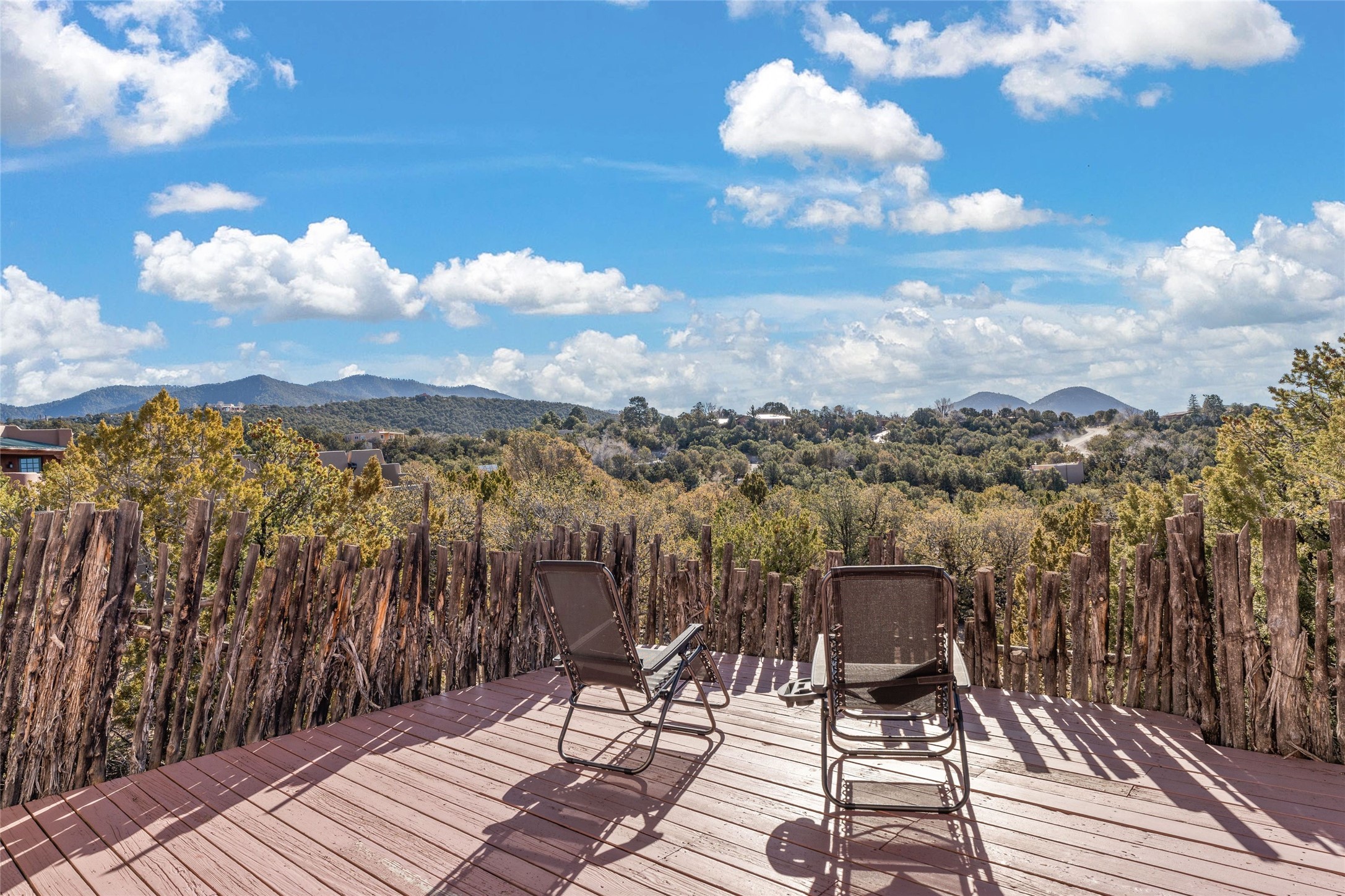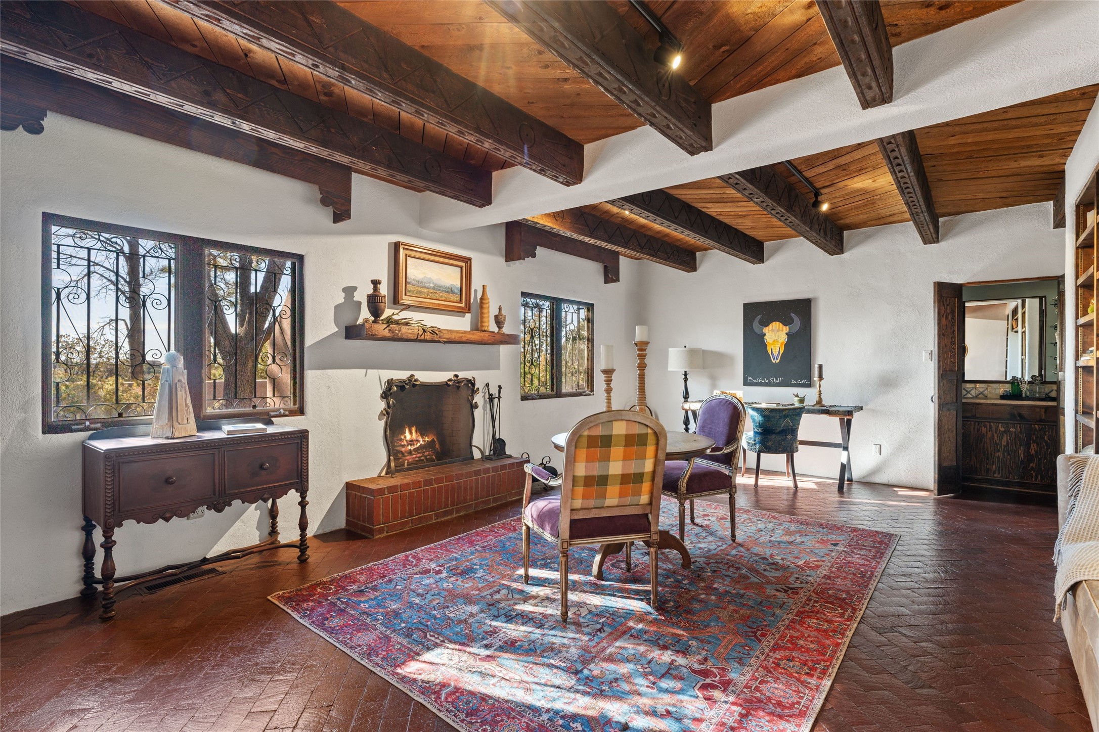 PAUSE and take a moment to step back in time. To a time when life was slower and craftsmanship was the hallmark of fine estates.This elegant main house and guest house are located on a lush acre in the City of Santa Fe, on a private well with the option of City water. Set in scenic surroundings, there are hiking, biking and skiing amenities nearby.Built in 1979, the main house is single level, with spacious living areas, an open-plan kitchen and circular breakfast nook. The handsome living/dining room accesses patios that run the full length of the house. The secluded principal bedroom suite, with private bathroom and dressing area, is situated at the end of a long art gallery. The large library with fireplace is adjacent to the living room and can be configured with a daybed to serve as a second bedroom.Savor the details of this elegant, romantic home: antique, hand-carved doors; exquisite ceilings with vigas, beams and stamped, herringbone decking; imported Portuguese tiles, built-in bancos and display nichos; gleaming brick floors; and three fireplaces exhibiting artisanal, wrought iron screens.The detached, multi-purpose guest house, built in 1985, has also served as an art studio, private office and rental opportunity. Consisting of a large bedroom, living room with fireplace, studio area, bathroom and kitchenette, it has a fenced deck with stunning views to the Sun and Moon mountains.The entire property has remarkable panoramic vistas, sheltered gardens with mature landscaping that meanders to a meditation area, and extensive brick patios providing a superb entertainment venue.
