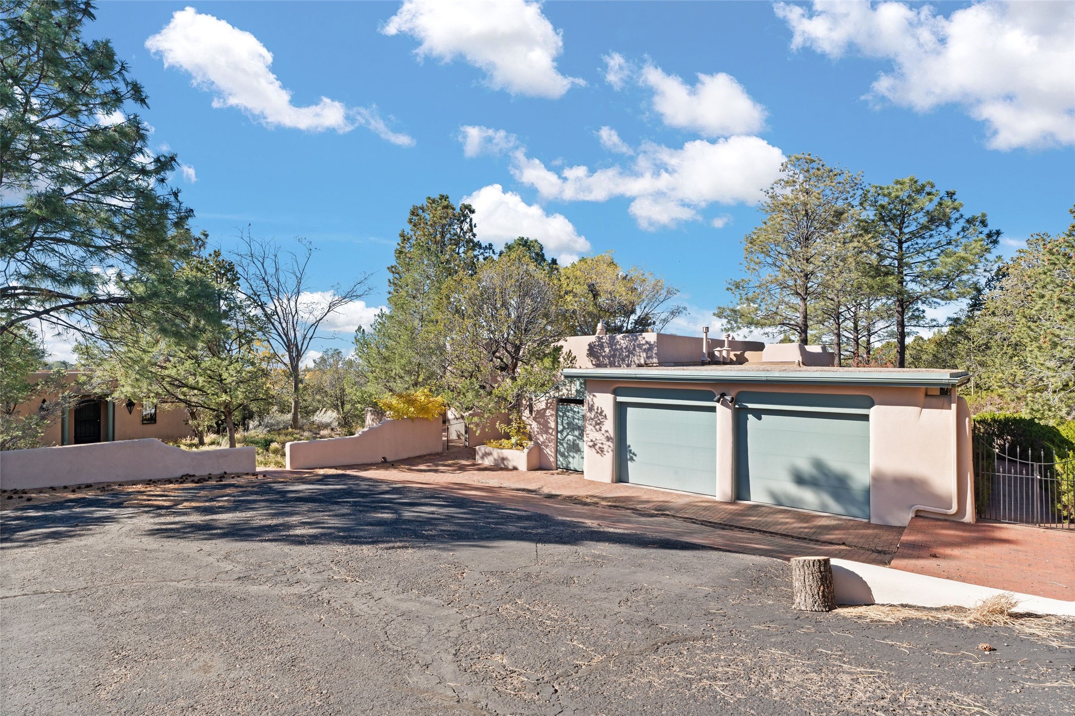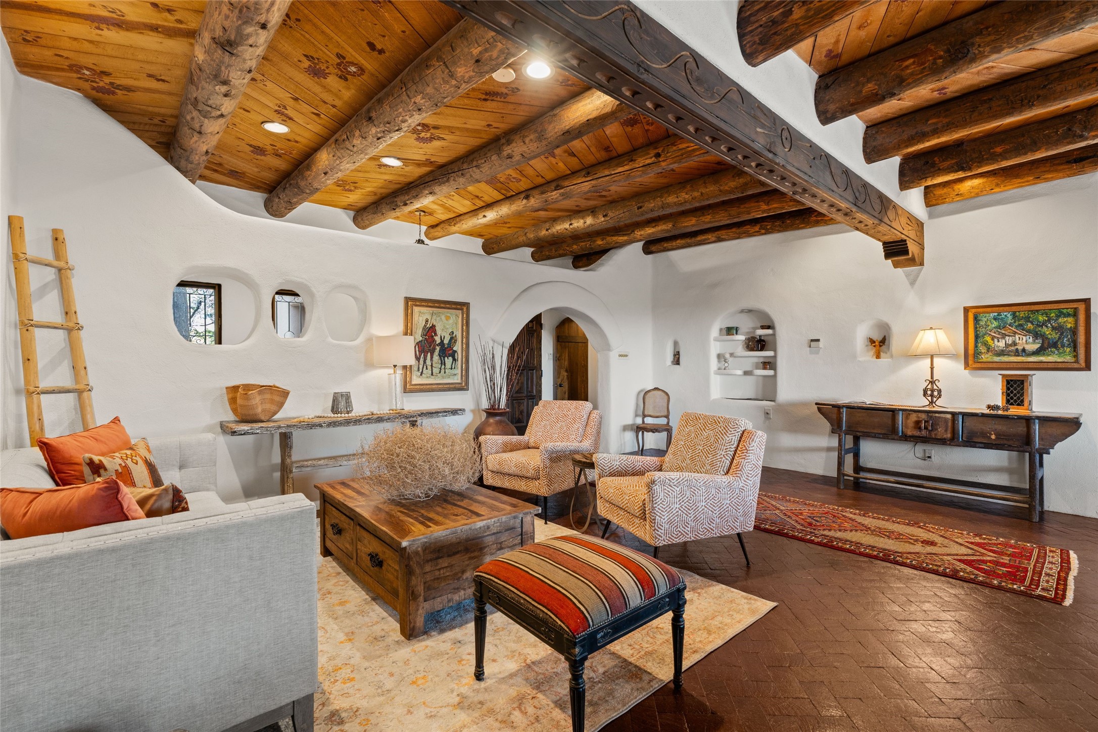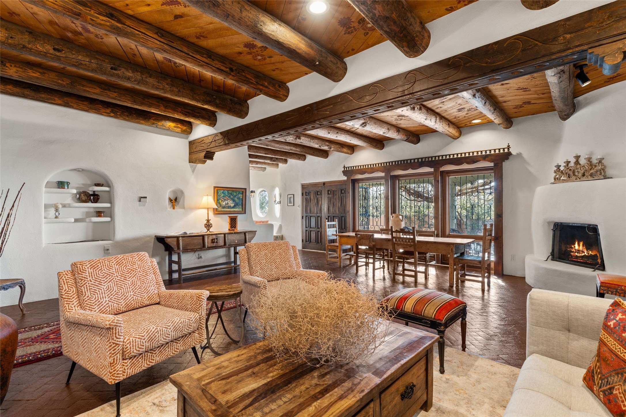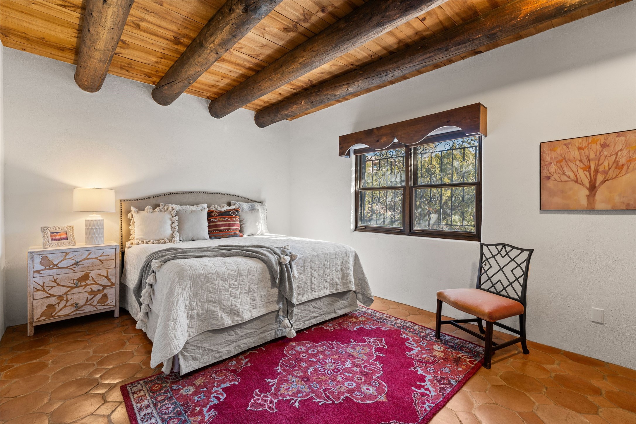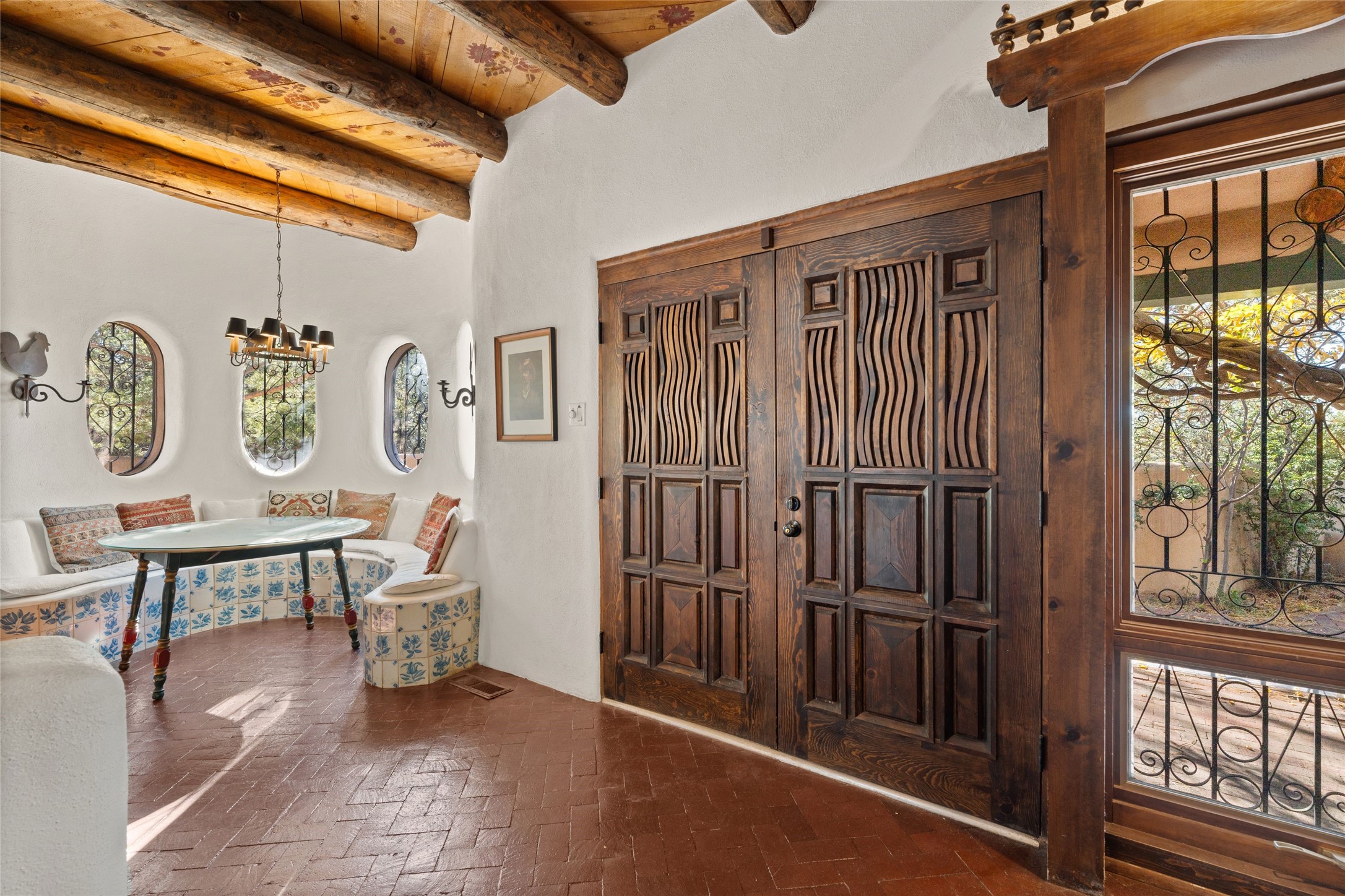 PAUSE and take a moment to step back in time. To a time when life was slower and craftsmanship was the hallmark of fine estates.This elegant main house and guest house are located on a lush acre in the City of Santa Fe, on a private well with the option of City water. Set in scenic surroundings, there are hiking, biking and skiing amenities nearby.Built in 1979, the main house is single level, with spacious living areas, an open-plan kitchen and circular breakfast nook. The handsome living/dining room accesses patios that run the full length of the house. The secluded principal bedroom suite, with private bathroom and dressing area, is situated at the end of a long art gallery. The large library with fireplace is adjacent to the living room and can be configured with a daybed to serve as a second bedroom.Savor the details of this elegant, romantic home: antique, hand-carved doors; exquisite ceilings with vigas, beams and stamped, herringbone decking; imported Portuguese tiles, built-in bancos and display nichos; gleaming brick floors; and three fireplaces exhibiting artisanal, wrought iron screens.The detached, multi-purpose guest house, built in 1985, has also served as an art studio, private office and rental opportunity. Consisting of a large bedroom, living room with fireplace, studio area, bathroom and kitchenette, it has a fenced deck with stunning views to the Sun and Moon mountains.The entire property has remarkable panoramic vistas, sheltered gardens with mature landscaping that meanders to a meditation area, and extensive brick patios providing a superb entertainment venue.