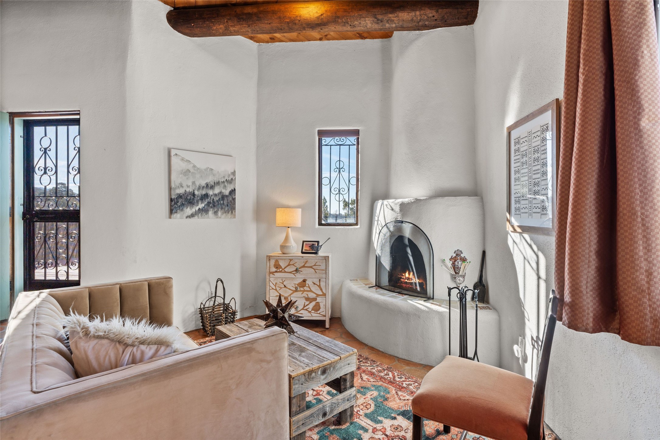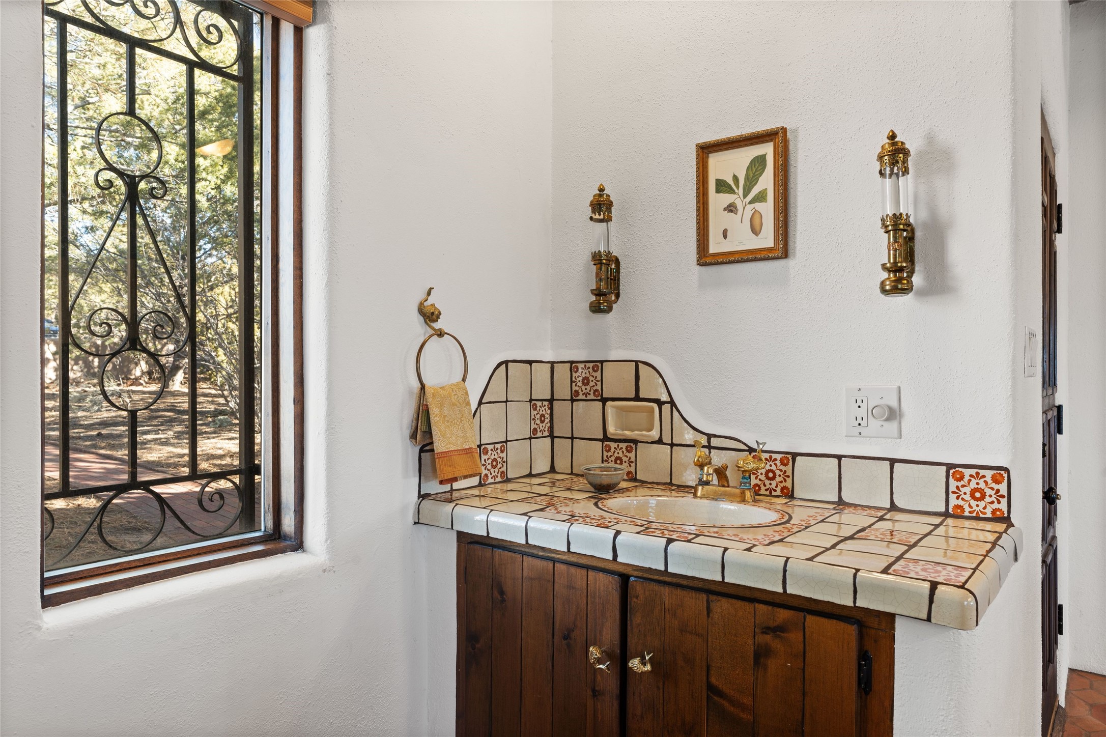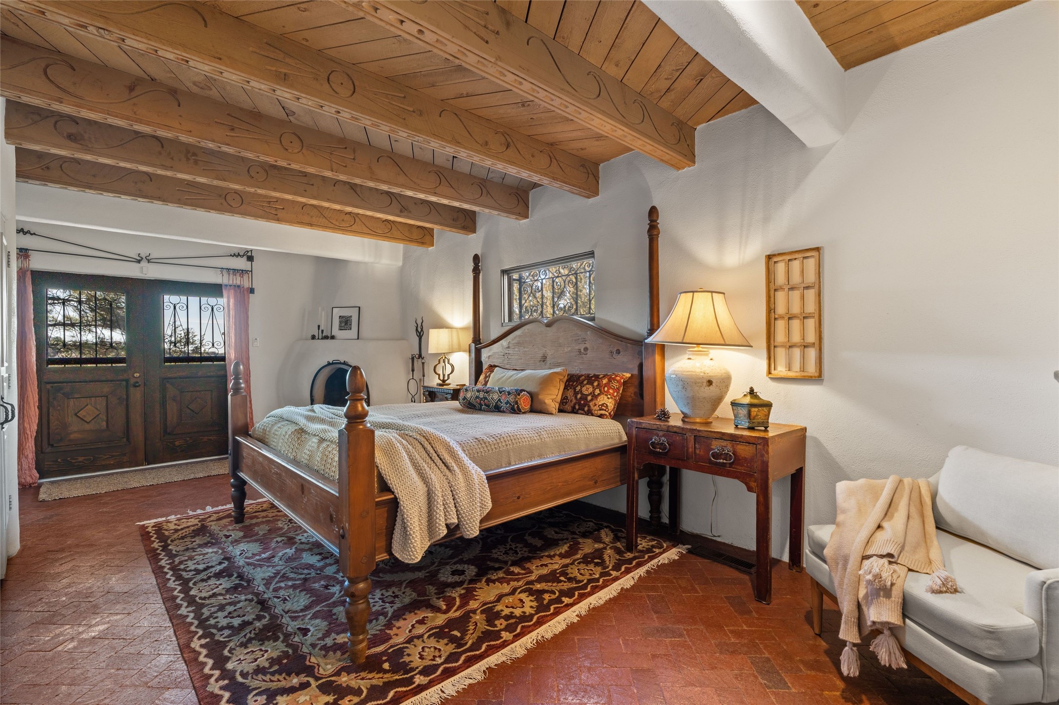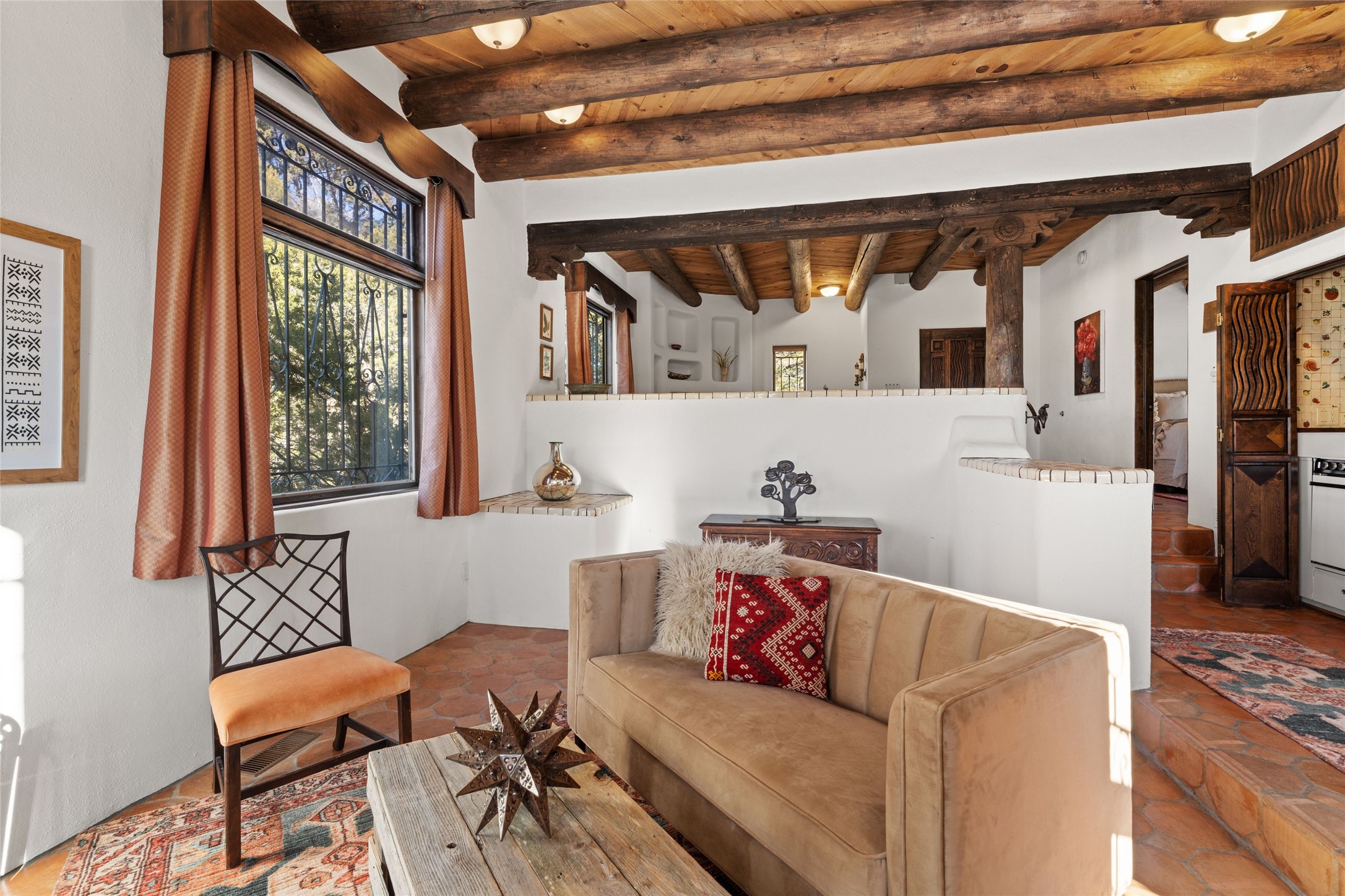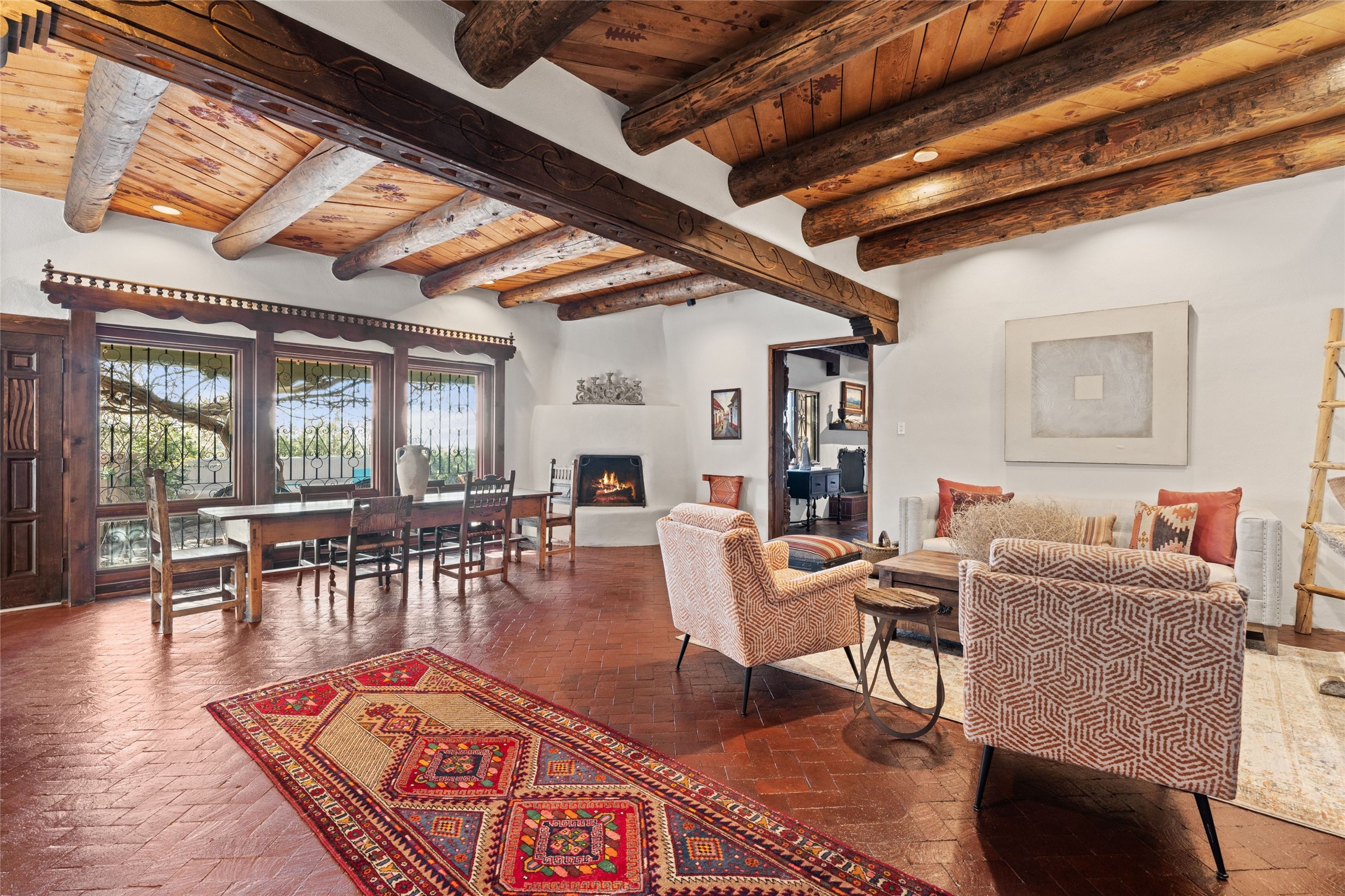 PAUSE and take a moment to step back in time. To a time when life was slower and craftsmanship was the hallmark of fine estates.This elegant main house and guest house are located on a lush acre in the City of Santa Fe, on a private well with the option of City water. Set in scenic surroundings, there are hiking, biking and skiing amenities nearby.Built in 1979, the main house is single level, with spacious living areas, an open-plan kitchen and circular breakfast nook. The handsome living/dining room accesses patios that run the full length of the house. The secluded principal bedroom suite, with private bathroom and dressing area, is situated at the end of a long art gallery. The large library with fireplace is adjacent to the living room and can be configured with a daybed to serve as a second bedroom.Savor the details of this elegant, romantic home: antique, hand-carved doors; exquisite ceilings with vigas, beams and stamped, herringbone decking; imported Portuguese tiles, built-in bancos and display nichos; gleaming brick floors; and three fireplaces exhibiting artisanal, wrought iron screens.The detached, multi-purpose guest house, built in 1985, has also served as an art studio, private office and rental opportunity. Consisting of a large bedroom, living room with fireplace, studio area, bathroom and kitchenette, it has a fenced deck with stunning views to the Sun and Moon mountains.The entire property has remarkable panoramic vistas, sheltered gardens with mature landscaping that meanders to a meditation area, and extensive brick patios providing a superb entertainment venue.