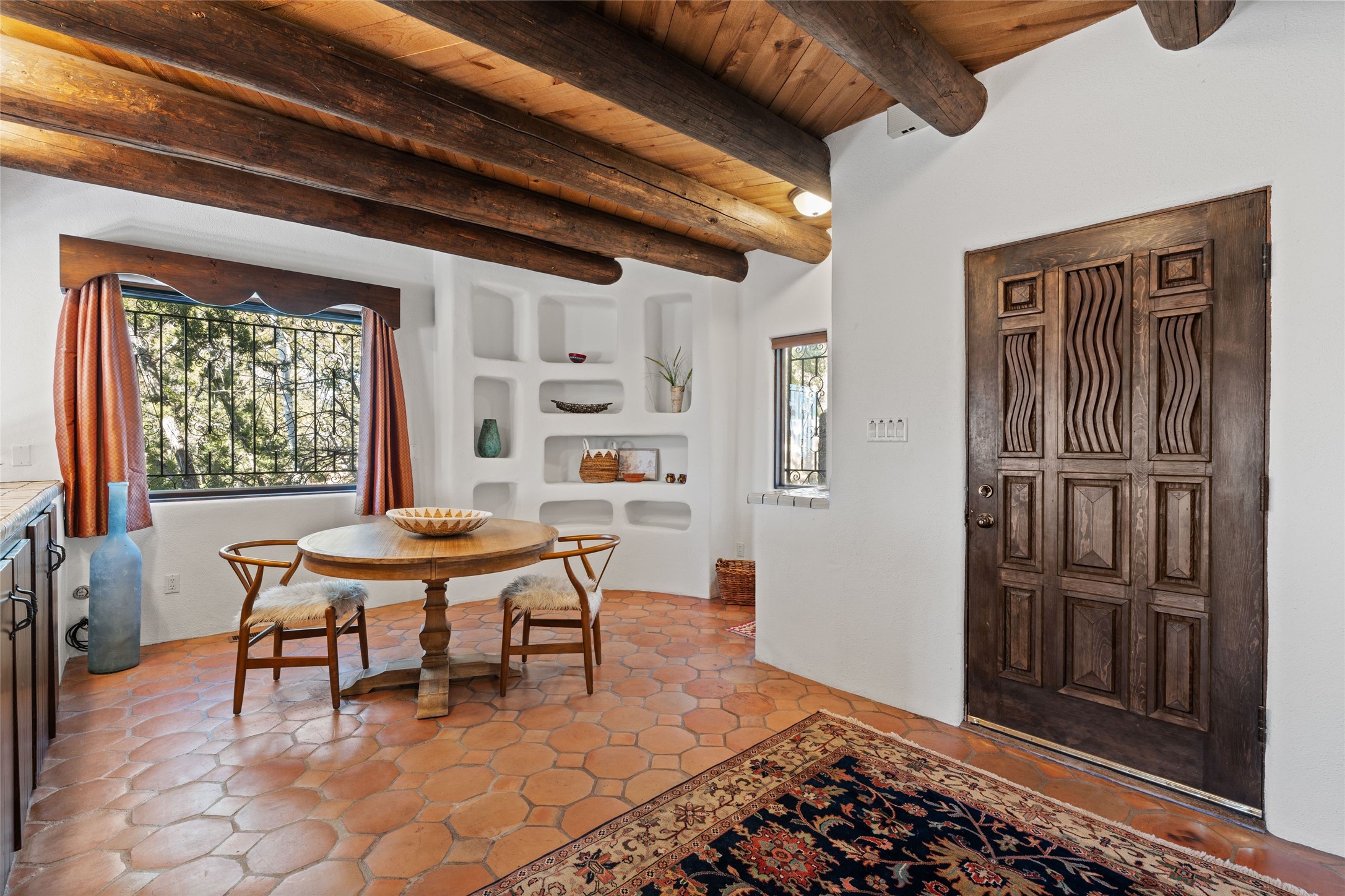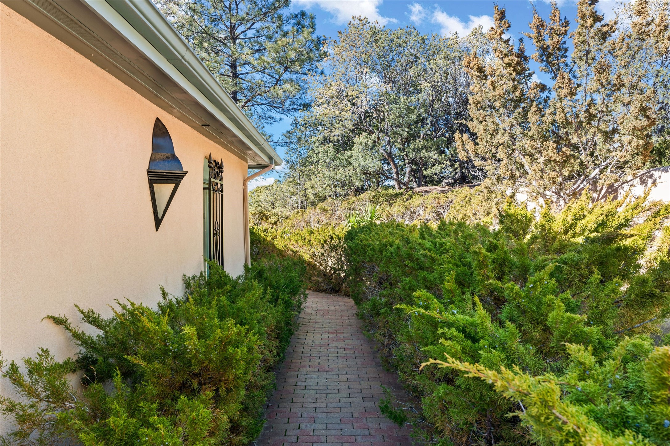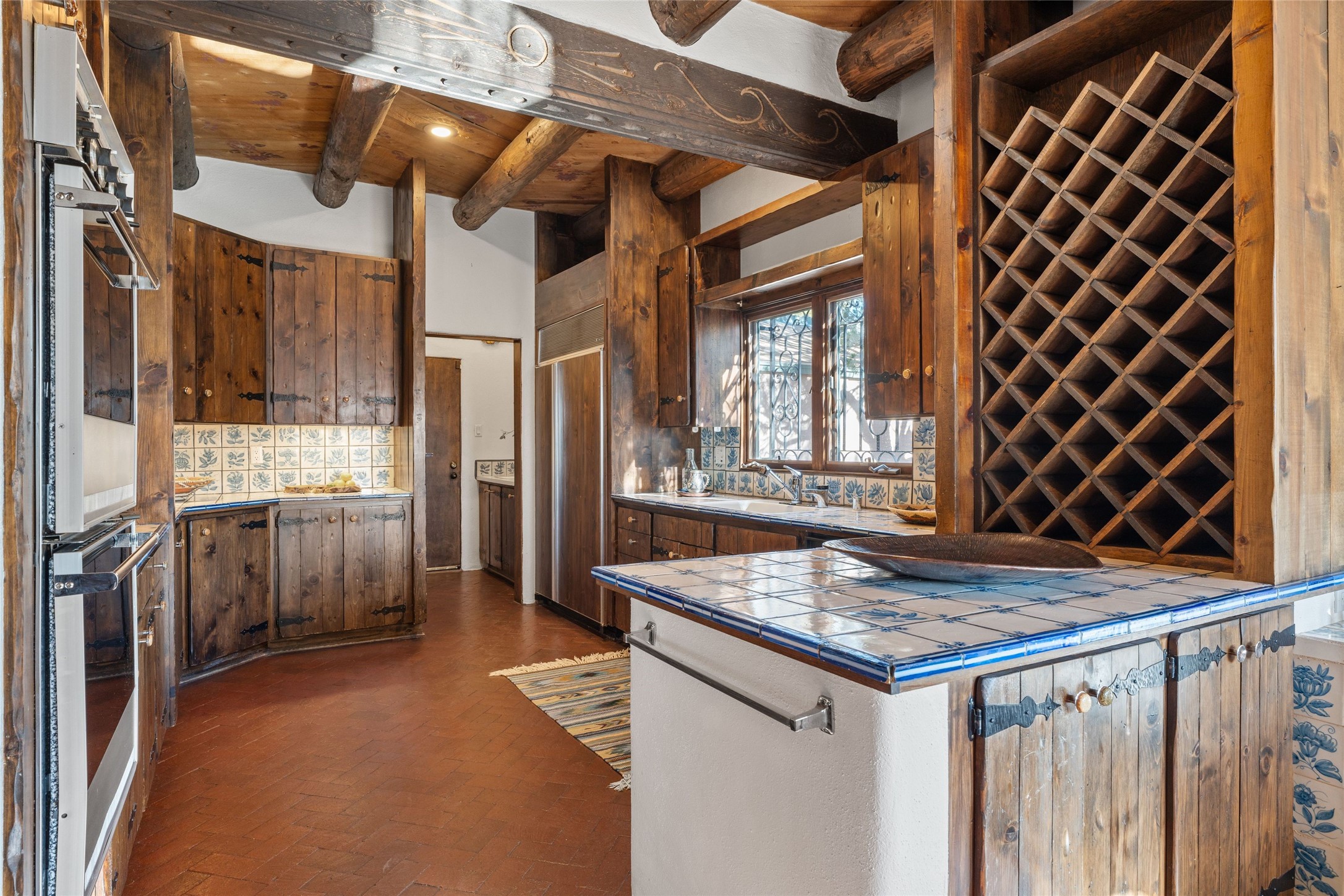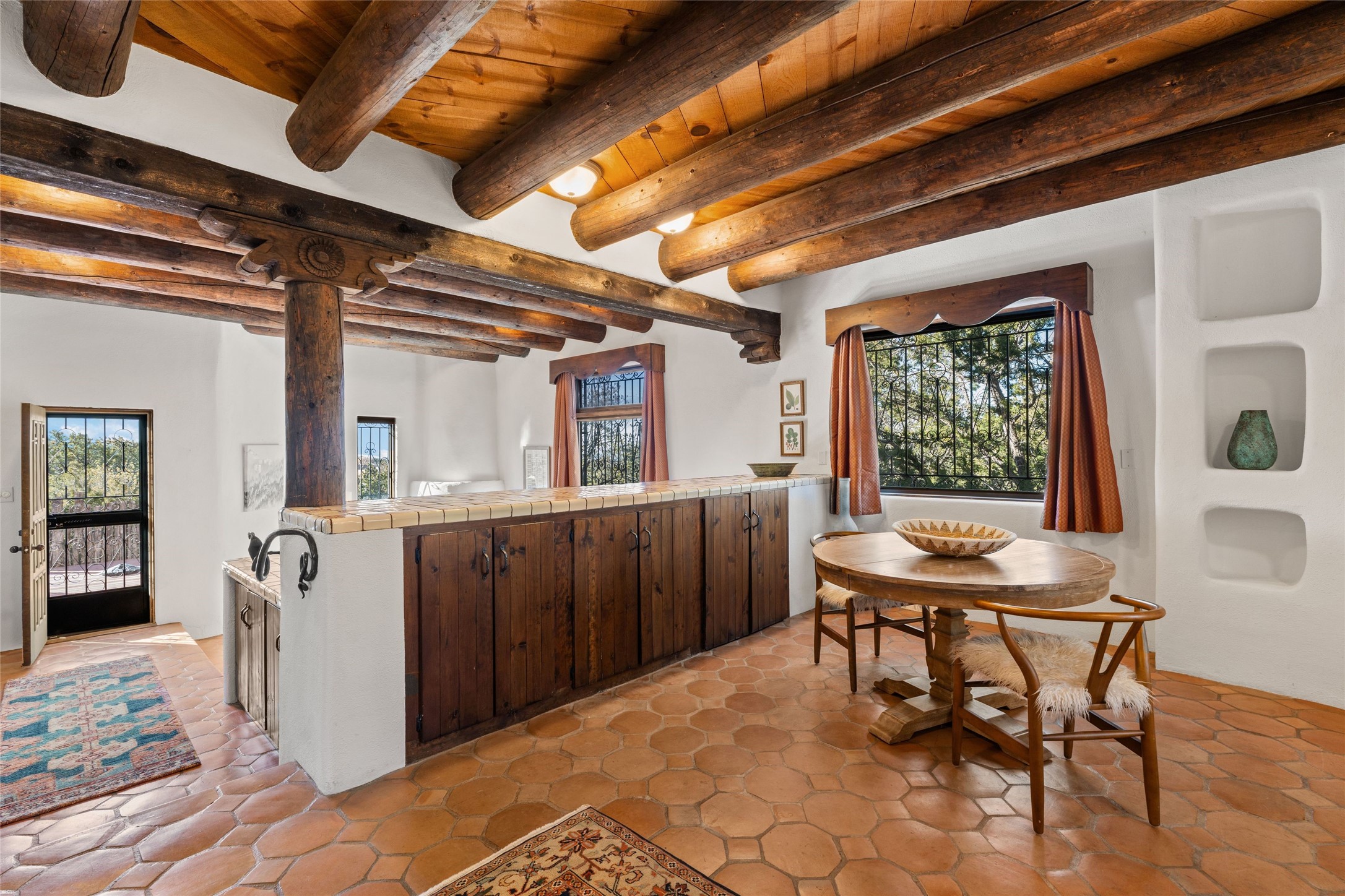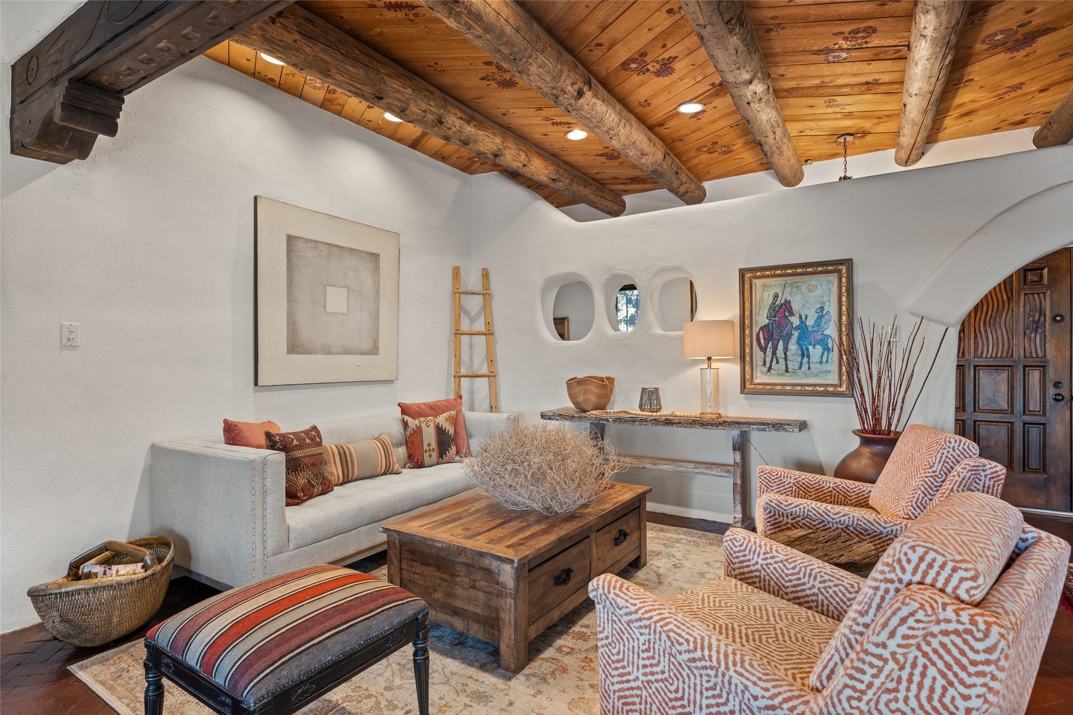 PAUSE and take a moment to step back in time. To a time when life was slower and craftsmanship was the hallmark of fine estates.This elegant main house and guest house are located on a lush acre in the City of Santa Fe, on a private well with the option of City water. Set in scenic surroundings, there are hiking, biking and skiing amenities nearby.Built in 1979, the main house is single level, with spacious living areas, an open-plan kitchen and circular breakfast nook. The handsome living/dining room accesses patios that run the full length of the house. The secluded principal bedroom suite, with private bathroom and dressing area, is situated at the end of a long art gallery. The large library with fireplace is adjacent to the living room and can be configured with a daybed to serve as a second bedroom.Savor the details of this elegant, romantic home: antique, hand-carved doors; exquisite ceilings with vigas, beams and stamped, herringbone decking; imported Portuguese tiles, built-in bancos and display nichos; gleaming brick floors; and three fireplaces exhibiting artisanal, wrought iron screens.The detached, multi-purpose guest house, built in 1985, has also served as an art studio, private office and rental opportunity. Consisting of a large bedroom, living room with fireplace, studio area, bathroom and kitchenette, it has a fenced deck with stunning views to the Sun and Moon mountains.The entire property has remarkable panoramic vistas, sheltered gardens with mature landscaping that meanders to a meditation area, and extensive brick patios providing a superb entertainment venue.