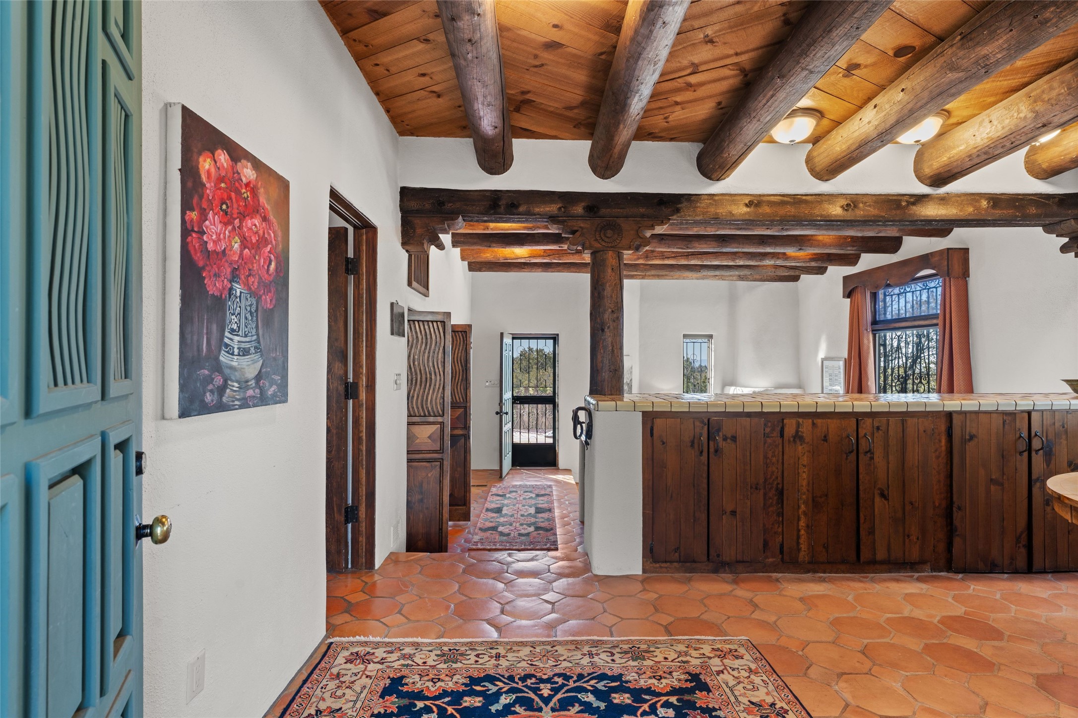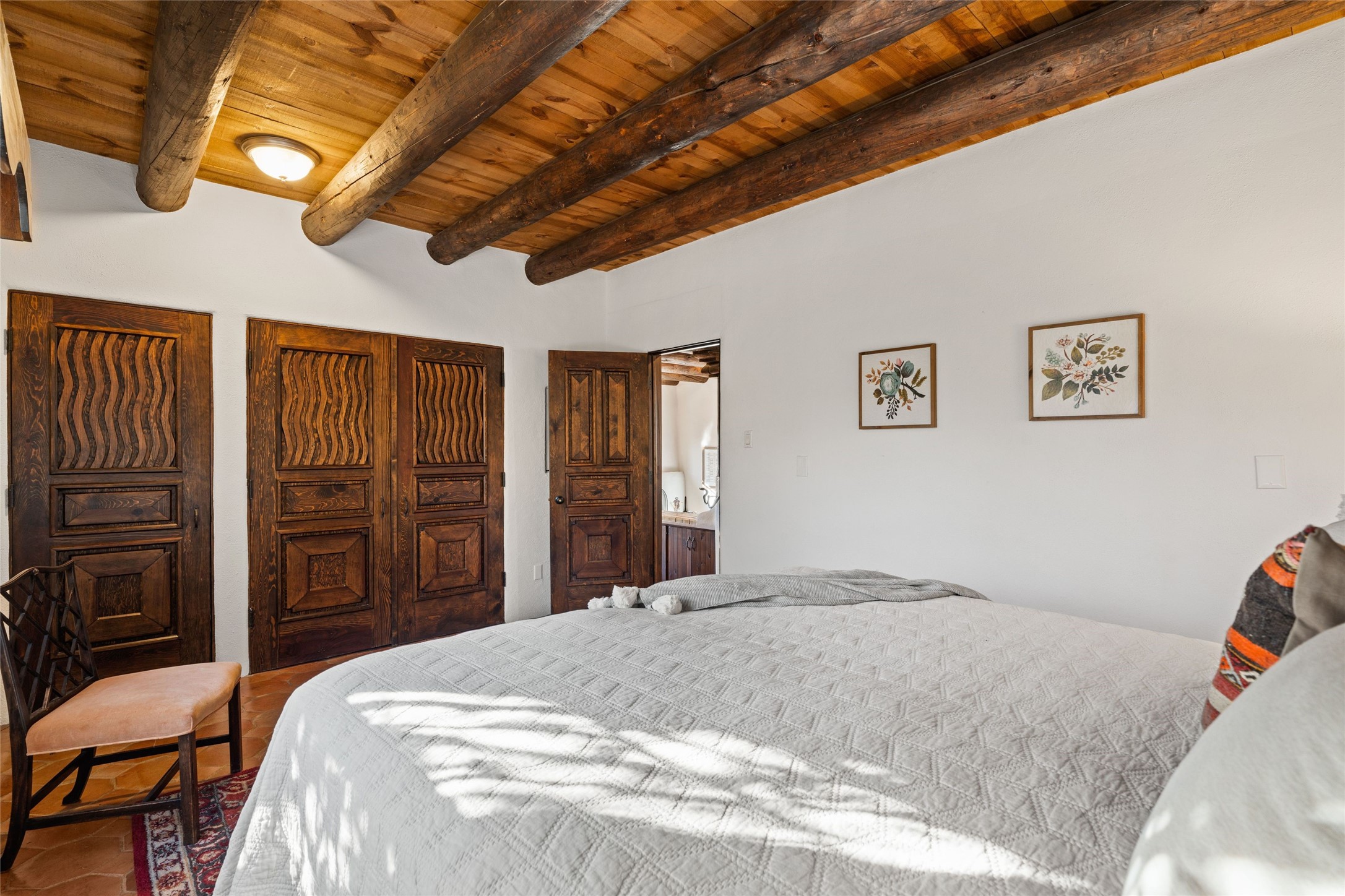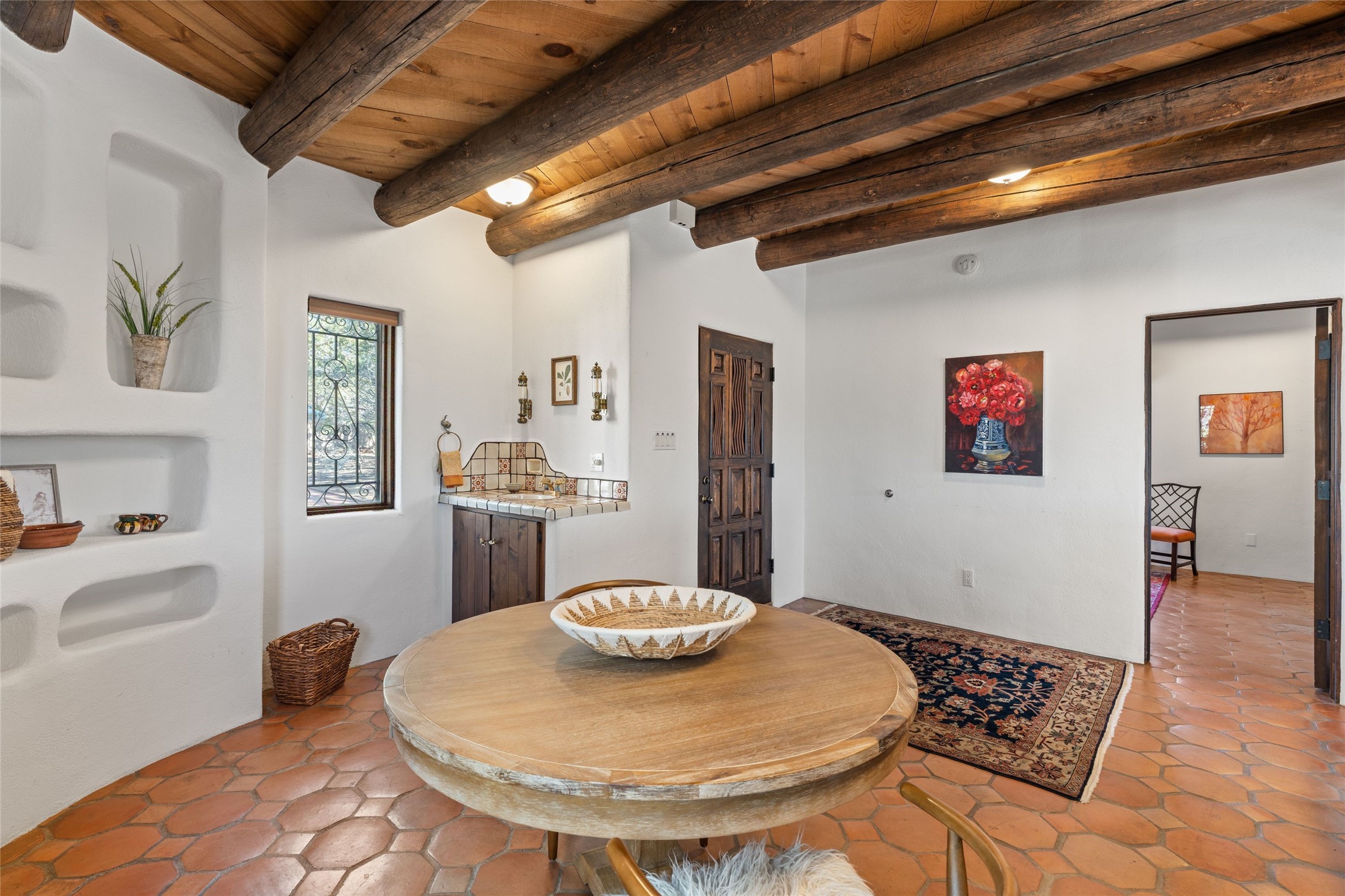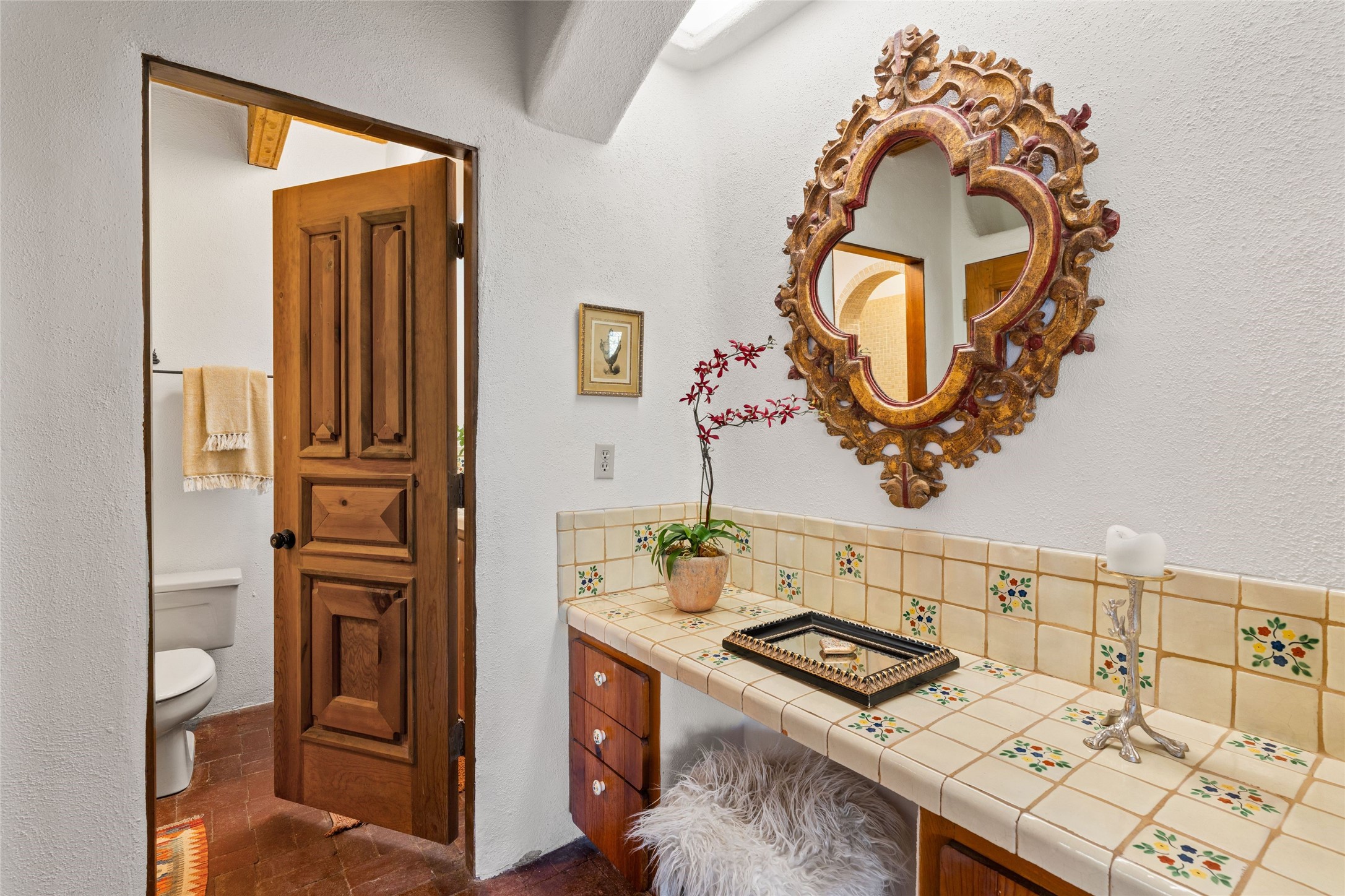 PAUSE and take a moment to step back in time. To a time when life was slower and craftsmanship was the hallmark of fine estates.This elegant main house and guest house are located on a lush acre in the City of Santa Fe, on a private well with the option of City water. Set in scenic surroundings, there are hiking, biking and skiing amenities nearby.Built in 1979, the main house is single level, with spacious living areas, an open-plan kitchen and circular breakfast nook. The handsome living/dining room accesses patios that run the full length of the house. The secluded principal bedroom suite, with private bathroom and dressing area, is situated at the end of a long art gallery. The large library with fireplace is adjacent to the living room and can be configured with a daybed to serve as a second bedroom.Savor the details of this elegant, romantic home: antique, hand-carved doors; exquisite ceilings with vigas, beams and stamped, herringbone decking; imported Portuguese tiles, built-in bancos and display nichos; gleaming brick floors; and three fireplaces exhibiting artisanal, wrought iron screens.The detached, multi-purpose guest house, built in 1985, has also served as an art studio, private office and rental opportunity. Consisting of a large bedroom, living room with fireplace, studio area, bathroom and kitchenette, it has a fenced deck with stunning views to the Sun and Moon mountains.The entire property has remarkable panoramic vistas, sheltered gardens with mature landscaping that meanders to a meditation area, and extensive brick patios providing a superb entertainment venue.