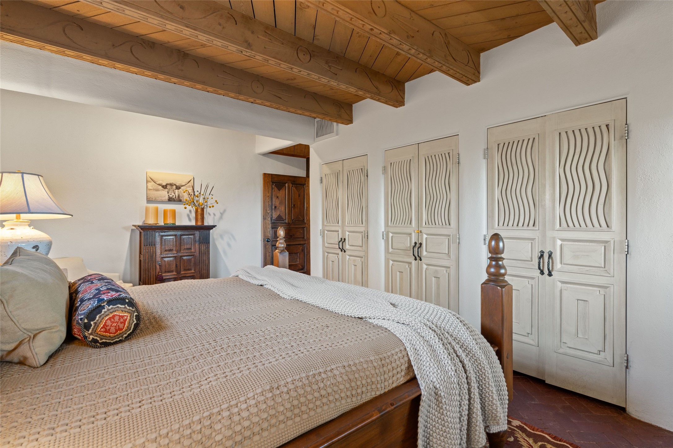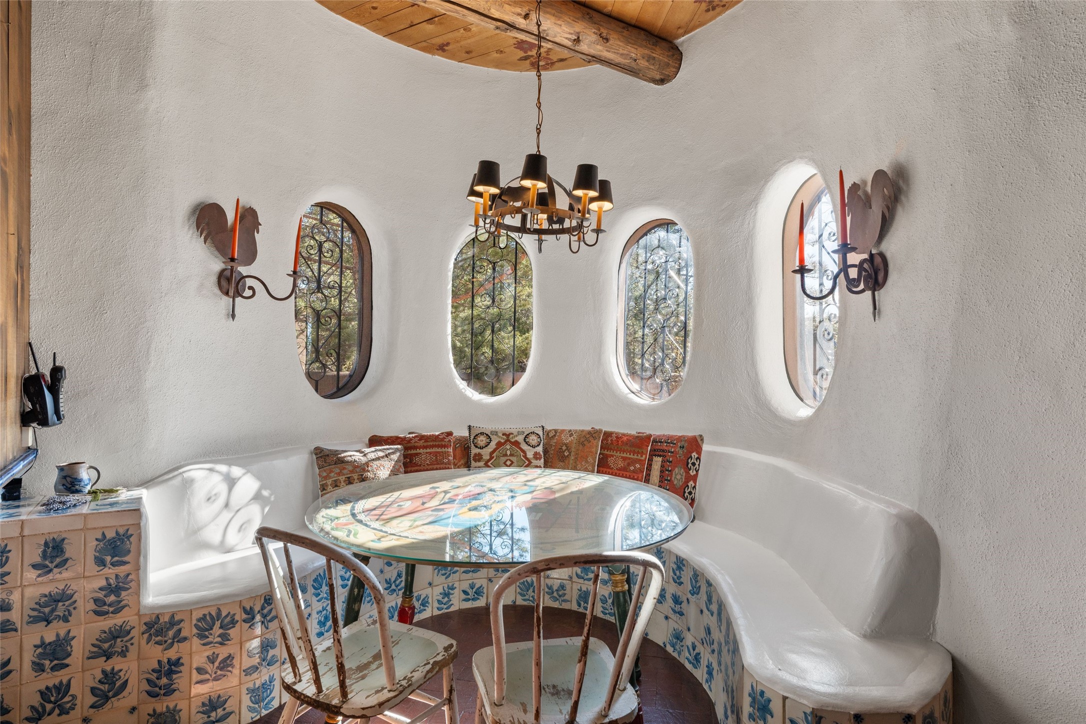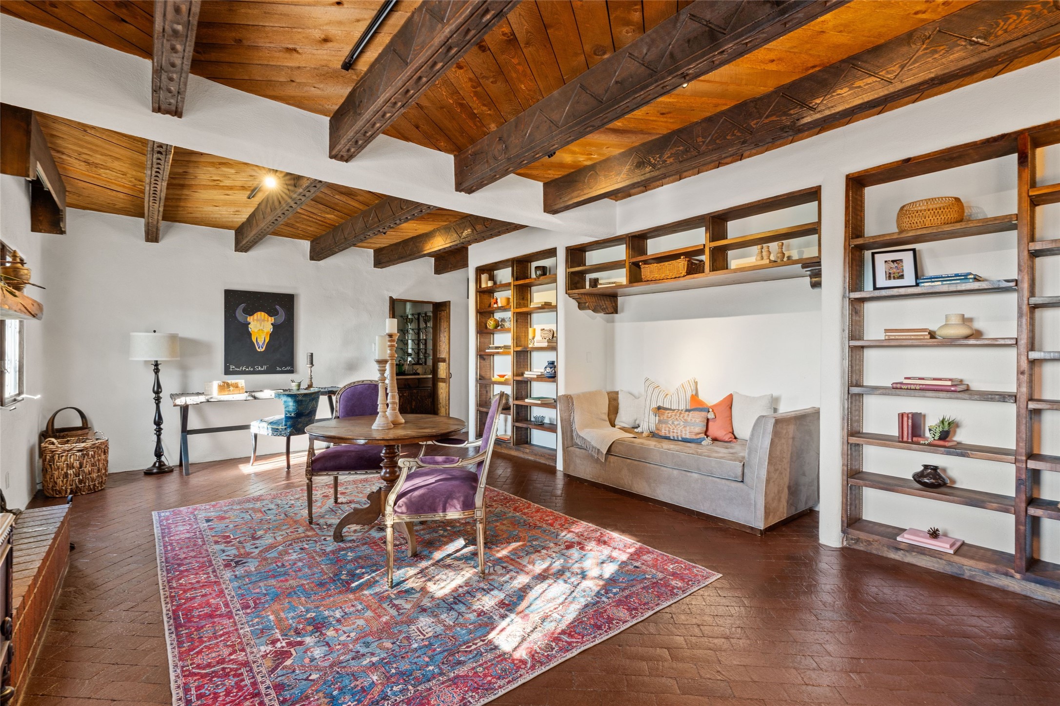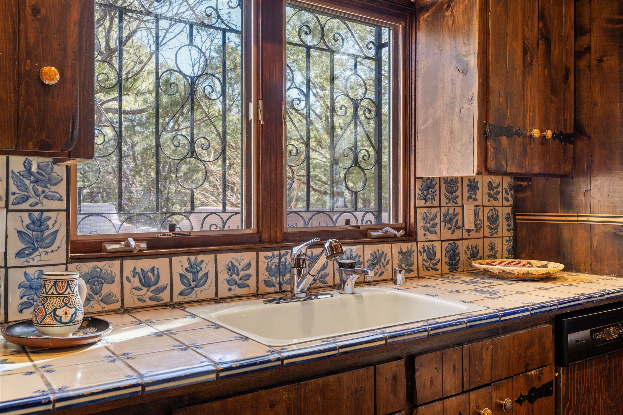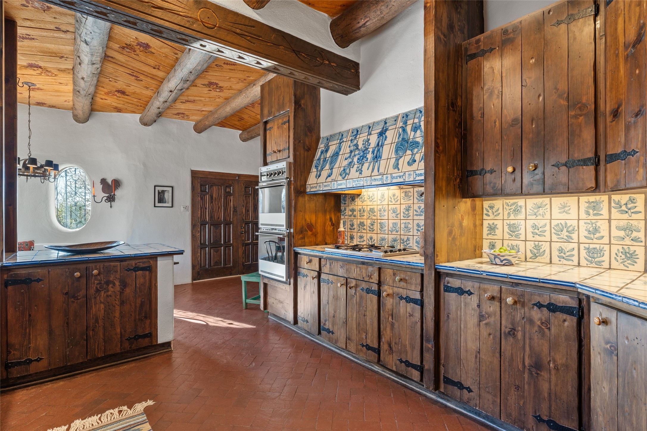 PAUSE and take a moment to step back in time. To a time when life was slower and craftsmanship was the hallmark of fine estates.This elegant main house and guest house are located on a lush acre in the City of Santa Fe, on a private well with the option of City water. Set in scenic surroundings, there are hiking, biking and skiing amenities nearby.Built in 1979, the main house is single level, with spacious living areas, an open-plan kitchen and circular breakfast nook. The handsome living/dining room accesses patios that run the full length of the house. The secluded principal bedroom suite, with private bathroom and dressing area, is situated at the end of a long art gallery. The large library with fireplace is adjacent to the living room and can be configured with a daybed to serve as a second bedroom.Savor the details of this elegant, romantic home: antique, hand-carved doors; exquisite ceilings with vigas, beams and stamped, herringbone decking; imported Portuguese tiles, built-in bancos and display nichos; gleaming brick floors; and three fireplaces exhibiting artisanal, wrought iron screens.The detached, multi-purpose guest house, built in 1985, has also served as an art studio, private office and rental opportunity. Consisting of a large bedroom, living room with fireplace, studio area, bathroom and kitchenette, it has a fenced deck with stunning views to the Sun and Moon mountains.The entire property has remarkable panoramic vistas, sheltered gardens with mature landscaping that meanders to a meditation area, and extensive brick patios providing a superb entertainment venue.