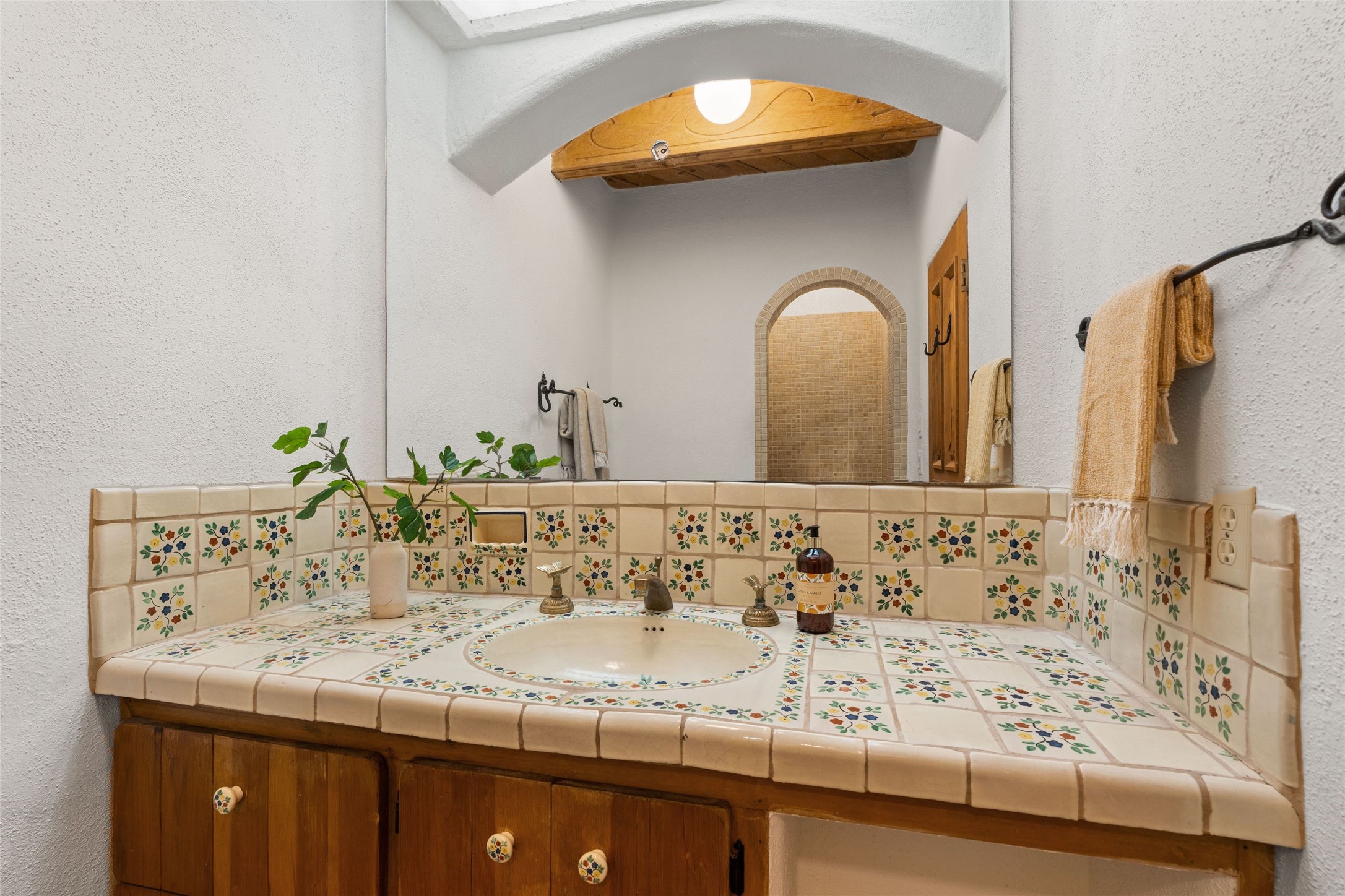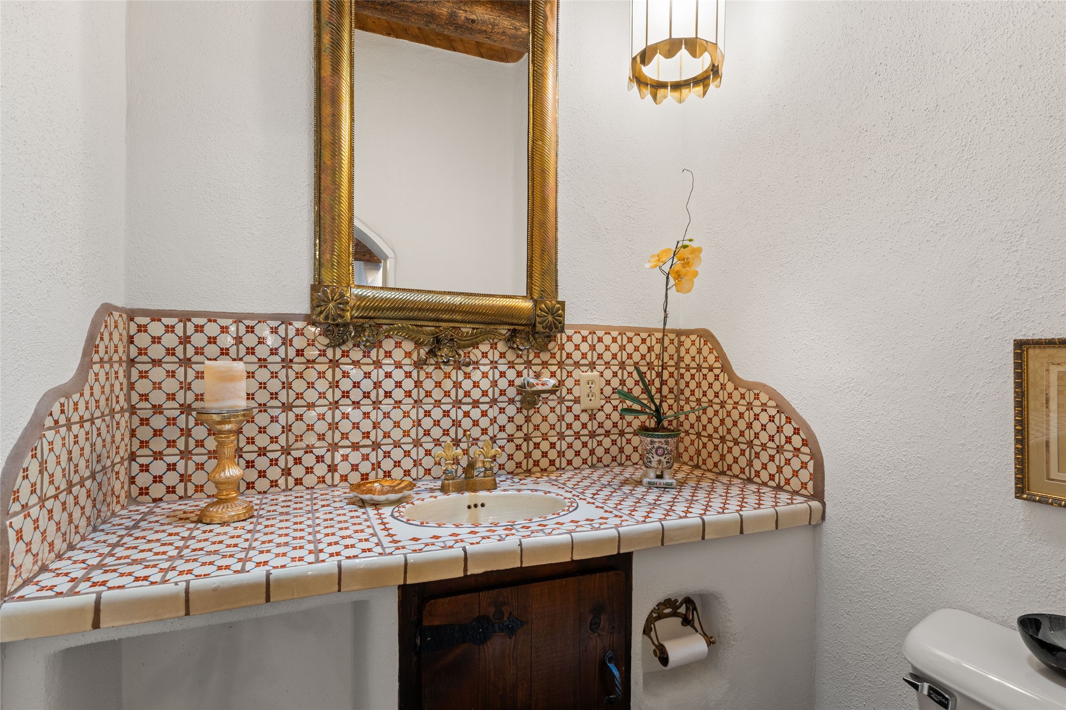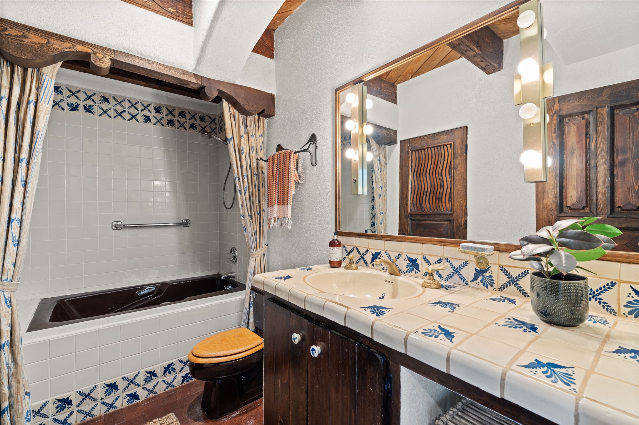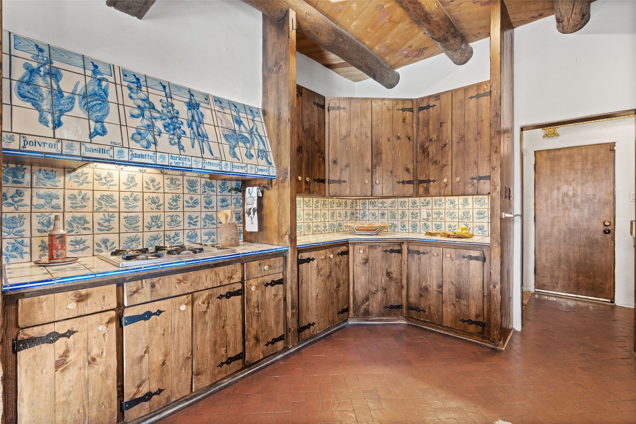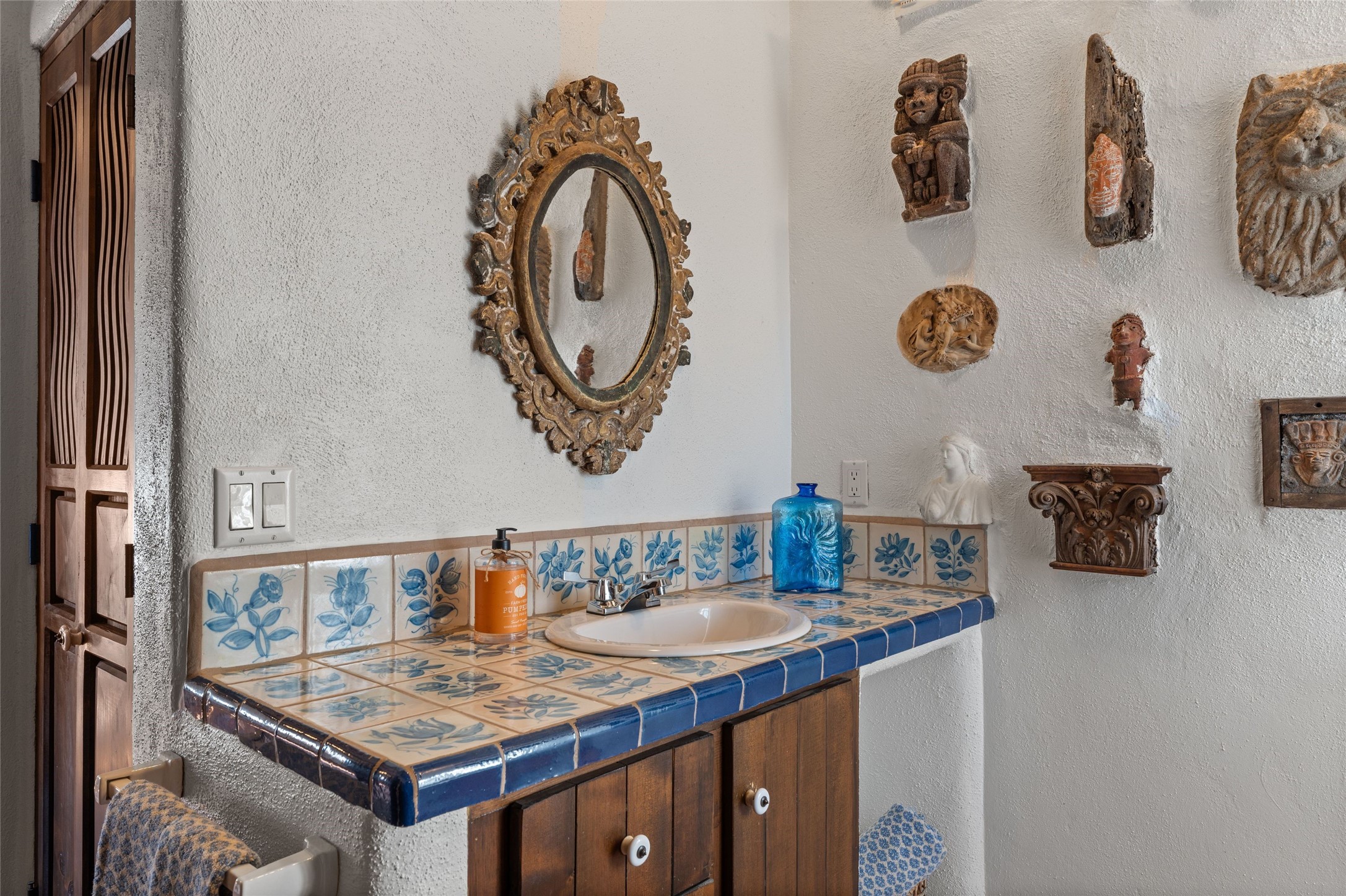 PAUSE and take a moment to step back in time. To a time when life was slower and craftsmanship was the hallmark of fine estates.This elegant main house and guest house are located on a lush acre in the City of Santa Fe, on a private well with the option of City water. Set in scenic surroundings, there are hiking, biking and skiing amenities nearby.Built in 1979, the main house is single level, with spacious living areas, an open-plan kitchen and circular breakfast nook. The handsome living/dining room accesses patios that run the full length of the house. The secluded principal bedroom suite, with private bathroom and dressing area, is situated at the end of a long art gallery. The large library with fireplace is adjacent to the living room and can be configured with a daybed to serve as a second bedroom.Savor the details of this elegant, romantic home: antique, hand-carved doors; exquisite ceilings with vigas, beams and stamped, herringbone decking; imported Portuguese tiles, built-in bancos and display nichos; gleaming brick floors; and three fireplaces exhibiting artisanal, wrought iron screens.The detached, multi-purpose guest house, built in 1985, has also served as an art studio, private office and rental opportunity. Consisting of a large bedroom, living room with fireplace, studio area, bathroom and kitchenette, it has a fenced deck with stunning views to the Sun and Moon mountains.The entire property has remarkable panoramic vistas, sheltered gardens with mature landscaping that meanders to a meditation area, and extensive brick patios providing a superb entertainment venue.