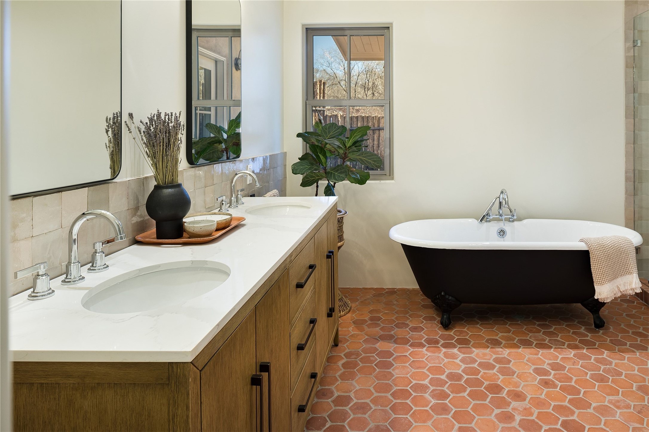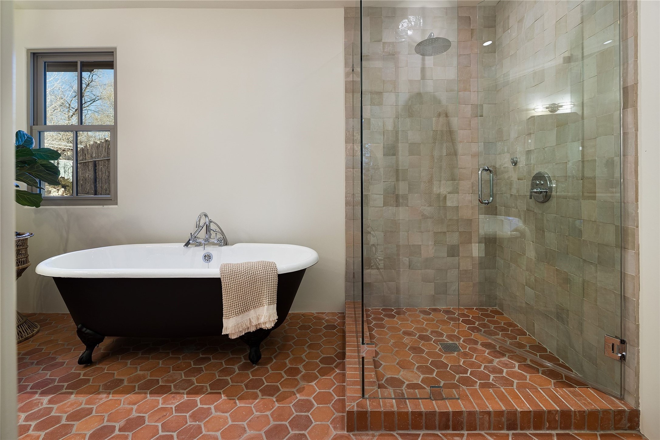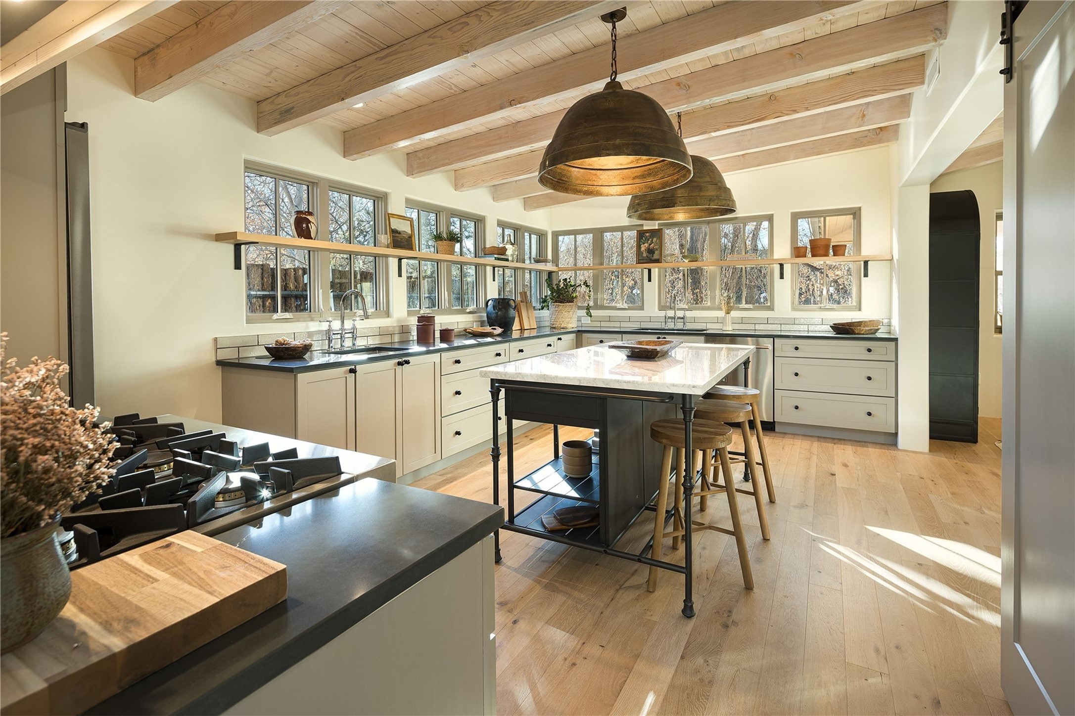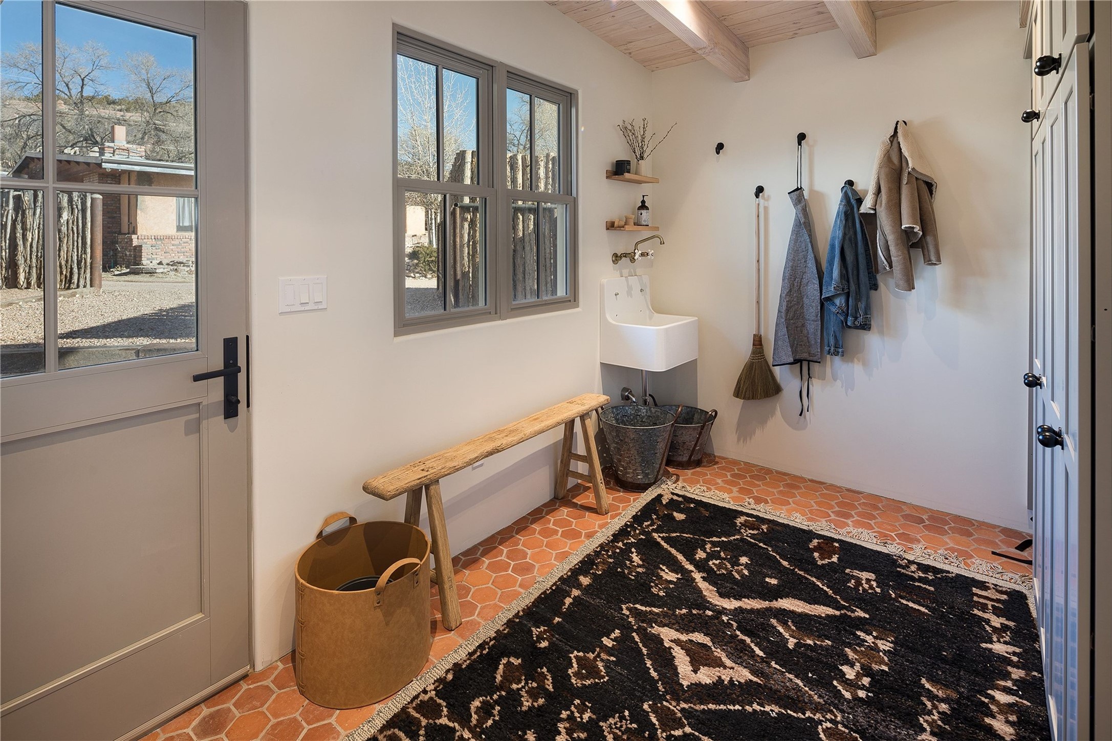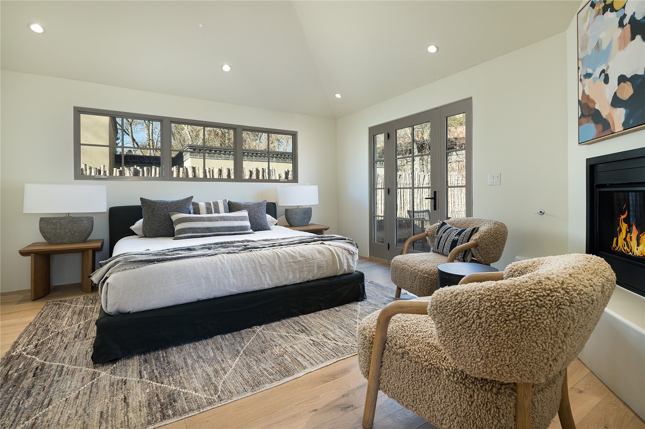 Welcome to 1109 E. Alameda, one of the most exciting homes on the Historic Eastside of Santa Fe. Walking distance to the world renown Canyon Road and the Santa Fe Plaza, this beautifully designed home by Cara Scarola of Woods Design Builders, excites and captivates with timeless historic architecture and exceptional luxury finishes. Located on one of most iconic streets in Santa Fe and sited directly across from Patrick Smith Park and the Santa Fe River, this craftsman style home exemplifies the unique blend of fresh, modern design with inherent warmth and sophistication. Ideal as a primary residence or the ultimate secondary home retreat, this newly completed masterpiece, impresses with the ultimate chef's kitchen complete with professional grade appliances, surround view windows, Carrara marble island, floating cabinetry, dual sinks, and a well-appointed butler's pantry, all of which perfectly opens to the spacious open-concept living room and dining room, with vaulted ceilings, gas fireplace and outdoor access. The tranquil primary suite delights with its own private patio, raised gas fireplace and a stunning spa-like bath with terra cotta tile flooring, custom wall tiles, dual vanities, free standing tub, walk-in shower and a large walk-in closet. Two additional guest bedrooms offer comfort and privacy, which share an extraordinary, spacious full bath with dual vanities, a claw-foot tub, a modern walk-in glass shower, designer finishes and a walk-in closet. Exceptional features include white oak flooring throughout the main living areas, square beam and vaulted ceilings, clerestory windows in the living room and hallway, soft natural light, a spacious laundry room and a front entrance mudroom with a utility sink. Parking includes two fenced, designated parking spaces. This newly rebuilt home is an absolute work of art, move-in ready and not to be missed! All furnishings are available for purchase on a separate bill of sale.