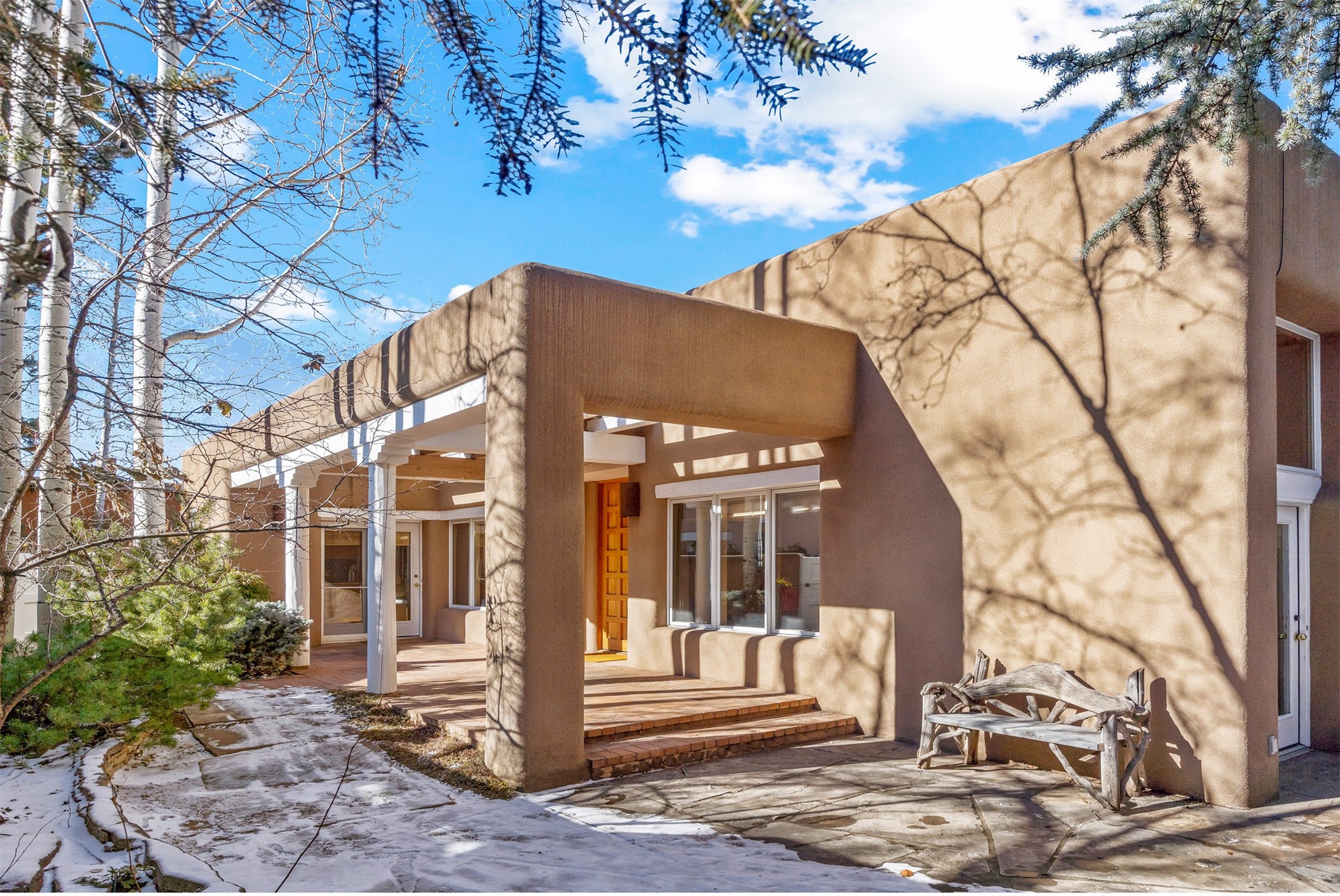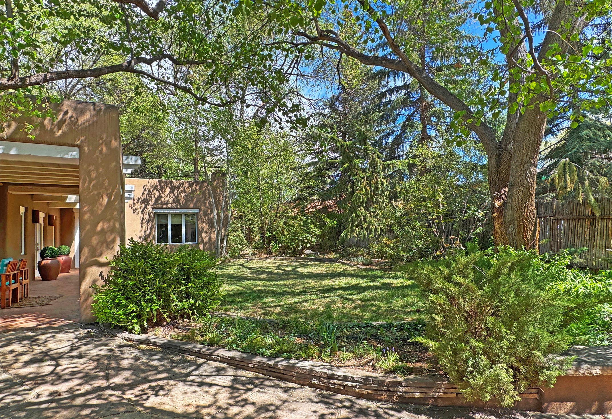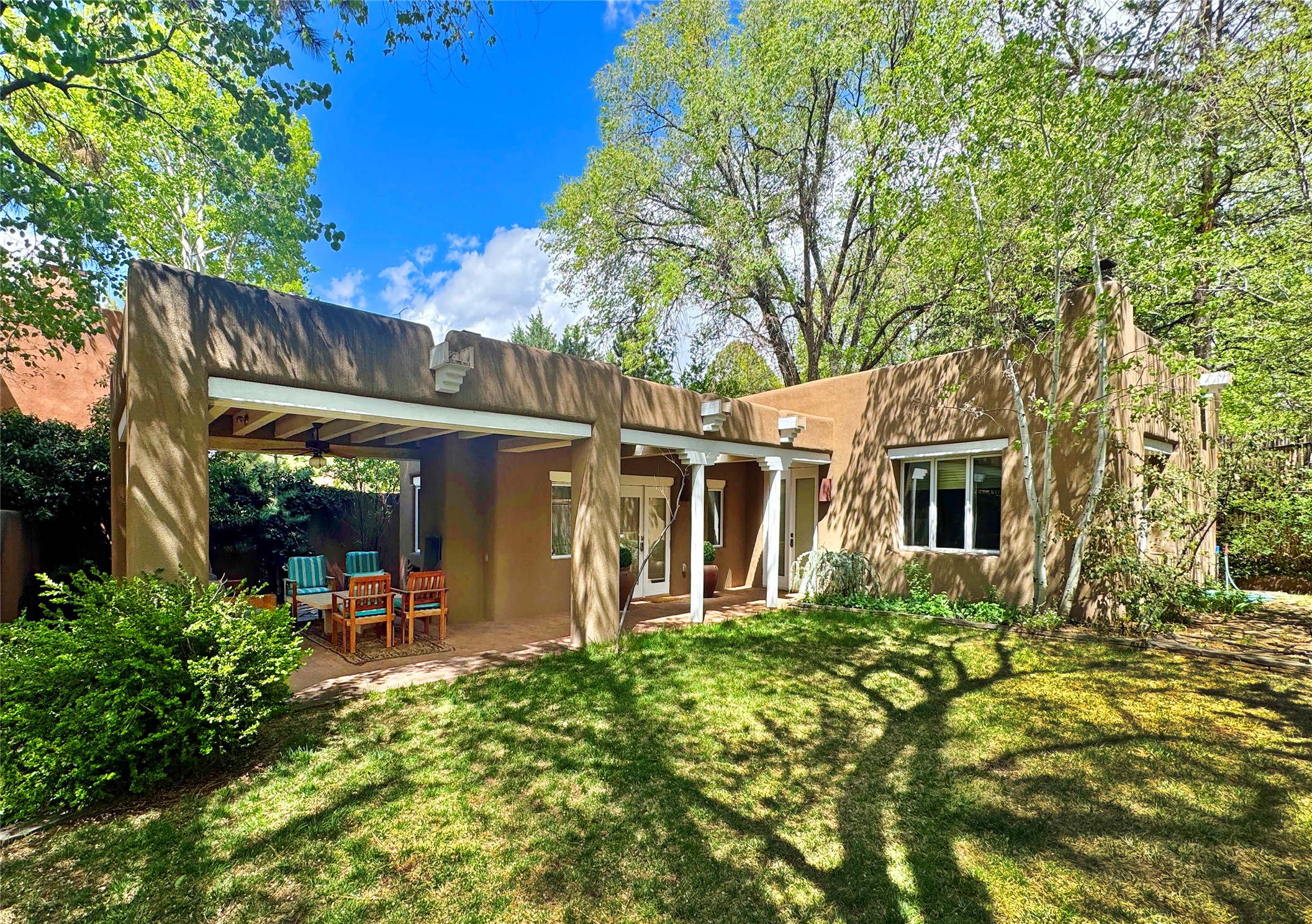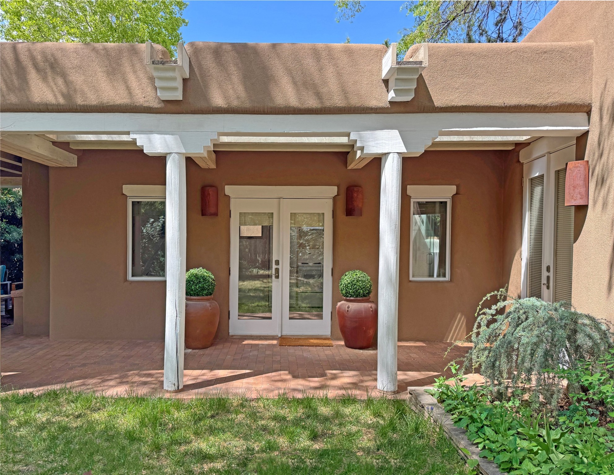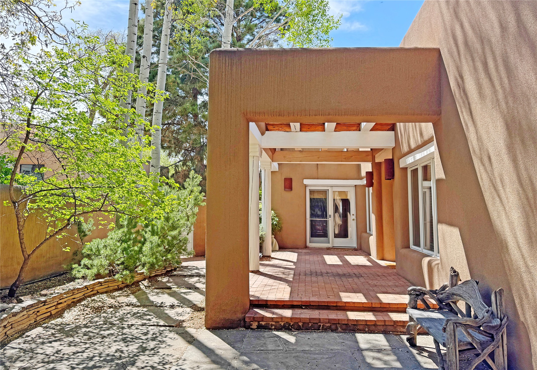 This refined house and guest house, on the market for the first time,is a hidden gem that's private, quiet, with a feeling of seclusion and set back on a charming street on the Eastside. The grounds unfold beyond the gate to a spacious,idyllic and entirely enclosed compound on .23 acres that is truly nestled among mature aspens and pines.The architectural harmony and green space create a feeling of tranquility, as if you're on retreat.The outdoor area, with garden beds and paved flagstone, brick patios and walkways, offer abundant opportunities for relaxation and entertaining.The great room has ceilings that soar to 14 ft. in height, a gracious primary bedroom has lovely views and spa-like ensuite bath.The home was refreshed to include wood and travertine flooring and a sunny kitchen with stunning granite counters.The pantry connects the kitchen to a rare feature:a two car attached garage.The loggias /extended portals frame lovely views and create a sense of movement and passage. Rich surfaces, fine details and classical references create a comfortable, polished and timeless take on Santa Fe style as designed by the award winning architect, Robert Zachry.Elegant details include fine metal and woodwork, skylights, symmetrical vigas, polished latillas, abundant storage, fireplaces and six French doors that make for breezy access to the lovely lawn and garden that connects the two homes.The guest house adds continuity of design and charm.What makes it truly special is the versatility of the spaces, with plenty of options as a home office and for guests. Inviting and soothing views connect you to the garden and the main house.A deep covered portal creates an al fresco room, with a generous patio and outdoor fireplace that's the perfect hub for garden parties and to enjoy quality time with family and friends.You are mere minutes from exciting Canyon Road and the Santa Fe Plaza and Kaunes grocery is just around the corner. Come and experience this place to call home.