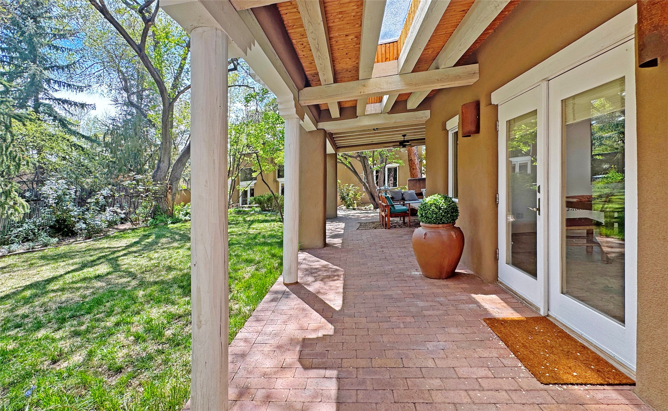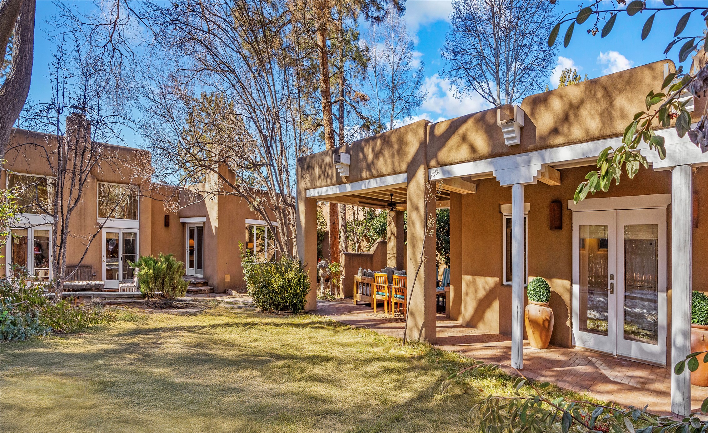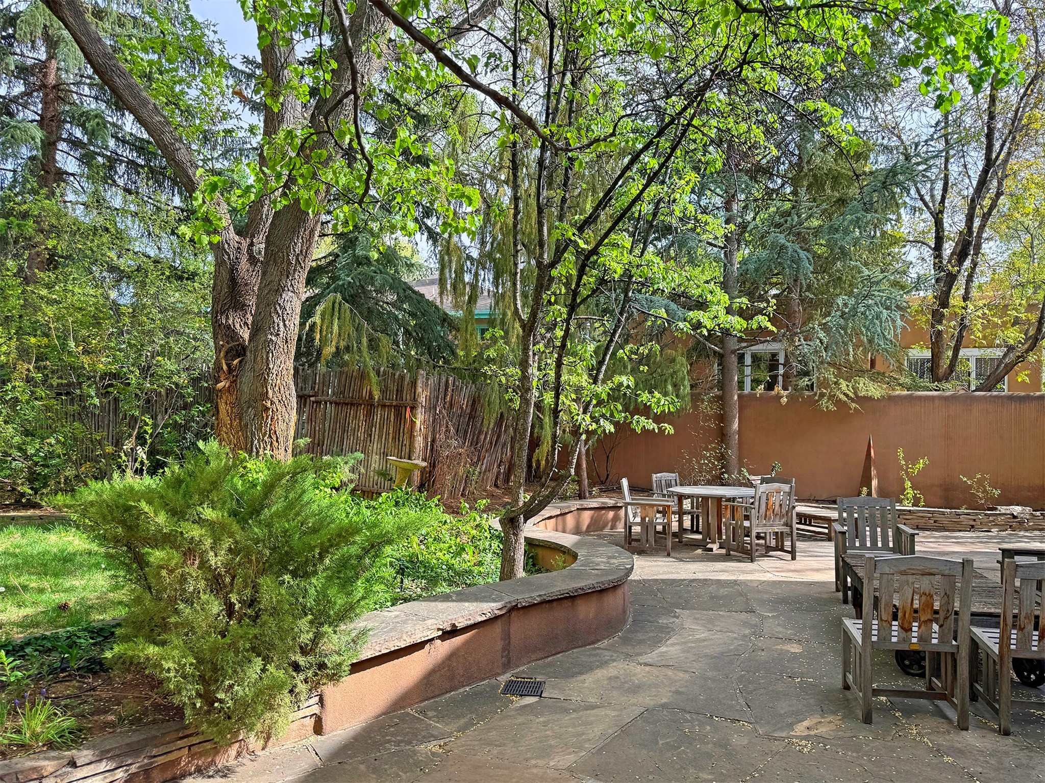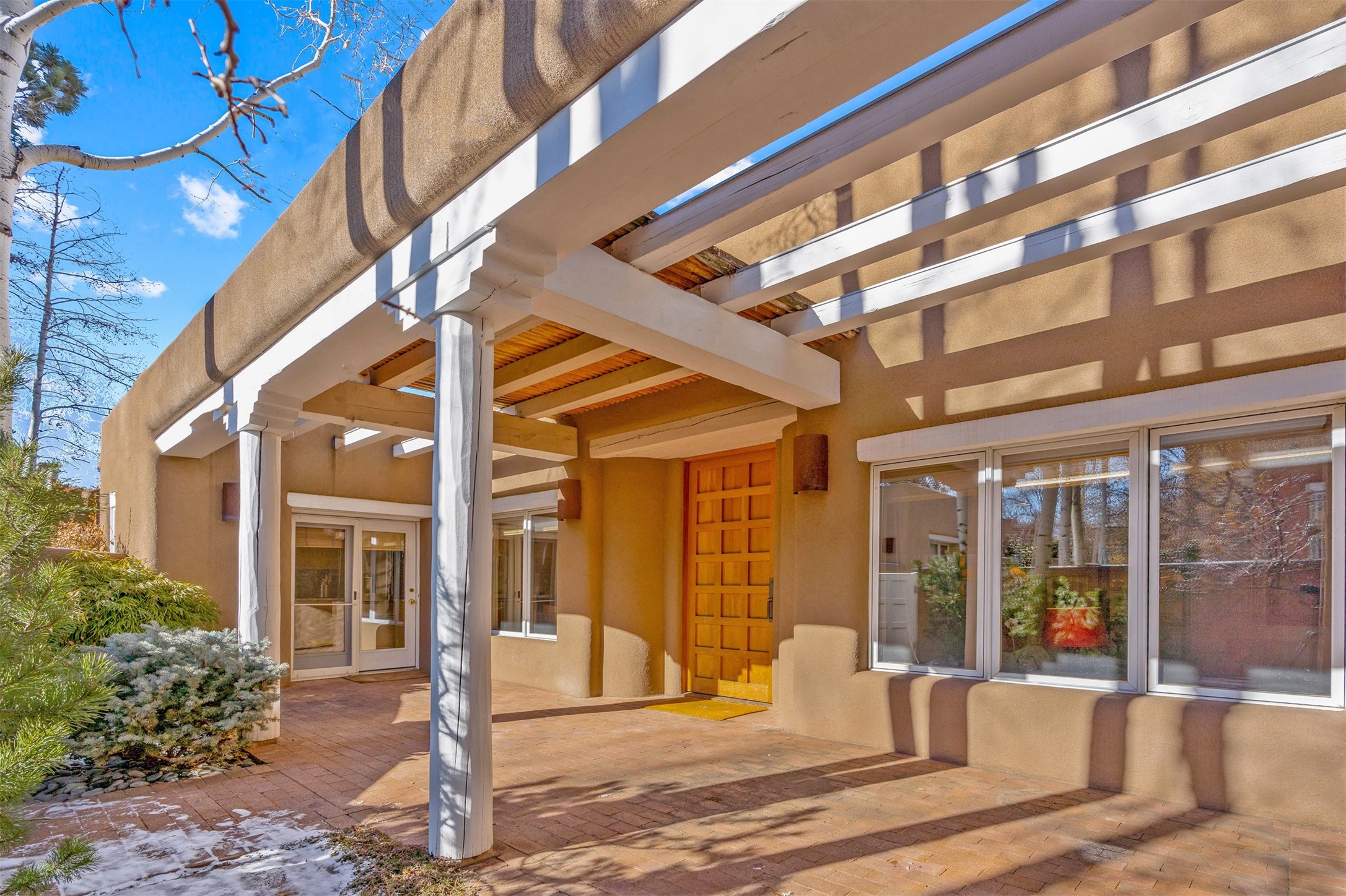 This refined house and guest house, on the market for the first time,is a hidden gem that's private, quiet, with a feeling of seclusion and set back on a charming street on the Eastside. The grounds unfold beyond the gate to a spacious,idyllic and entirely enclosed compound on .23 acres that is truly nestled among mature aspens and pines.The architectural harmony and green space create a feeling of tranquility, as if you're on retreat.The outdoor area, with garden beds and paved flagstone, brick patios and walkways, offer abundant opportunities for relaxation and entertaining.The great room has ceilings that soar to 14 ft. in height, a gracious primary bedroom has lovely views and spa-like ensuite bath.The home was refreshed to include wood and travertine flooring and a sunny kitchen with stunning granite counters.The pantry connects the kitchen to a rare feature:a two car attached garage.The loggias /extended portals frame lovely views and create a sense of movement and passage. Rich surfaces, fine details and classical references create a comfortable, polished and timeless take on Santa Fe style as designed by the award winning architect, Robert Zachry.Elegant details include fine metal and woodwork, skylights, symmetrical vigas, polished latillas, abundant storage, fireplaces and six French doors that make for breezy access to the lovely lawn and garden that connects the two homes.The guest house adds continuity of design and charm.What makes it truly special is the versatility of the spaces, with plenty of options as a home office and for guests. Inviting and soothing views connect you to the garden and the main house.A deep covered portal creates an al fresco room, with a generous patio and outdoor fireplace that's the perfect hub for garden parties and to enjoy quality time with family and friends.You are mere minutes from exciting Canyon Road and the Santa Fe Plaza and Kaunes grocery is just around the corner. Come and experience this place to call home.