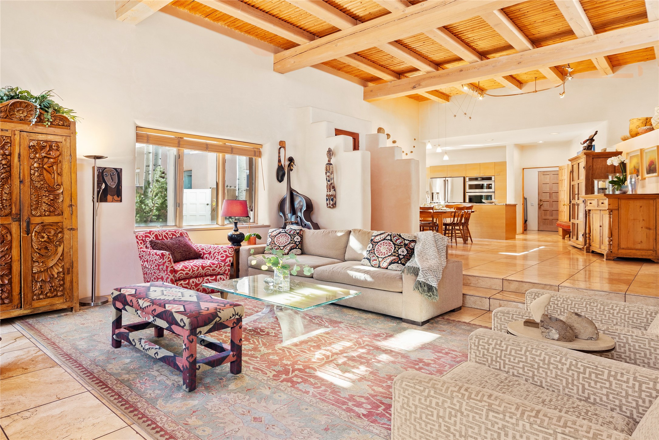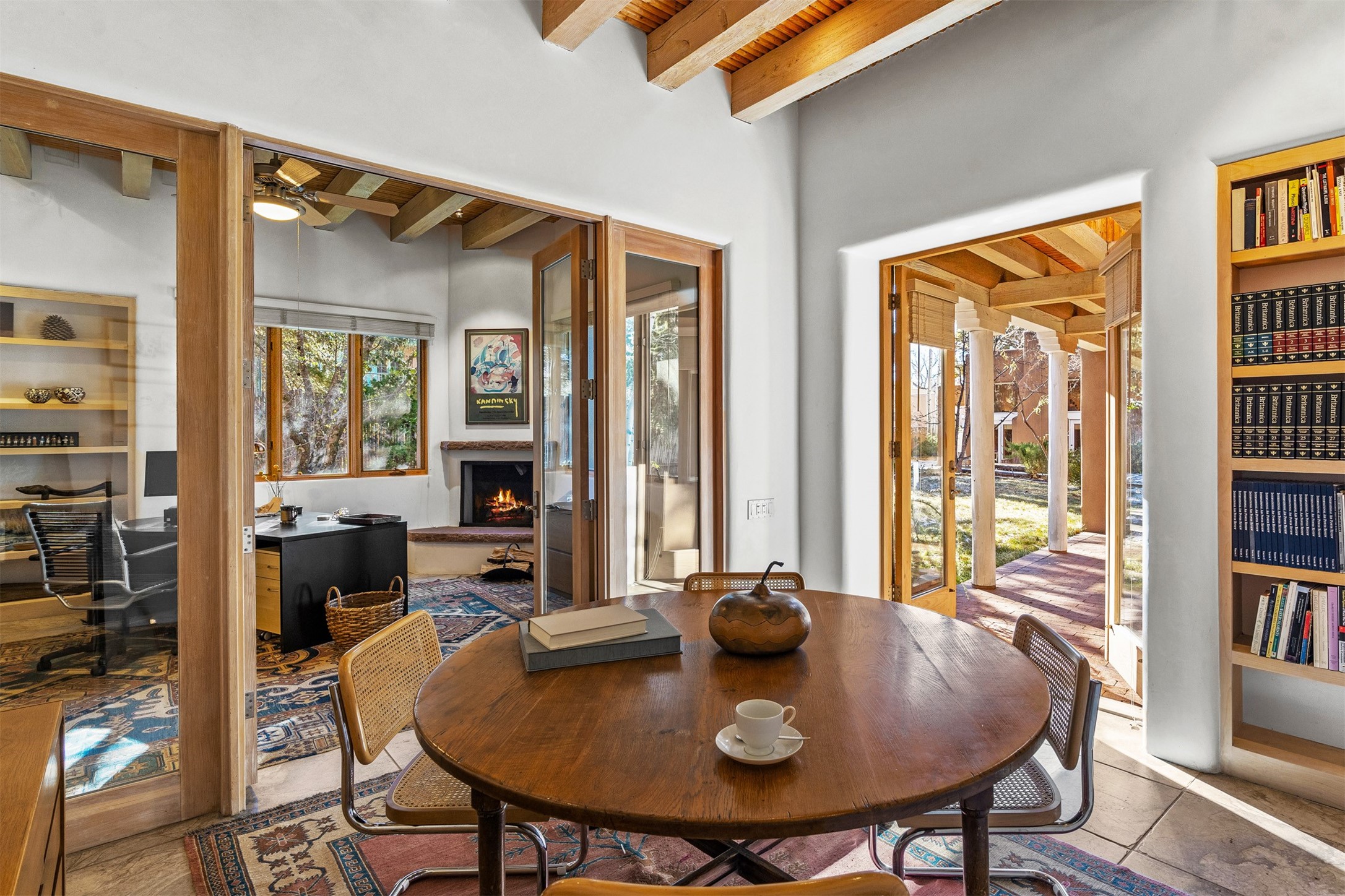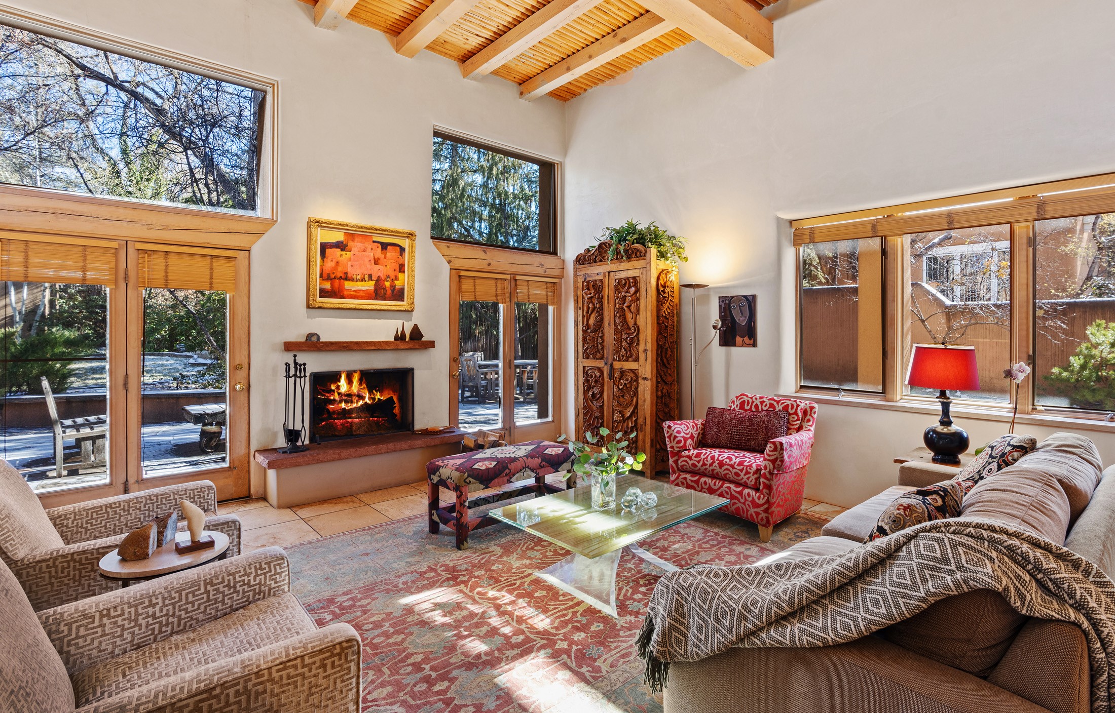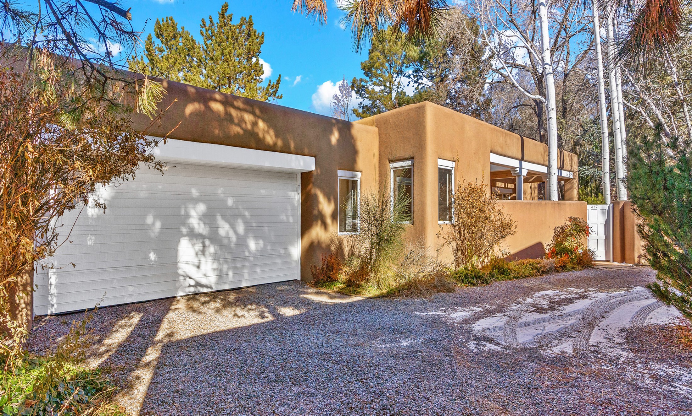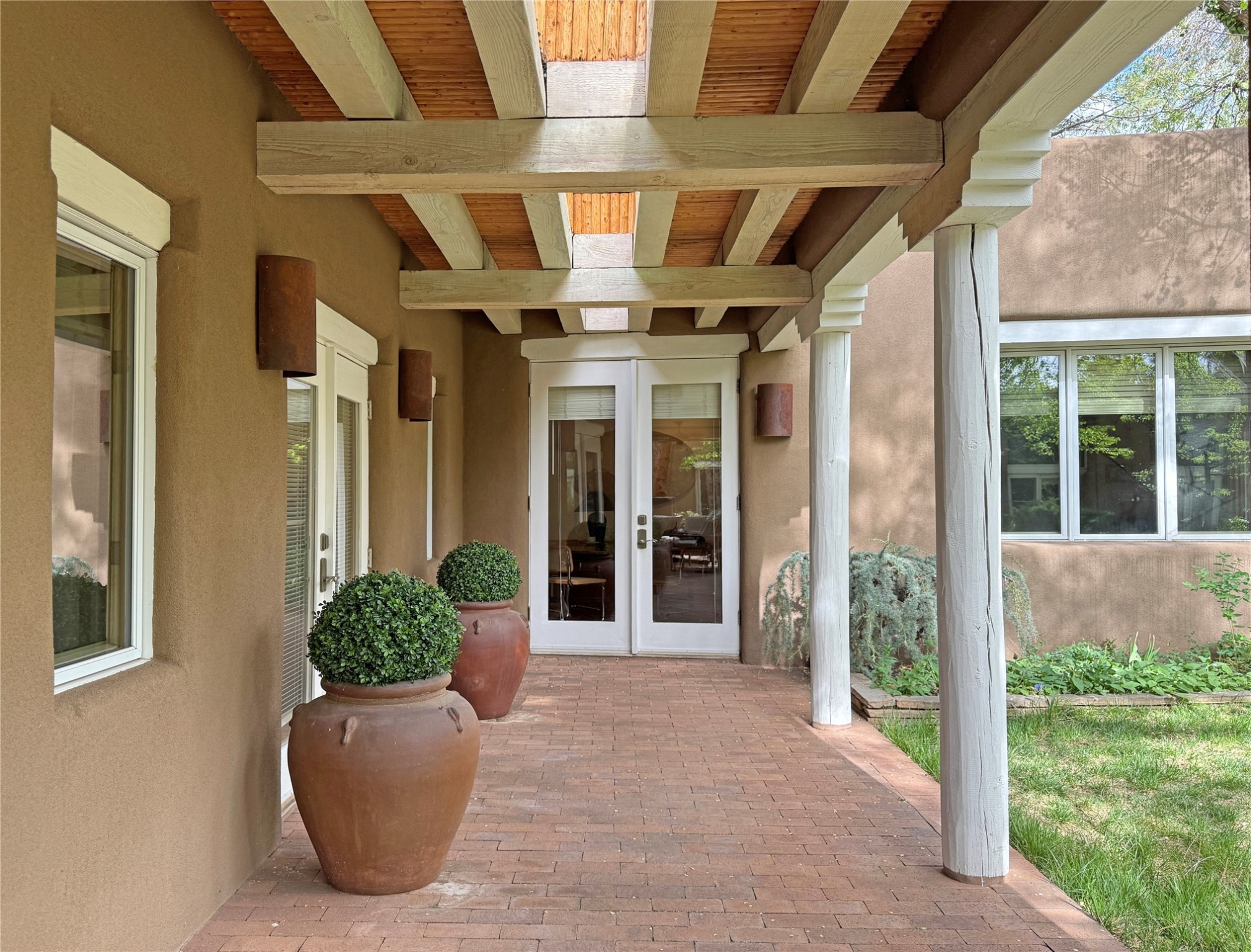 This refined house and guest house, on the market for the first time,is a hidden gem that's private, quiet, with a feeling of seclusion and set back on a charming street on the Eastside. The grounds unfold beyond the gate to a spacious,idyllic and entirely enclosed compound on .23 acres that is truly nestled among mature aspens and pines.The architectural harmony and green space create a feeling of tranquility, as if you're on retreat.The outdoor area, with garden beds and paved flagstone, brick patios and walkways, offer abundant opportunities for relaxation and entertaining.The great room has ceilings that soar to 14 ft. in height, a gracious primary bedroom has lovely views and spa-like ensuite bath.The home was refreshed to include wood and travertine flooring and a sunny kitchen with stunning granite counters.The pantry connects the kitchen to a rare feature:a two car attached garage.The loggias /extended portals frame lovely views and create a sense of movement and passage. Rich surfaces, fine details and classical references create a comfortable, polished and timeless take on Santa Fe style as designed by the award winning architect, Robert Zachry.Elegant details include fine metal and woodwork, skylights, symmetrical vigas, polished latillas, abundant storage, fireplaces and six French doors that make for breezy access to the lovely lawn and garden that connects the two homes.The guest house adds continuity of design and charm.What makes it truly special is the versatility of the spaces, with plenty of options as a home office and for guests. Inviting and soothing views connect you to the garden and the main house.A deep covered portal creates an al fresco room, with a generous patio and outdoor fireplace that's the perfect hub for garden parties and to enjoy quality time with family and friends.You are mere minutes from exciting Canyon Road and the Santa Fe Plaza and Kaunes grocery is just around the corner. Come and experience this place to call home.