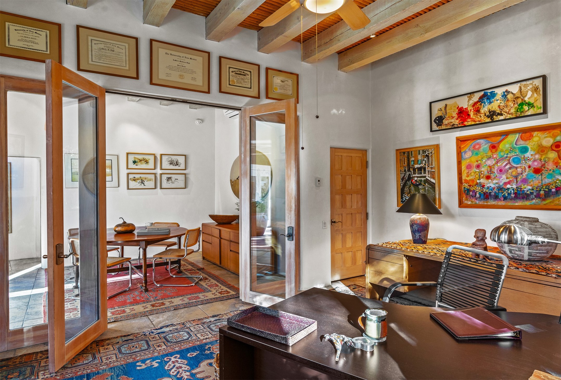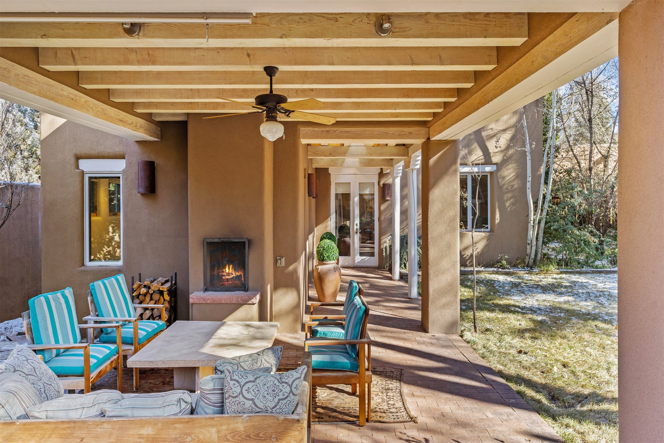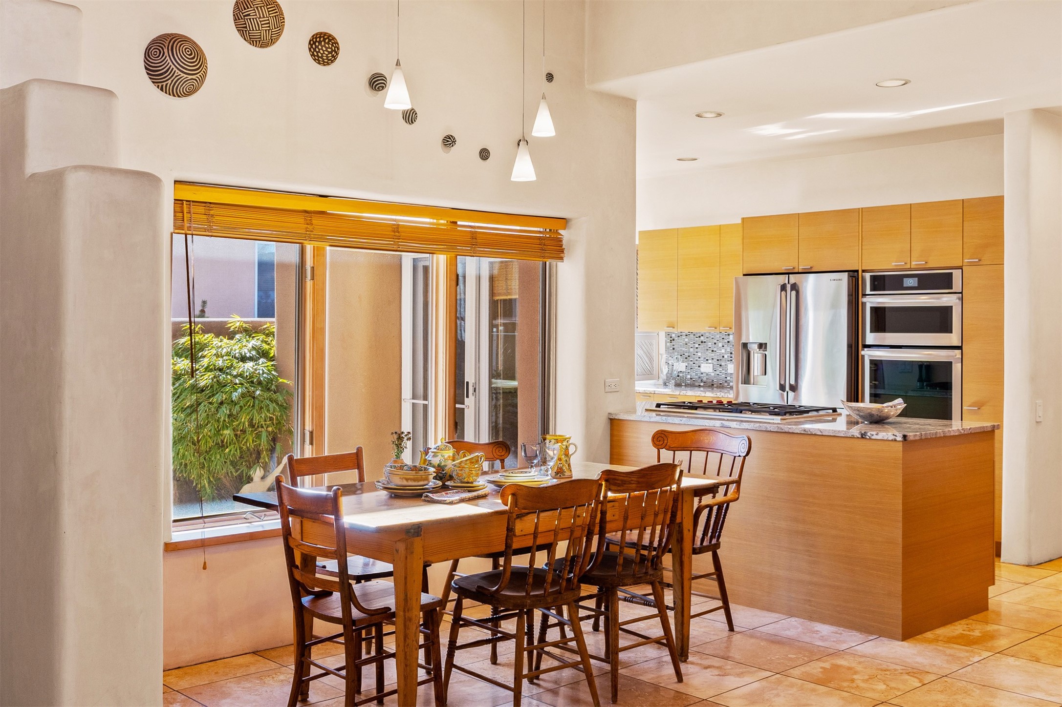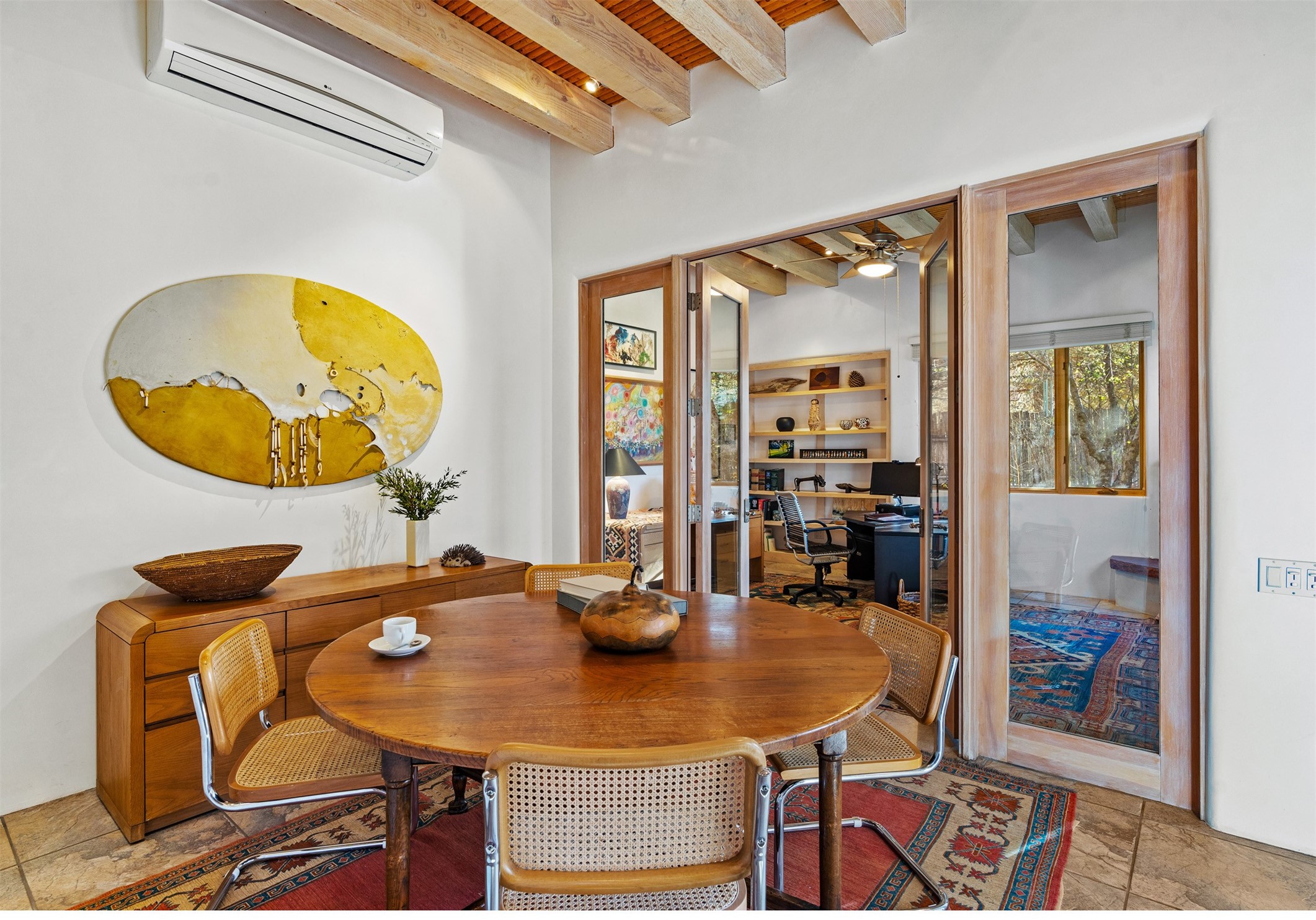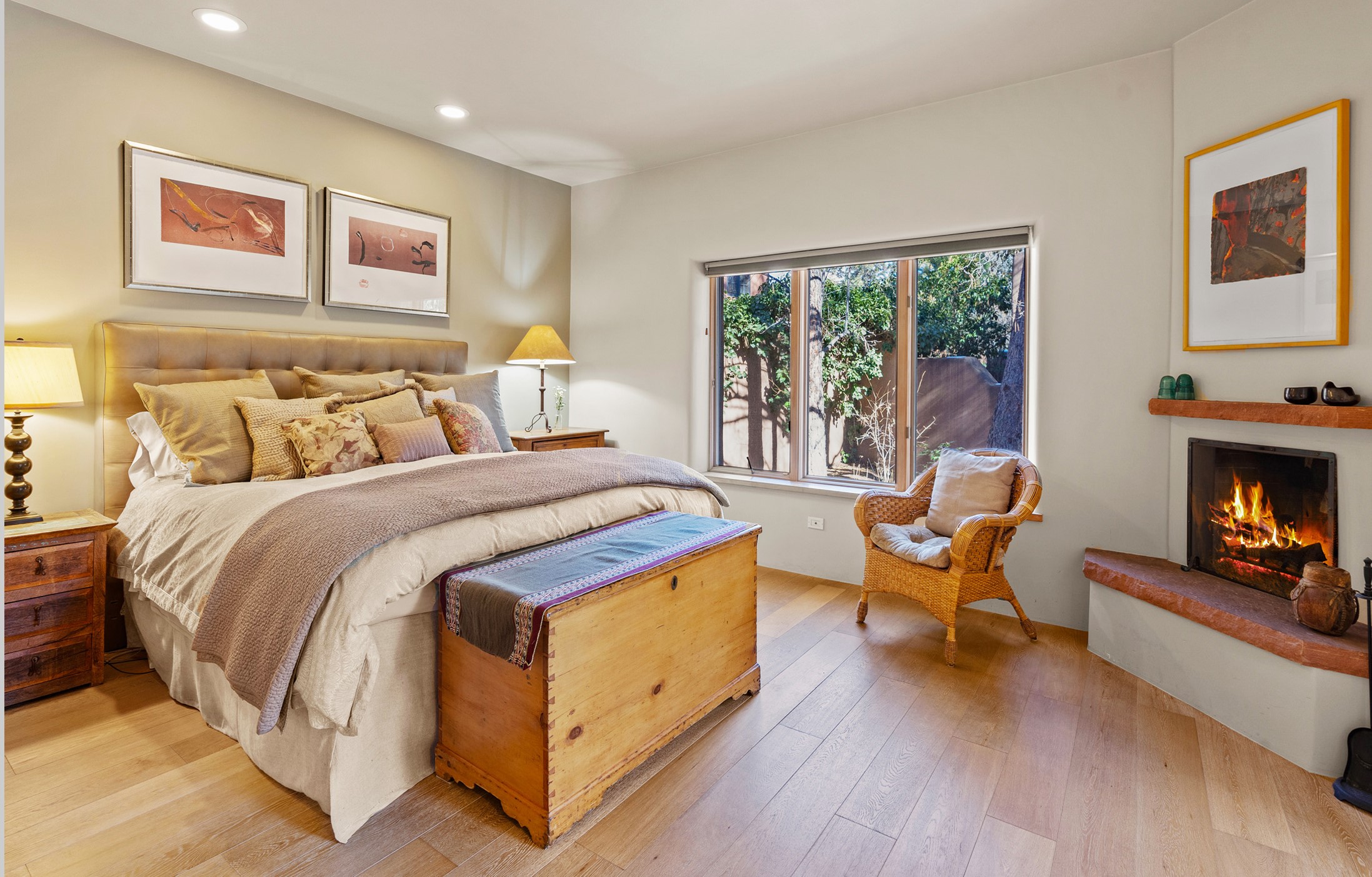 This refined house and guest house, on the market for the first time,is a hidden gem that's private, quiet, with a feeling of seclusion and set back on a charming street on the Eastside. The grounds unfold beyond the gate to a spacious,idyllic and entirely enclosed compound on .23 acres that is truly nestled among mature aspens and pines.The architectural harmony and green space create a feeling of tranquility, as if you're on retreat.The outdoor area, with garden beds and paved flagstone, brick patios and walkways, offer abundant opportunities for relaxation and entertaining.The great room has ceilings that soar to 14 ft. in height, a gracious primary bedroom has lovely views and spa-like ensuite bath.The home was refreshed to include wood and travertine flooring and a sunny kitchen with stunning granite counters.The pantry connects the kitchen to a rare feature:a two car attached garage.The loggias /extended portals frame lovely views and create a sense of movement and passage. Rich surfaces, fine details and classical references create a comfortable, polished and timeless take on Santa Fe style as designed by the award winning architect, Robert Zachry.Elegant details include fine metal and woodwork, skylights, symmetrical vigas, polished latillas, abundant storage, fireplaces and six French doors that make for breezy access to the lovely lawn and garden that connects the two homes.The guest house adds continuity of design and charm.What makes it truly special is the versatility of the spaces, with plenty of options as a home office and for guests. Inviting and soothing views connect you to the garden and the main house.A deep covered portal creates an al fresco room, with a generous patio and outdoor fireplace that's the perfect hub for garden parties and to enjoy quality time with family and friends.You are mere minutes from exciting Canyon Road and the Santa Fe Plaza and Kaunes grocery is just around the corner. Come and experience this place to call home.