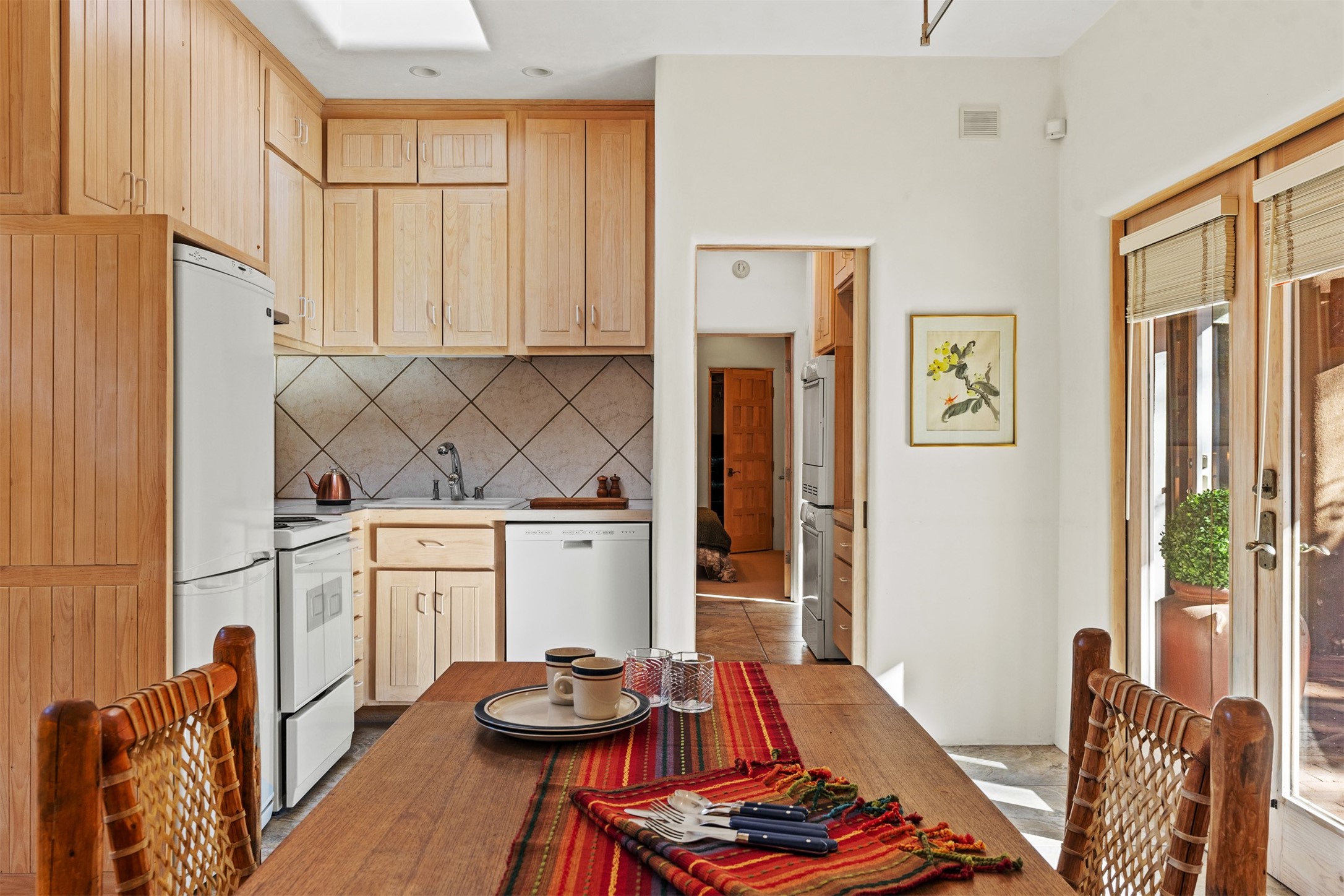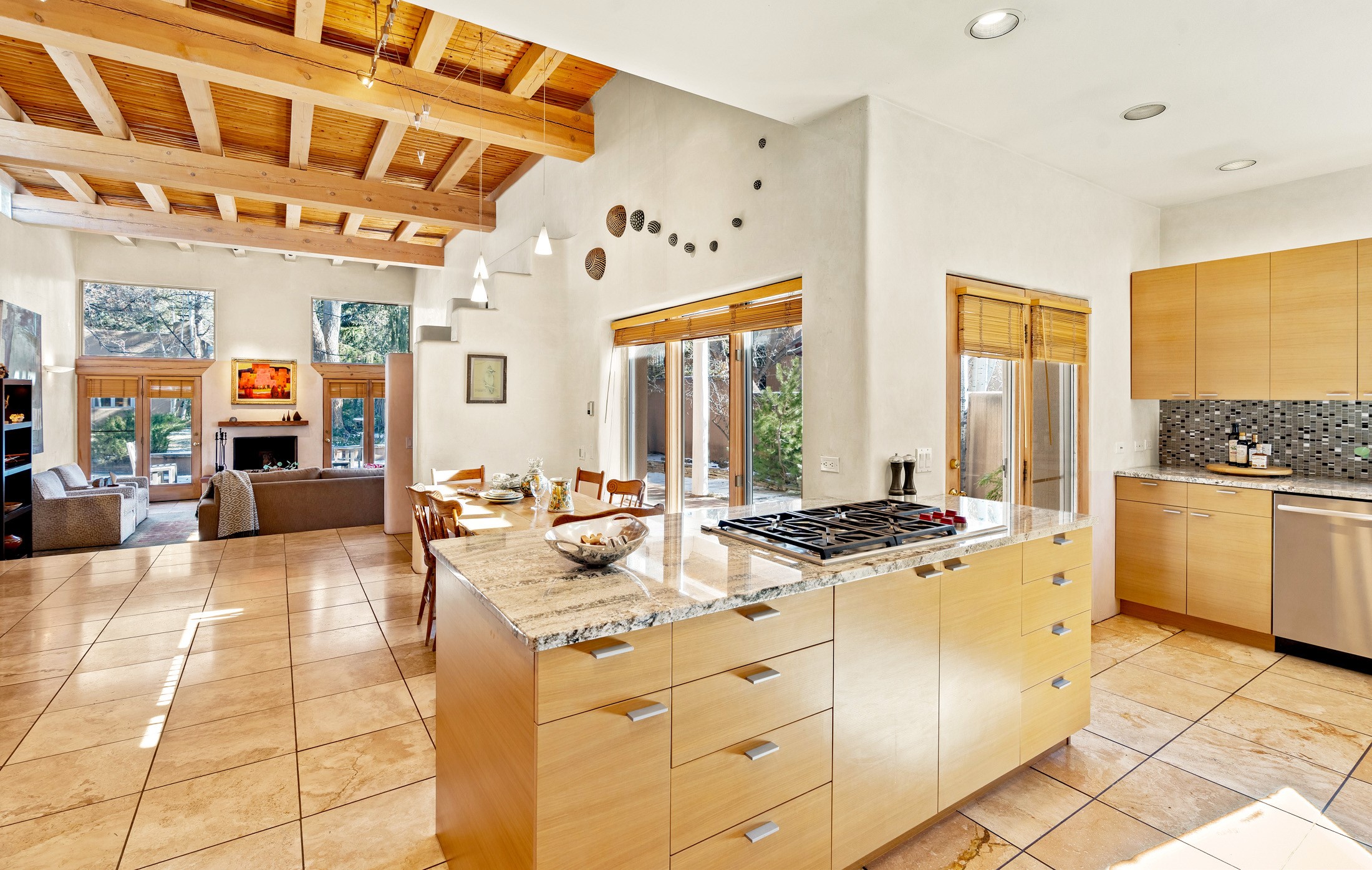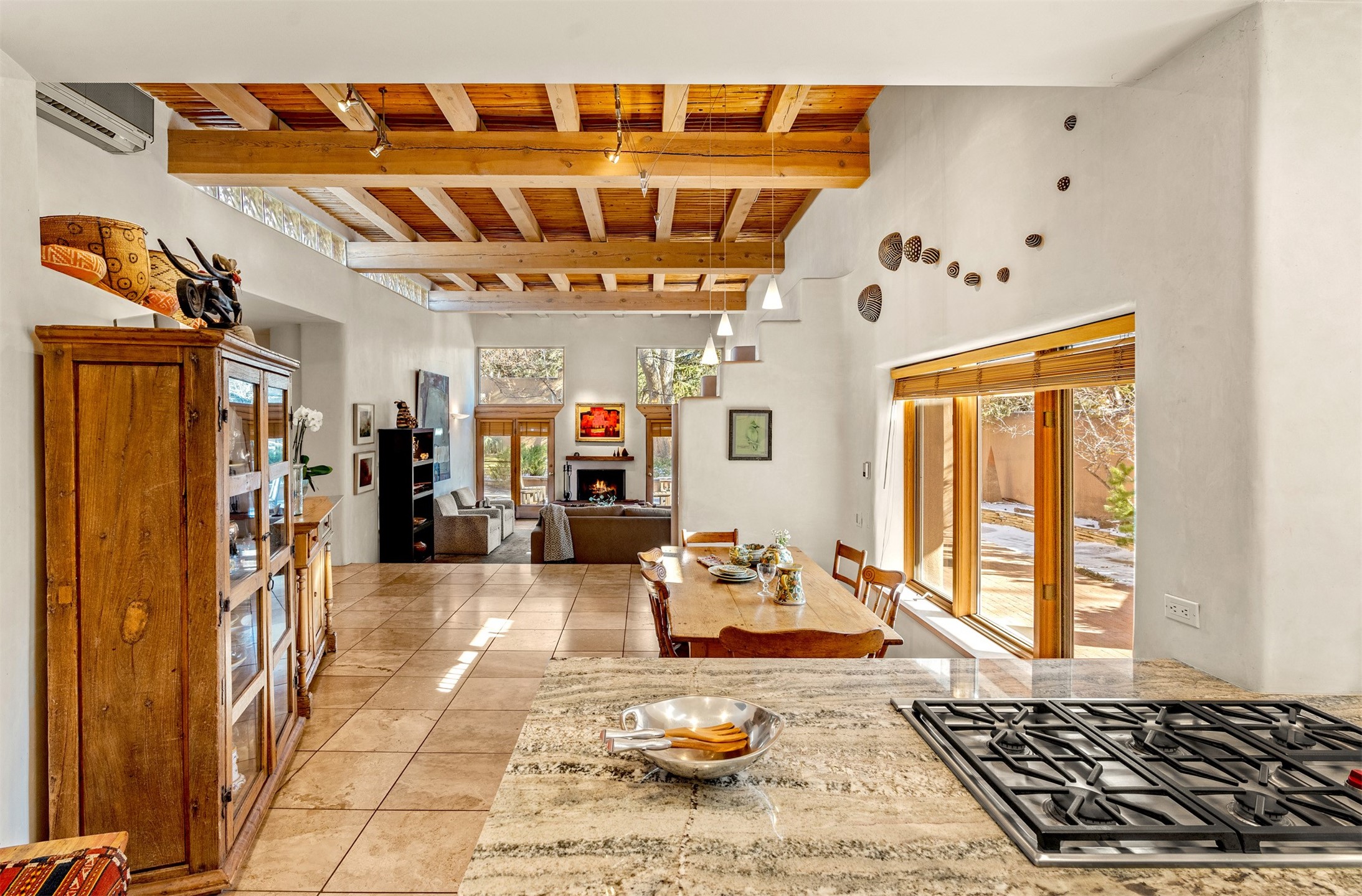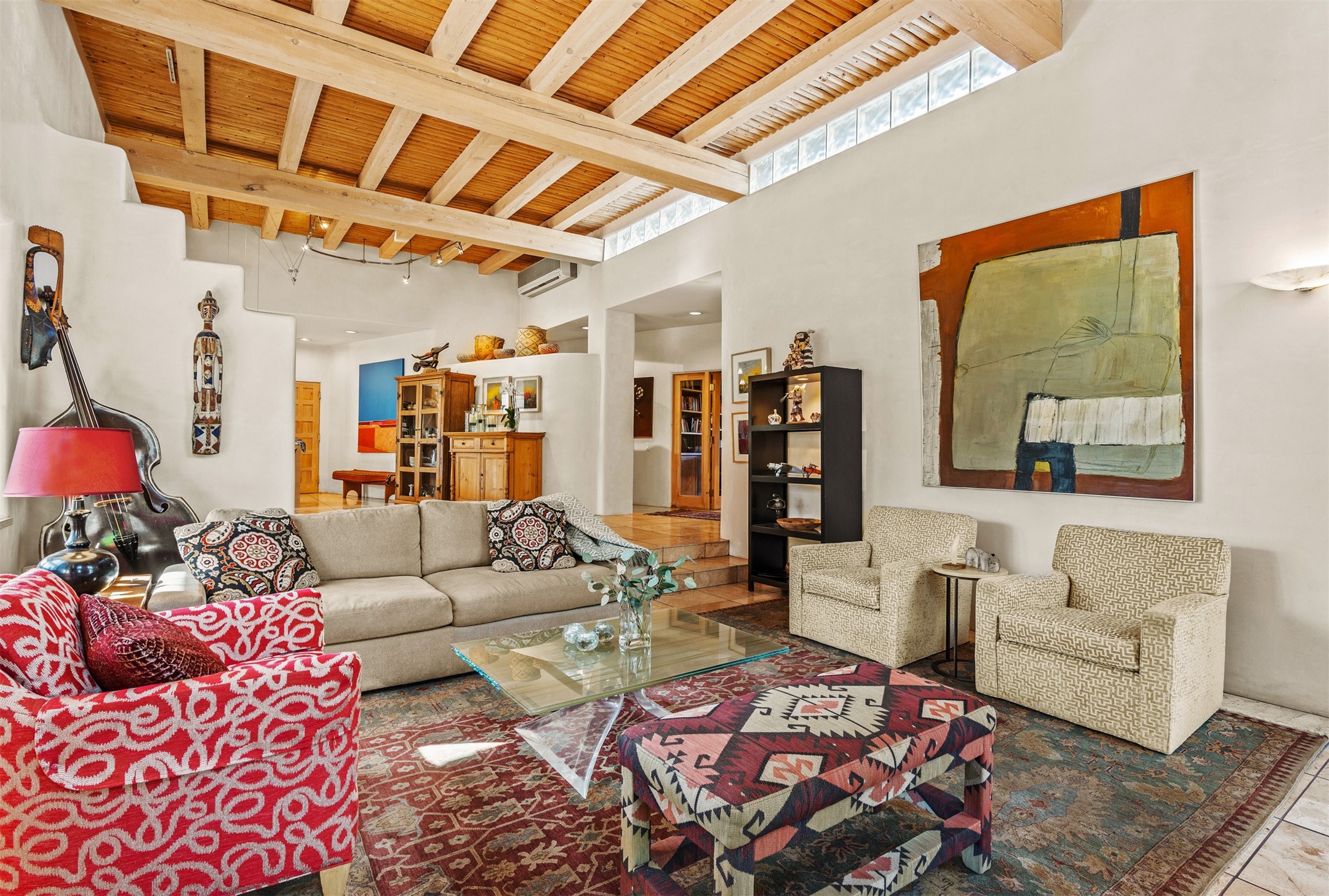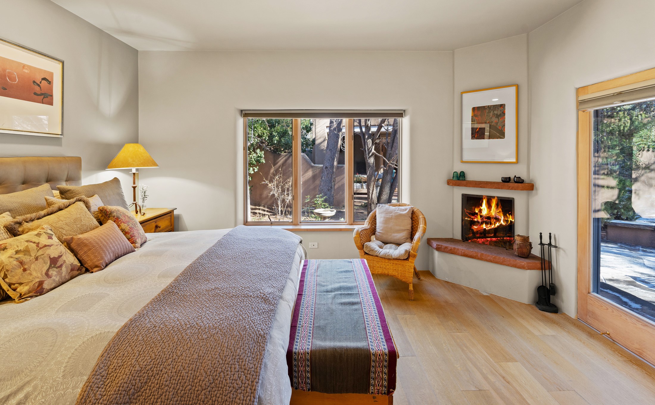 This refined house and guest house, on the market for the first time,is a hidden gem that's private, quiet, with a feeling of seclusion and set back on a charming street on the Eastside. The grounds unfold beyond the gate to a spacious,idyllic and entirely enclosed compound on .23 acres that is truly nestled among mature aspens and pines.The architectural harmony and green space create a feeling of tranquility, as if you're on retreat.The outdoor area, with garden beds and paved flagstone, brick patios and walkways, offer abundant opportunities for relaxation and entertaining.The great room has ceilings that soar to 14 ft. in height, a gracious primary bedroom has lovely views and spa-like ensuite bath.The home was refreshed to include wood and travertine flooring and a sunny kitchen with stunning granite counters.The pantry connects the kitchen to a rare feature:a two car attached garage.The loggias /extended portals frame lovely views and create a sense of movement and passage. Rich surfaces, fine details and classical references create a comfortable, polished and timeless take on Santa Fe style as designed by the award winning architect, Robert Zachry.Elegant details include fine metal and woodwork, skylights, symmetrical vigas, polished latillas, abundant storage, fireplaces and six French doors that make for breezy access to the lovely lawn and garden that connects the two homes.The guest house adds continuity of design and charm.What makes it truly special is the versatility of the spaces, with plenty of options as a home office and for guests. Inviting and soothing views connect you to the garden and the main house.A deep covered portal creates an al fresco room, with a generous patio and outdoor fireplace that's the perfect hub for garden parties and to enjoy quality time with family and friends.You are mere minutes from exciting Canyon Road and the Santa Fe Plaza and Kaunes grocery is just around the corner. Come and experience this place to call home.