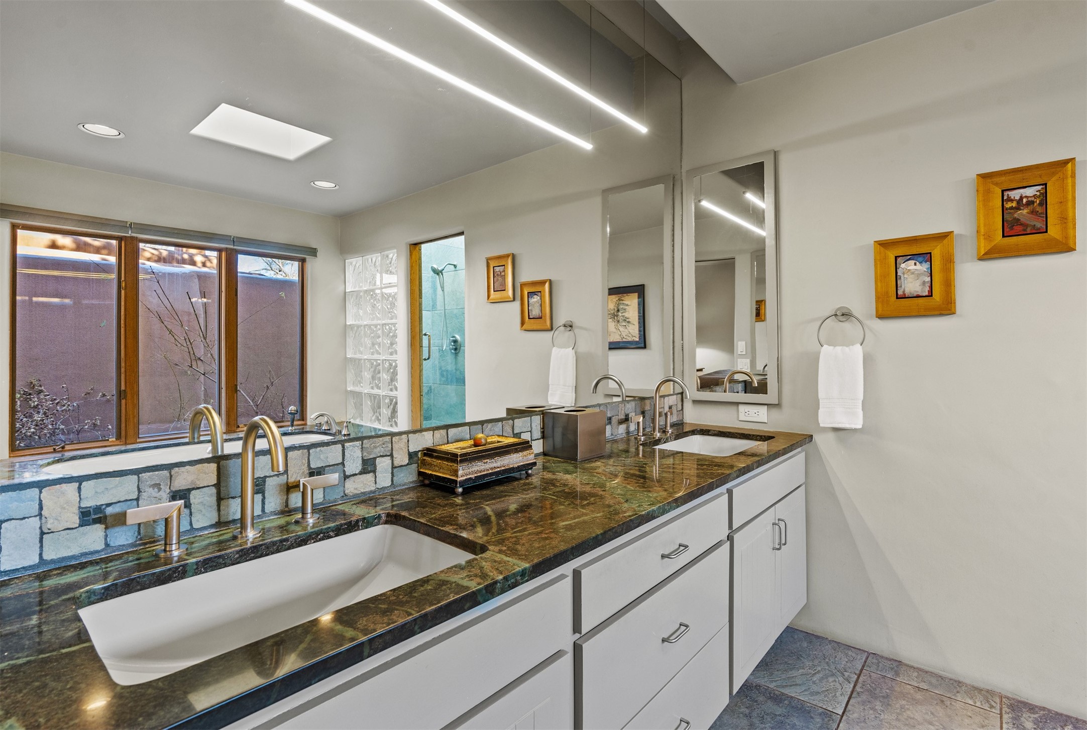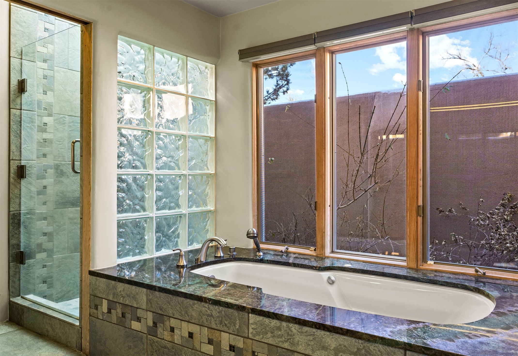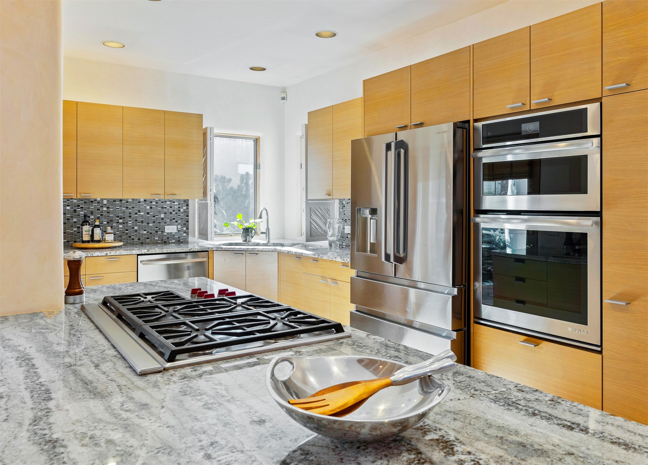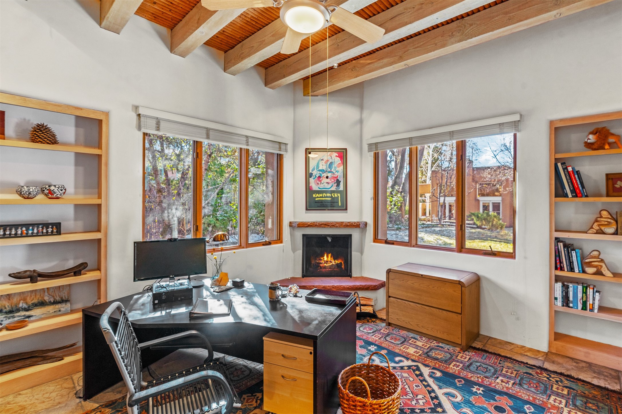 This refined house and guest house, on the market for the first time,is a hidden gem that's private, quiet, with a feeling of seclusion and set back on a charming street on the Eastside. The grounds unfold beyond the gate to a spacious,idyllic and entirely enclosed compound on .23 acres that is truly nestled among mature aspens and pines.The architectural harmony and green space create a feeling of tranquility, as if you're on retreat.The outdoor area, with garden beds and paved flagstone, brick patios and walkways, offer abundant opportunities for relaxation and entertaining.The great room has ceilings that soar to 14 ft. in height, a gracious primary bedroom has lovely views and spa-like ensuite bath.The home was refreshed to include wood and travertine flooring and a sunny kitchen with stunning granite counters.The pantry connects the kitchen to a rare feature:a two car attached garage.The loggias /extended portals frame lovely views and create a sense of movement and passage. Rich surfaces, fine details and classical references create a comfortable, polished and timeless take on Santa Fe style as designed by the award winning architect, Robert Zachry.Elegant details include fine metal and woodwork, skylights, symmetrical vigas, polished latillas, abundant storage, fireplaces and six French doors that make for breezy access to the lovely lawn and garden that connects the two homes.The guest house adds continuity of design and charm.What makes it truly special is the versatility of the spaces, with plenty of options as a home office and for guests. Inviting and soothing views connect you to the garden and the main house.A deep covered portal creates an al fresco room, with a generous patio and outdoor fireplace that's the perfect hub for garden parties and to enjoy quality time with family and friends.You are mere minutes from exciting Canyon Road and the Santa Fe Plaza and Kaunes grocery is just around the corner. Come and experience this place to call home.