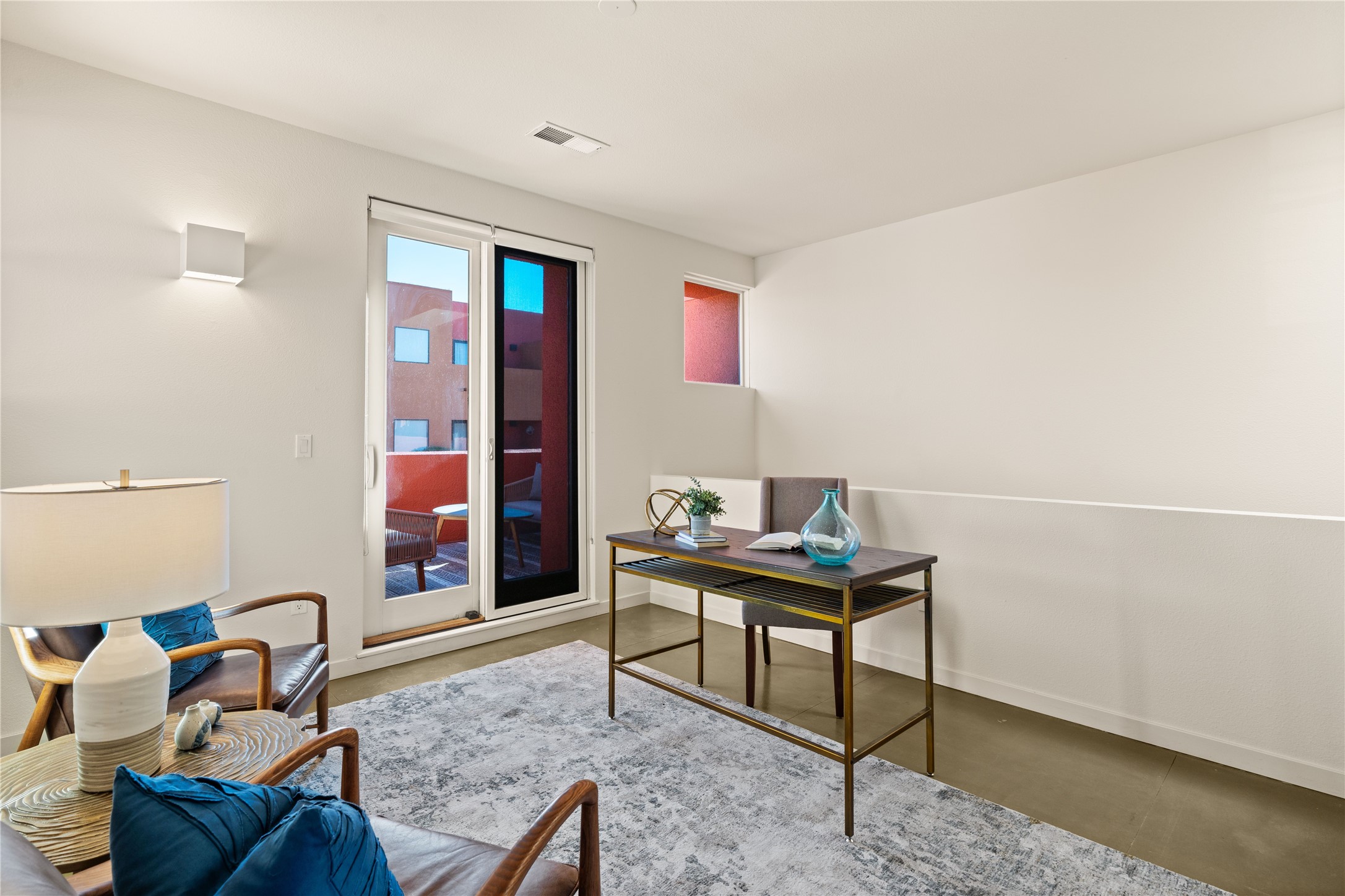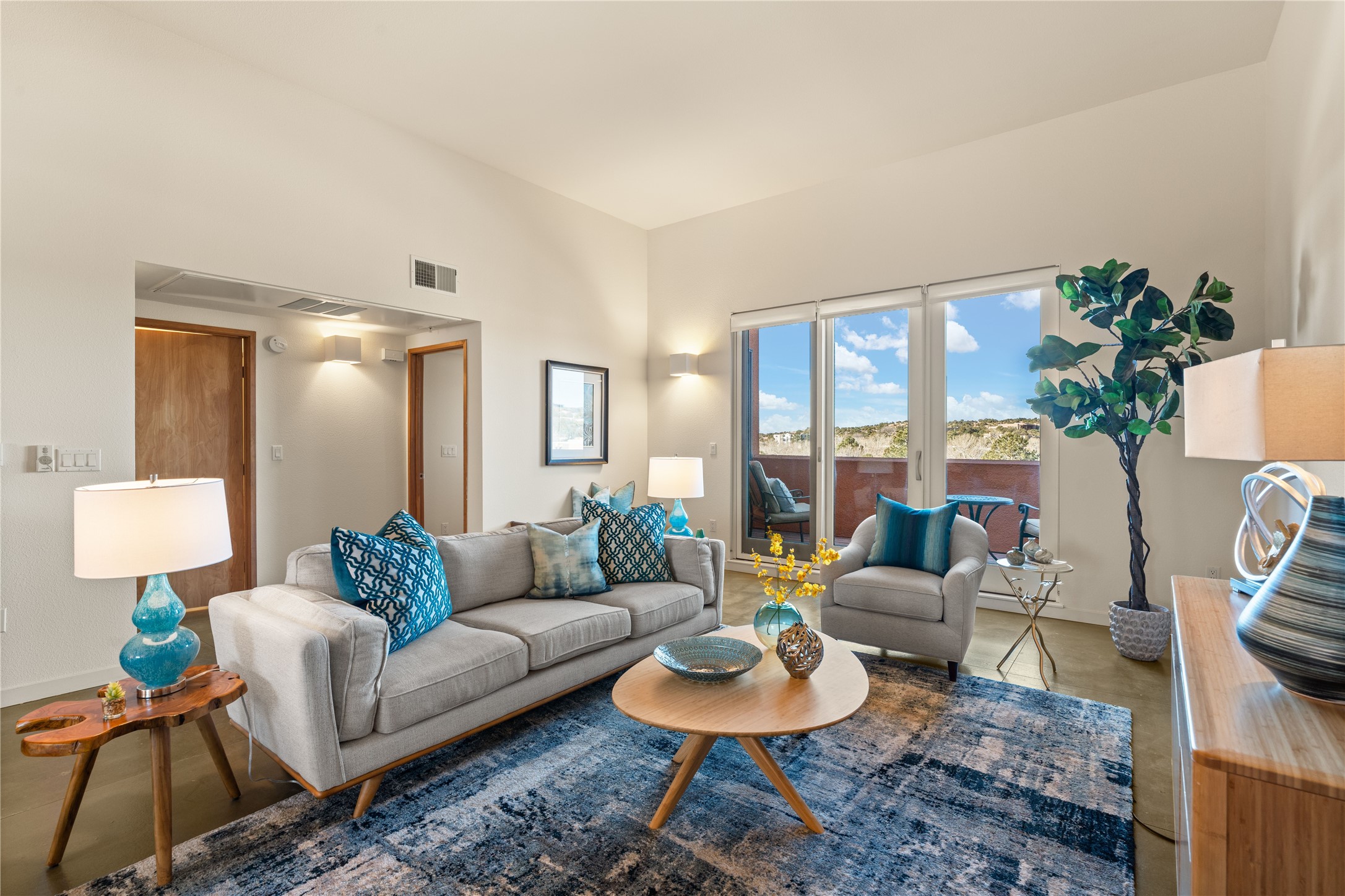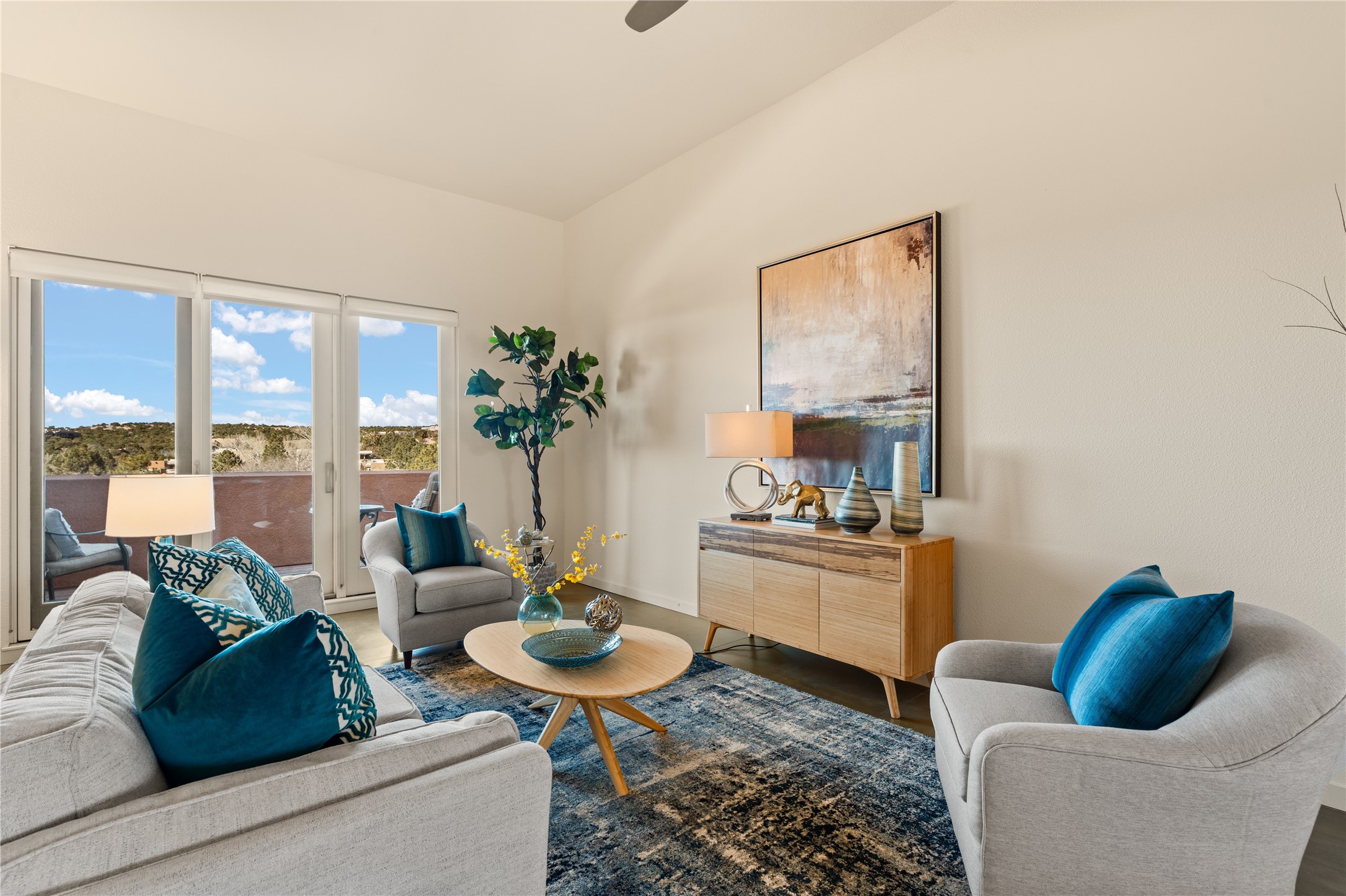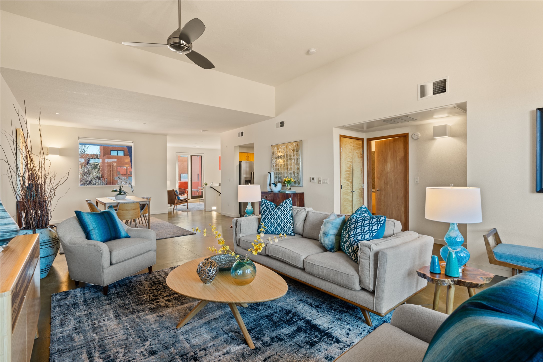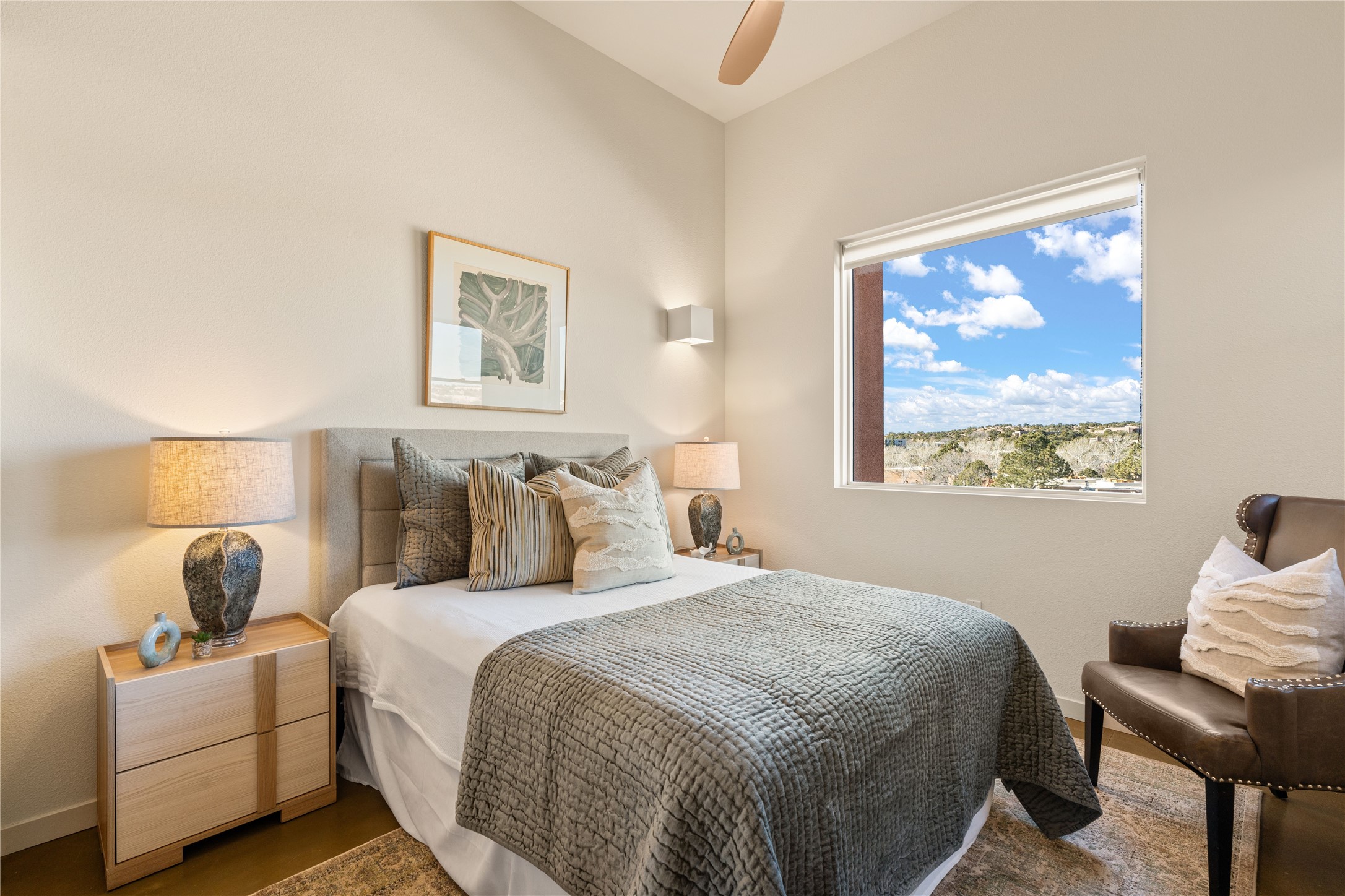 This contemporary, lock-and-leave condominium is one of the most sought after upper-level one-bedroom floorplans (The Cielo) in Zocalo, with a study/loft (convertible to a second bedroom), double vanity bath, direct access garage, and a view over the arroyo and to the Jemez and Sandias. Designed by world-renowned Mexican architect Ricardo Legoretta, it features handsome concrete floors and 11-foot ceilings in the spacious living area, which opens onto a west-facing deck. The kitchen includes a stainless gas range/oven, microwave, dishwasher and double-door refrigerator.The master bedroom has a large closet with bypass doors. The double-vanity bath fetaures a tub/shower combination and compartmented water closet. The 12 x 12 foot study/loft area opens onto a second east-facing balcony and was designed to be converted to a second bedroom (one photo is virtually staged and portrays this). The home is light, bright, and airy, thanks to skylights located in the kitchen, bath and den. Generously sized Pella windows bring the outdoors in. Ample storage includes a generous entry closet and a walk-in pantry. The single-car garage offers more storage; a second parking spot is in the driveway. Zocalo community amenities include an outdoor lap pool, hot tub, two workout centers, and a spectacular clubhouse for private parties. A network of trails runs throughout. Ten minutes away is convenient shopping at DeVargas Mall with Albertsons, Sprouts, the post office and more. As an incentive to a buyer, the seller will cover HOA dues through December 2025.