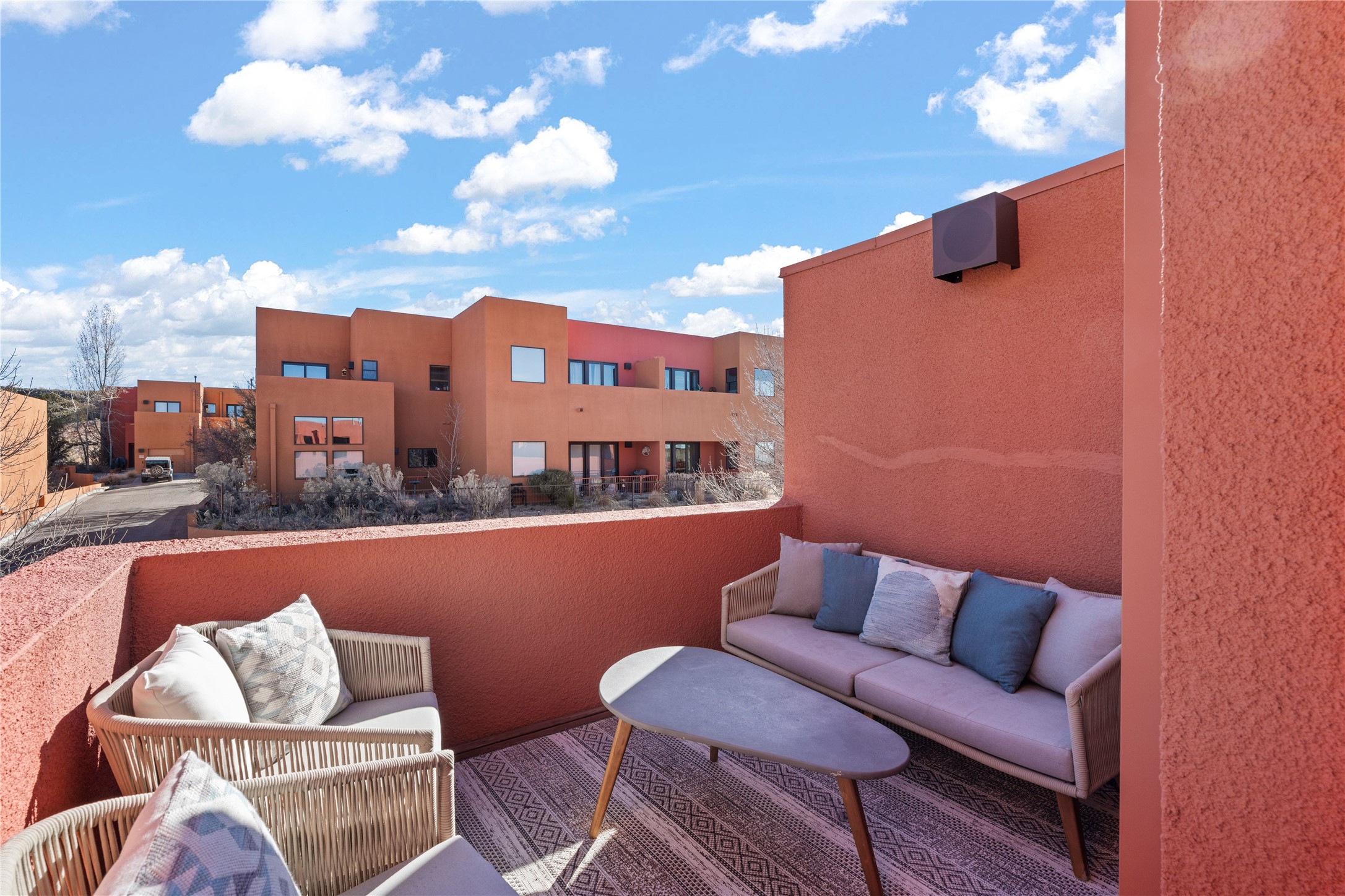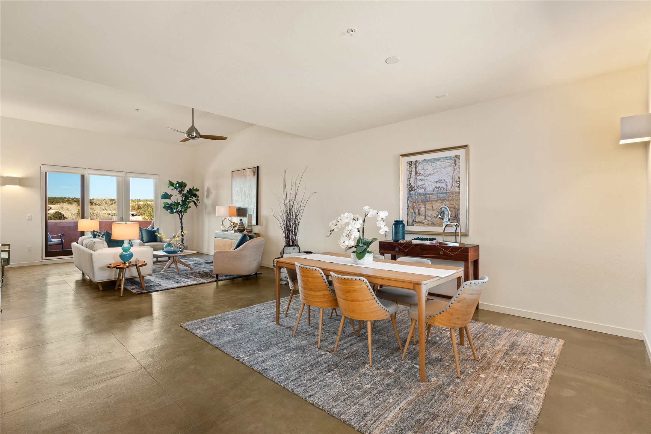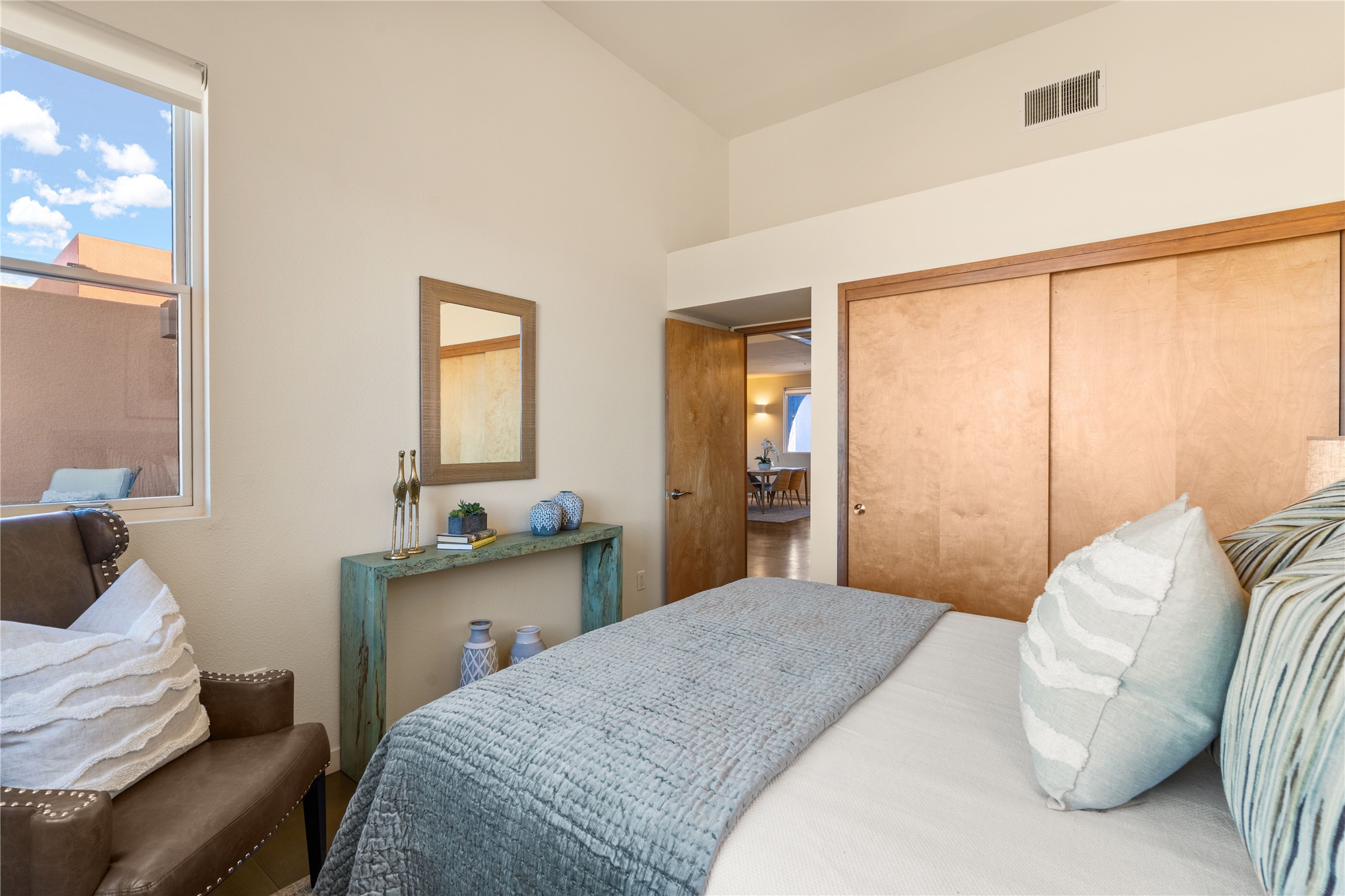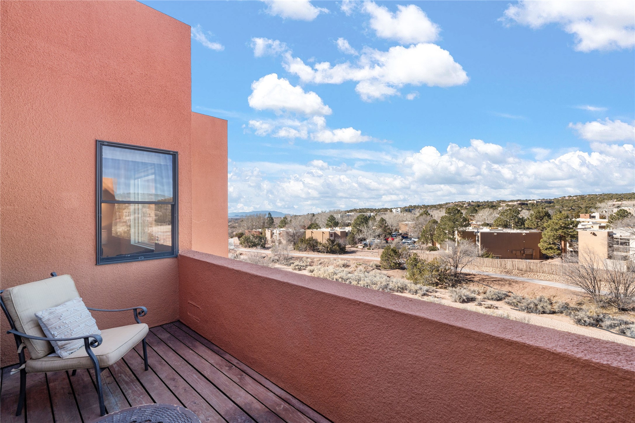 This contemporary, lock-and-leave condominium is one of the most sought after upper-level one-bedroom floorplans (The Cielo) in Zocalo, with a study/loft (convertible to a second bedroom), double vanity bath, direct access garage, and a view over the arroyo and to the Jemez and Sandias. Designed by world-renowned Mexican architect Ricardo Legoretta, it features handsome concrete floors and 11-foot ceilings in the spacious living area, which opens onto a west-facing deck. The kitchen includes a stainless gas range/oven, microwave, dishwasher and double-door refrigerator.The master bedroom has a large closet with bypass doors. The double-vanity bath fetaures a tub/shower combination and compartmented water closet. The 12 x 12 foot study/loft area opens onto a second east-facing balcony and was designed to be converted to a second bedroom (one photo is virtually staged and portrays this). The home is light, bright, and airy, thanks to skylights located in the kitchen, bath and den. Generously sized Pella windows bring the outdoors in. Ample storage includes a generous entry closet and a walk-in pantry. The single-car garage offers more storage; a second parking spot is in the driveway. Zocalo community amenities include an outdoor lap pool, hot tub, two workout centers, and a spectacular clubhouse for private parties. A network of trails runs throughout. Ten minutes away is convenient shopping at DeVargas Mall with Albertsons, Sprouts, the post office and more. As an incentive to a buyer, the seller will cover HOA dues through December 2025.