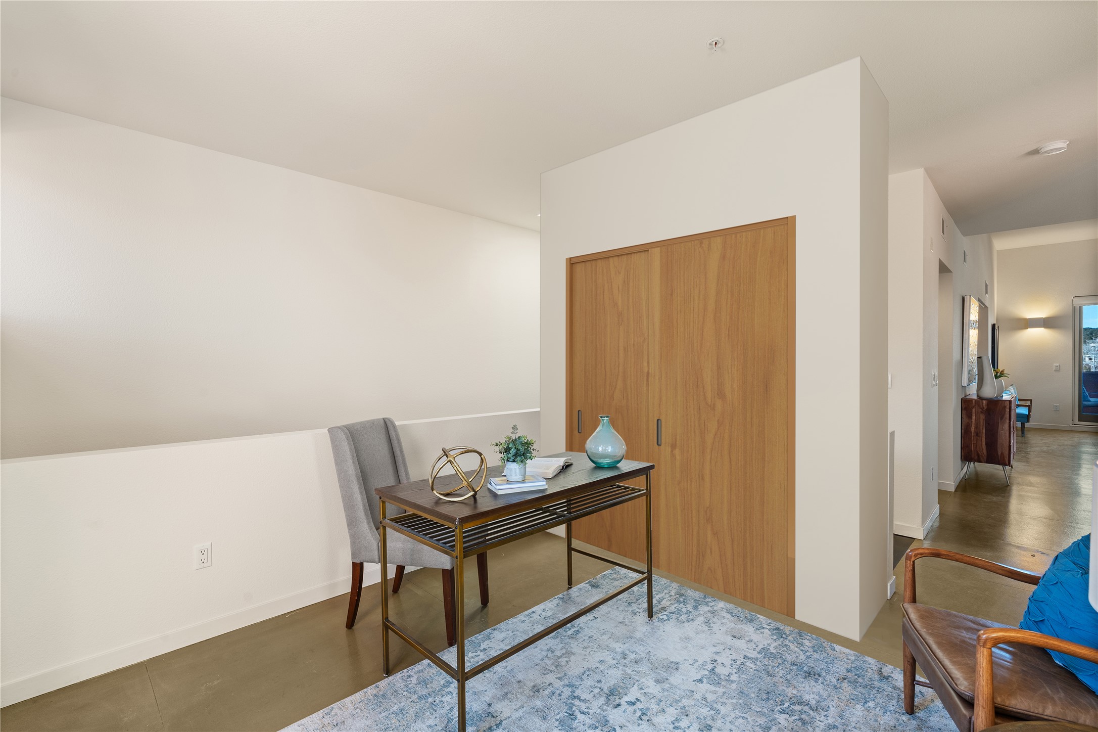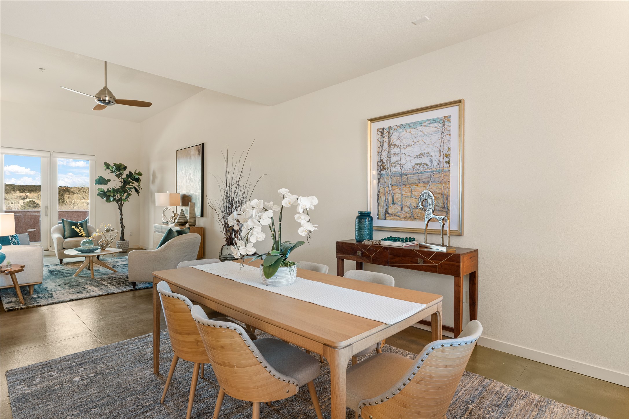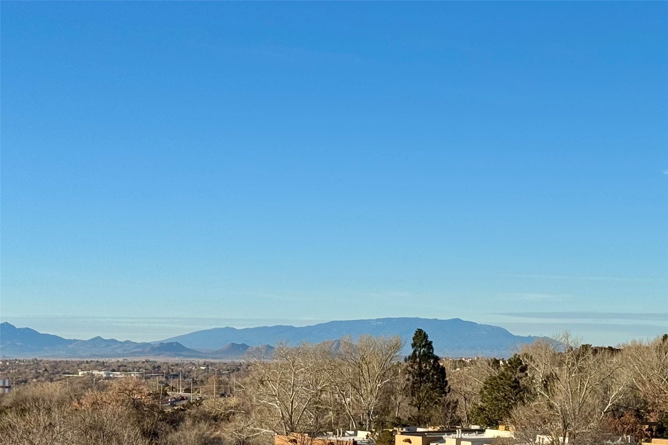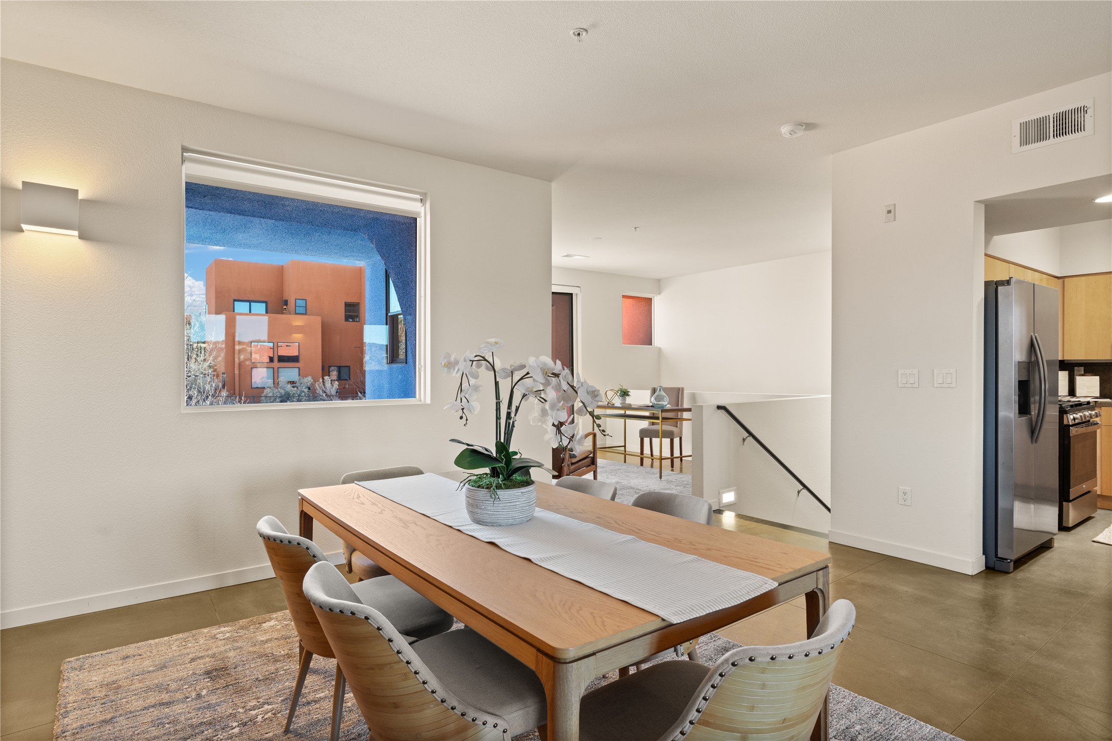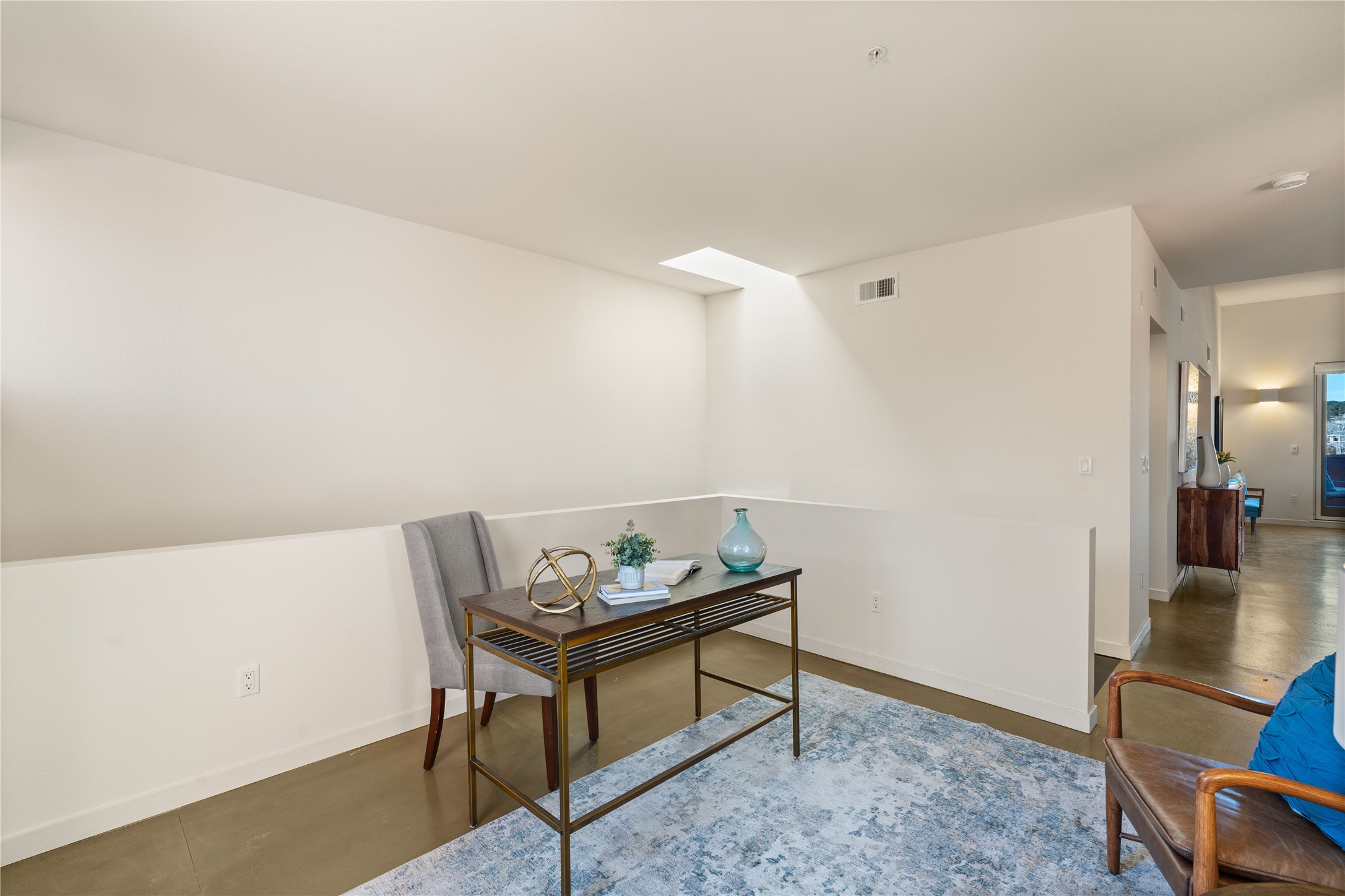 This contemporary, lock-and-leave condominium is one of the most sought after upper-level one-bedroom floorplans (The Cielo) in Zocalo, with a study/loft (convertible to a second bedroom), double vanity bath, direct access garage, and a view over the arroyo and to the Jemez and Sandias. Designed by world-renowned Mexican architect Ricardo Legoretta, it features handsome concrete floors and 11-foot ceilings in the spacious living area, which opens onto a west-facing deck. The kitchen includes a stainless gas range/oven, microwave, dishwasher and double-door refrigerator.The master bedroom has a large closet with bypass doors. The double-vanity bath fetaures a tub/shower combination and compartmented water closet. The 12 x 12 foot study/loft area opens onto a second east-facing balcony and was designed to be converted to a second bedroom (one photo is virtually staged and portrays this). The home is light, bright, and airy, thanks to skylights located in the kitchen, bath and den. Generously sized Pella windows bring the outdoors in. Ample storage includes a generous entry closet and a walk-in pantry. The single-car garage offers more storage; a second parking spot is in the driveway. Zocalo community amenities include an outdoor lap pool, hot tub, two workout centers, and a spectacular clubhouse for private parties. A network of trails runs throughout. Ten minutes away is convenient shopping at DeVargas Mall with Albertsons, Sprouts, the post office and more. As an incentive to a buyer, the seller will cover HOA dues through December 2025.
