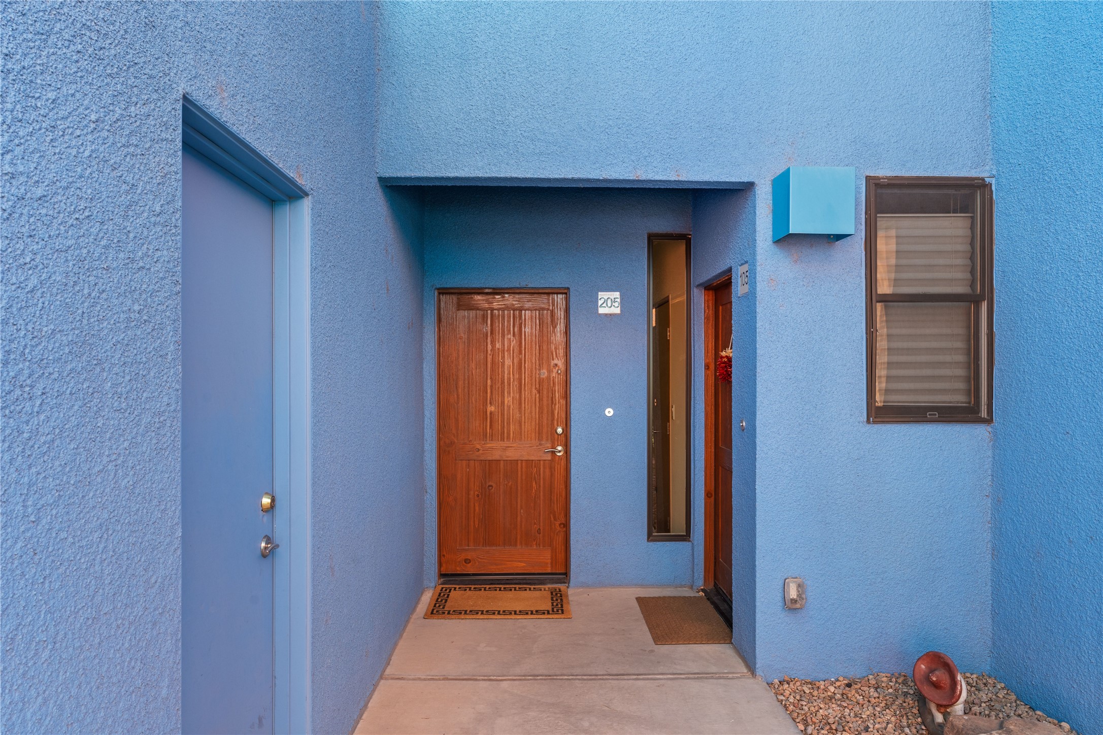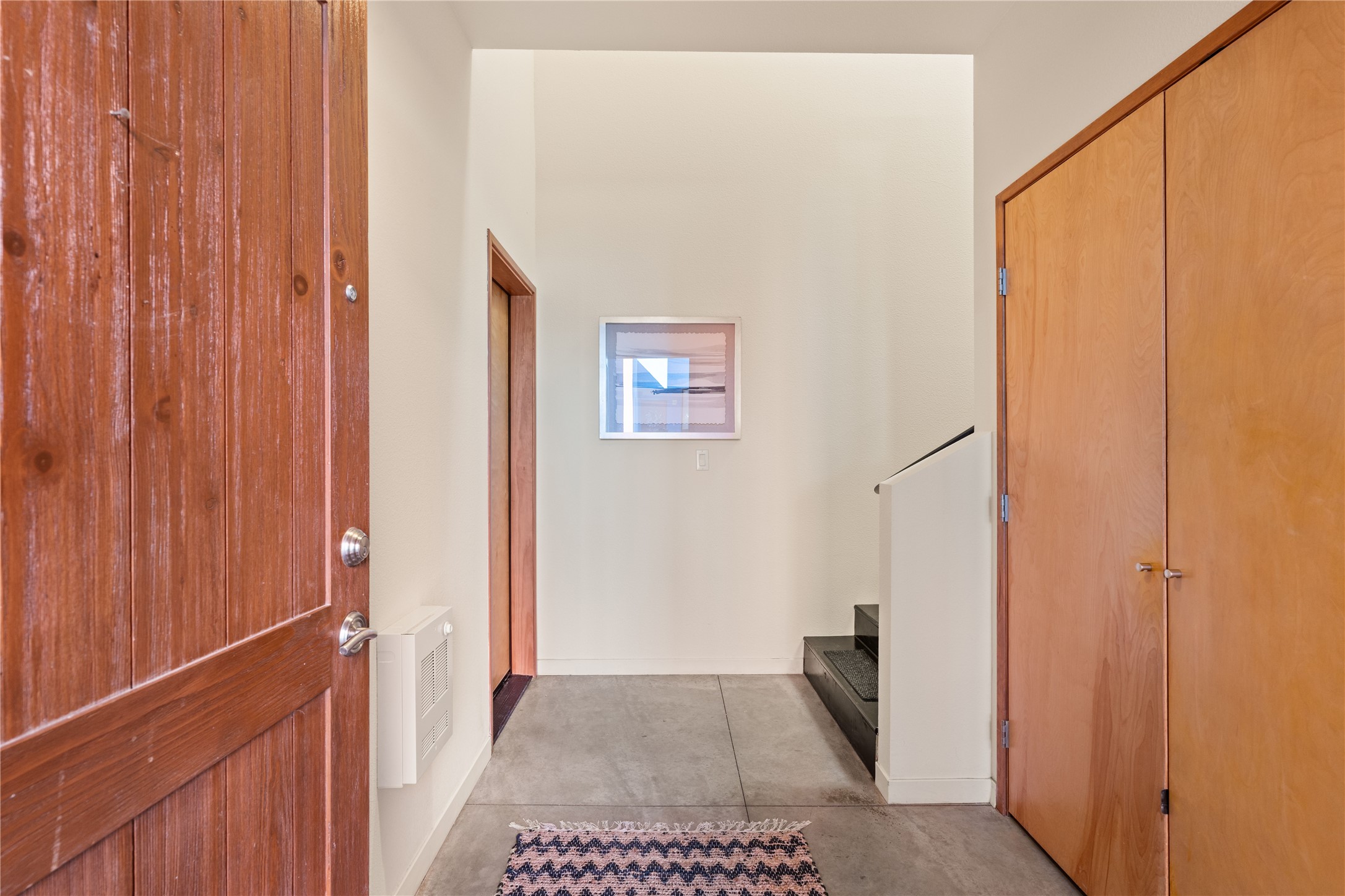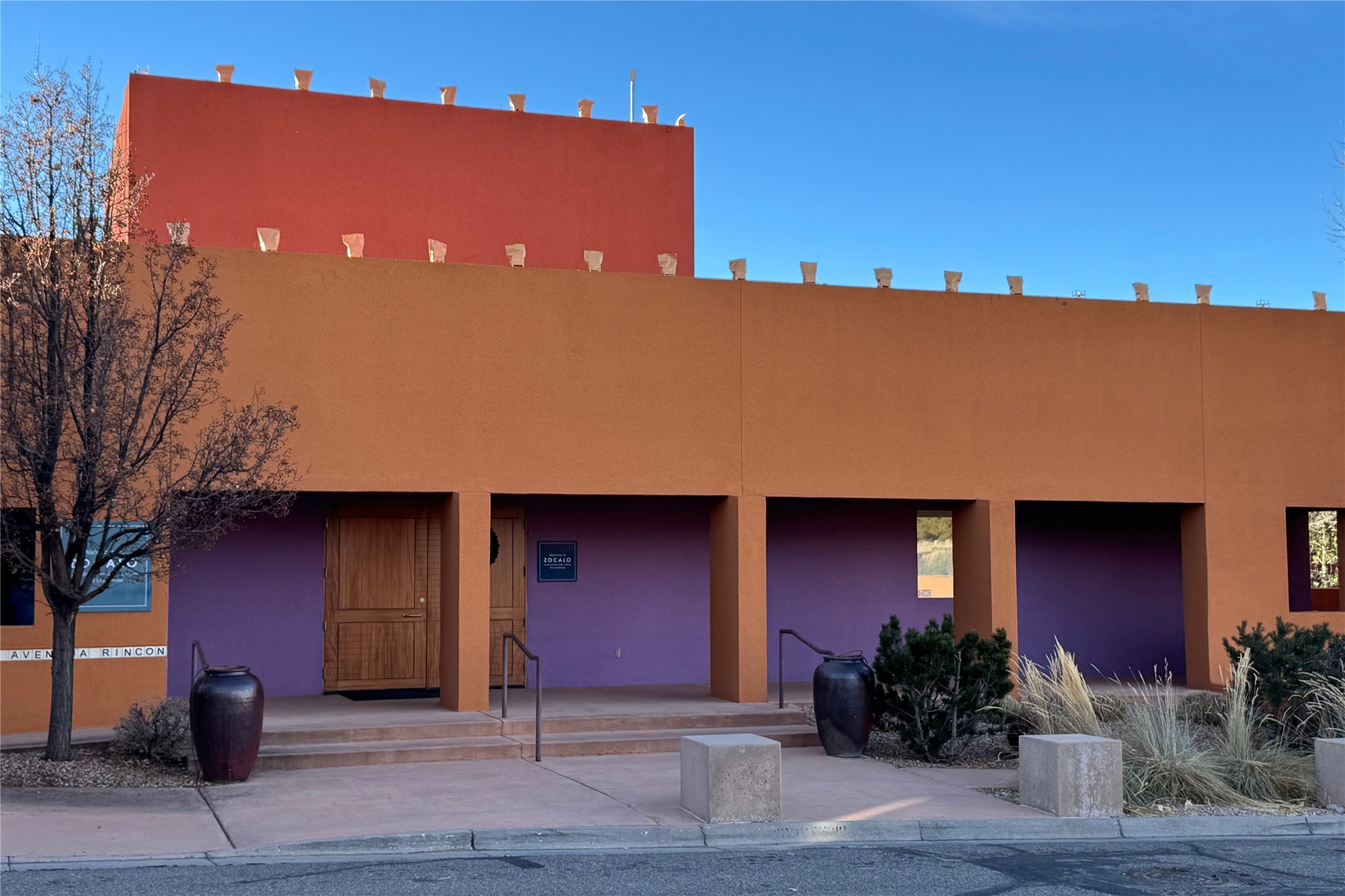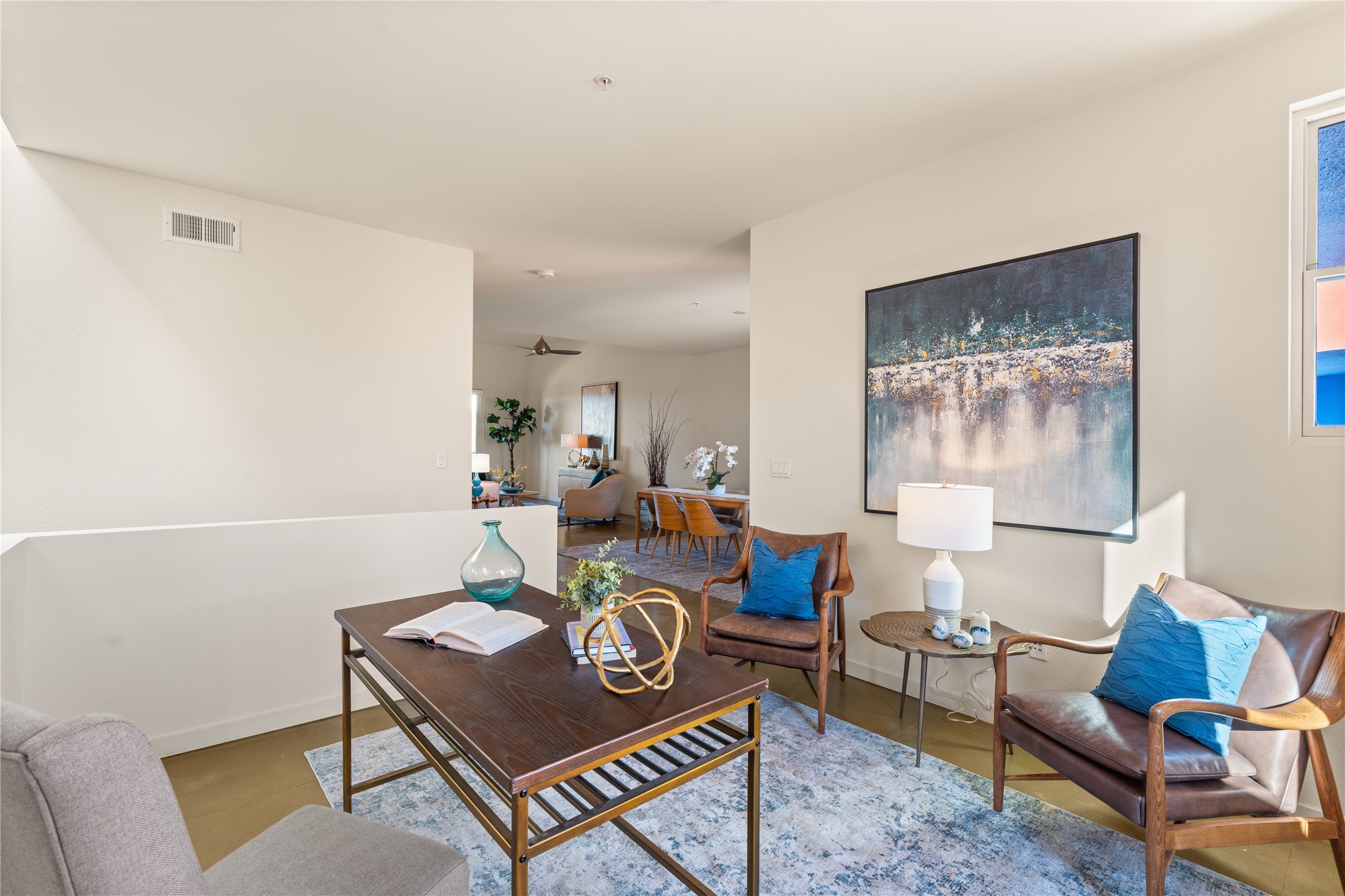 This contemporary, lock-and-leave condominium is one of the most sought after upper-level one-bedroom floorplans (The Cielo) in Zocalo, with a study/loft (convertible to a second bedroom), double vanity bath, direct access garage, and a view over the arroyo and to the Jemez and Sandias. Designed by world-renowned Mexican architect Ricardo Legoretta, it features handsome concrete floors and 11-foot ceilings in the spacious living area, which opens onto a west-facing deck. The kitchen includes a stainless gas range/oven, microwave, dishwasher and double-door refrigerator.The master bedroom has a large closet with bypass doors. The double-vanity bath fetaures a tub/shower combination and compartmented water closet. The 12 x 12 foot study/loft area opens onto a second east-facing balcony and was designed to be converted to a second bedroom (one photo is virtually staged and portrays this). The home is light, bright, and airy, thanks to skylights located in the kitchen, bath and den. Generously sized Pella windows bring the outdoors in. Ample storage includes a generous entry closet and a walk-in pantry. The single-car garage offers more storage; a second parking spot is in the driveway. Zocalo community amenities include an outdoor lap pool, hot tub, two workout centers, and a spectacular clubhouse for private parties. A network of trails runs throughout. Ten minutes away is convenient shopping at DeVargas Mall with Albertsons, Sprouts, the post office and more. As an incentive to a buyer, the seller will cover HOA dues through December 2025.