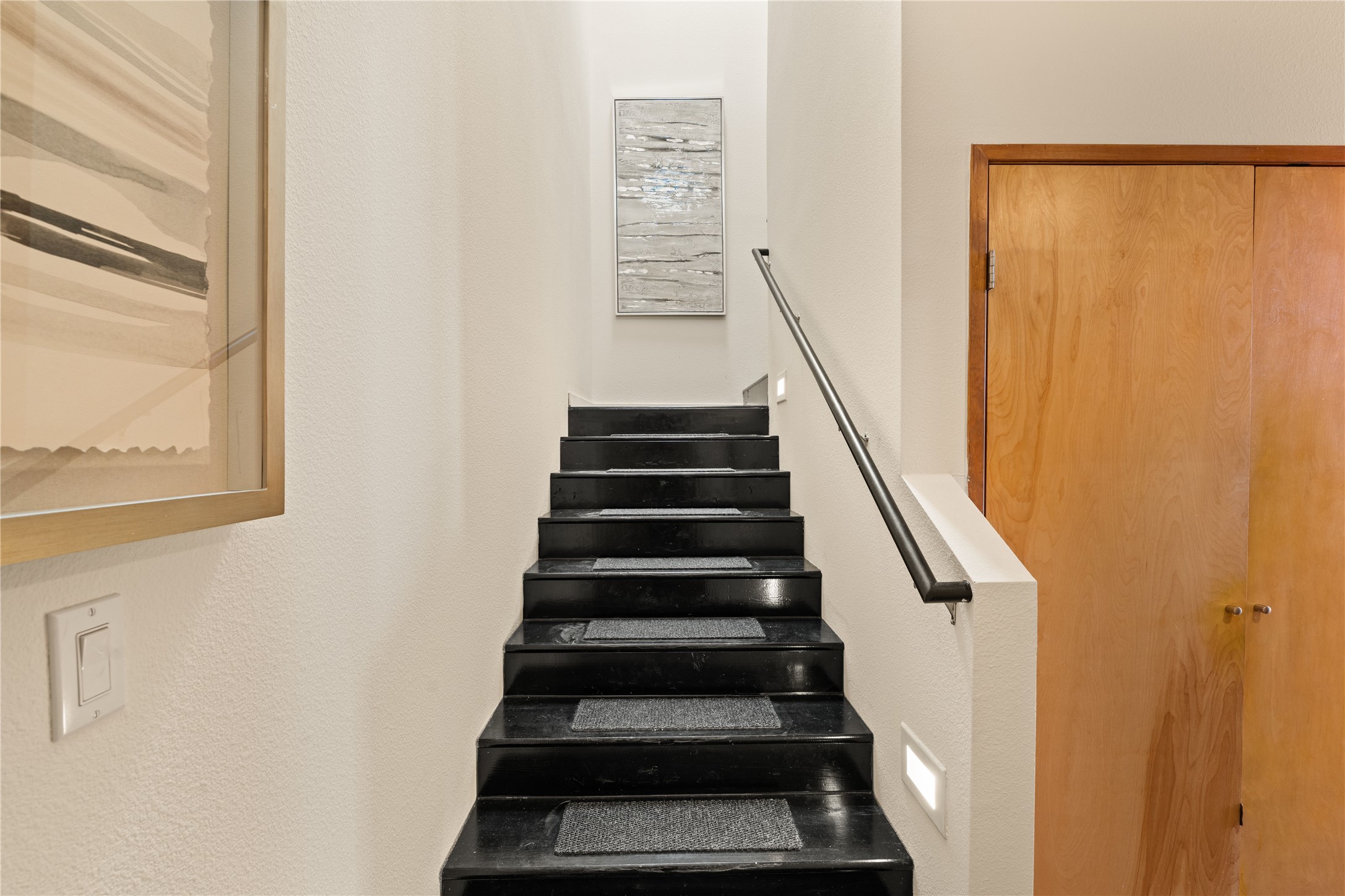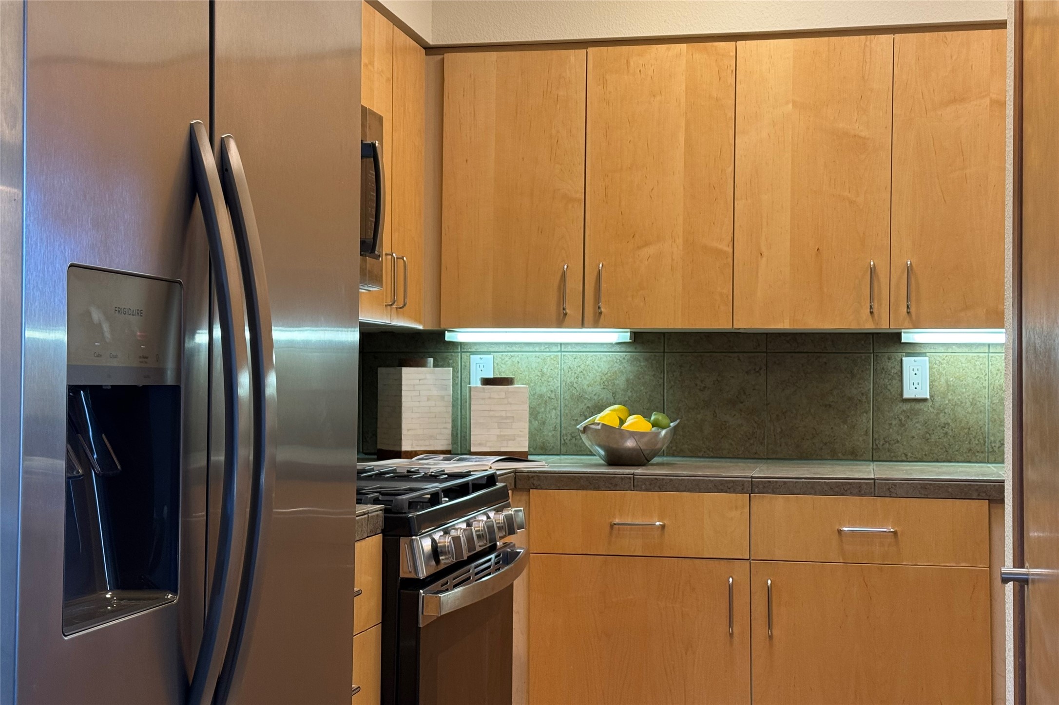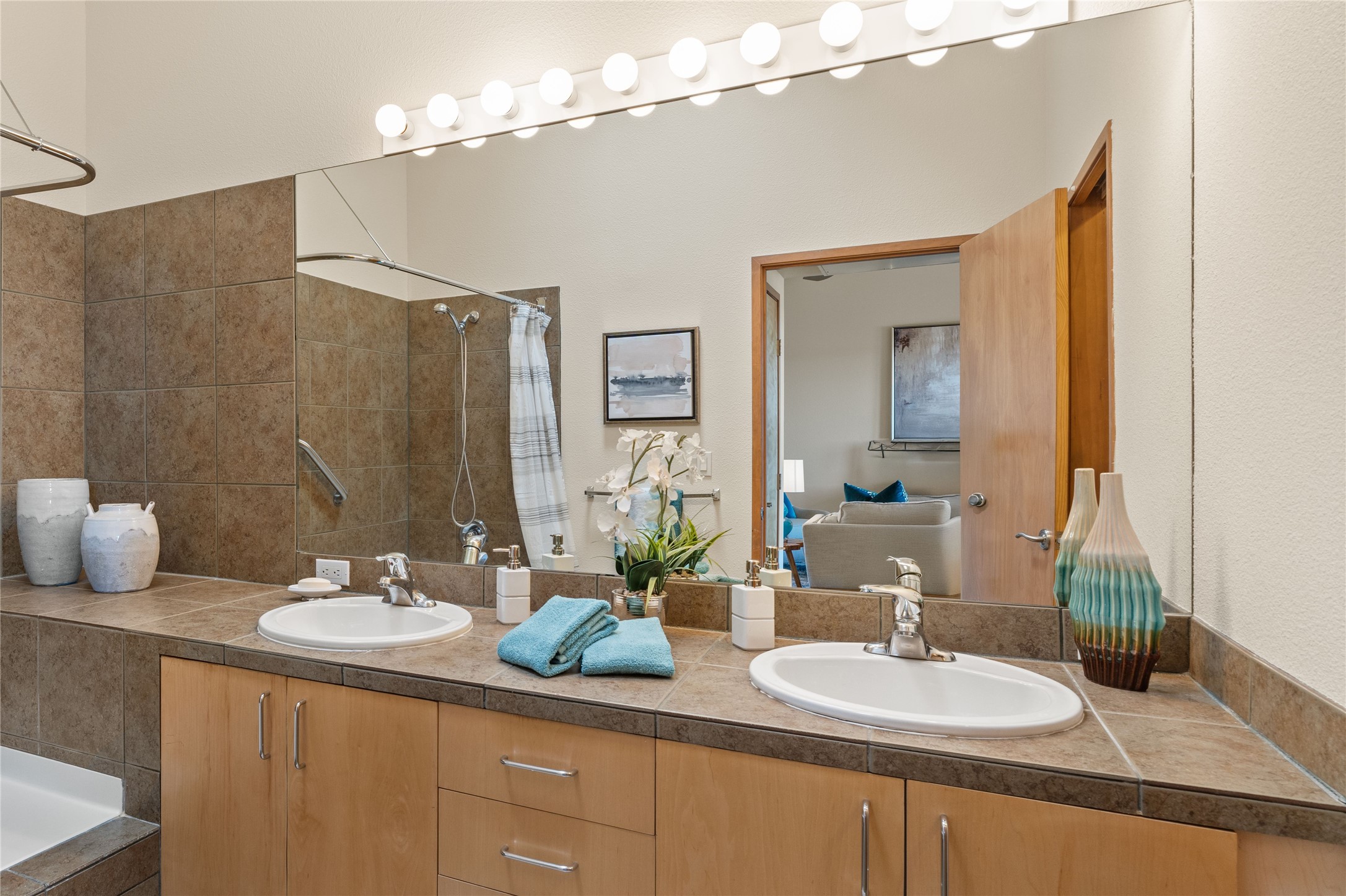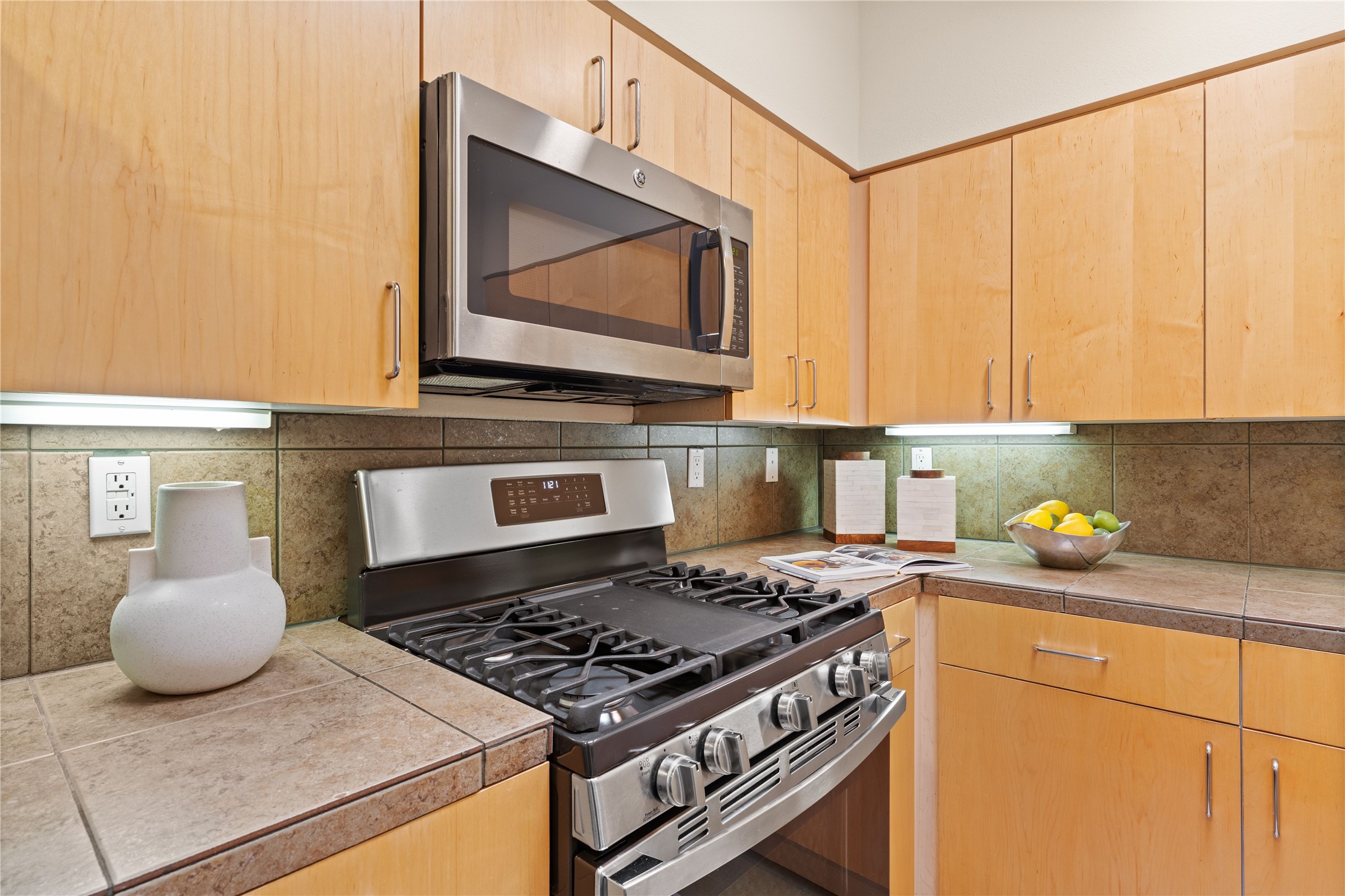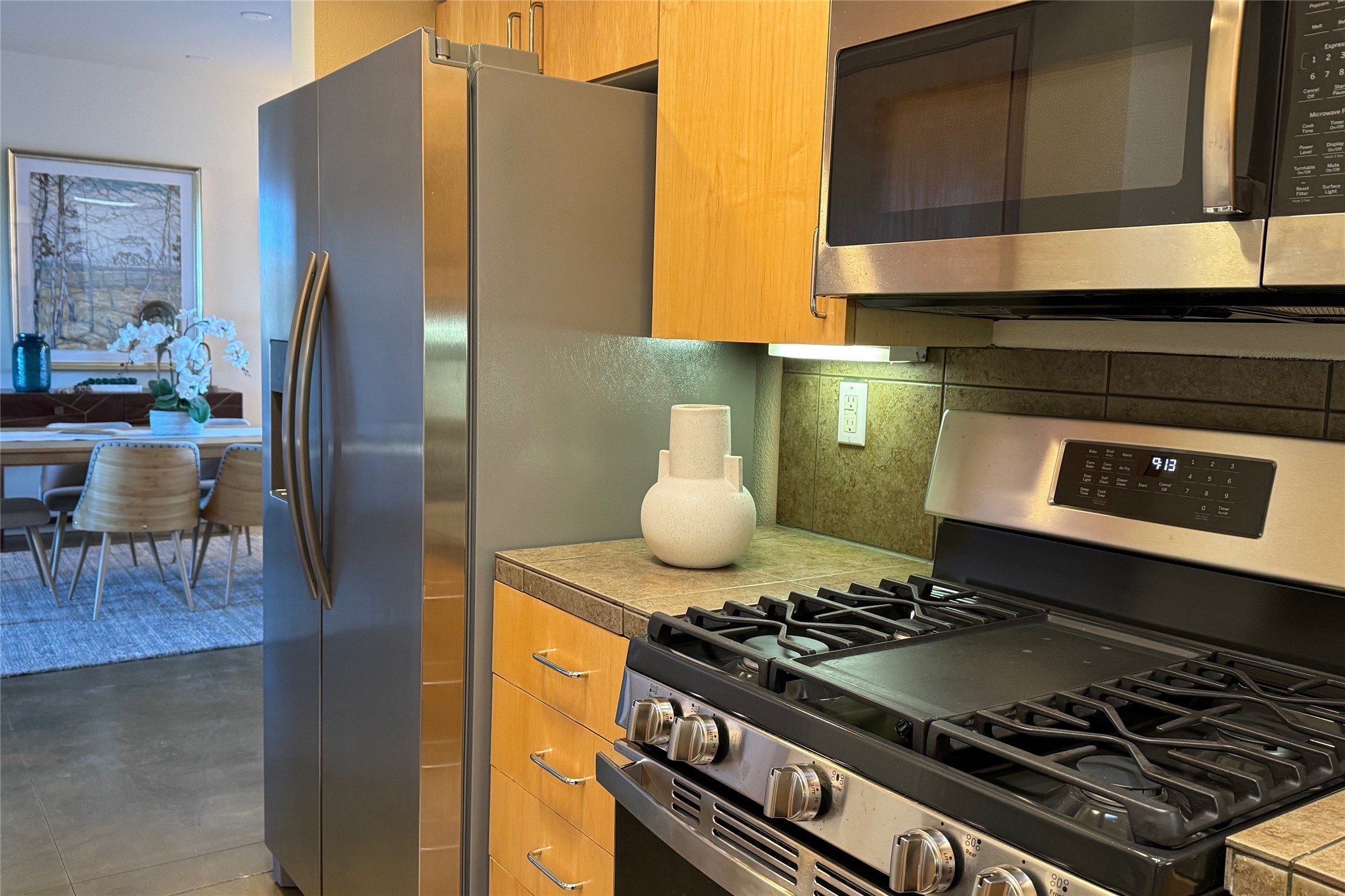 This contemporary, lock-and-leave condominium is one of the most sought after upper-level one-bedroom floorplans (The Cielo) in Zocalo, with a study/loft (convertible to a second bedroom), double vanity bath, direct access garage, and a view over the arroyo and to the Jemez and Sandias. Designed by world-renowned Mexican architect Ricardo Legoretta, it features handsome concrete floors and 11-foot ceilings in the spacious living area, which opens onto a west-facing deck. The kitchen includes a stainless gas range/oven, microwave, dishwasher and double-door refrigerator.The master bedroom has a large closet with bypass doors. The double-vanity bath fetaures a tub/shower combination and compartmented water closet. The 12 x 12 foot study/loft area opens onto a second east-facing balcony and was designed to be converted to a second bedroom (one photo is virtually staged and portrays this). The home is light, bright, and airy, thanks to skylights located in the kitchen, bath and den. Generously sized Pella windows bring the outdoors in. Ample storage includes a generous entry closet and a walk-in pantry. The single-car garage offers more storage; a second parking spot is in the driveway. Zocalo community amenities include an outdoor lap pool, hot tub, two workout centers, and a spectacular clubhouse for private parties. A network of trails runs throughout. Ten minutes away is convenient shopping at DeVargas Mall with Albertsons, Sprouts, the post office and more. As an incentive to a buyer, the seller will cover HOA dues through December 2025.