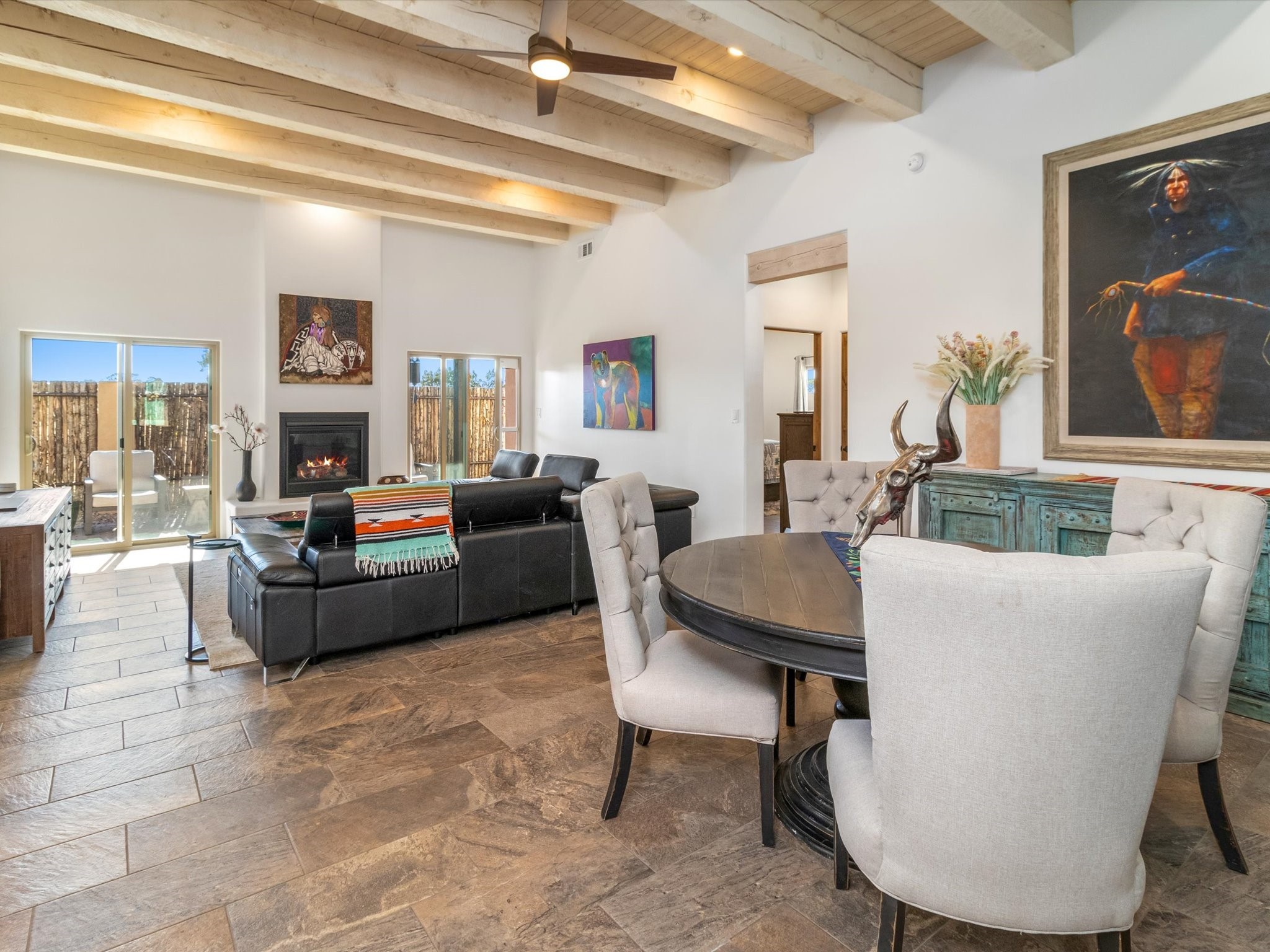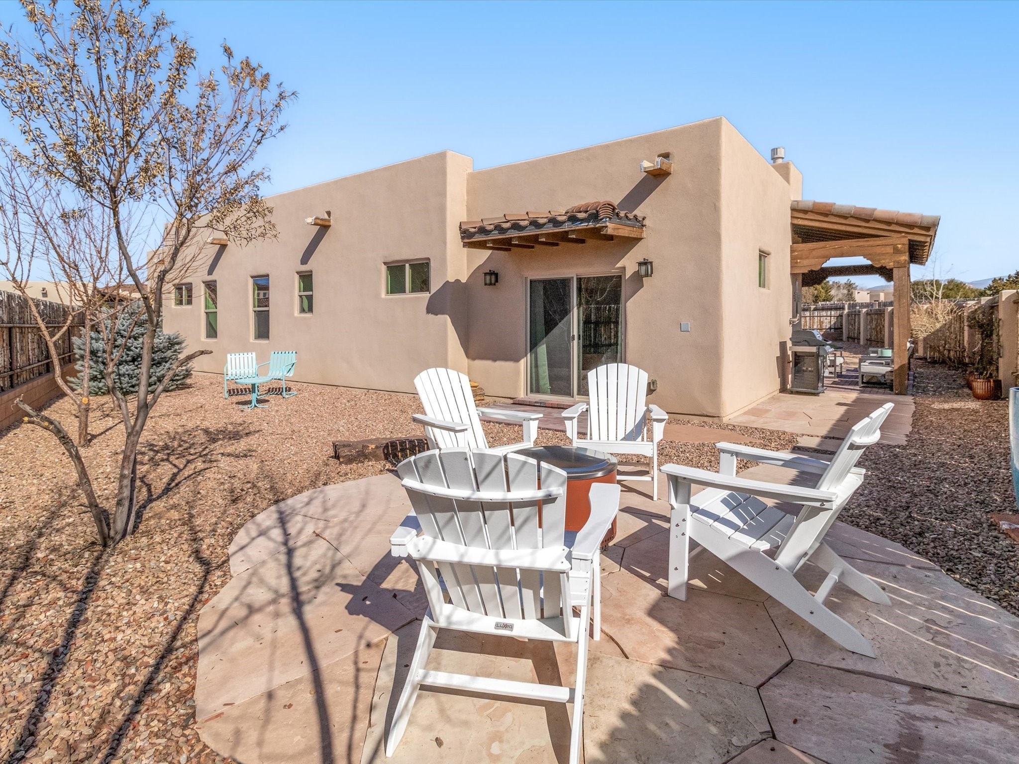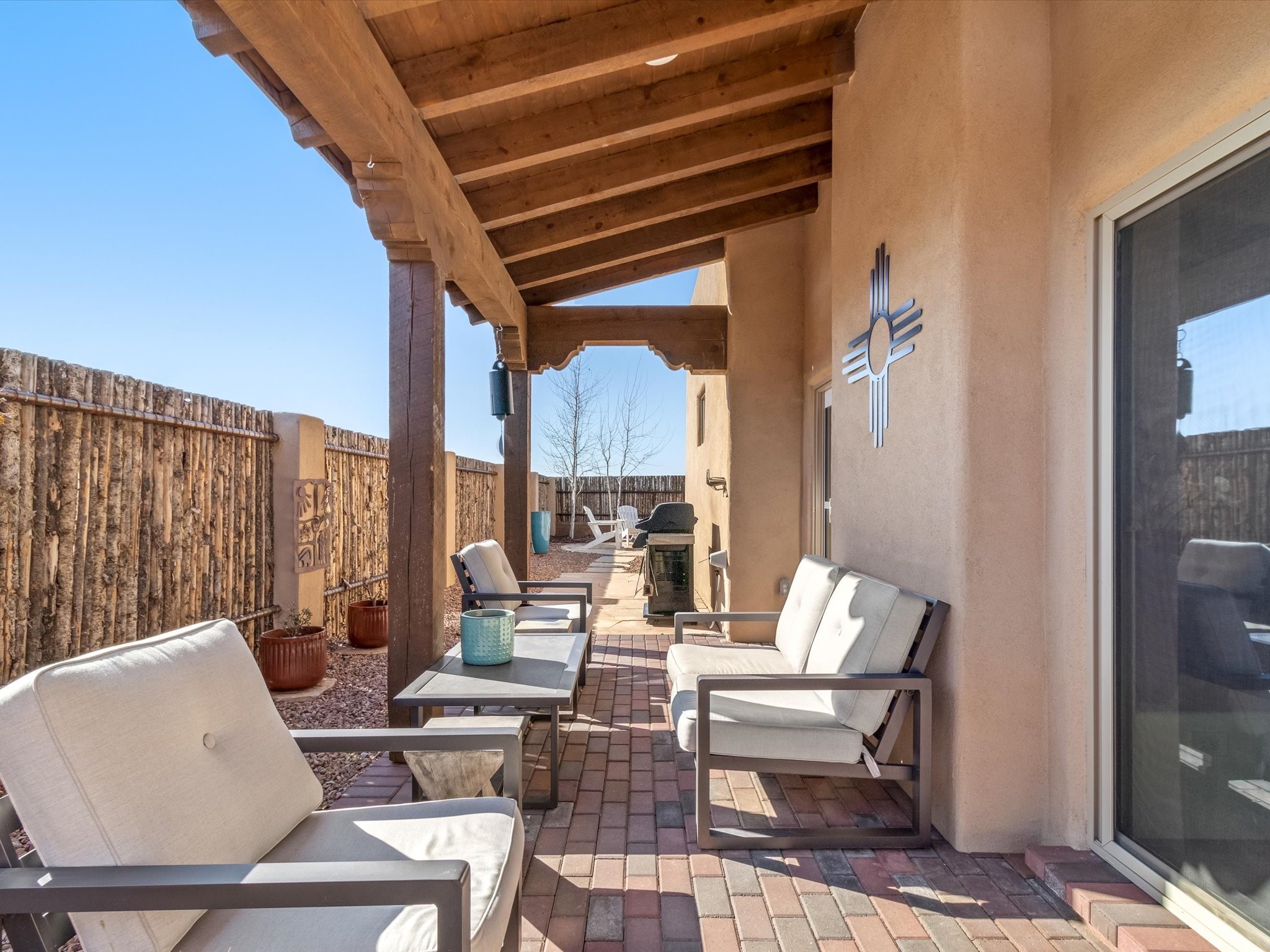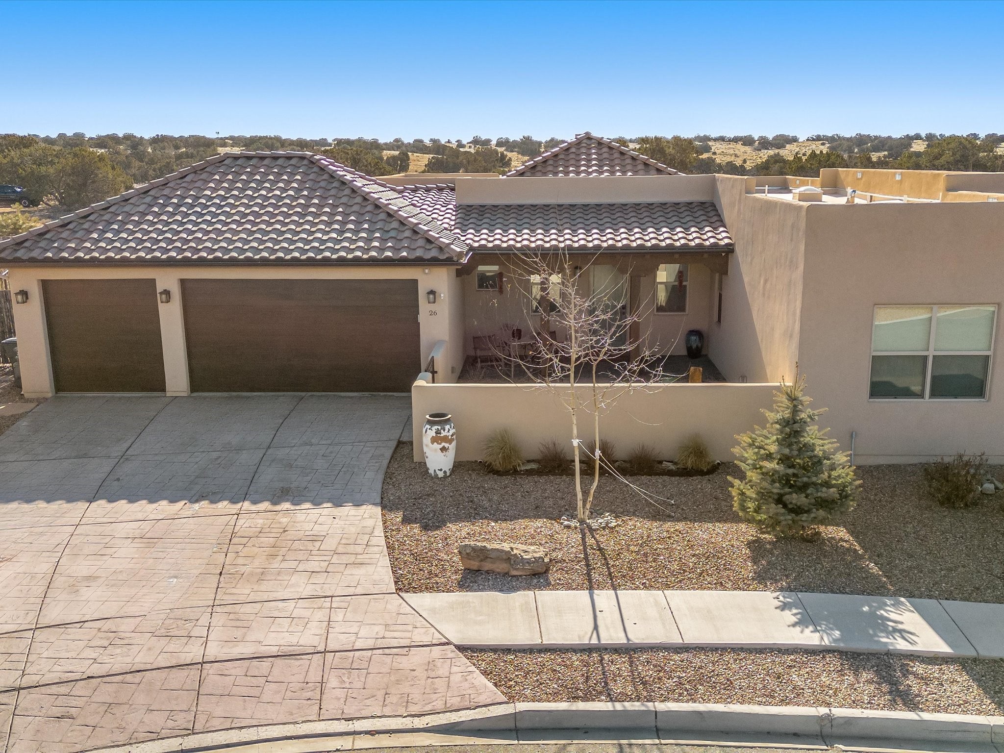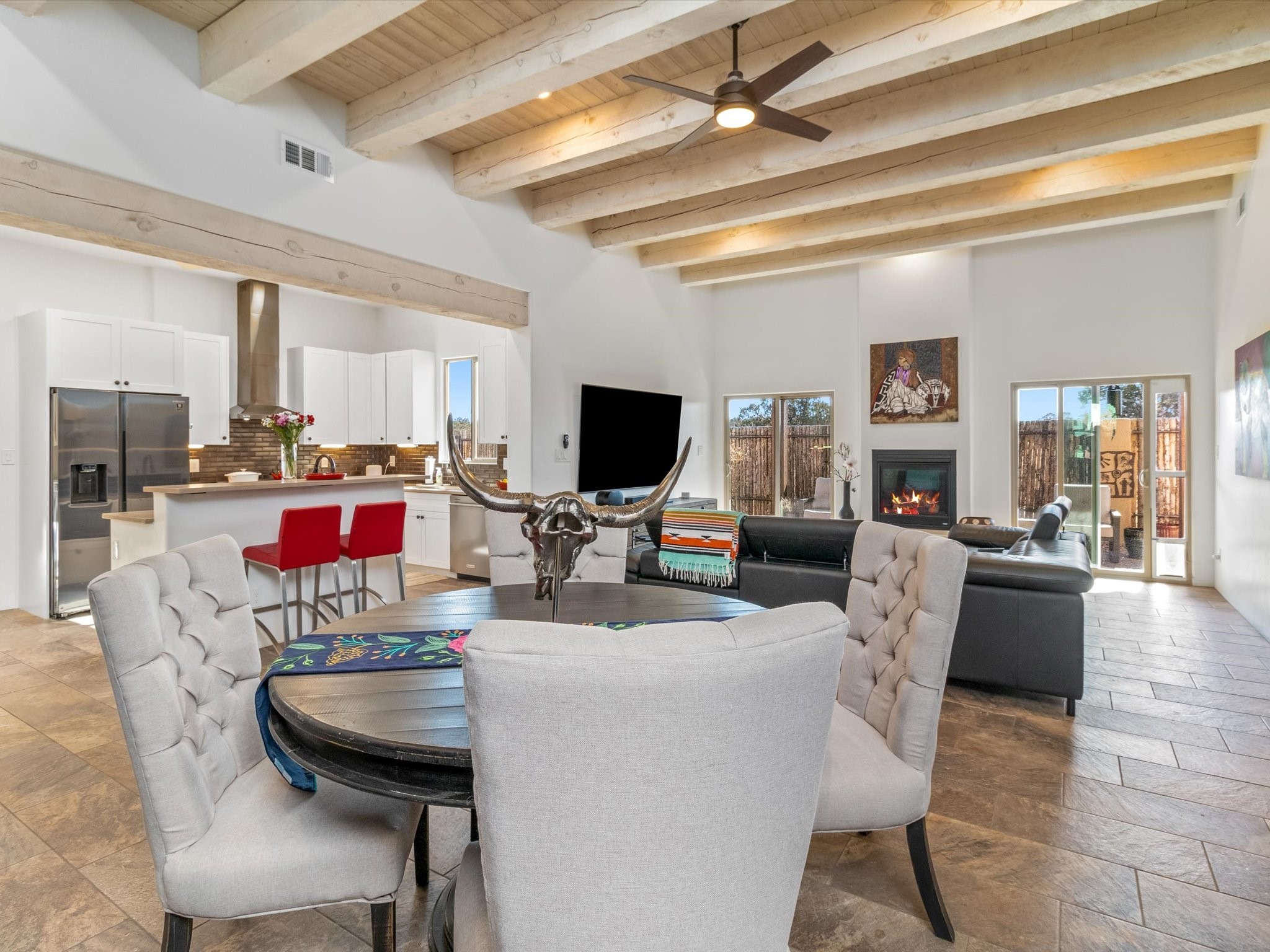 Nestled in the sought-after La Pradera Subdivision, this stunning Spanish-inspired home, built in 2021, has a total of 2,186 sqft. It has pitched Spanish design with clay-like roof and covered portals with rustic wood beams. It's brick pavers & colored driveway create a warm and inviting curb appeal. The rear of the property opens to a serene natural space and there are Walking trails surrounding the community.Step inside to an open-concept layout that seamlessly connects the dining area, kitchen, and living room--perfect for entertaining or relaxing with family. Custom interior lights in the foyer entrance set the tone for elegance, while the living room showcases white-stained beams with T&G planking and a cozy fireplace that adds warmth and character. The kitchen is a chef's dream, featuring a commercial-grade stove, stainless steel appliances, a breakfast island, and a window over the sink that fills the space with natural light. A gas line at the back patio for outdoor cooking adds efficiency and custom window treatments elevate the home's style and comfort. This home offers three spacious bedrooms, including an owner's suite, en-suite bathroom with an enclosed shower, a bath tub and dual sinks. A powder room is conveniently located near the entry. Additional features include a separate laundry room, an extra room ideal for an office, study or small studio, and an attached three-car finished garage equipped with electric vehicle charging capability. Experience the perfect balance of style and practicality in this exceptional La Pradera home. Its inviting interiors, picturesque surroundings, and thoughtful design make it a must-see for those seeking their dream home in Santa Fe.