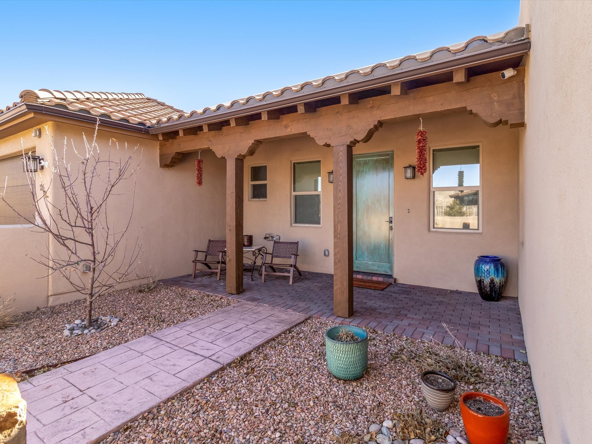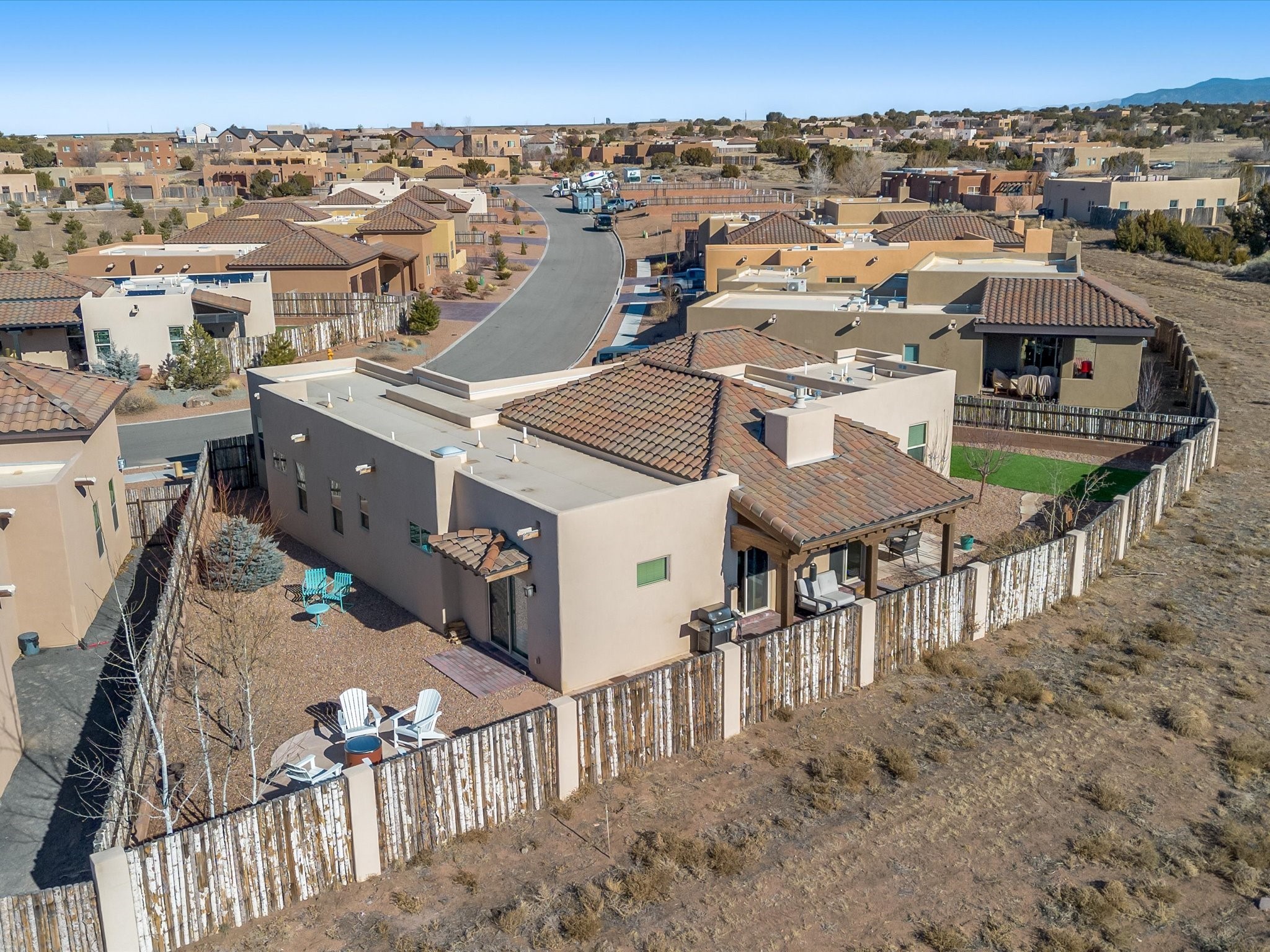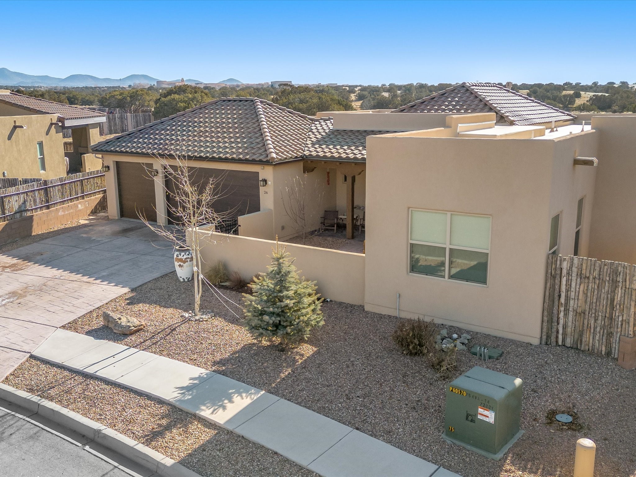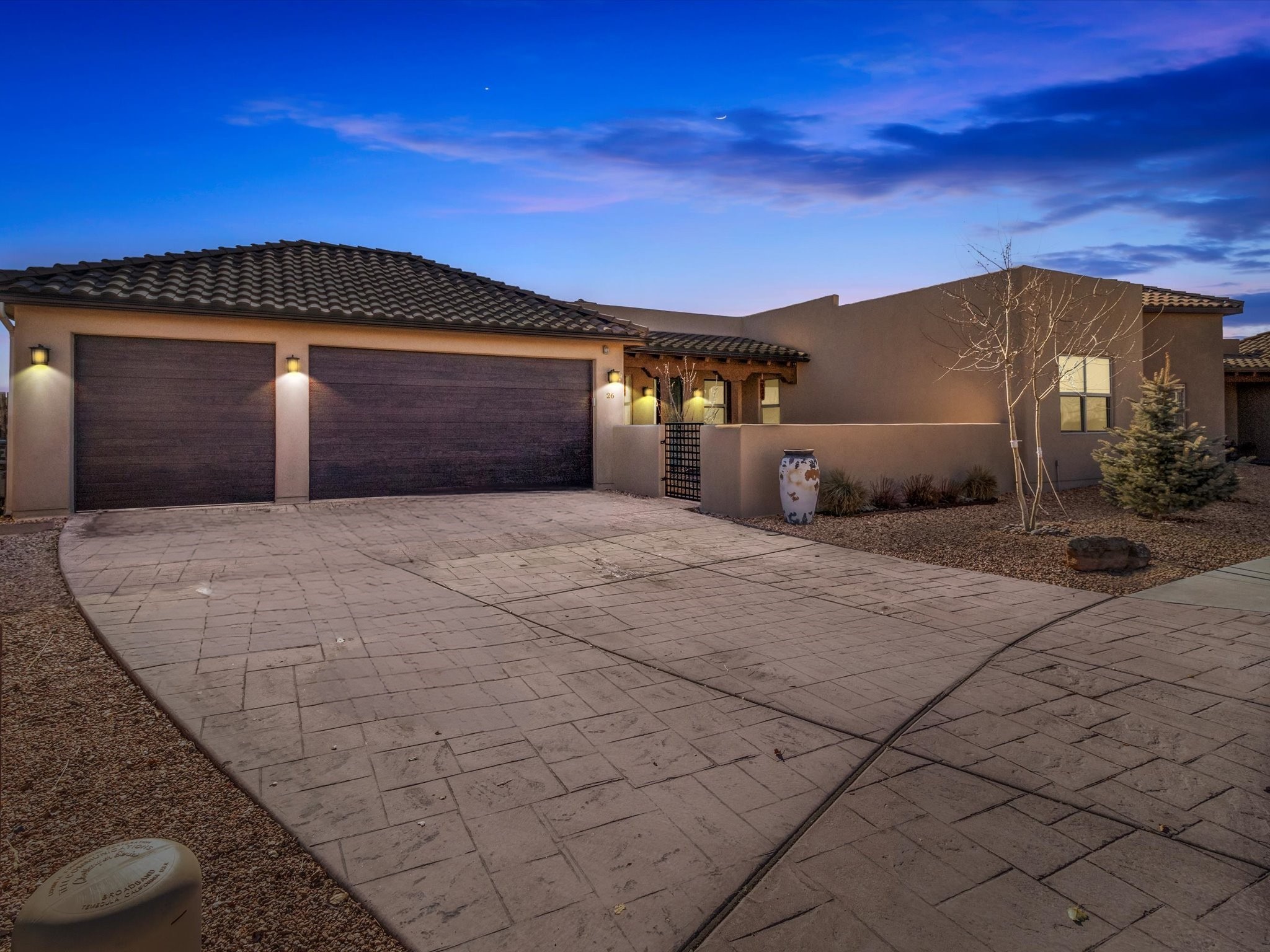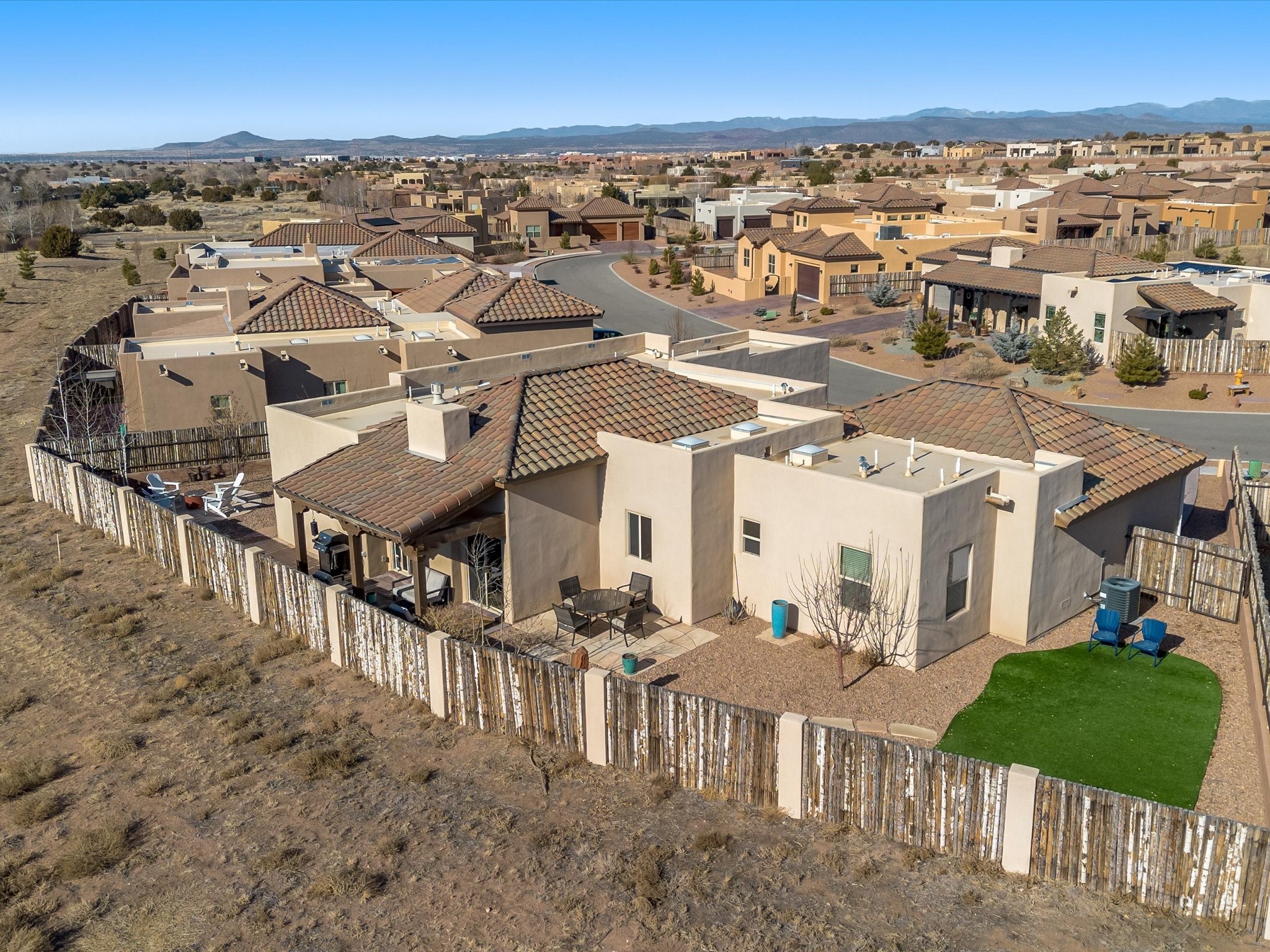 Nestled in the sought-after La Pradera Subdivision, this stunning Spanish-inspired home, built in 2021, has a total of 2,186 sqft. It has pitched Spanish design with clay-like roof and covered portals with rustic wood beams. It's brick pavers & colored driveway create a warm and inviting curb appeal. The rear of the property opens to a serene natural space and there are Walking trails surrounding the community.Step inside to an open-concept layout that seamlessly connects the dining area, kitchen, and living room--perfect for entertaining or relaxing with family. Custom interior lights in the foyer entrance set the tone for elegance, while the living room showcases white-stained beams with T&G planking and a cozy fireplace that adds warmth and character. The kitchen is a chef's dream, featuring a commercial-grade stove, stainless steel appliances, a breakfast island, and a window over the sink that fills the space with natural light. A gas line at the back patio for outdoor cooking adds efficiency and custom window treatments elevate the home's style and comfort. This home offers three spacious bedrooms, including an owner's suite, en-suite bathroom with an enclosed shower, a bath tub and dual sinks. A powder room is conveniently located near the entry. Additional features include a separate laundry room, an extra room ideal for an office, study or small studio, and an attached three-car finished garage equipped with electric vehicle charging capability. Experience the perfect balance of style and practicality in this exceptional La Pradera home. Its inviting interiors, picturesque surroundings, and thoughtful design make it a must-see for those seeking their dream home in Santa Fe.