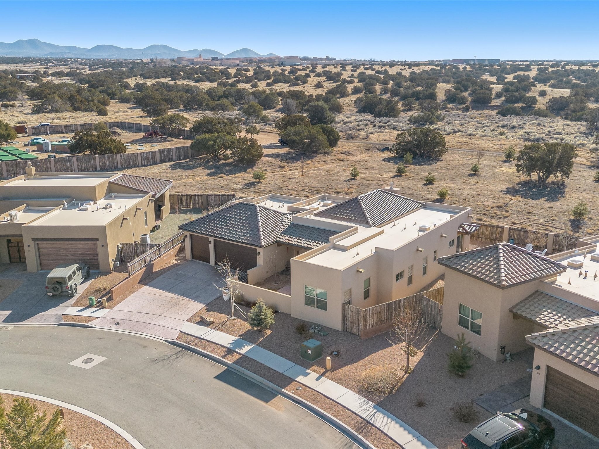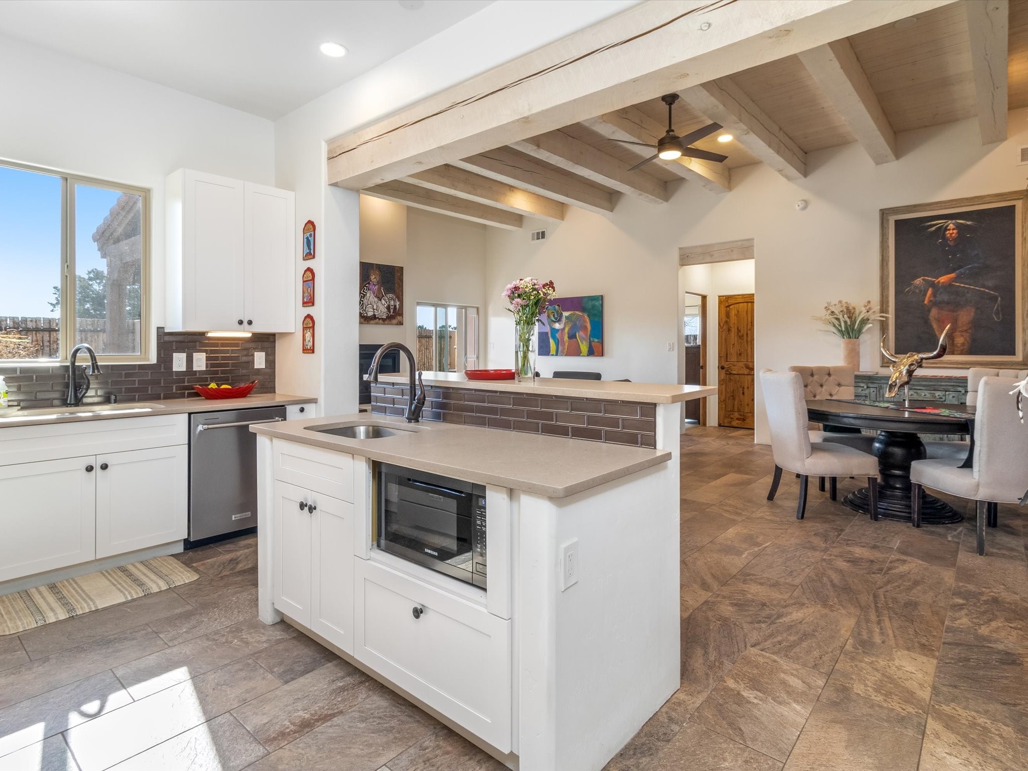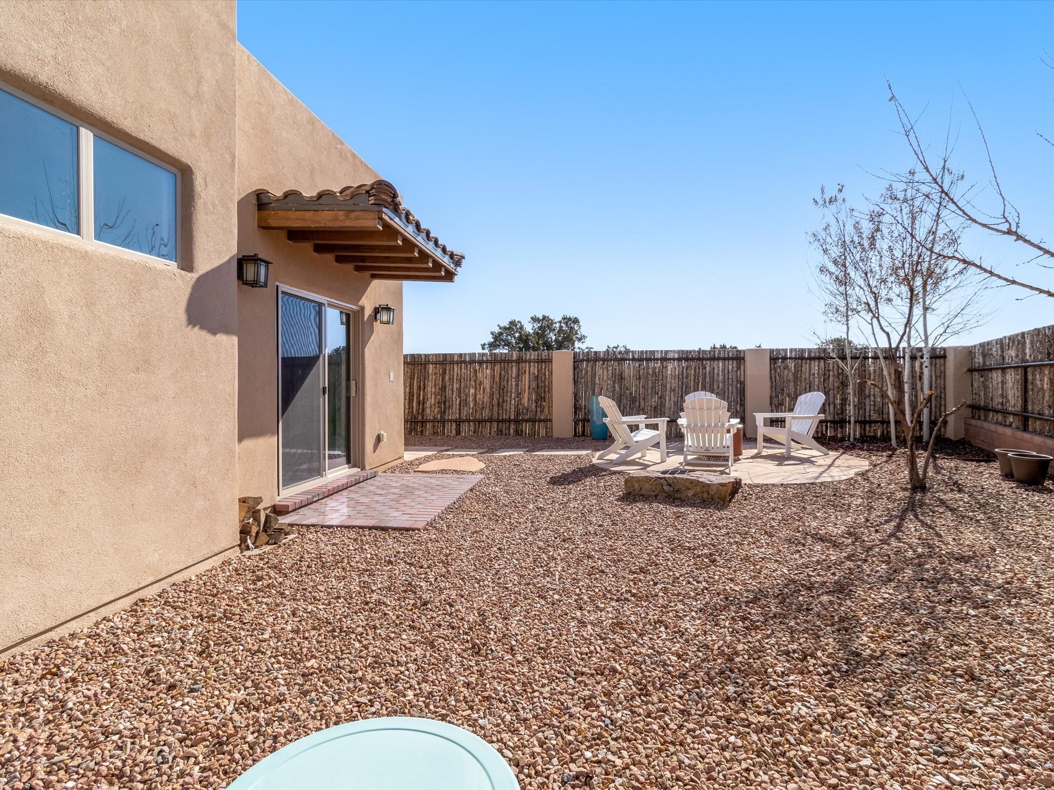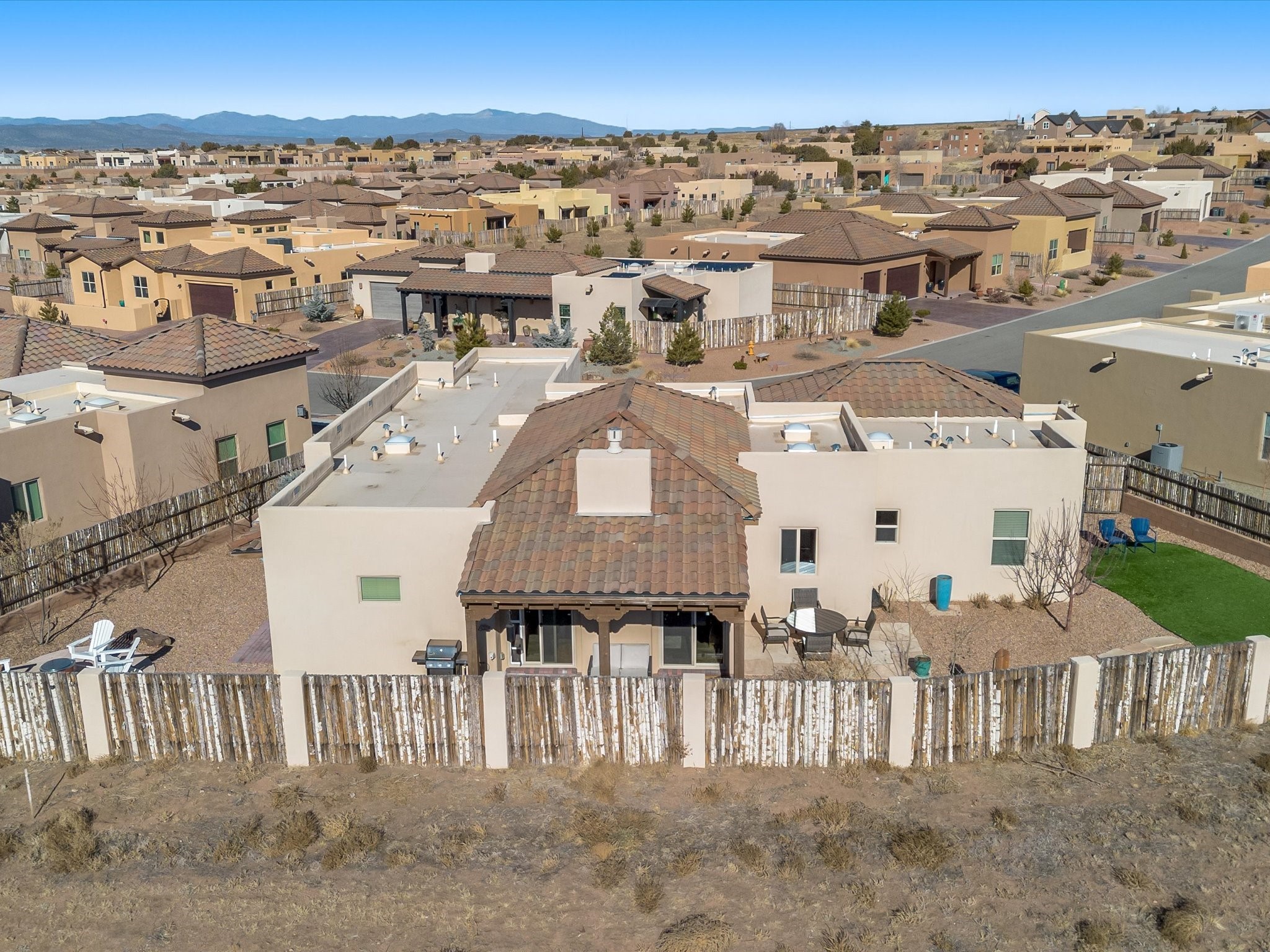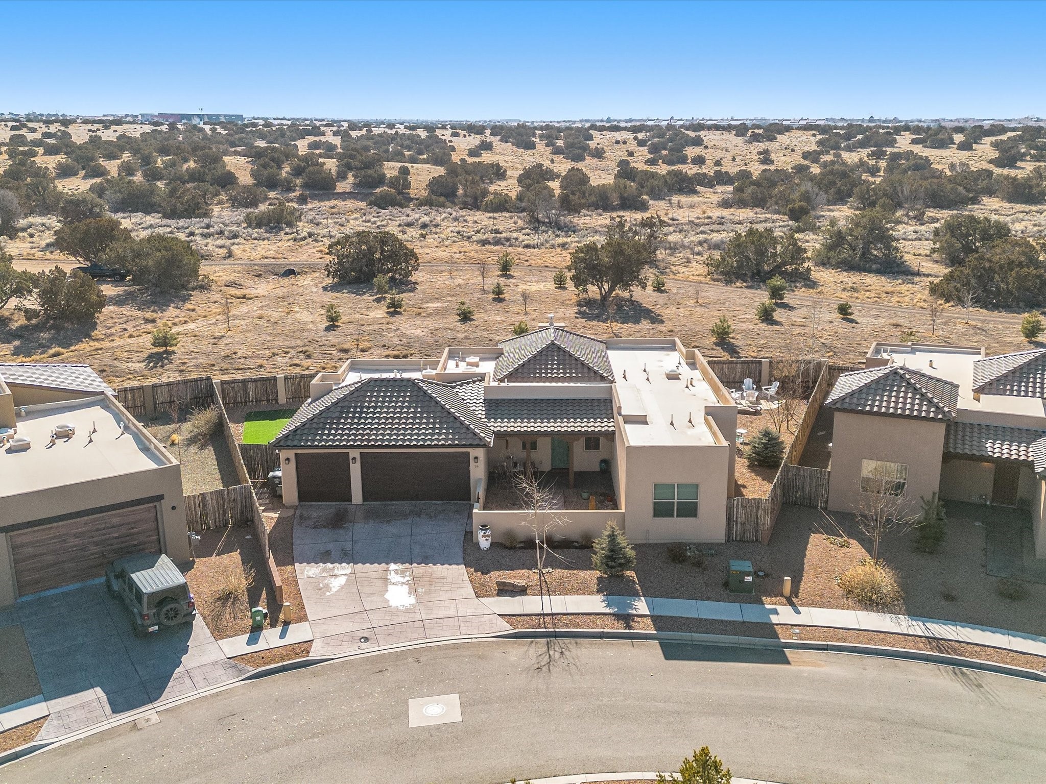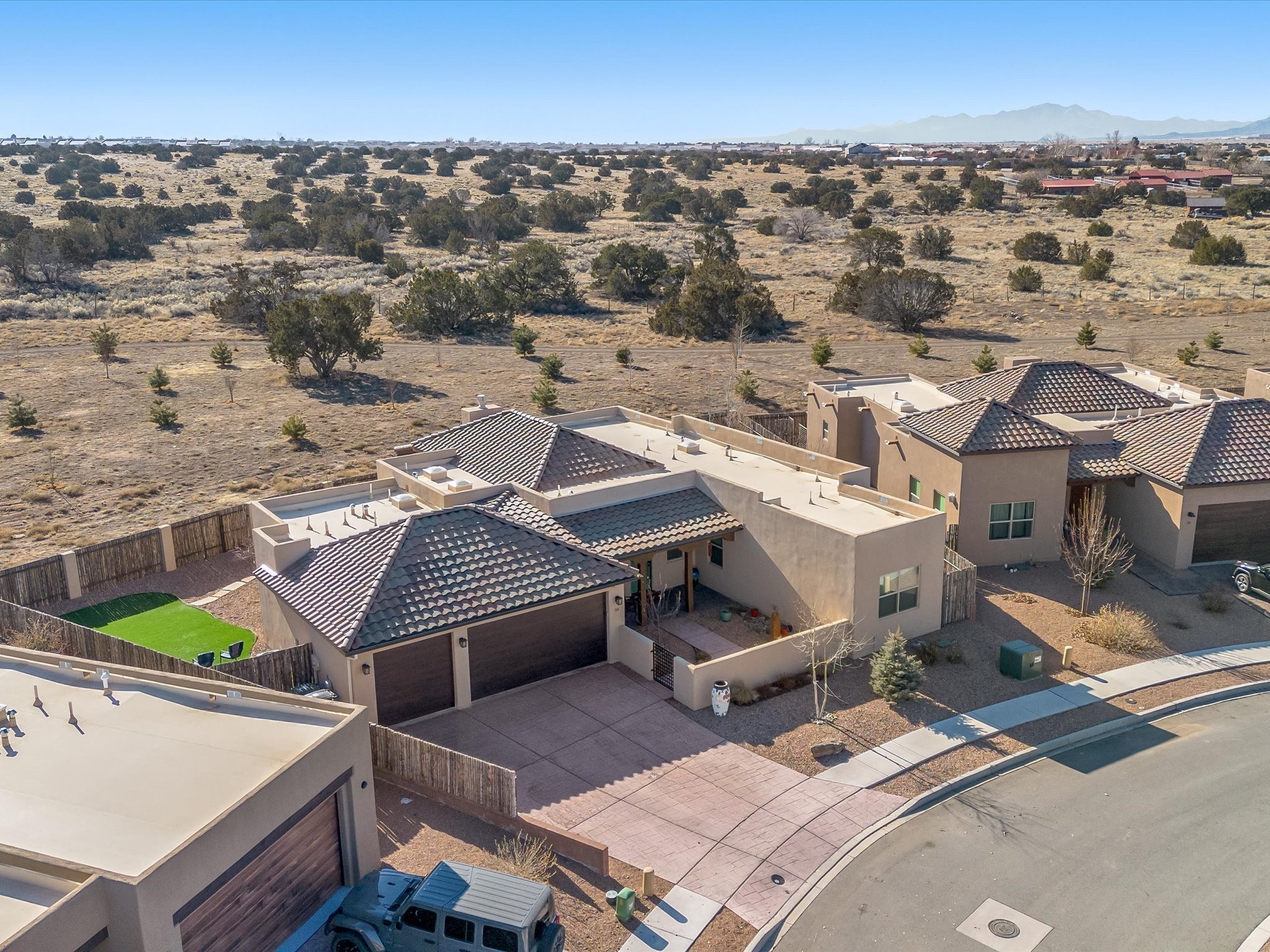 Nestled in the sought-after La Pradera Subdivision, this stunning Spanish-inspired home, built in 2021, has a total of 2,186 sqft. It has pitched Spanish design with clay-like roof and covered portals with rustic wood beams. It's brick pavers & colored driveway create a warm and inviting curb appeal. The rear of the property opens to a serene natural space and there are Walking trails surrounding the community.Step inside to an open-concept layout that seamlessly connects the dining area, kitchen, and living room--perfect for entertaining or relaxing with family. Custom interior lights in the foyer entrance set the tone for elegance, while the living room showcases white-stained beams with T&G planking and a cozy fireplace that adds warmth and character. The kitchen is a chef's dream, featuring a commercial-grade stove, stainless steel appliances, a breakfast island, and a window over the sink that fills the space with natural light. A gas line at the back patio for outdoor cooking adds efficiency and custom window treatments elevate the home's style and comfort. This home offers three spacious bedrooms, including an owner's suite, en-suite bathroom with an enclosed shower, a bath tub and dual sinks. A powder room is conveniently located near the entry. Additional features include a separate laundry room, an extra room ideal for an office, study or small studio, and an attached three-car finished garage equipped with electric vehicle charging capability. Experience the perfect balance of style and practicality in this exceptional La Pradera home. Its inviting interiors, picturesque surroundings, and thoughtful design make it a must-see for those seeking their dream home in Santa Fe.
