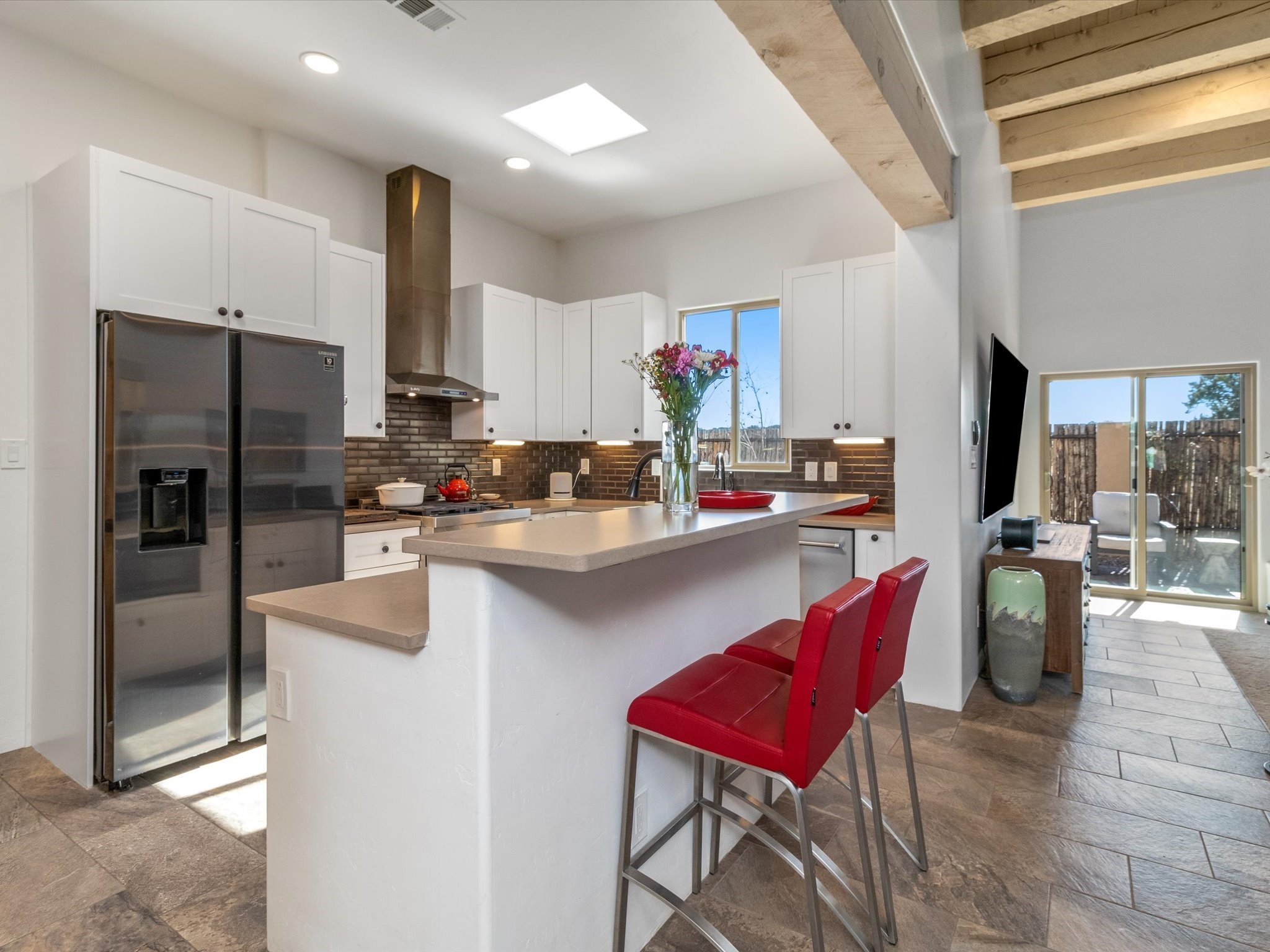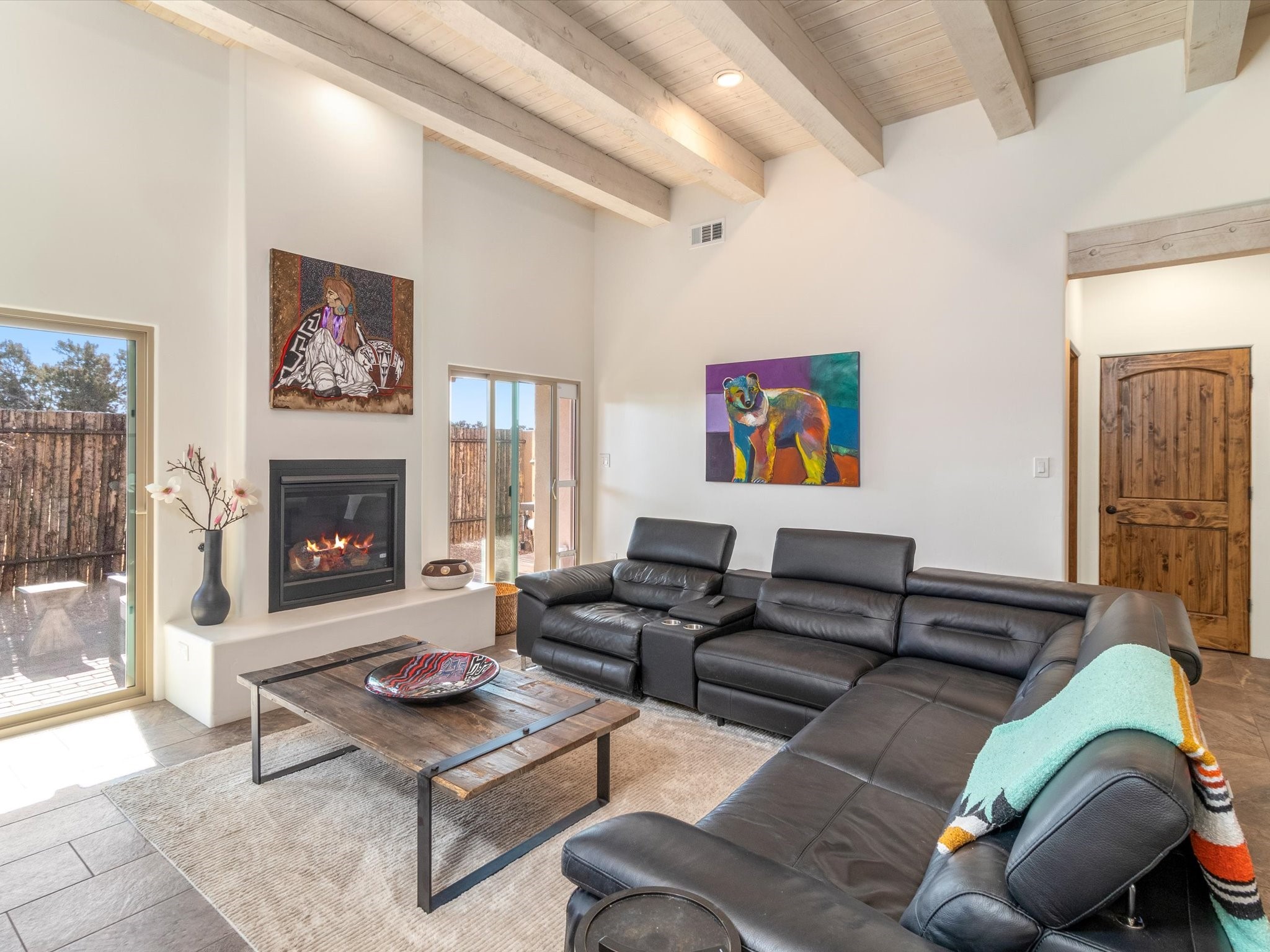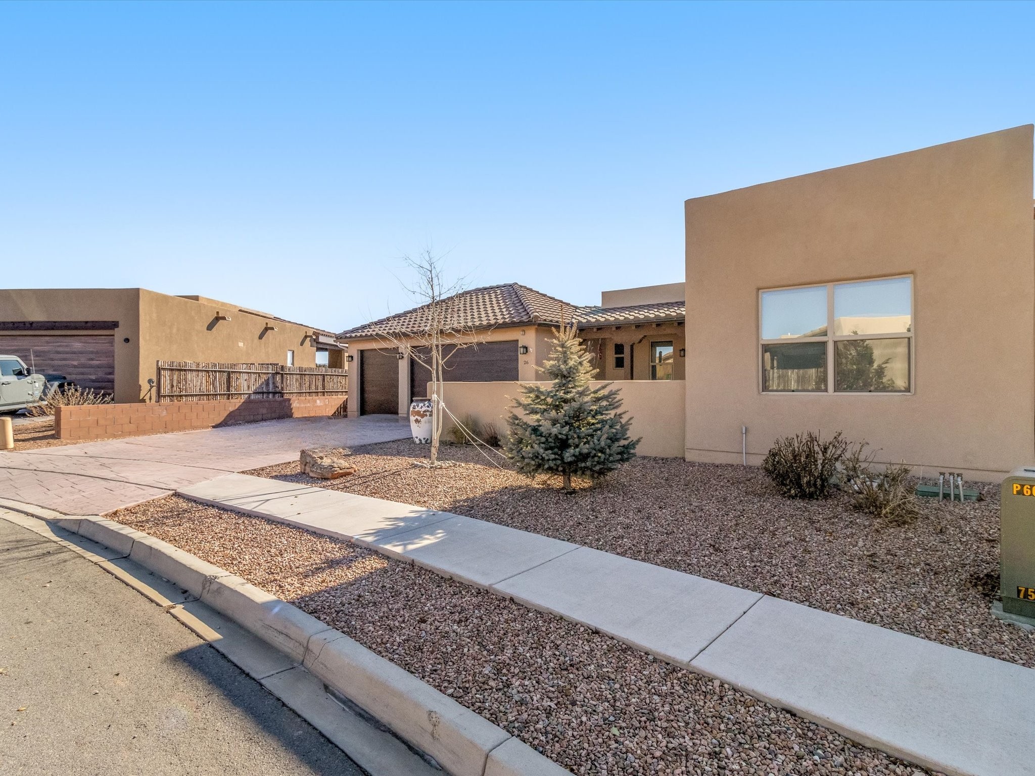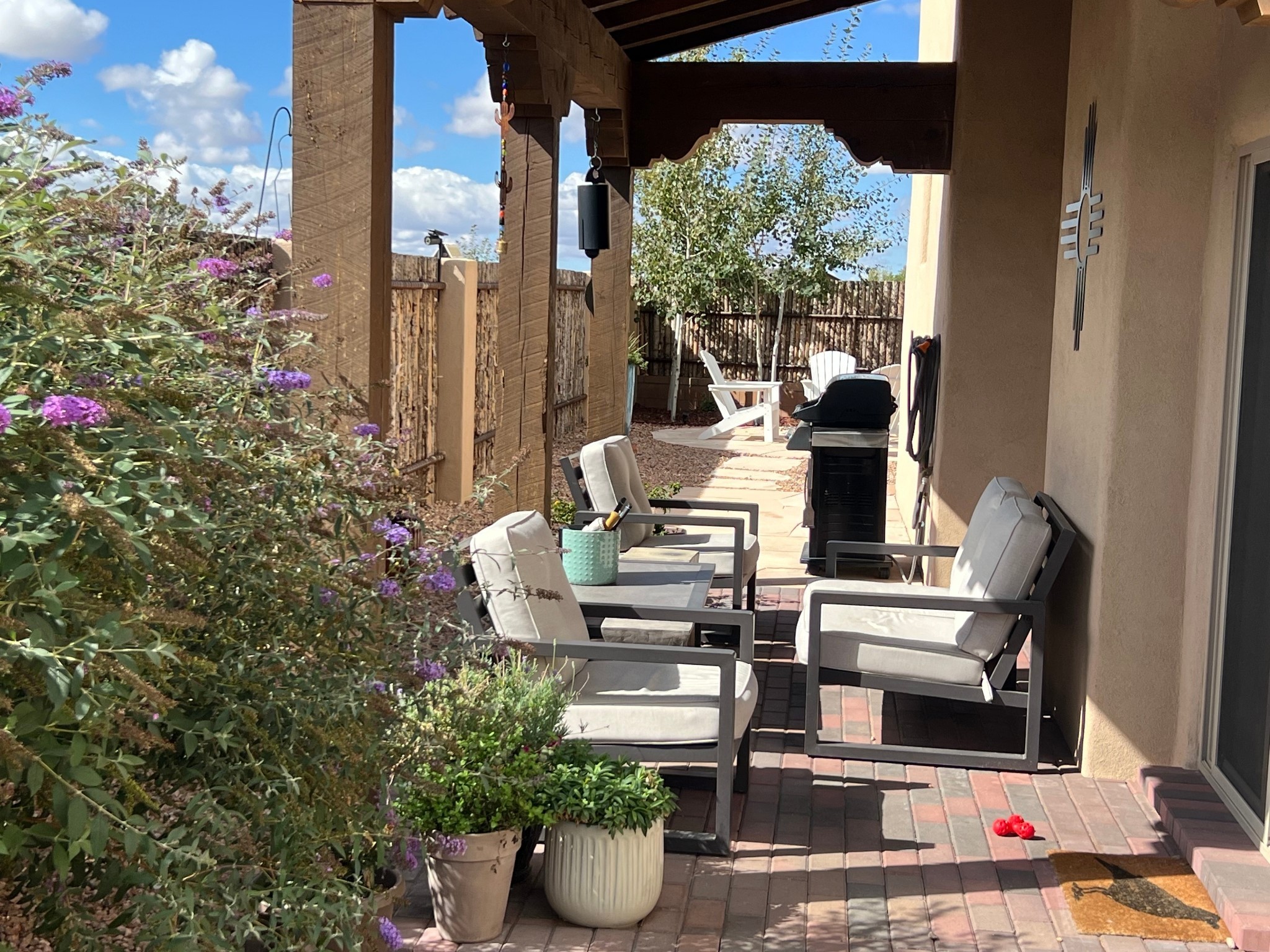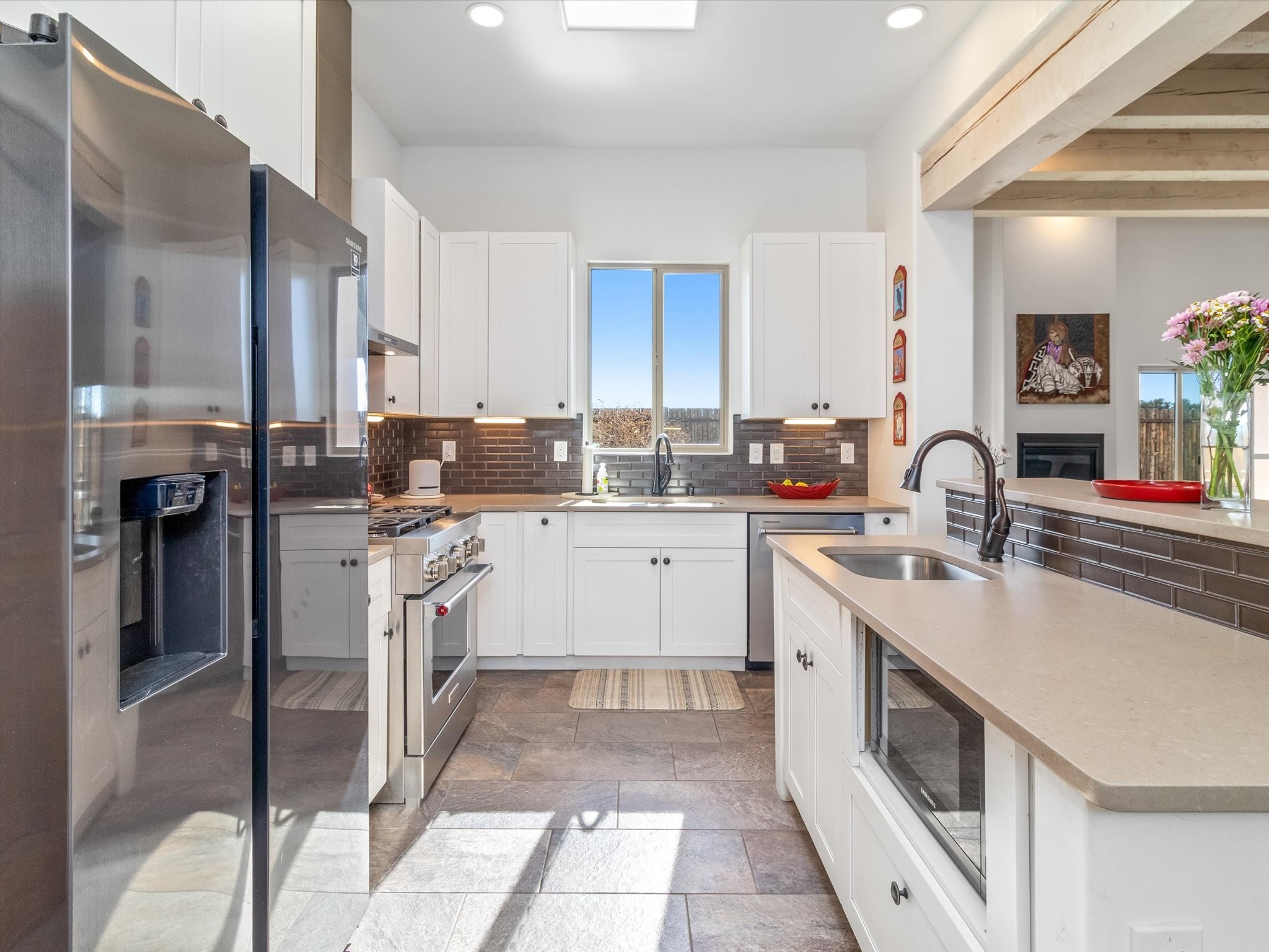 Nestled in the sought-after La Pradera Subdivision, this stunning Spanish-inspired home, built in 2021, has a total of 2,186 sqft. It has pitched Spanish design with clay-like roof and covered portals with rustic wood beams. It's brick pavers & colored driveway create a warm and inviting curb appeal. The rear of the property opens to a serene natural space and there are Walking trails surrounding the community.Step inside to an open-concept layout that seamlessly connects the dining area, kitchen, and living room--perfect for entertaining or relaxing with family. Custom interior lights in the foyer entrance set the tone for elegance, while the living room showcases white-stained beams with T&G planking and a cozy fireplace that adds warmth and character. The kitchen is a chef's dream, featuring a commercial-grade stove, stainless steel appliances, a breakfast island, and a window over the sink that fills the space with natural light. A gas line at the back patio for outdoor cooking adds efficiency and custom window treatments elevate the home's style and comfort. This home offers three spacious bedrooms, including an owner's suite, en-suite bathroom with an enclosed shower, a bath tub and dual sinks. A powder room is conveniently located near the entry. Additional features include a separate laundry room, an extra room ideal for an office, study or small studio, and an attached three-car finished garage equipped with electric vehicle charging capability. Experience the perfect balance of style and practicality in this exceptional La Pradera home. Its inviting interiors, picturesque surroundings, and thoughtful design make it a must-see for those seeking their dream home in Santa Fe.