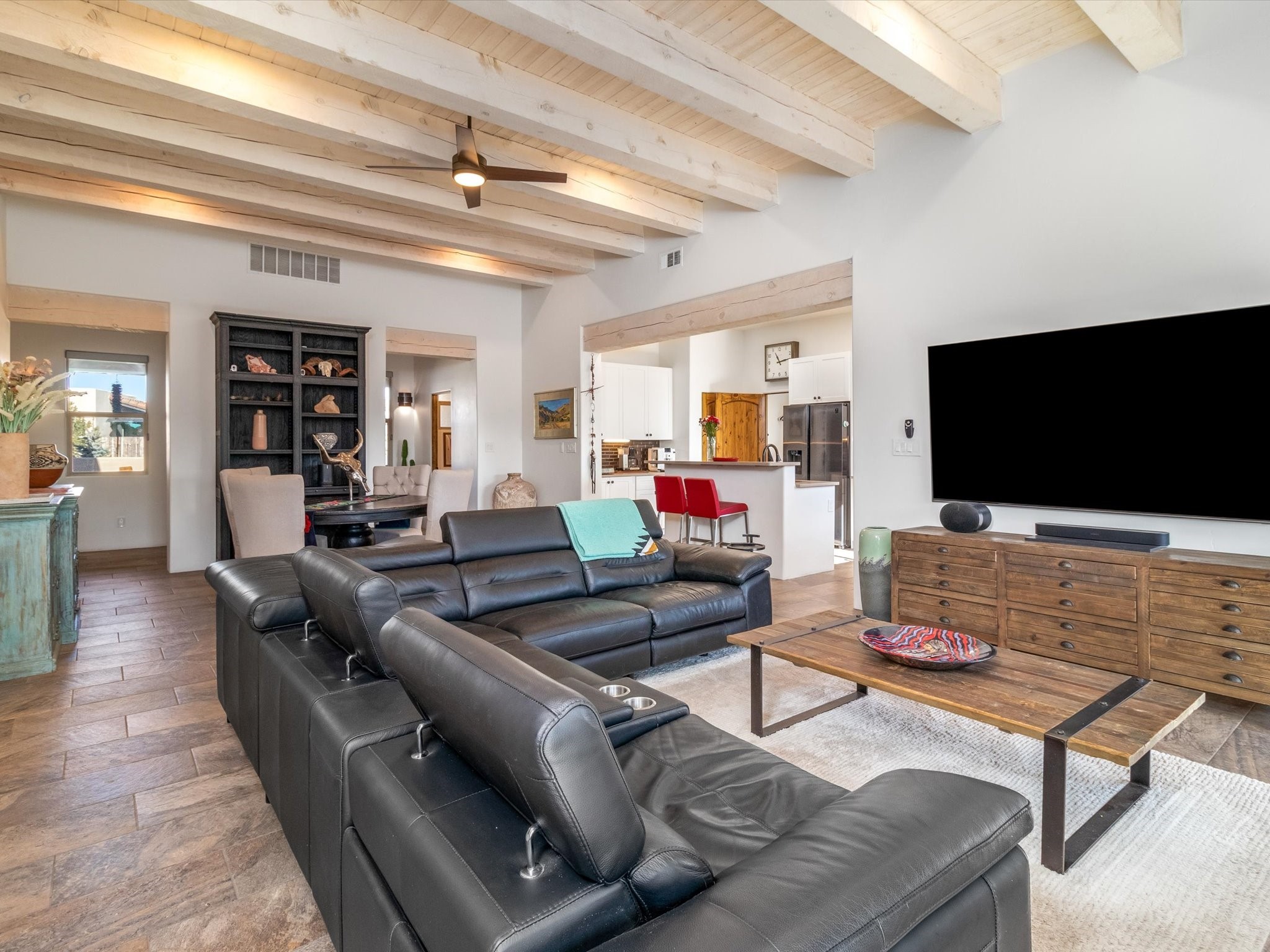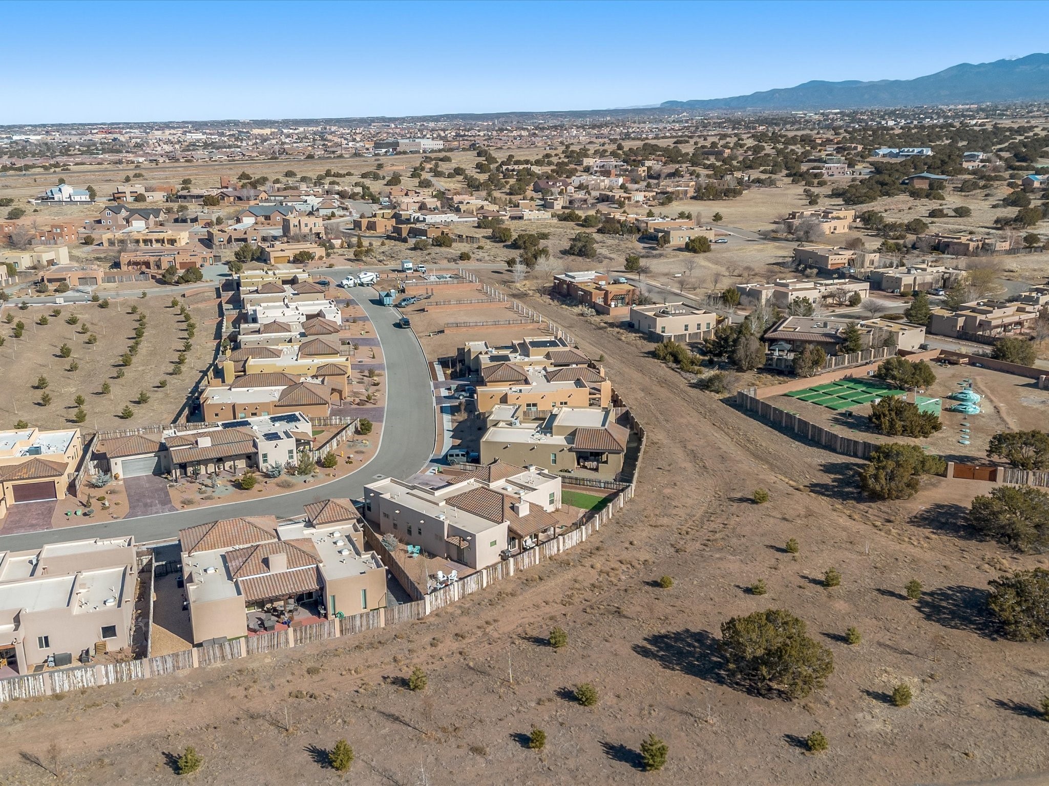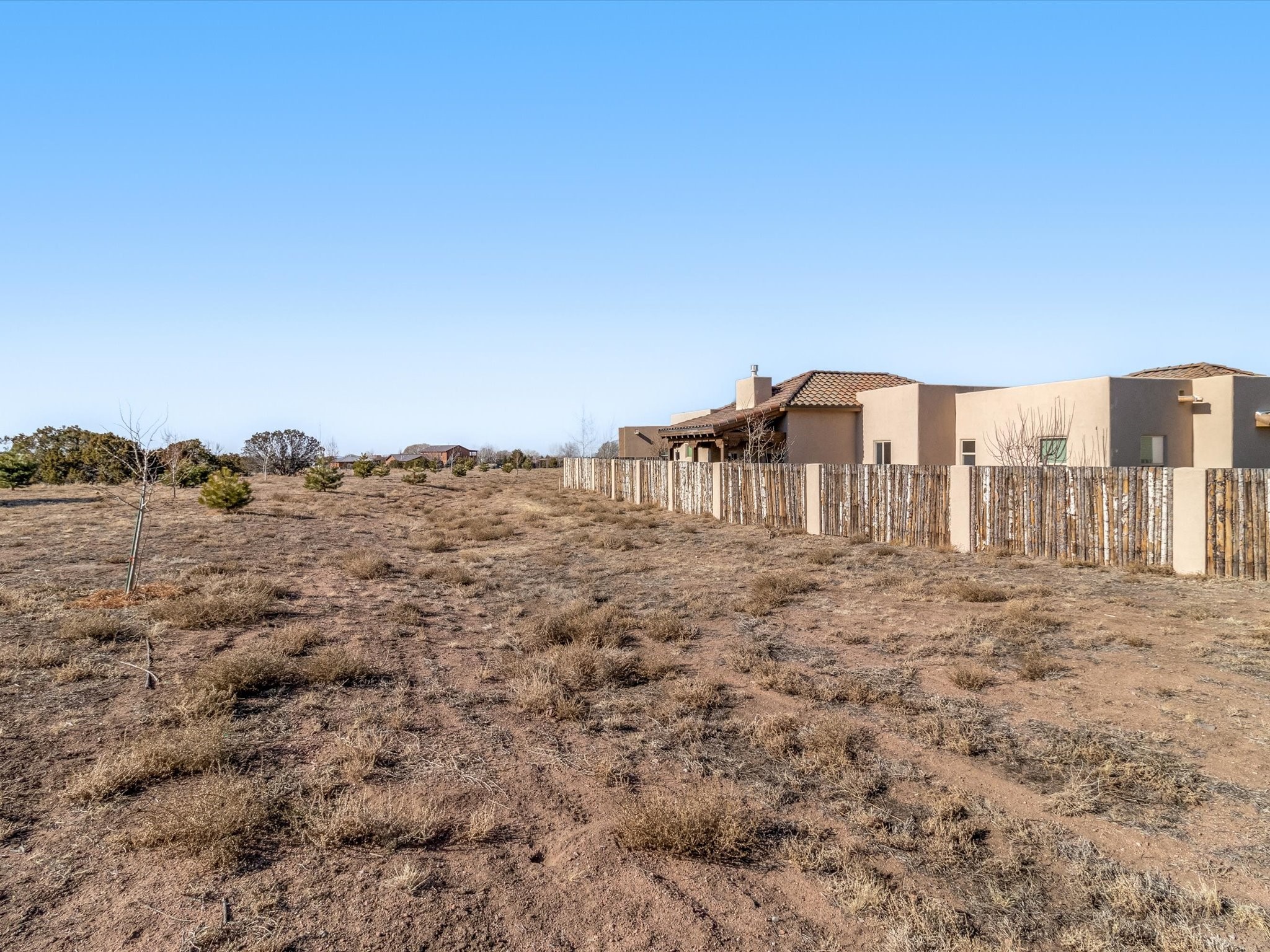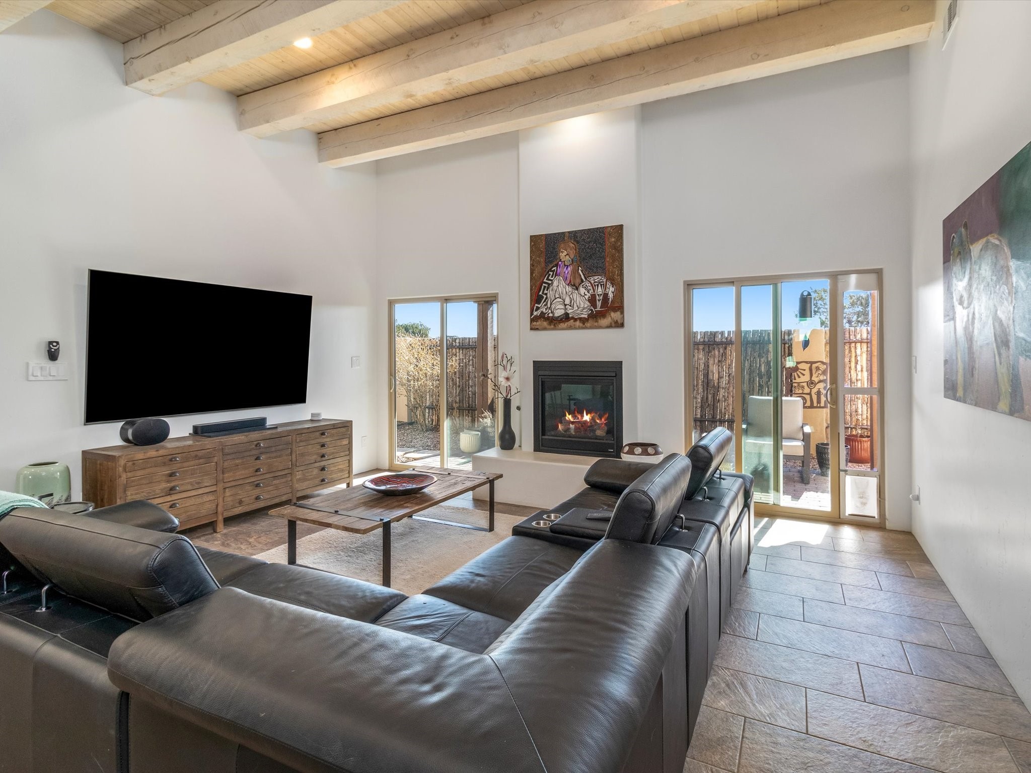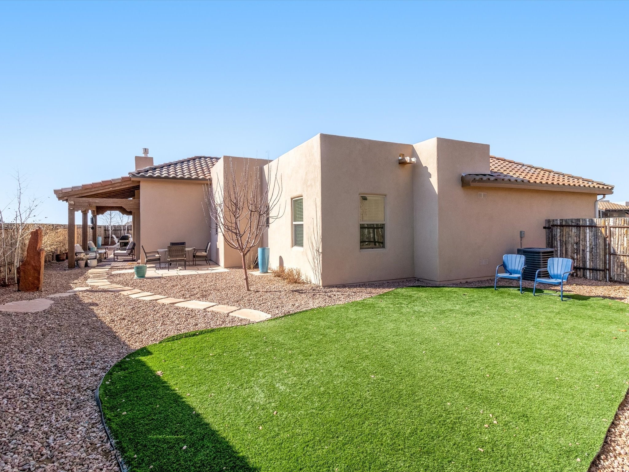 Nestled in the sought-after La Pradera Subdivision, this stunning Spanish-inspired home, built in 2021, has a total of 2,186 sqft. It has pitched Spanish design with clay-like roof and covered portals with rustic wood beams. It's brick pavers & colored driveway create a warm and inviting curb appeal. The rear of the property opens to a serene natural space and there are Walking trails surrounding the community.Step inside to an open-concept layout that seamlessly connects the dining area, kitchen, and living room--perfect for entertaining or relaxing with family. Custom interior lights in the foyer entrance set the tone for elegance, while the living room showcases white-stained beams with T&G planking and a cozy fireplace that adds warmth and character. The kitchen is a chef's dream, featuring a commercial-grade stove, stainless steel appliances, a breakfast island, and a window over the sink that fills the space with natural light. A gas line at the back patio for outdoor cooking adds efficiency and custom window treatments elevate the home's style and comfort. This home offers three spacious bedrooms, including an owner's suite, en-suite bathroom with an enclosed shower, a bath tub and dual sinks. A powder room is conveniently located near the entry. Additional features include a separate laundry room, an extra room ideal for an office, study or small studio, and an attached three-car finished garage equipped with electric vehicle charging capability. Experience the perfect balance of style and practicality in this exceptional La Pradera home. Its inviting interiors, picturesque surroundings, and thoughtful design make it a must-see for those seeking their dream home in Santa Fe.