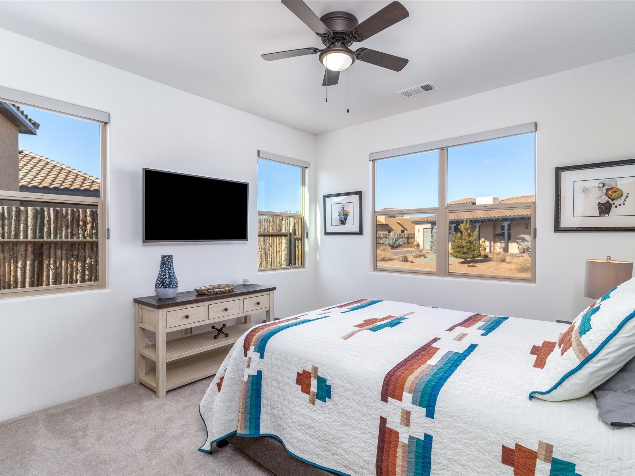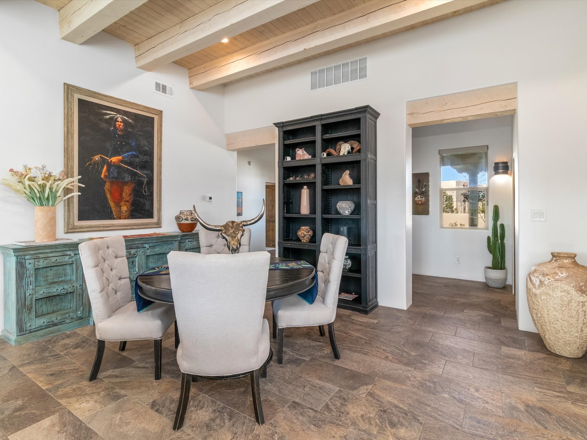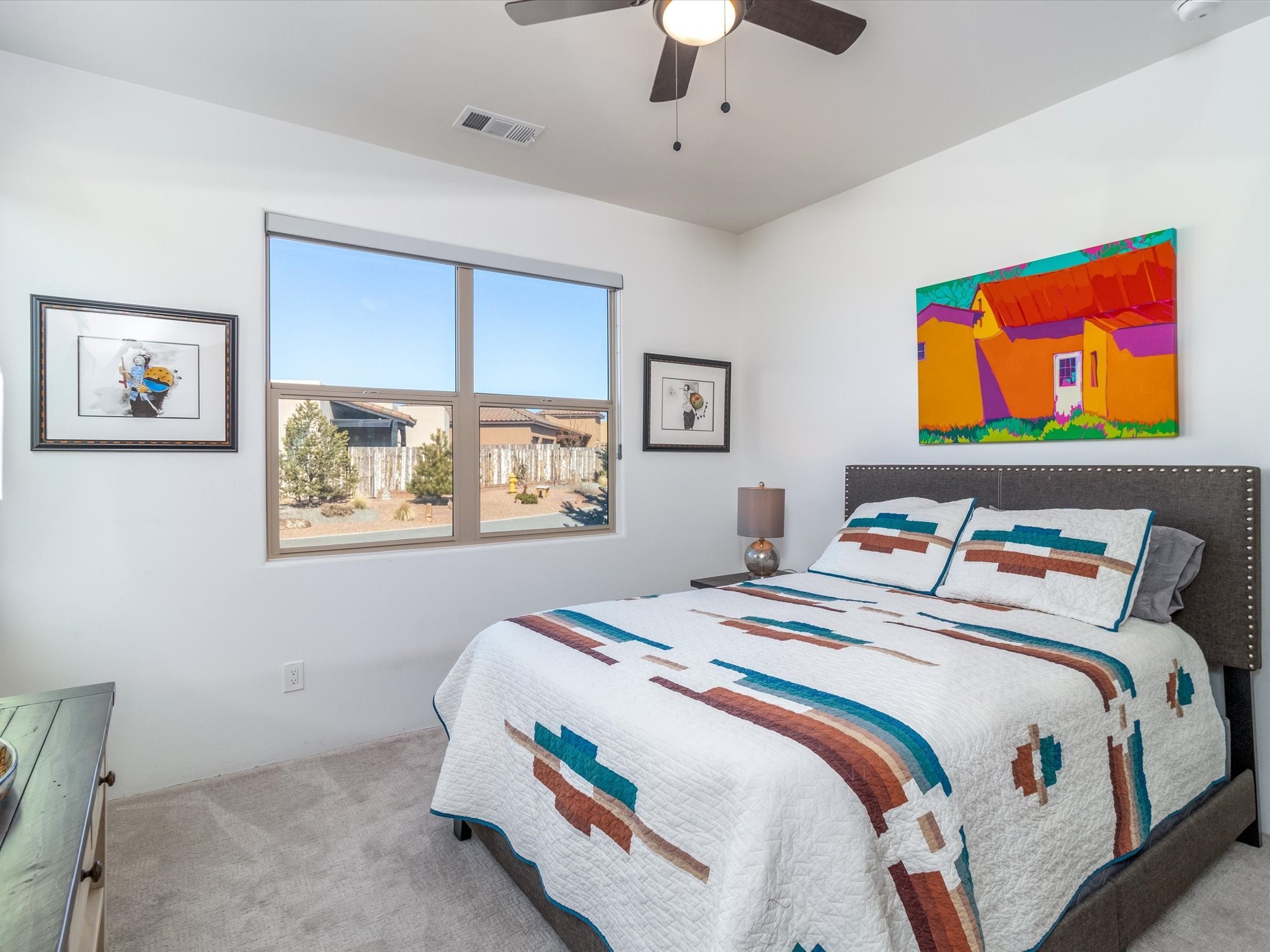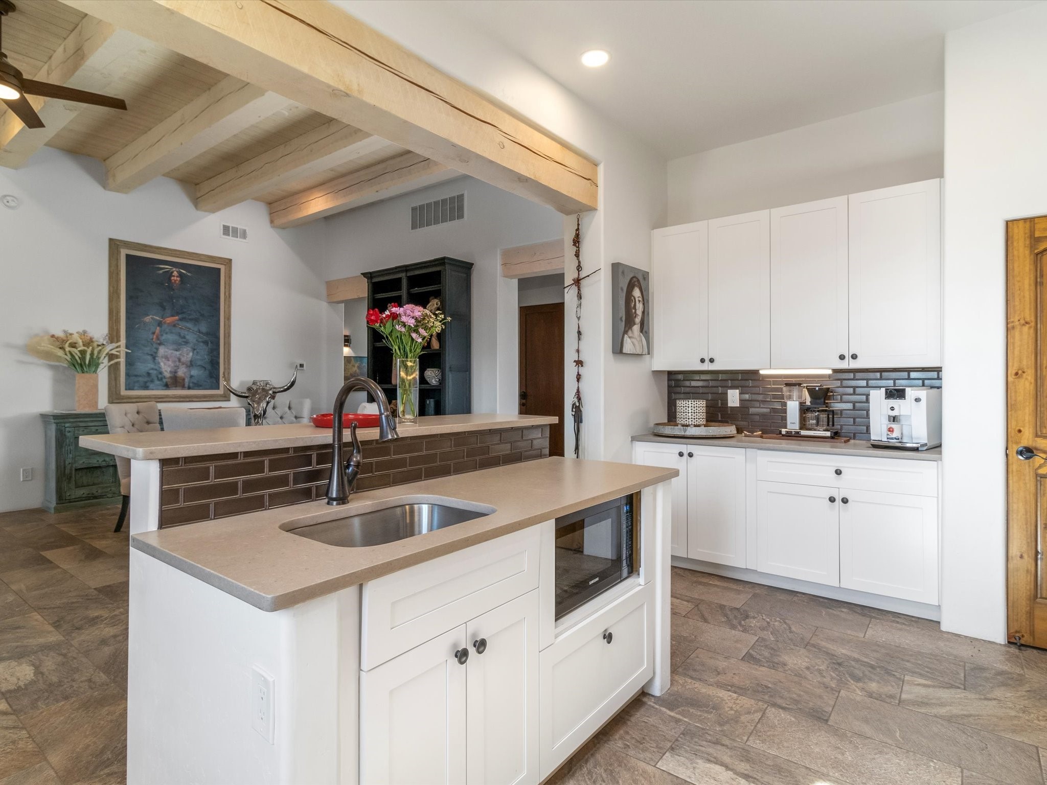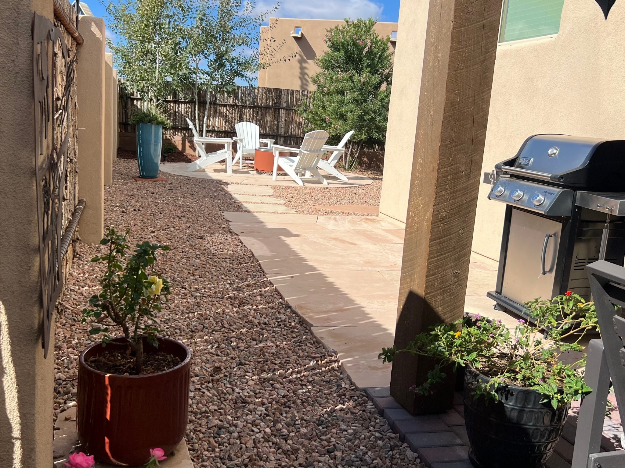 Nestled in the sought-after La Pradera Subdivision, this stunning Spanish-inspired home, built in 2021, has a total of 2,186 sqft. It has pitched Spanish design with clay-like roof and covered portals with rustic wood beams. It's brick pavers & colored driveway create a warm and inviting curb appeal. The rear of the property opens to a serene natural space and there are Walking trails surrounding the community.Step inside to an open-concept layout that seamlessly connects the dining area, kitchen, and living room--perfect for entertaining or relaxing with family. Custom interior lights in the foyer entrance set the tone for elegance, while the living room showcases white-stained beams with T&G planking and a cozy fireplace that adds warmth and character. The kitchen is a chef's dream, featuring a commercial-grade stove, stainless steel appliances, a breakfast island, and a window over the sink that fills the space with natural light. A gas line at the back patio for outdoor cooking adds efficiency and custom window treatments elevate the home's style and comfort. This home offers three spacious bedrooms, including an owner's suite, en-suite bathroom with an enclosed shower, a bath tub and dual sinks. A powder room is conveniently located near the entry. Additional features include a separate laundry room, an extra room ideal for an office, study or small studio, and an attached three-car finished garage equipped with electric vehicle charging capability. Experience the perfect balance of style and practicality in this exceptional La Pradera home. Its inviting interiors, picturesque surroundings, and thoughtful design make it a must-see for those seeking their dream home in Santa Fe.
