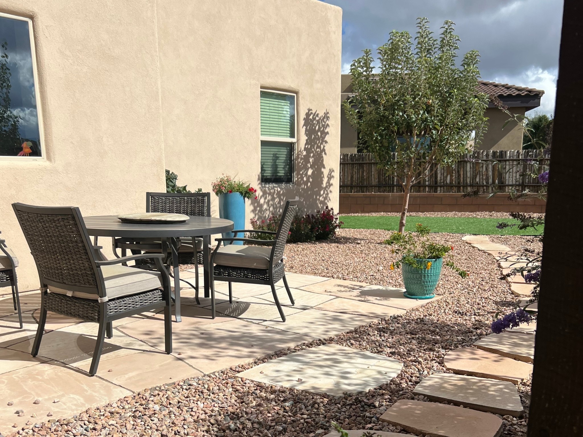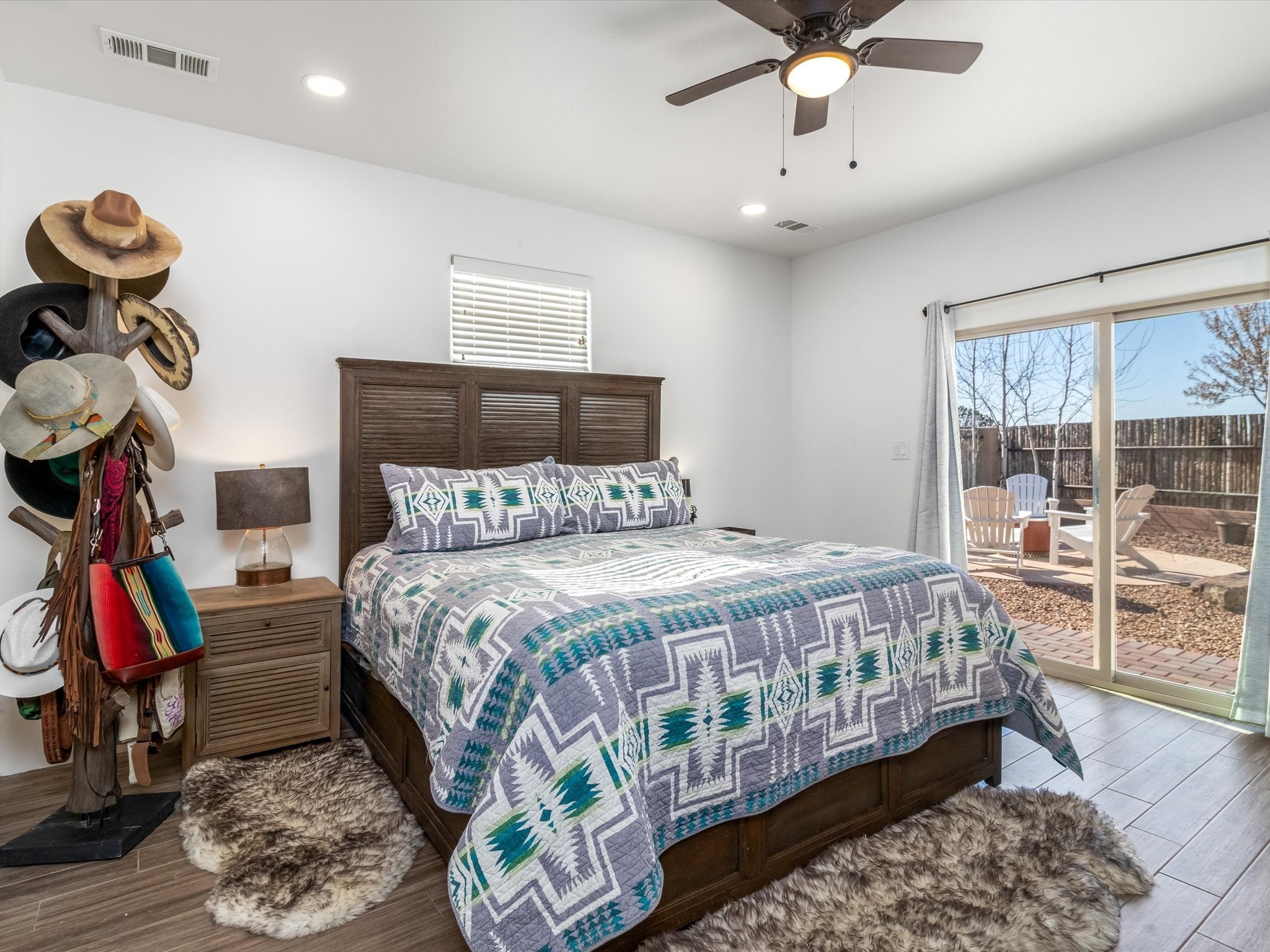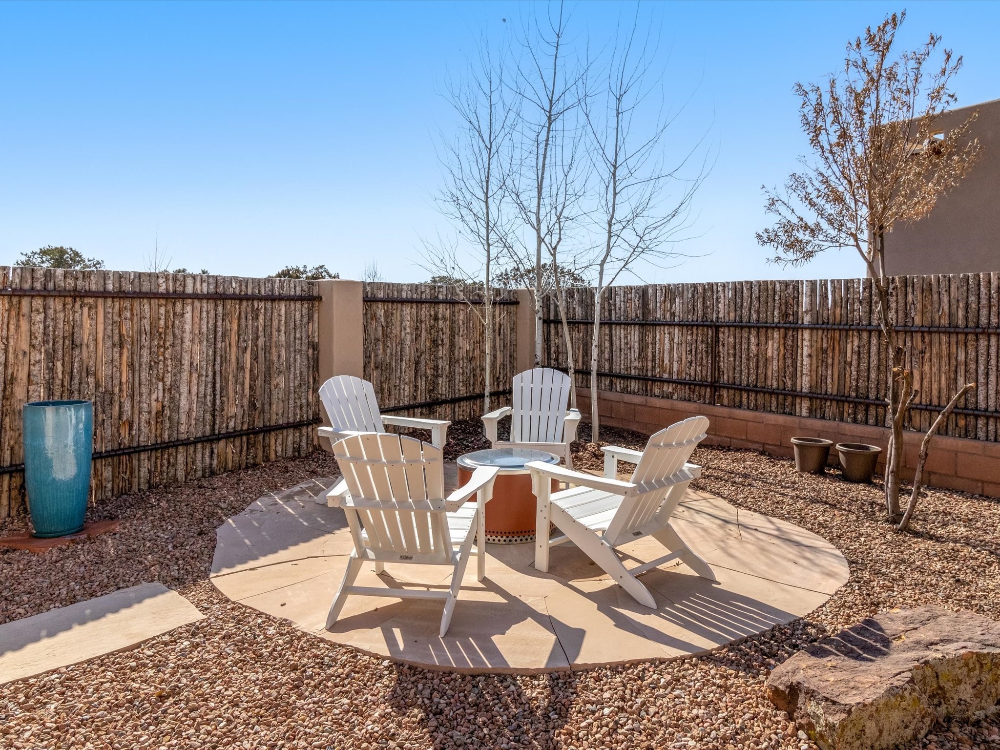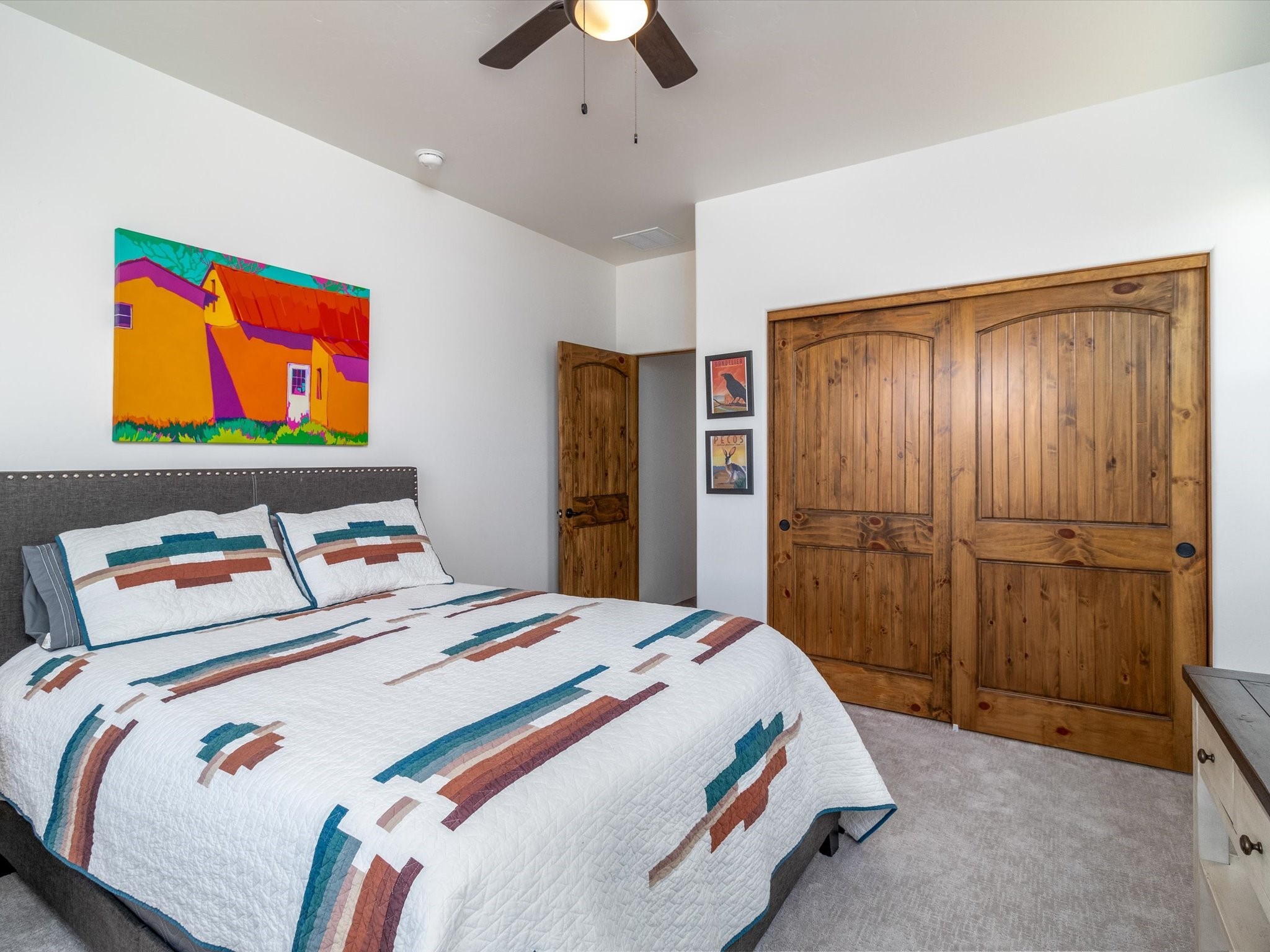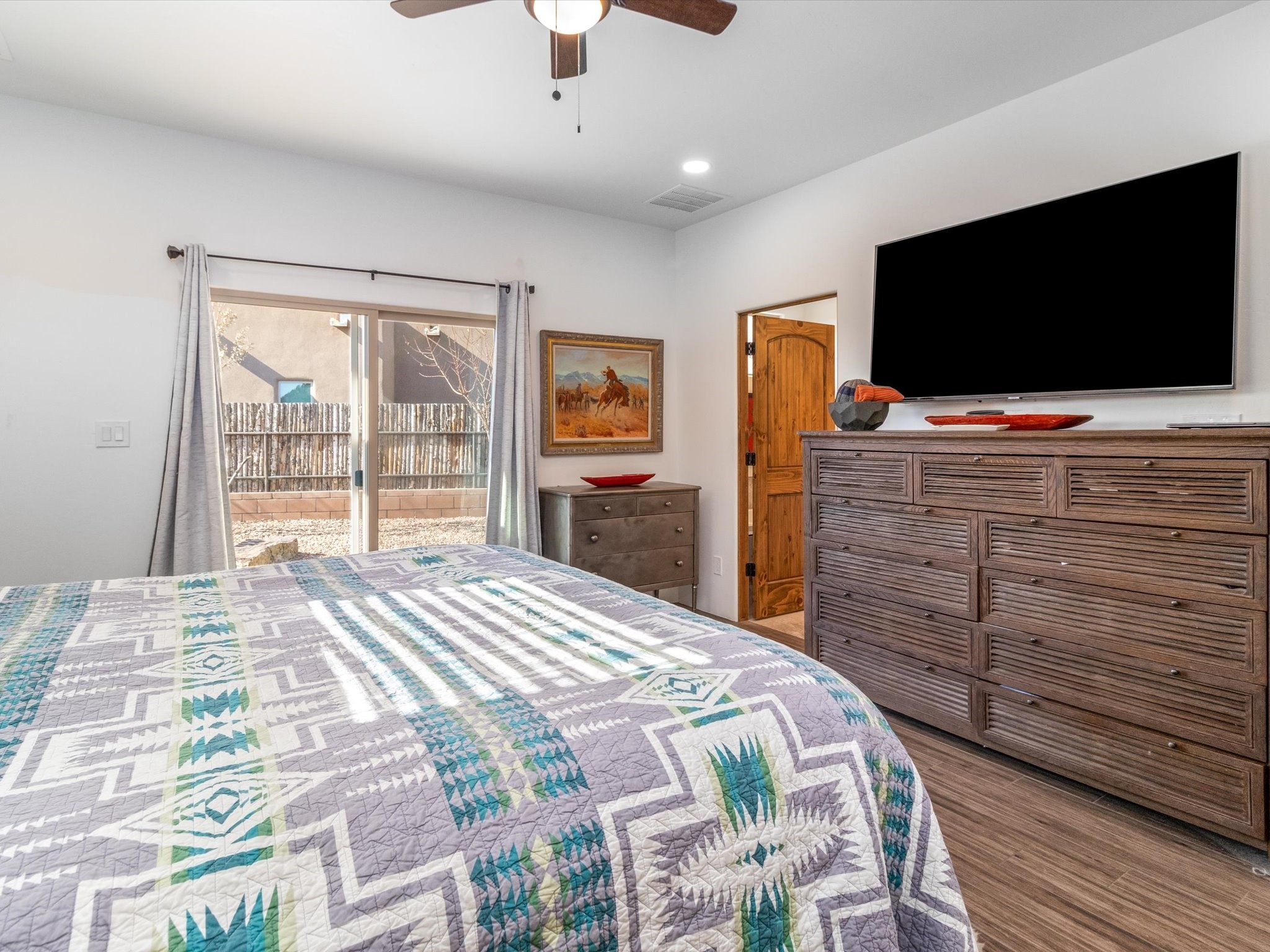 Nestled in the sought-after La Pradera Subdivision, this stunning Spanish-inspired home, built in 2021, has a total of 2,186 sqft. It has pitched Spanish design with clay-like roof and covered portals with rustic wood beams. It's brick pavers & colored driveway create a warm and inviting curb appeal. The rear of the property opens to a serene natural space and there are Walking trails surrounding the community.Step inside to an open-concept layout that seamlessly connects the dining area, kitchen, and living room--perfect for entertaining or relaxing with family. Custom interior lights in the foyer entrance set the tone for elegance, while the living room showcases white-stained beams with T&G planking and a cozy fireplace that adds warmth and character. The kitchen is a chef's dream, featuring a commercial-grade stove, stainless steel appliances, a breakfast island, and a window over the sink that fills the space with natural light. A gas line at the back patio for outdoor cooking adds efficiency and custom window treatments elevate the home's style and comfort. This home offers three spacious bedrooms, including an owner's suite, en-suite bathroom with an enclosed shower, a bath tub and dual sinks. A powder room is conveniently located near the entry. Additional features include a separate laundry room, an extra room ideal for an office, study or small studio, and an attached three-car finished garage equipped with electric vehicle charging capability. Experience the perfect balance of style and practicality in this exceptional La Pradera home. Its inviting interiors, picturesque surroundings, and thoughtful design make it a must-see for those seeking their dream home in Santa Fe.
