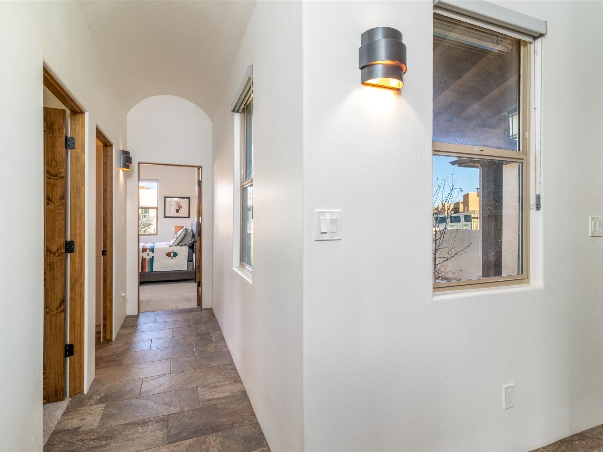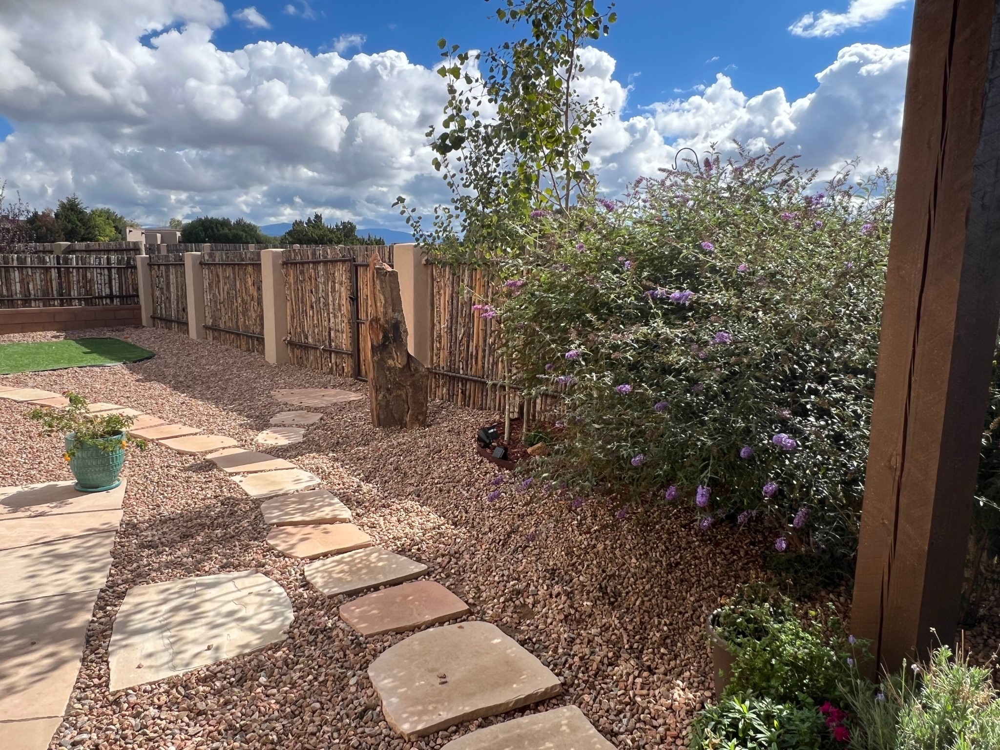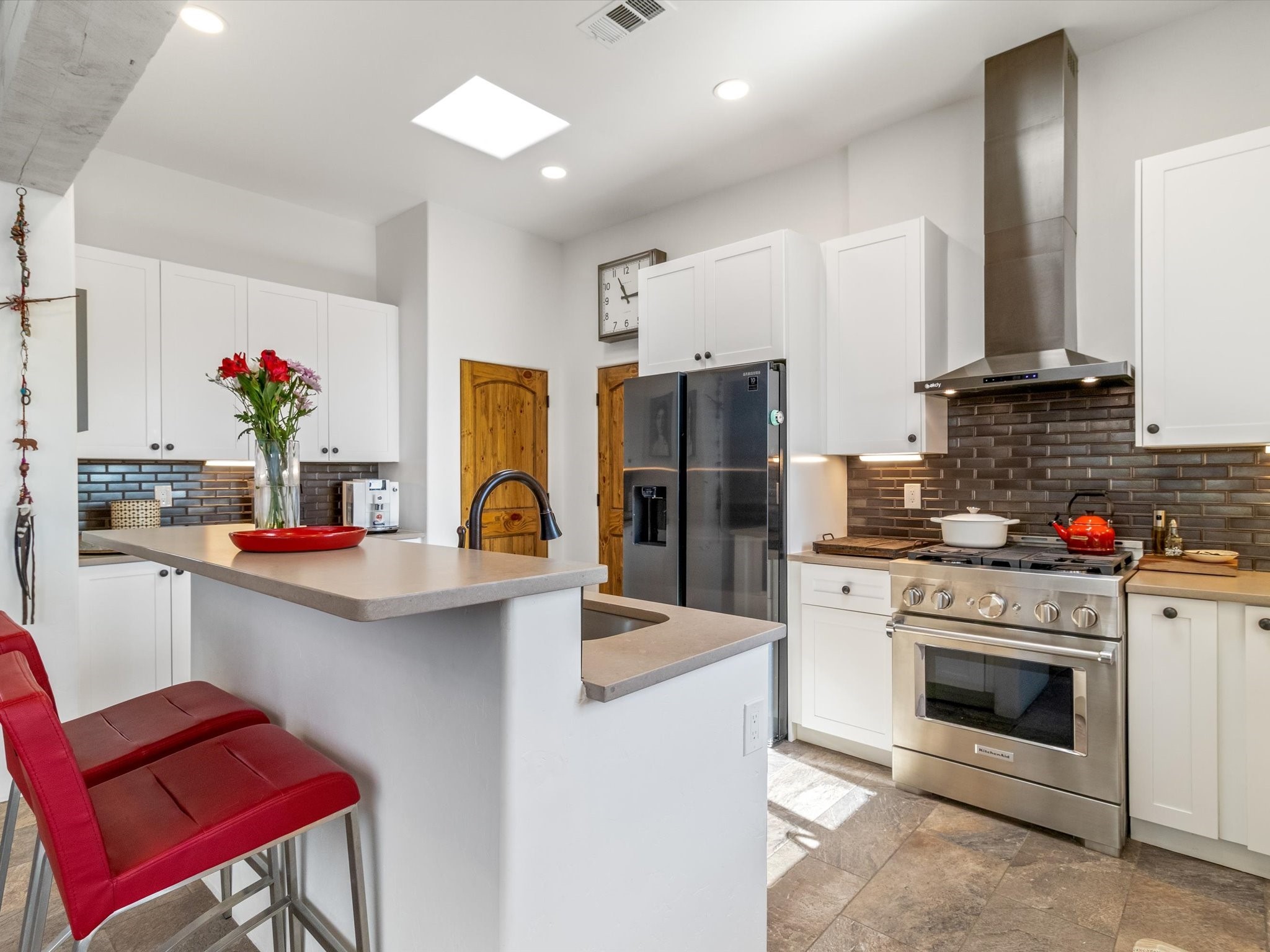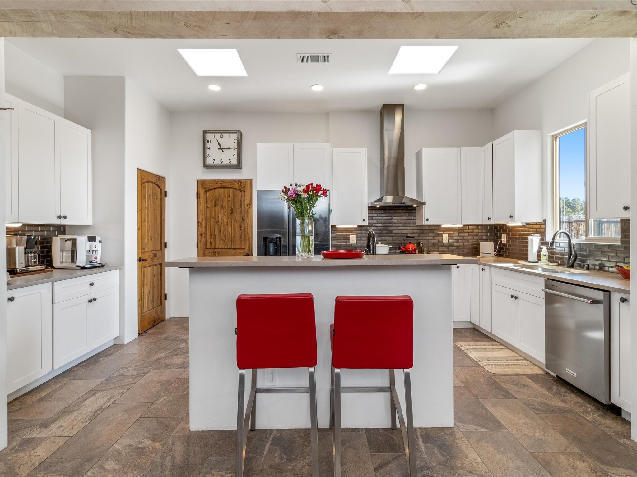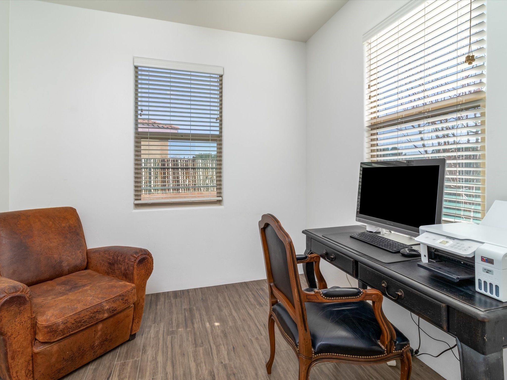 Nestled in the sought-after La Pradera Subdivision, this stunning Spanish-inspired home, built in 2021, has a total of 2,186 sqft. It has pitched Spanish design with clay-like roof and covered portals with rustic wood beams. It's brick pavers & colored driveway create a warm and inviting curb appeal. The rear of the property opens to a serene natural space and there are Walking trails surrounding the community.Step inside to an open-concept layout that seamlessly connects the dining area, kitchen, and living room--perfect for entertaining or relaxing with family. Custom interior lights in the foyer entrance set the tone for elegance, while the living room showcases white-stained beams with T&G planking and a cozy fireplace that adds warmth and character. The kitchen is a chef's dream, featuring a commercial-grade stove, stainless steel appliances, a breakfast island, and a window over the sink that fills the space with natural light. A gas line at the back patio for outdoor cooking adds efficiency and custom window treatments elevate the home's style and comfort. This home offers three spacious bedrooms, including an owner's suite, en-suite bathroom with an enclosed shower, a bath tub and dual sinks. A powder room is conveniently located near the entry. Additional features include a separate laundry room, an extra room ideal for an office, study or small studio, and an attached three-car finished garage equipped with electric vehicle charging capability. Experience the perfect balance of style and practicality in this exceptional La Pradera home. Its inviting interiors, picturesque surroundings, and thoughtful design make it a must-see for those seeking their dream home in Santa Fe.