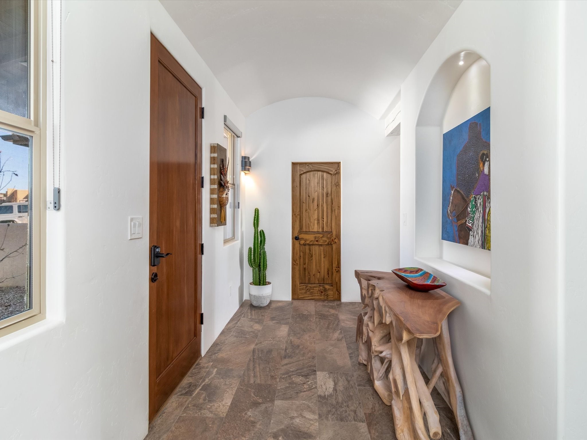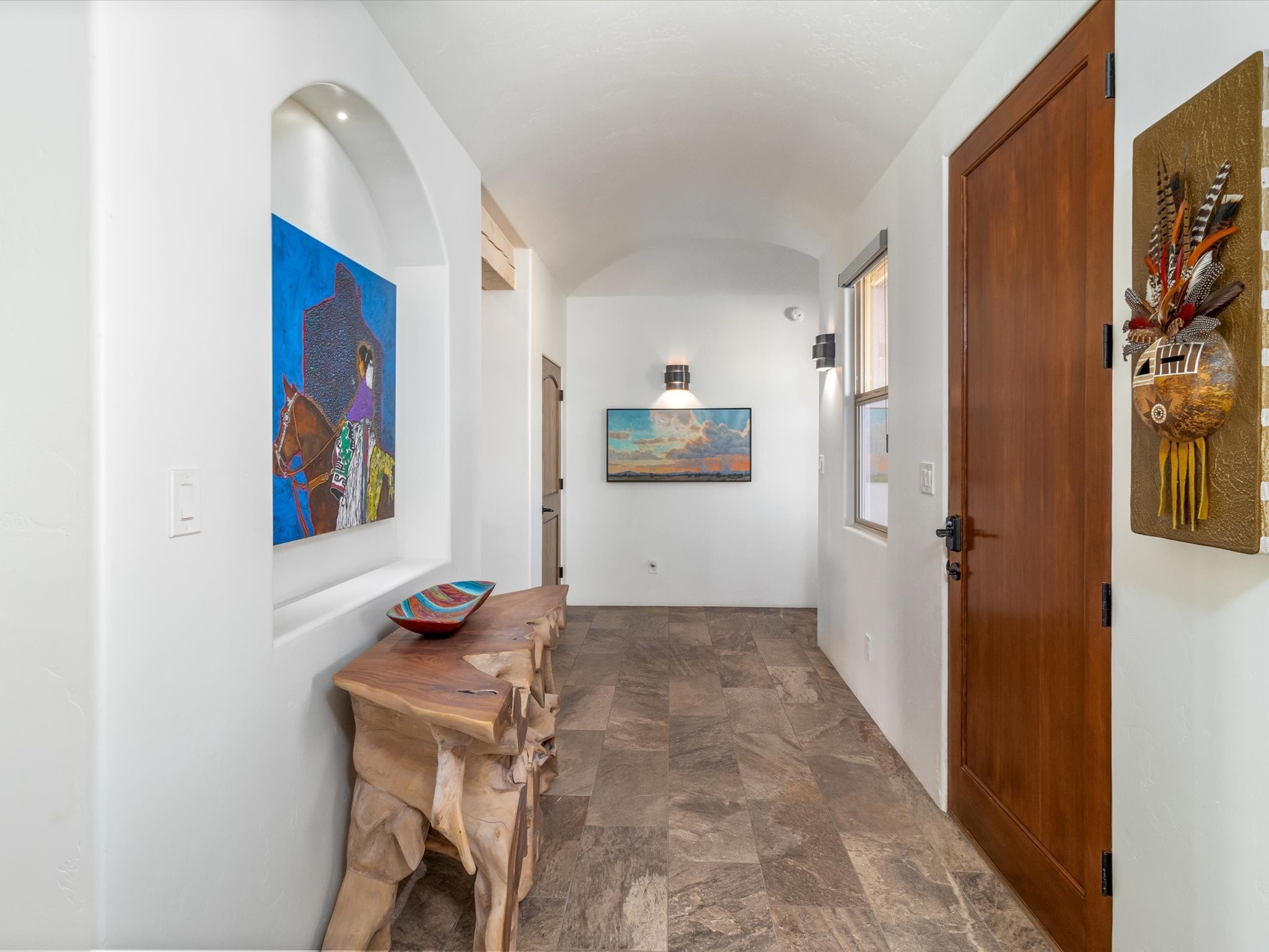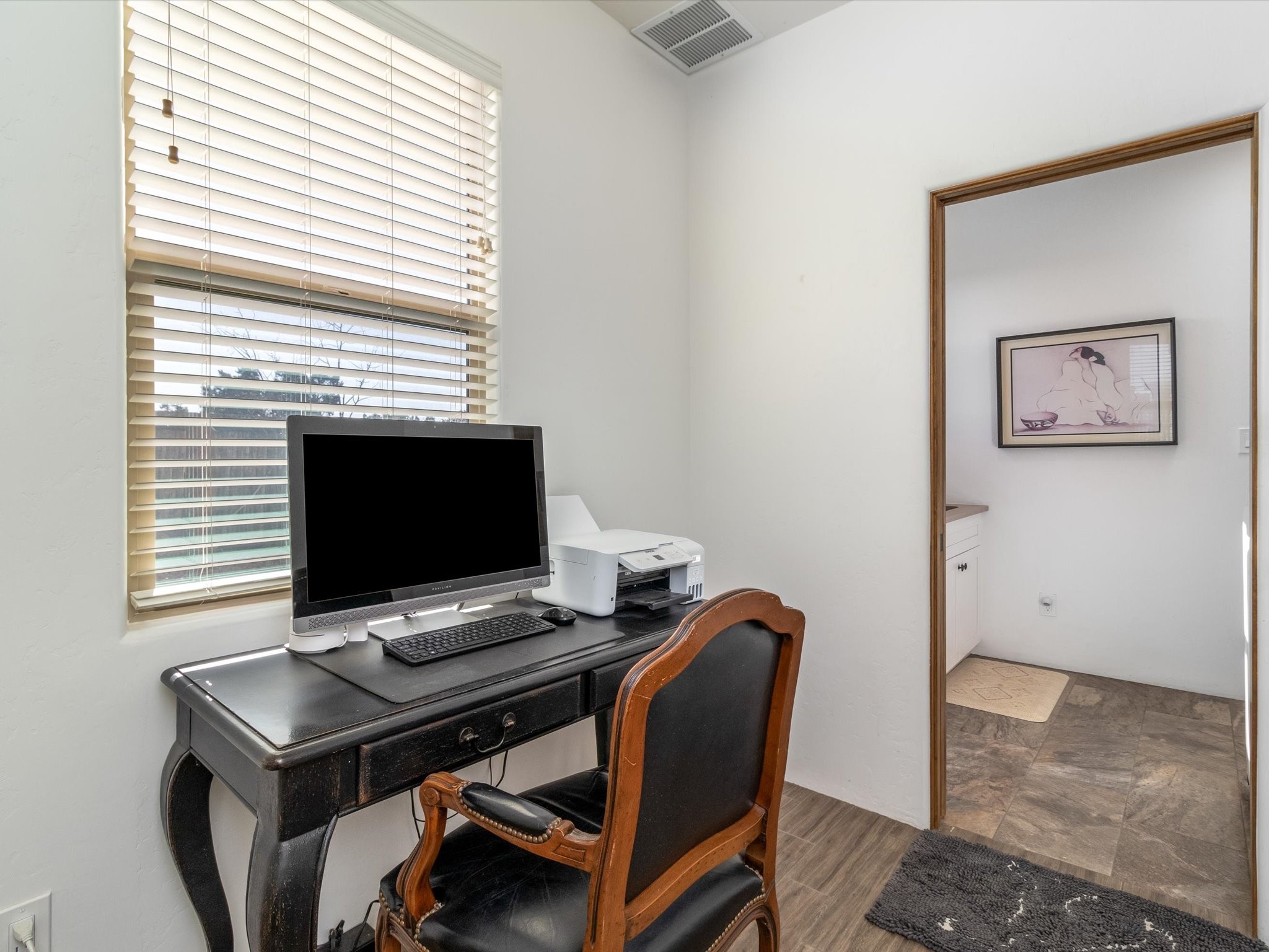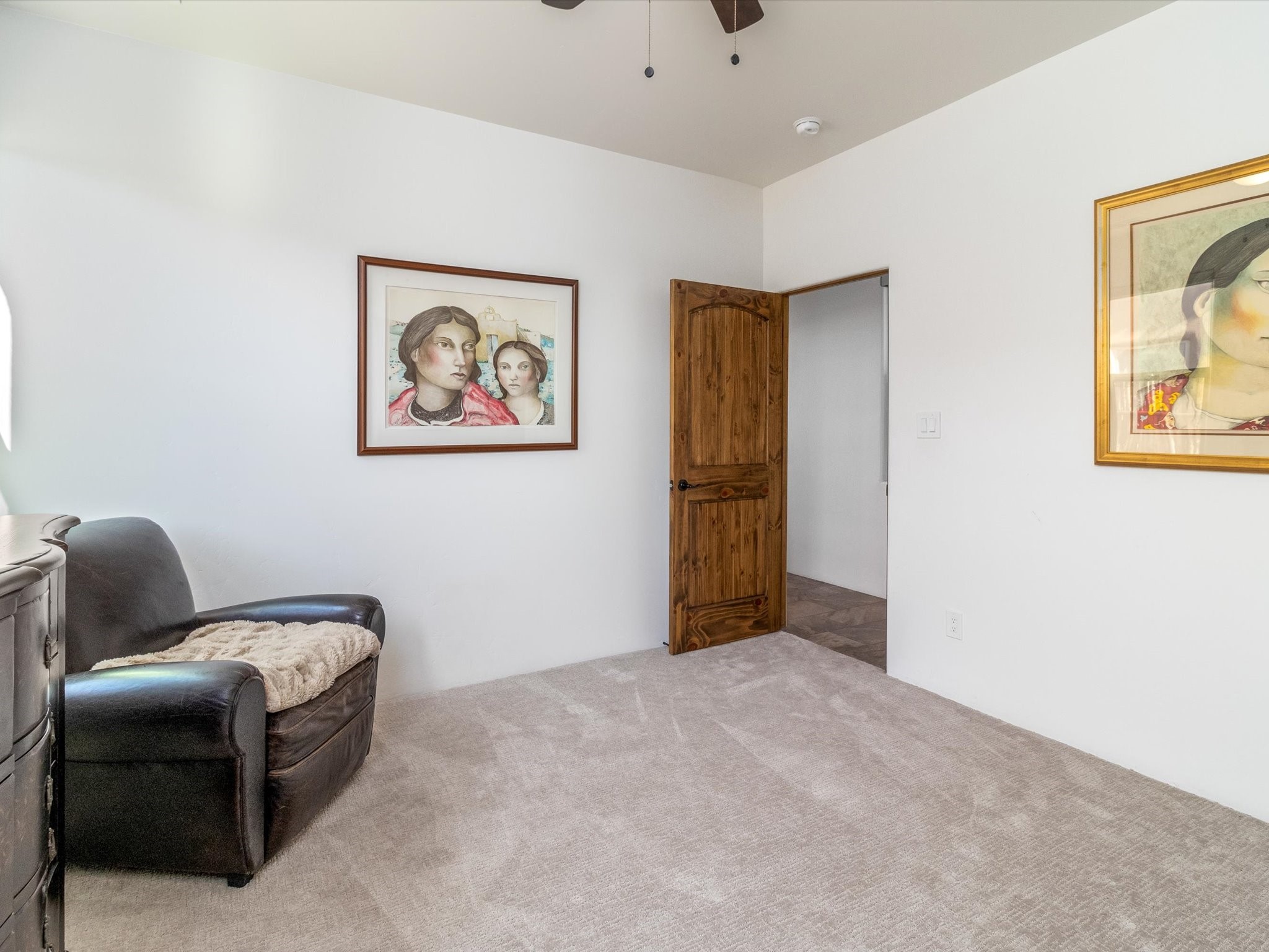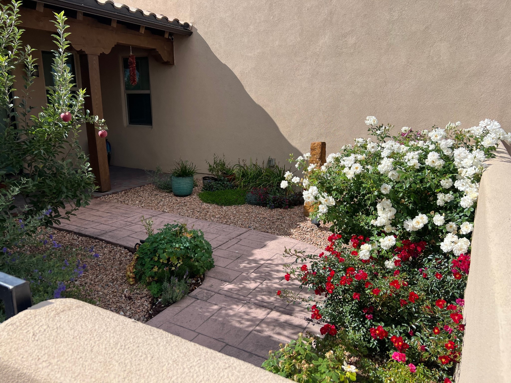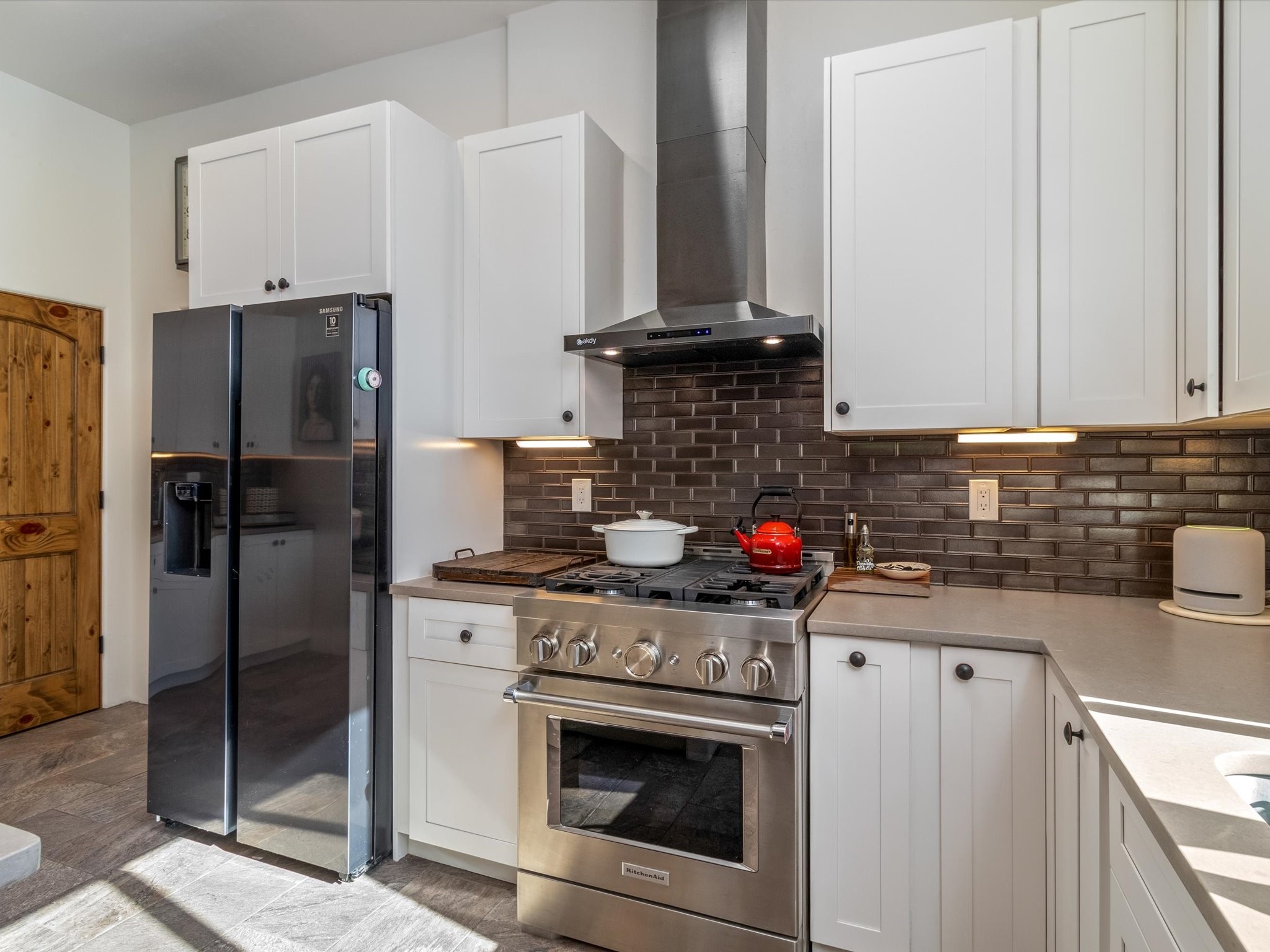 Nestled in the sought-after La Pradera Subdivision, this stunning Spanish-inspired home, built in 2021, has a total of 2,186 sqft. It has pitched Spanish design with clay-like roof and covered portals with rustic wood beams. It's brick pavers & colored driveway create a warm and inviting curb appeal. The rear of the property opens to a serene natural space and there are Walking trails surrounding the community.Step inside to an open-concept layout that seamlessly connects the dining area, kitchen, and living room--perfect for entertaining or relaxing with family. Custom interior lights in the foyer entrance set the tone for elegance, while the living room showcases white-stained beams with T&G planking and a cozy fireplace that adds warmth and character. The kitchen is a chef's dream, featuring a commercial-grade stove, stainless steel appliances, a breakfast island, and a window over the sink that fills the space with natural light. A gas line at the back patio for outdoor cooking adds efficiency and custom window treatments elevate the home's style and comfort. This home offers three spacious bedrooms, including an owner's suite, en-suite bathroom with an enclosed shower, a bath tub and dual sinks. A powder room is conveniently located near the entry. Additional features include a separate laundry room, an extra room ideal for an office, study or small studio, and an attached three-car finished garage equipped with electric vehicle charging capability. Experience the perfect balance of style and practicality in this exceptional La Pradera home. Its inviting interiors, picturesque surroundings, and thoughtful design make it a must-see for those seeking their dream home in Santa Fe.