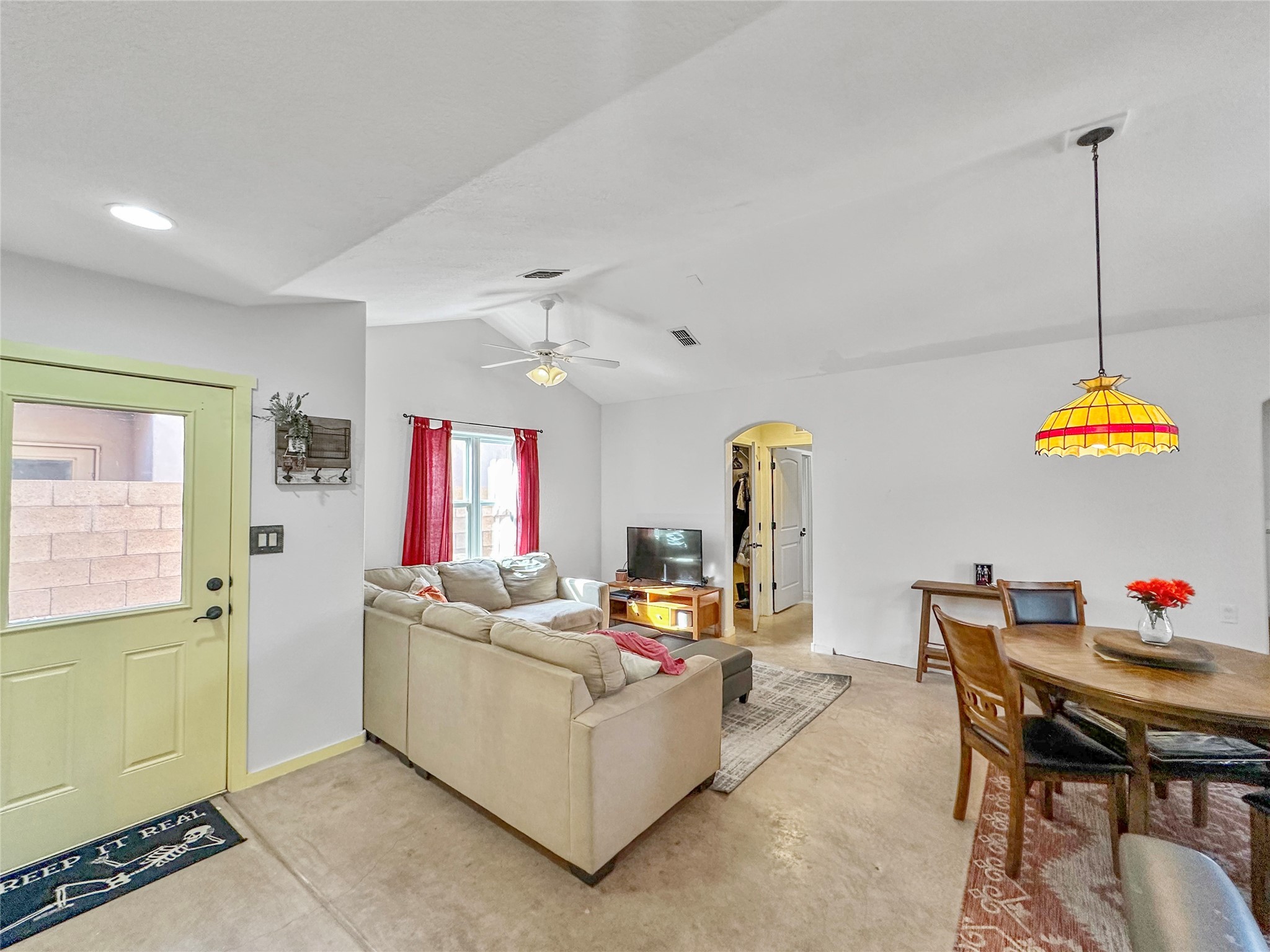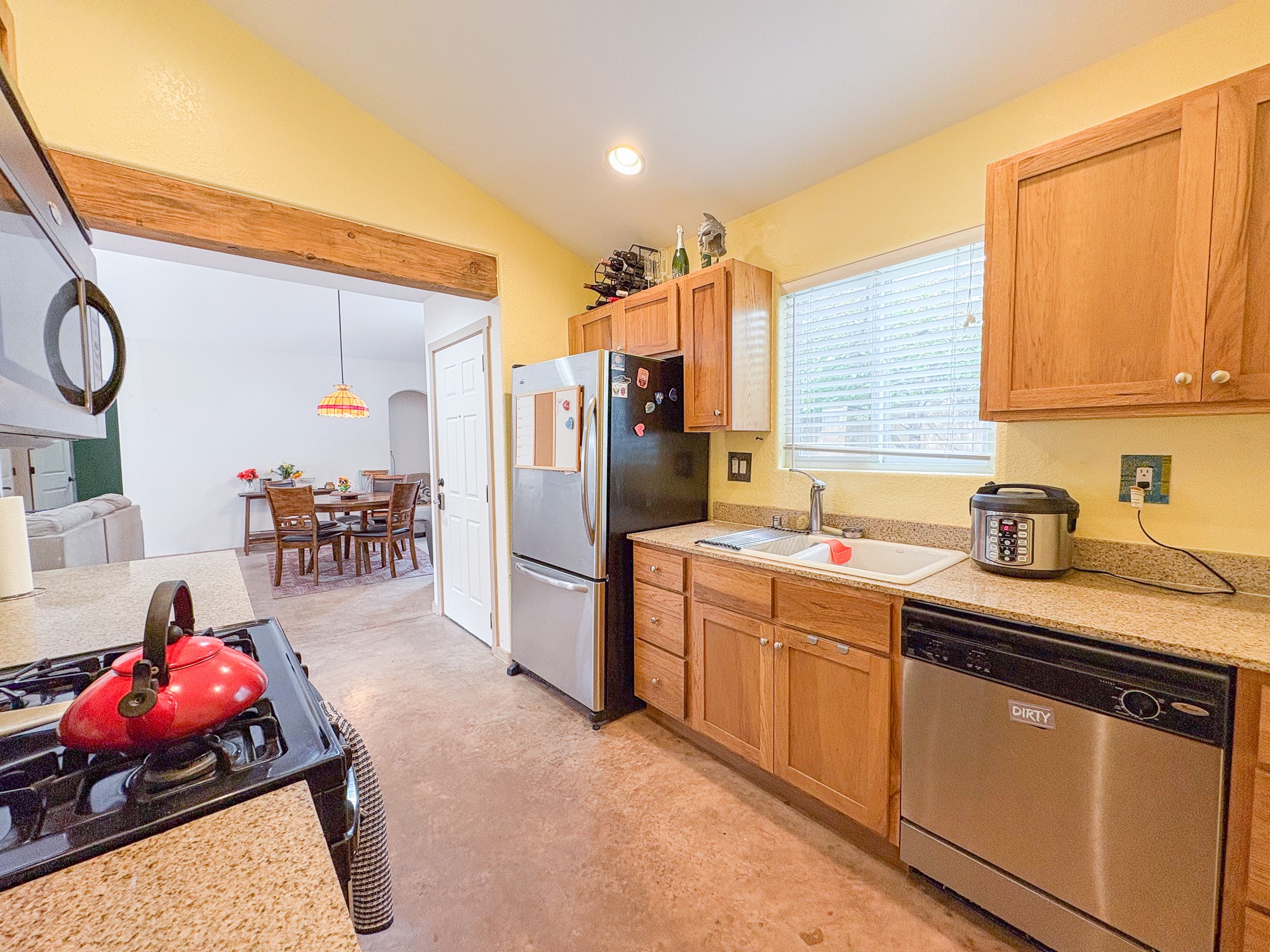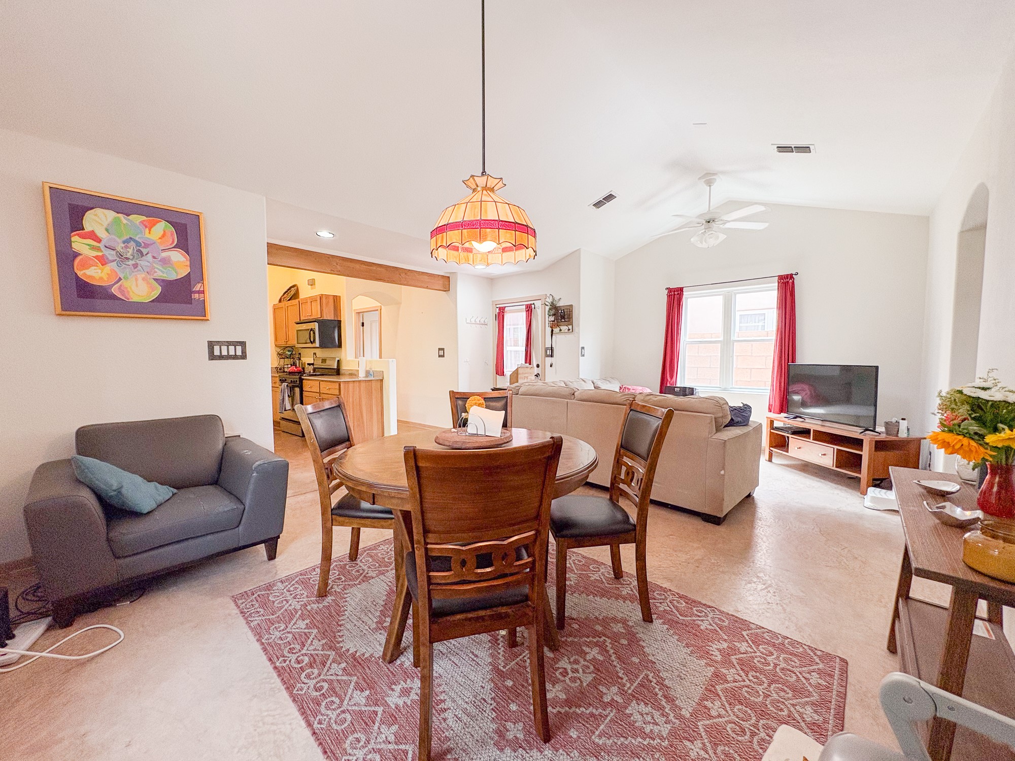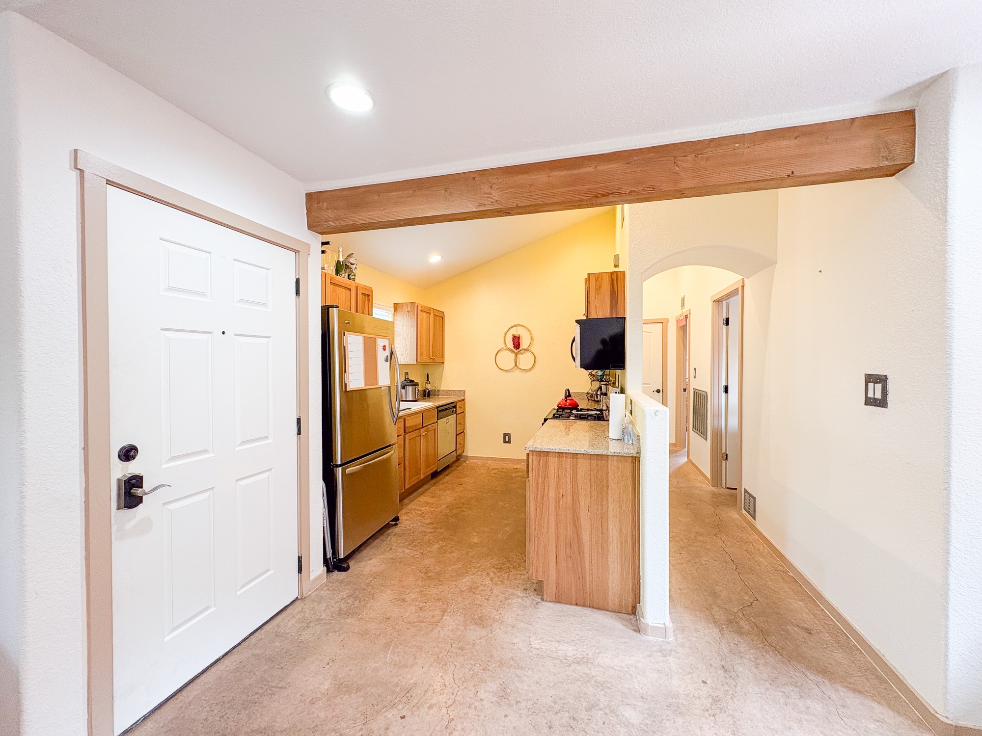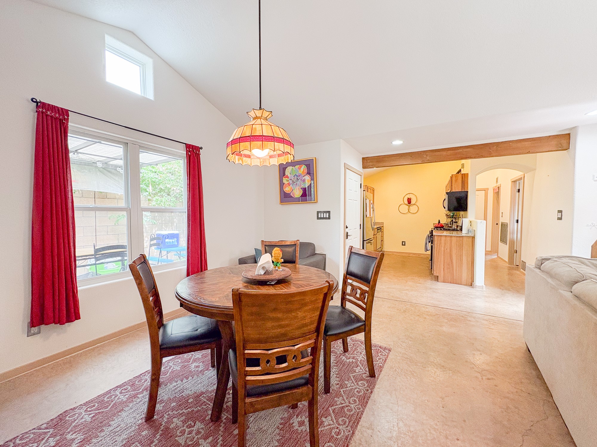 This home boasts coziness with a perfect layout, and amazing outdoor living space. 3 bedrooms that are perfectly situated, to give separation from Primary suite and the two spacious guest bedrooms. Open kitchen and living area make it an ease for entertaining. Concrete floors throughout make cleaning a breeze. This adorable home combines affordability with comfort and ease of turn key readiness. Welcome home!
