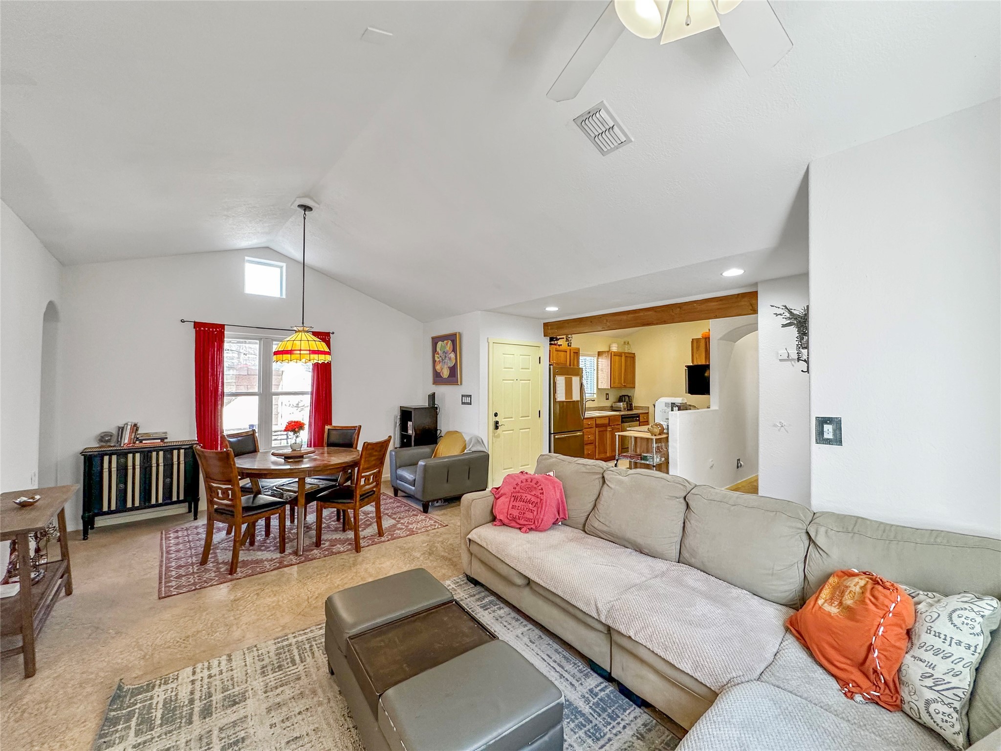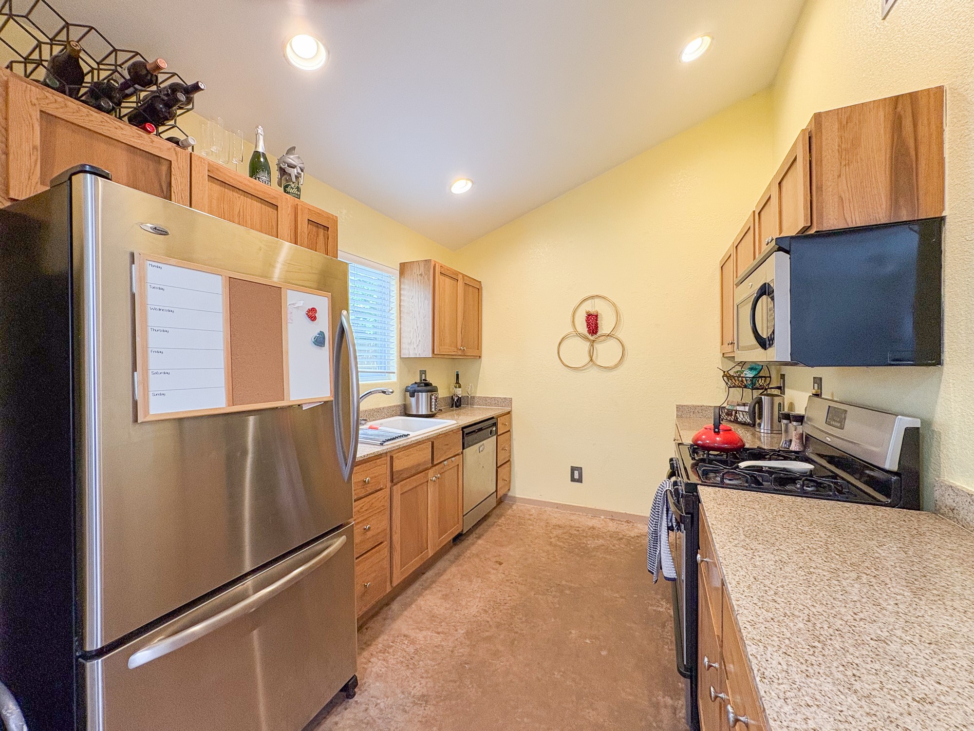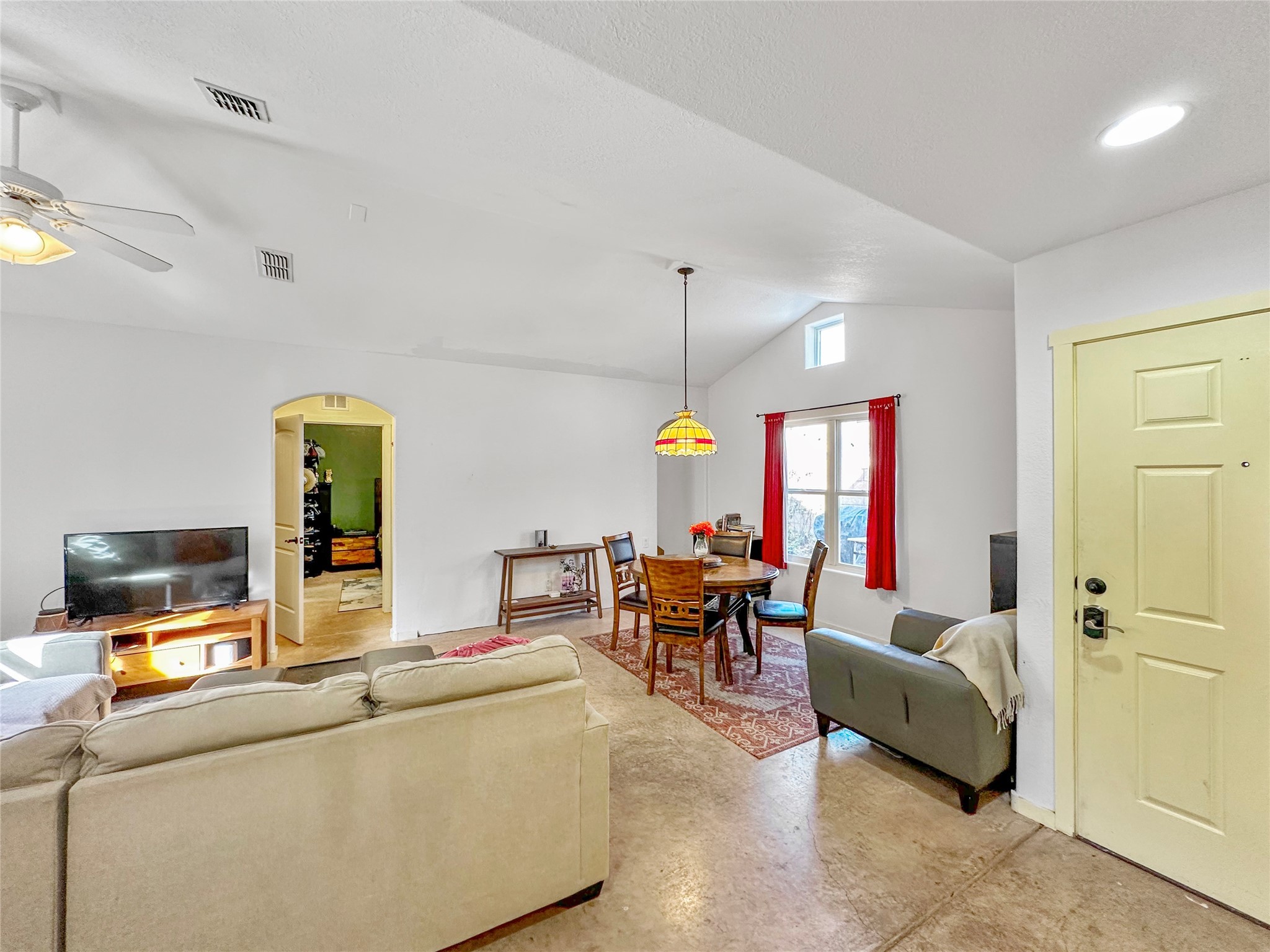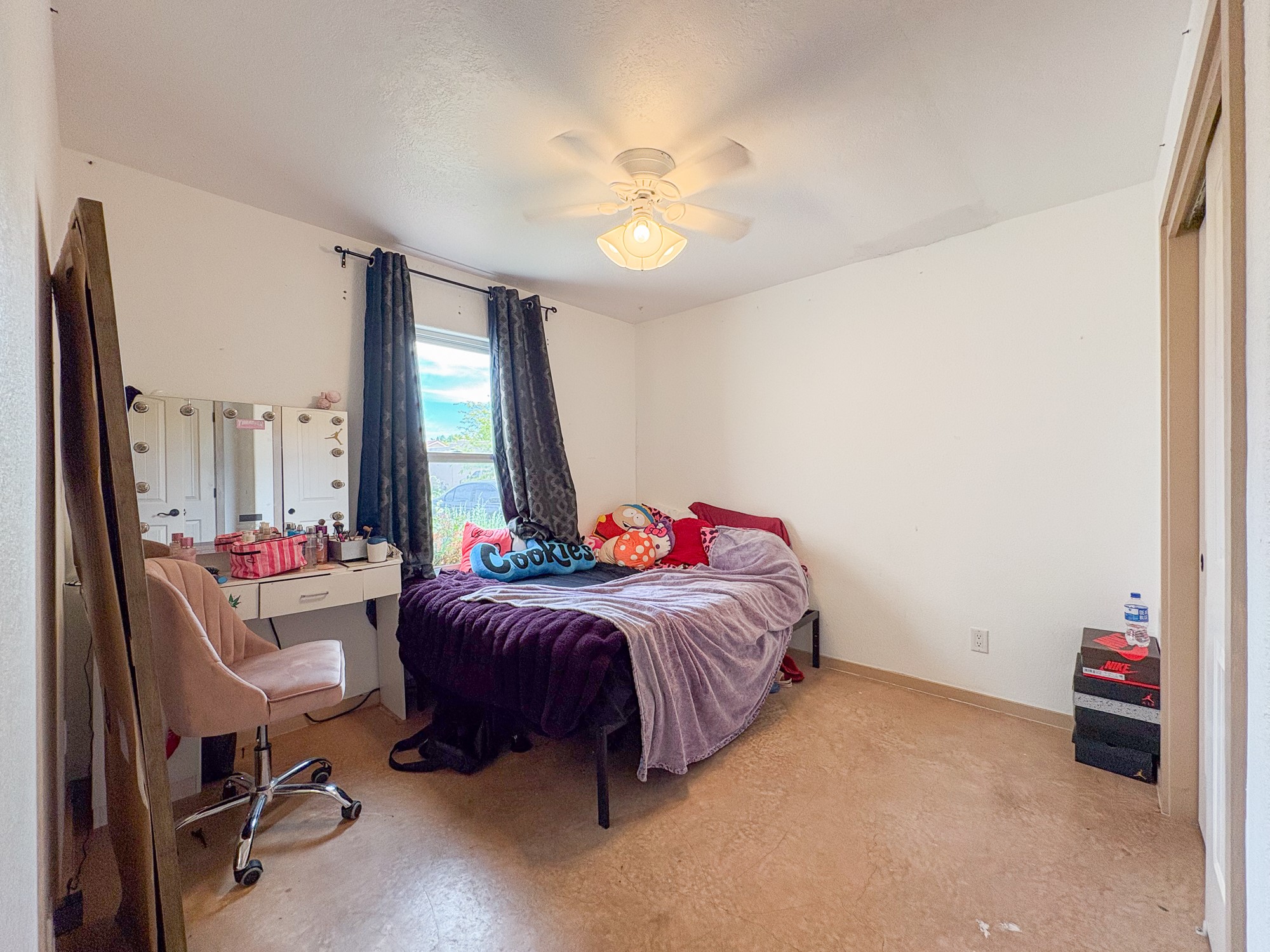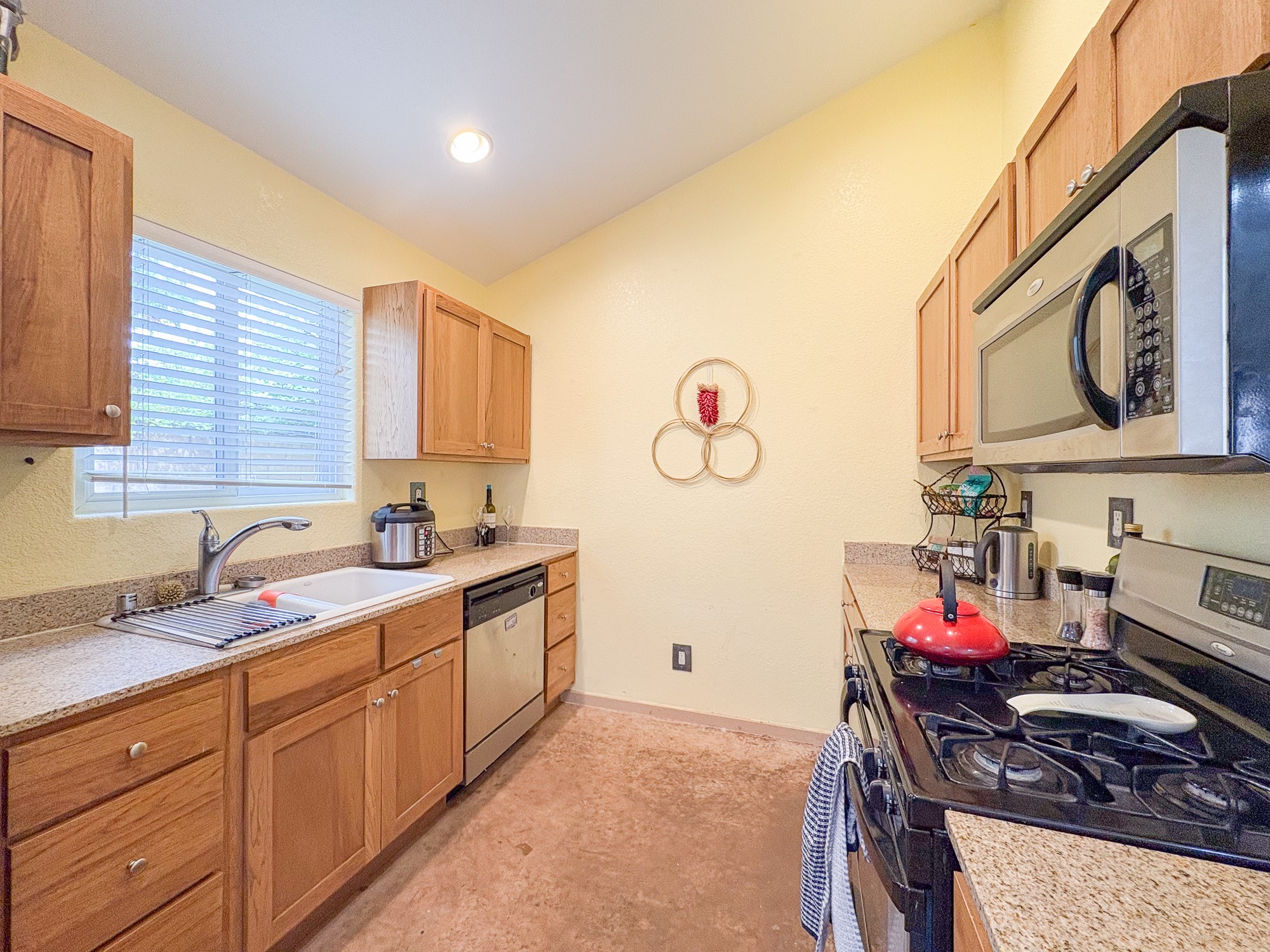 This home boasts coziness with a perfect layout, and amazing outdoor living space. 3 bedrooms that are perfectly situated, to give separation from Primary suite and the two spacious guest bedrooms. Open kitchen and living area make it an ease for entertaining. Concrete floors throughout make cleaning a breeze. This adorable home combines affordability with comfort and ease of turn key readiness. Welcome home!