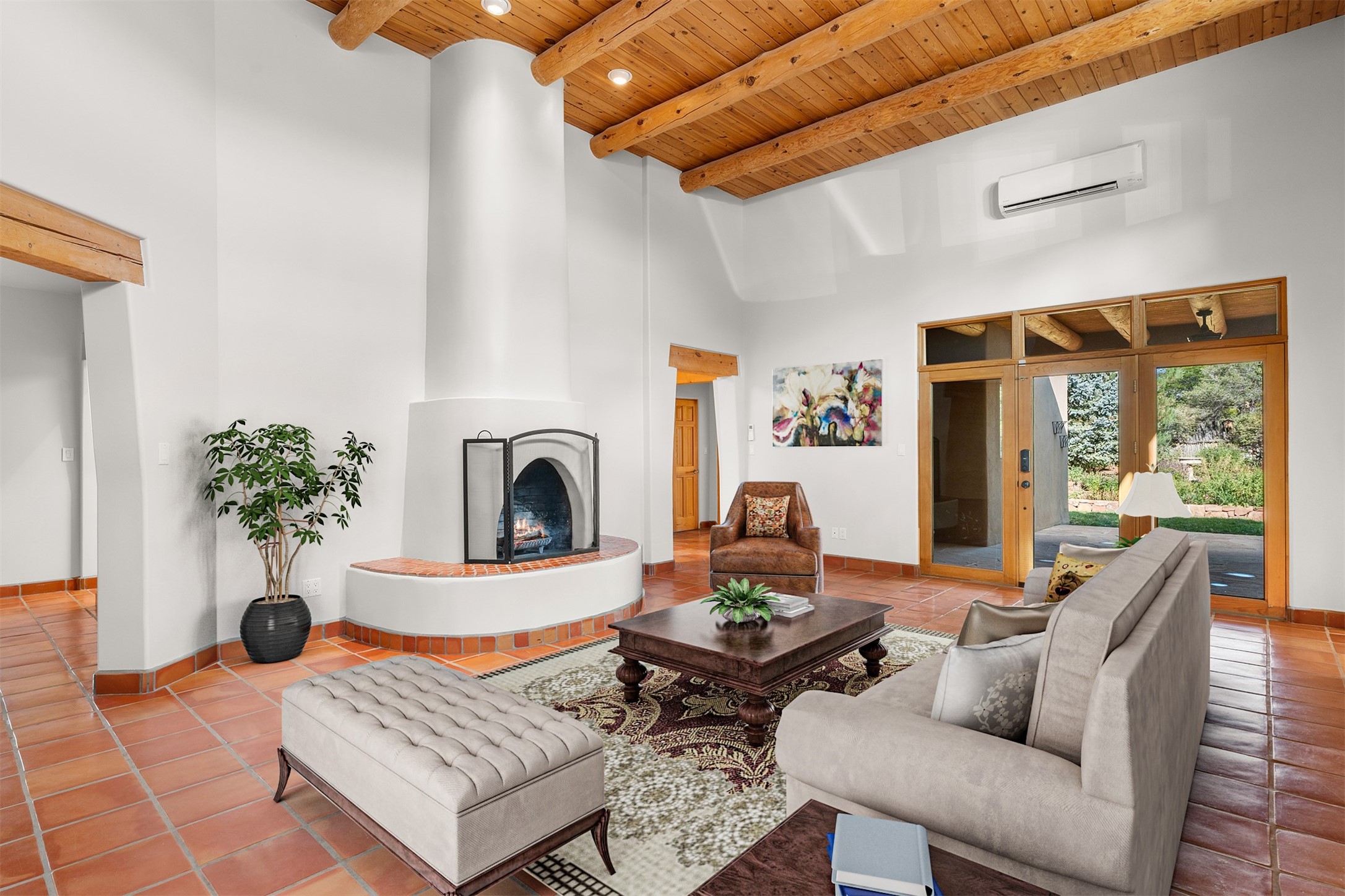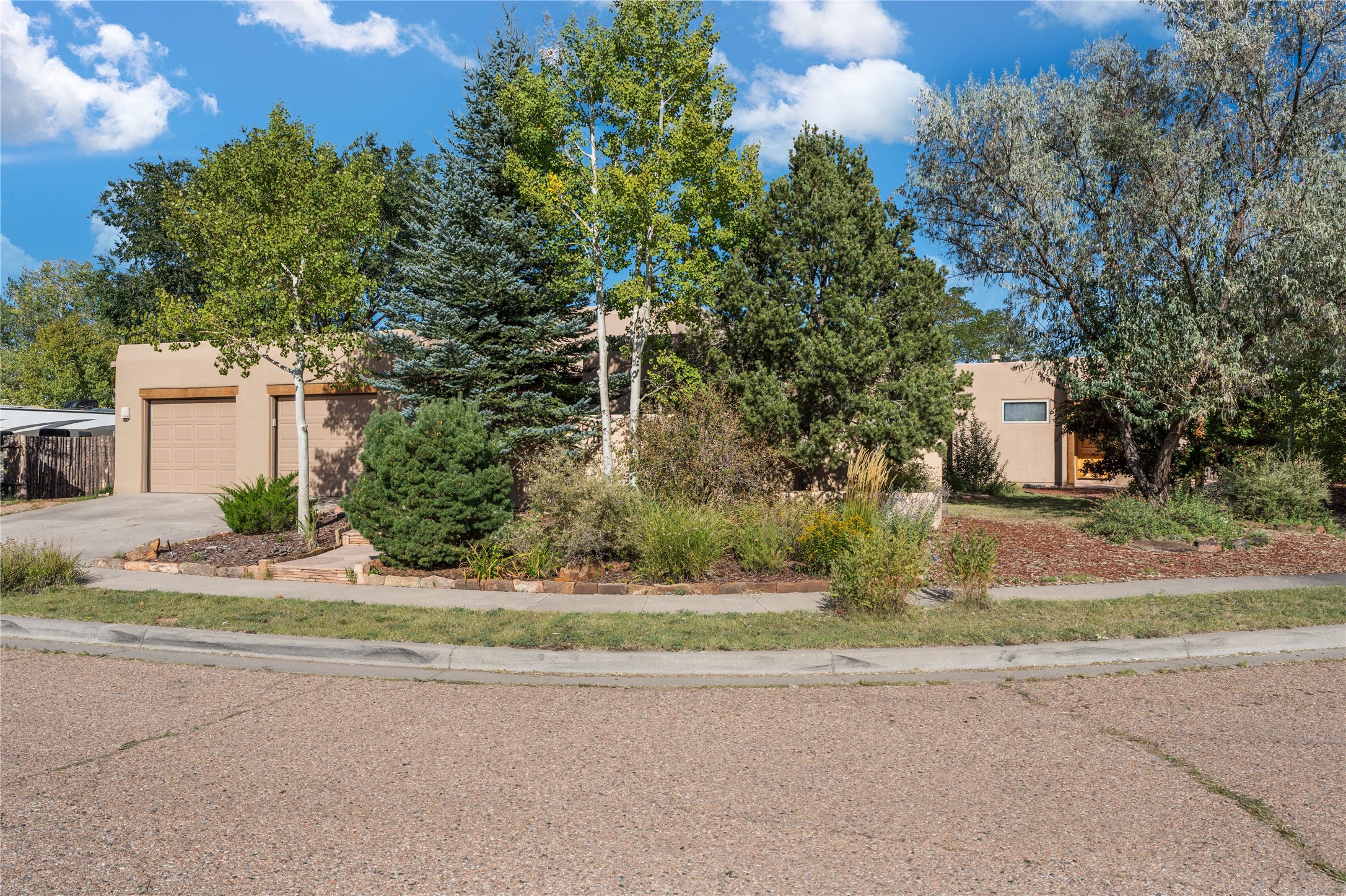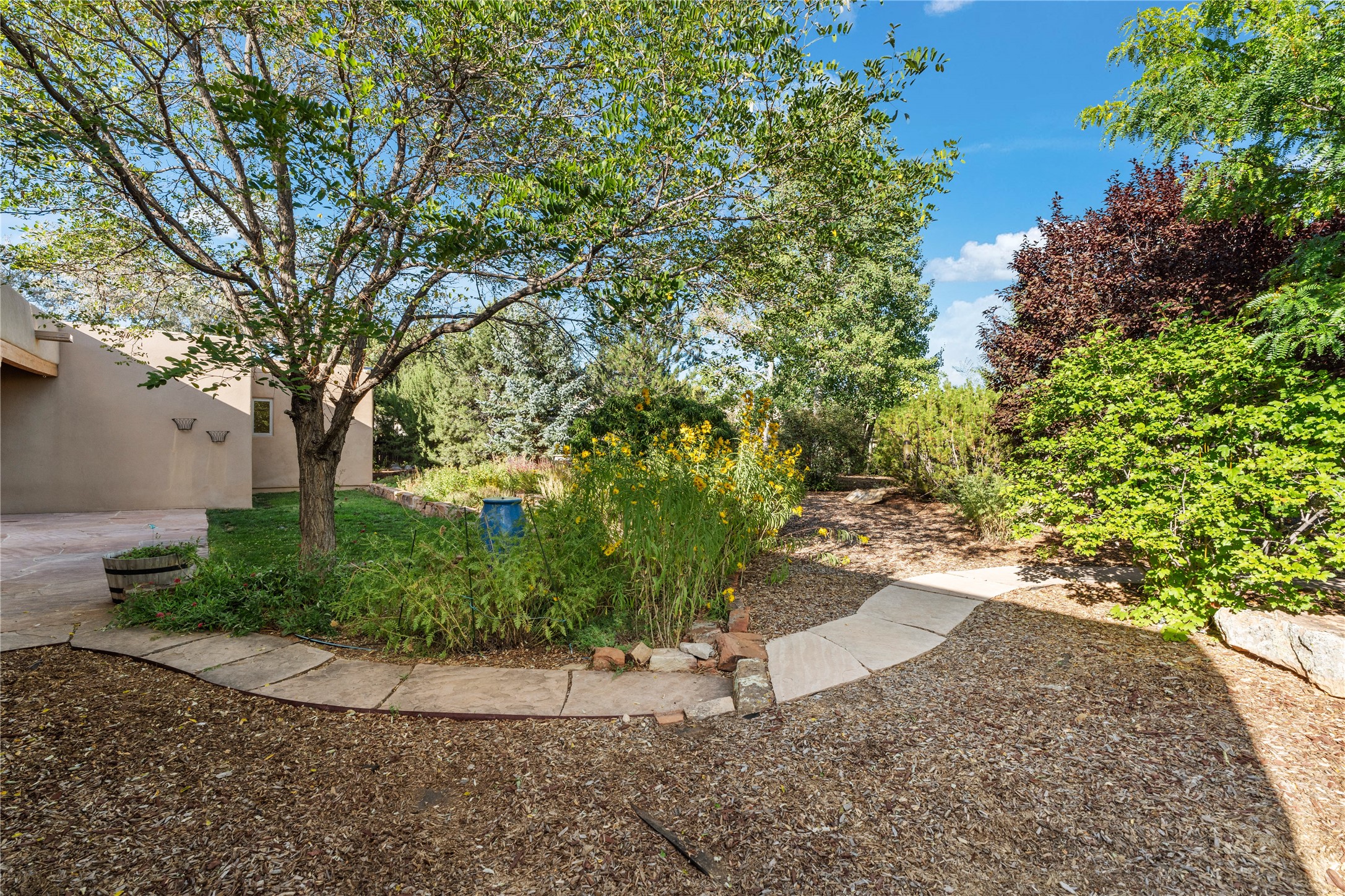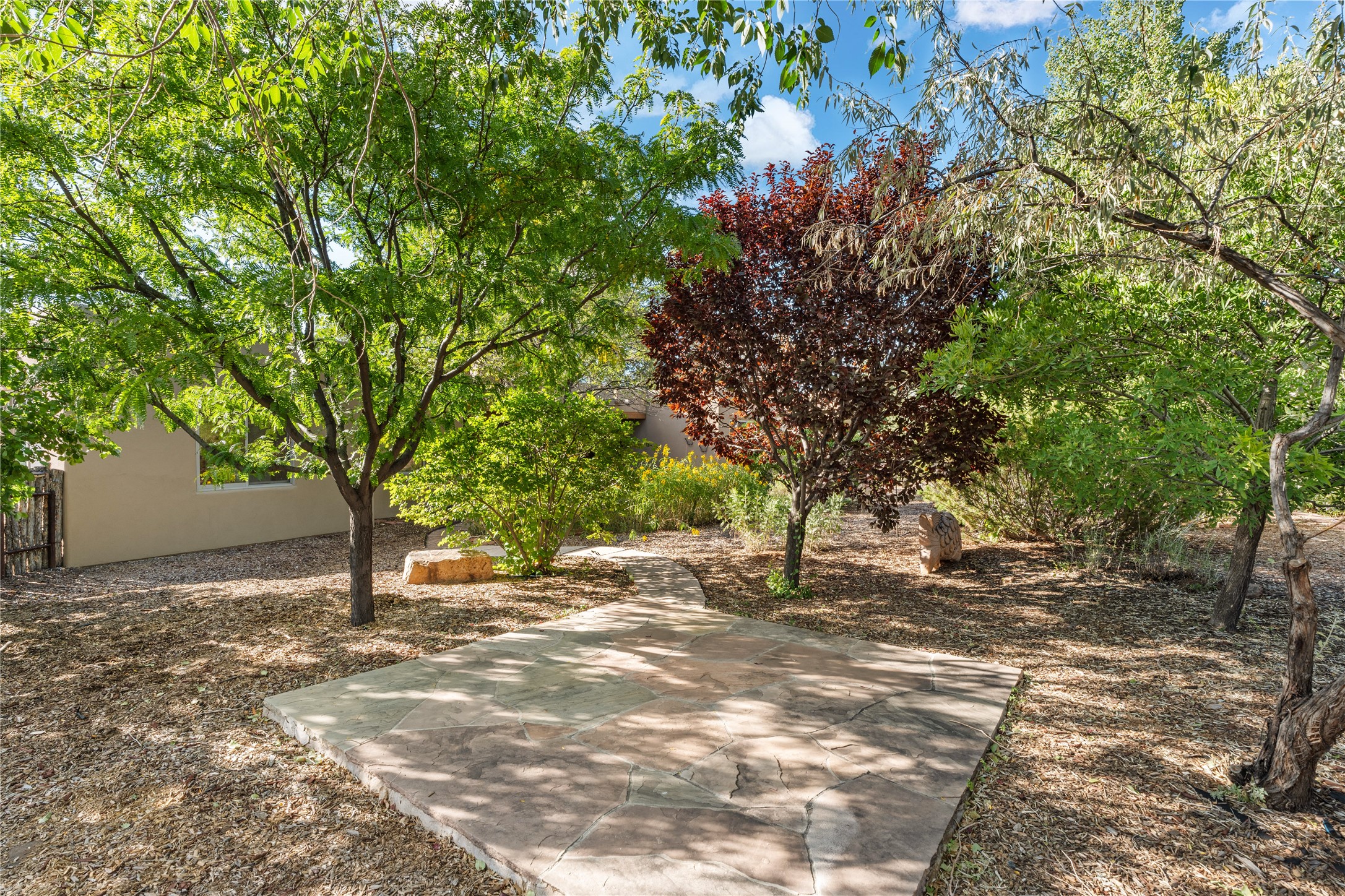 Tucked away off a serene cul-de-sac, this entirely single level, meticulous Santa Fe style home must be seen! Located on the city's lower east side near the medical district and St. Michael's High School, everything you need is a short drive away. The home is situated on a huge, beautifully landscaped lot with a peak of mountain views. For the enjoyment of your private sanctuary, there is a 455 sq. ft. portal with vigas and wood decking above and flagstone flooring below that is a true extension of your living space with Santa Fe's delightful climate many months of the year. The home is immaculate and offers incredible flexibility with a spacious studio or office addition. With a private entrance, this light and airy room with a multitude of windows could also function as a mother-in-law suite with a beautiful bathroom nearby featuring a walk-in shower. The living room boasts soaring ceilings with vigas and wood ceiling and an amazing kiva fireplace that commands attention. The primary bedroom is private and spacious and the remodeled bath with a gorgeous shower and huge walk-in closet will not disappoint. The home also features three other bedrooms with beautifully renovated guest bath. The kitchen is lovely with quartz counter tops and high end stainless steel appliances and more than sufficient storage for all your culinary needs. For your dining requirements, the home offers a charming breakfast nook replete with windows bringing the lovely outdoors in as well as a more formal dining space. There is a fabulous laundry room with cabinets, built in sink, and a window to the backyard. The home also features 7 nearly new mini-splits which offer both heating and cooling for year round comfort and a two car attached garage. This home is truly a gem! If you are seeking a home full of Santa Fe charm, character, and thoughtful upgrades- all in a prime location that allows for privacy and convenience, this property is not to be missed!