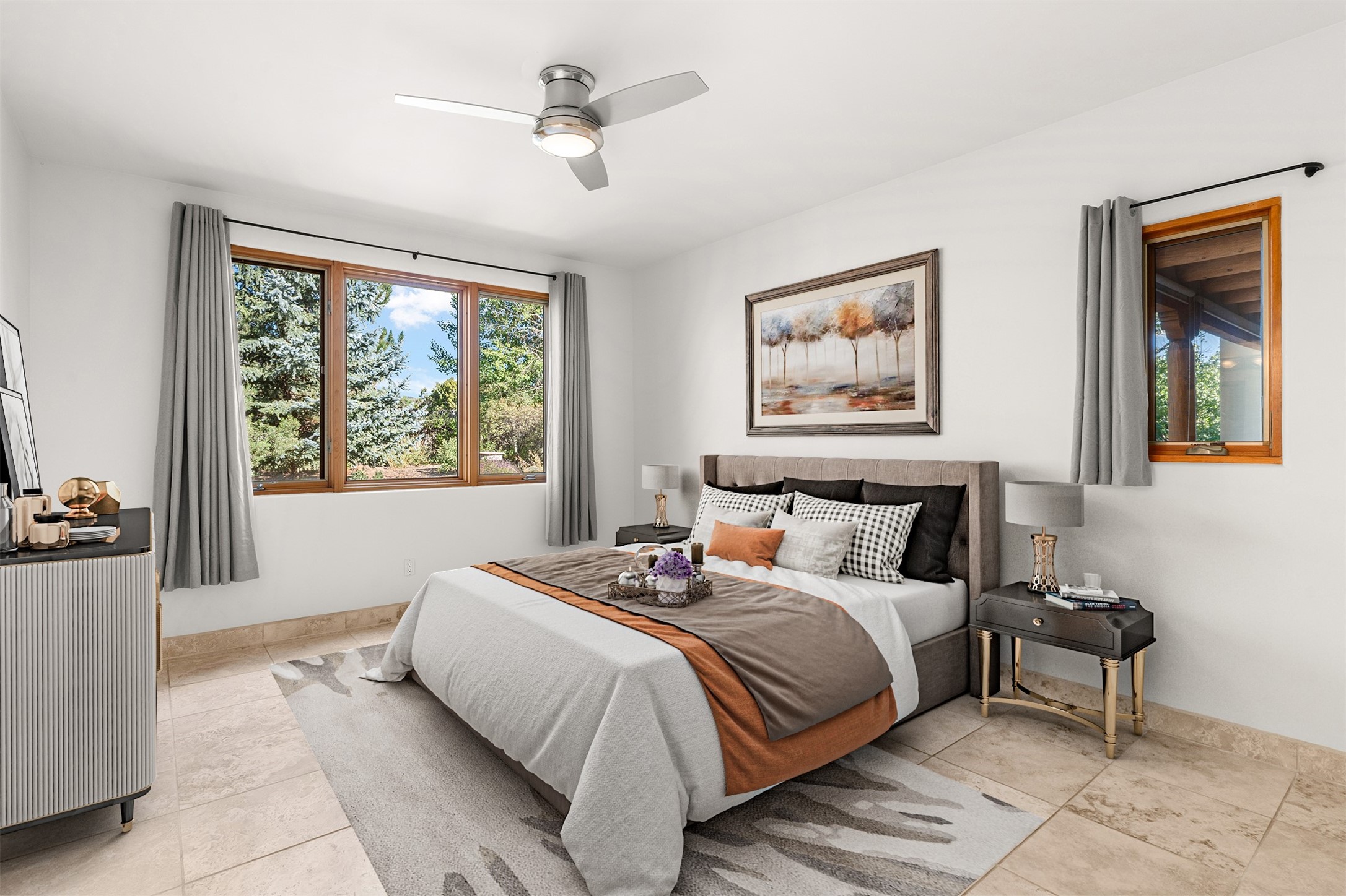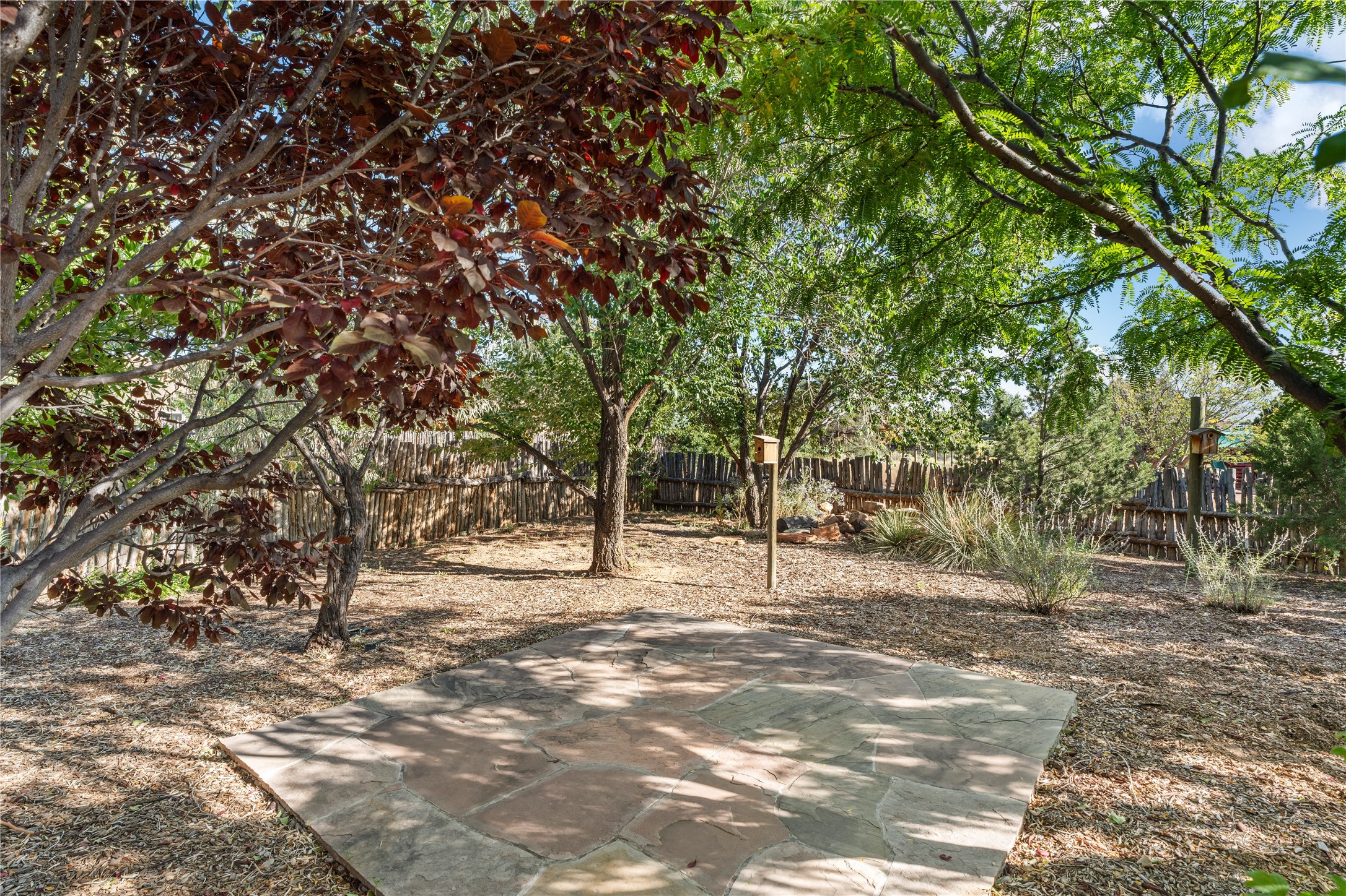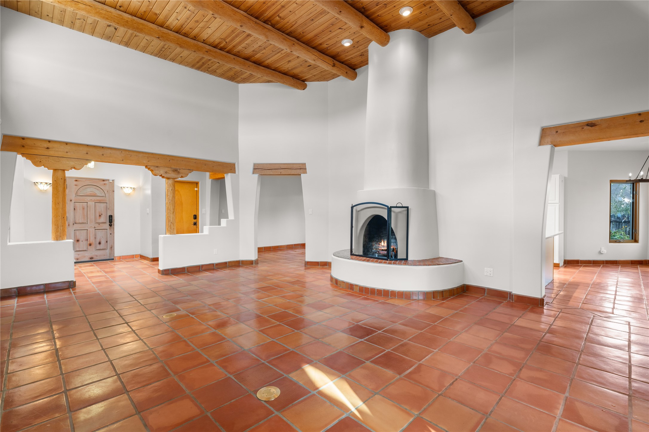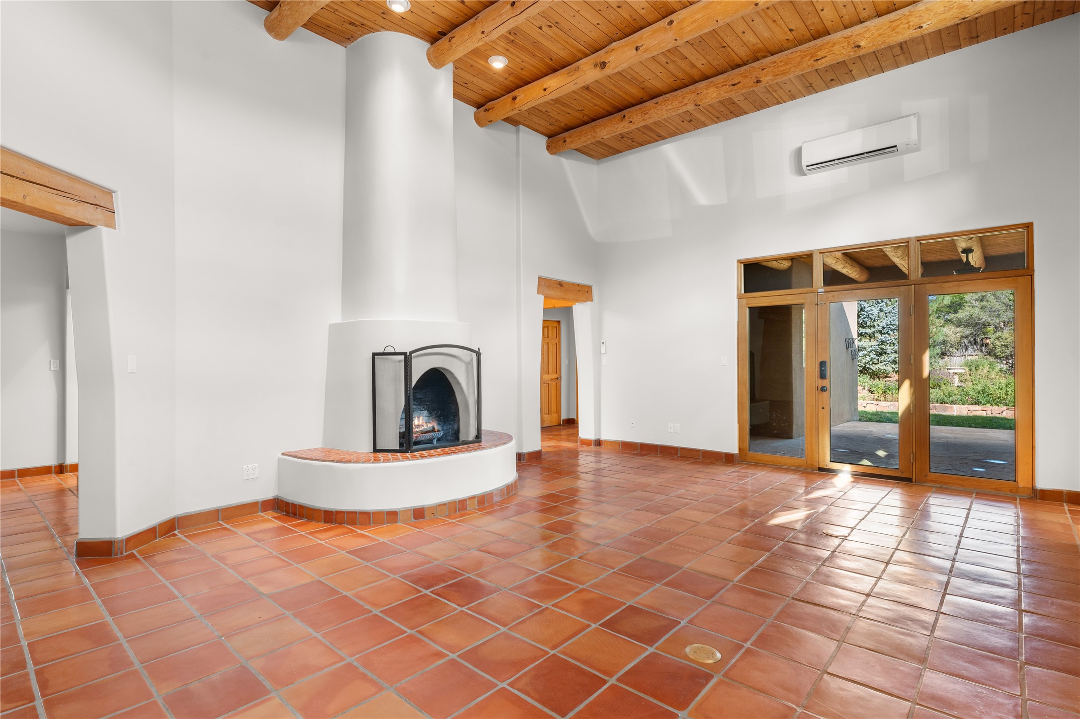 Tucked away off a serene cul-de-sac, this entirely single level, meticulous Santa Fe style home must be seen! Located on the city's lower east side near the medical district and St. Michael's High School, everything you need is a short drive away. The home is situated on a huge, beautifully landscaped lot with a peak of mountain views. For the enjoyment of your private sanctuary, there is a 455 sq. ft. portal with vigas and wood decking above and flagstone flooring below that is a true extension of your living space with Santa Fe's delightful climate many months of the year. The home is immaculate and offers incredible flexibility with a spacious studio or office addition. With a private entrance, this light and airy room with a multitude of windows could also function as a mother-in-law suite with a beautiful bathroom nearby featuring a walk-in shower. The living room boasts soaring ceilings with vigas and wood ceiling and an amazing kiva fireplace that commands attention. The primary bedroom is private and spacious and the remodeled bath with a gorgeous shower and huge walk-in closet will not disappoint. The home also features three other bedrooms with beautifully renovated guest bath. The kitchen is lovely with quartz counter tops and high end stainless steel appliances and more than sufficient storage for all your culinary needs. For your dining requirements, the home offers a charming breakfast nook replete with windows bringing the lovely outdoors in as well as a more formal dining space. There is a fabulous laundry room with cabinets, built in sink, and a window to the backyard. The home also features 7 nearly new mini-splits which offer both heating and cooling for year round comfort and a two car attached garage. This home is truly a gem! If you are seeking a home full of Santa Fe charm, character, and thoughtful upgrades- all in a prime location that allows for privacy and convenience, this property is not to be missed!