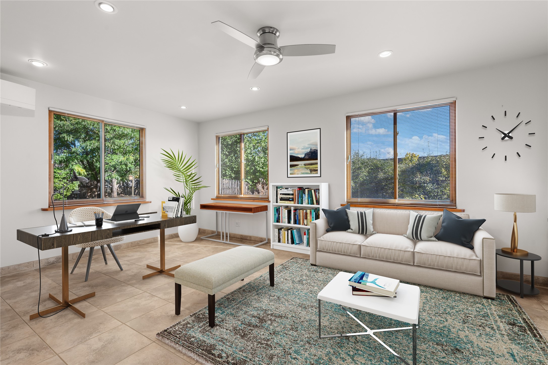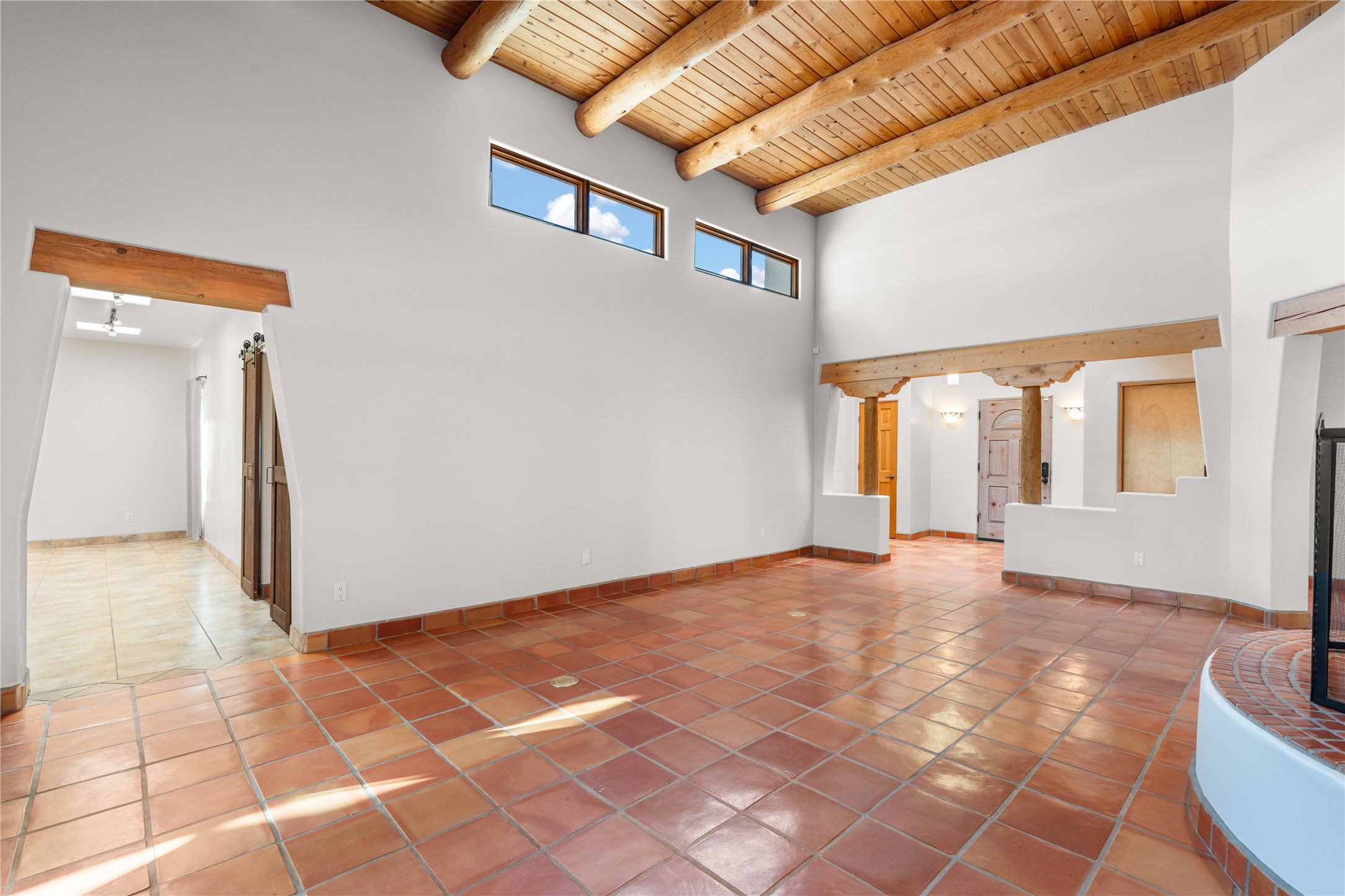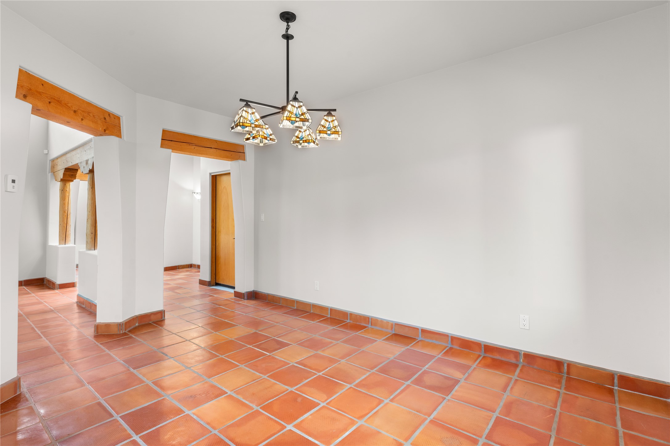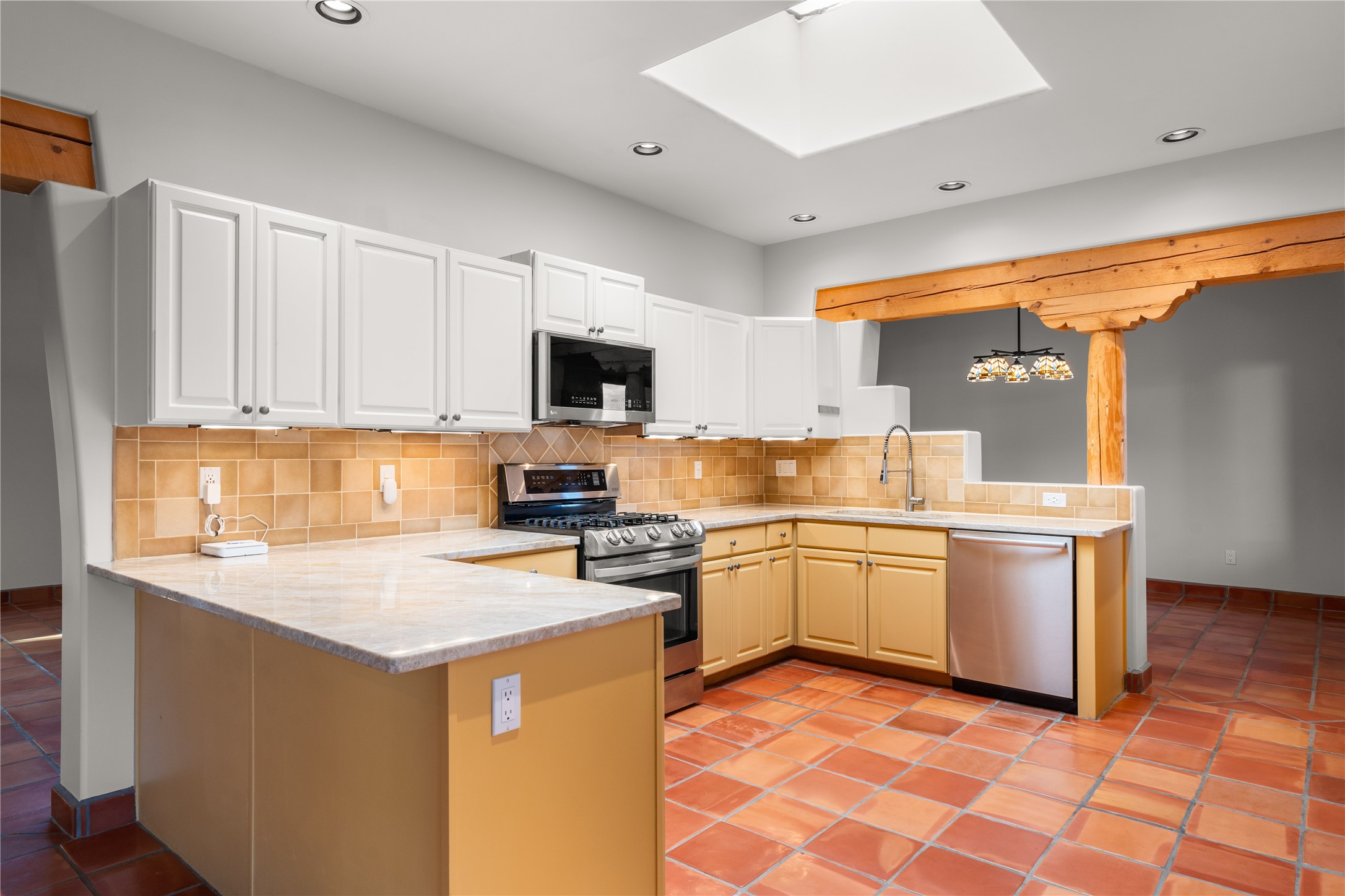 Tucked away off a serene cul-de-sac, this entirely single level, meticulous Santa Fe style home must be seen! Located on the city's lower east side near the medical district and St. Michael's High School, everything you need is a short drive away. The home is situated on a huge, beautifully landscaped lot with a peak of mountain views. For the enjoyment of your private sanctuary, there is a 455 sq. ft. portal with vigas and wood decking above and flagstone flooring below that is a true extension of your living space with Santa Fe's delightful climate many months of the year. The home is immaculate and offers incredible flexibility with a spacious studio or office addition. With a private entrance, this light and airy room with a multitude of windows could also function as a mother-in-law suite with a beautiful bathroom nearby featuring a walk-in shower. The living room boasts soaring ceilings with vigas and wood ceiling and an amazing kiva fireplace that commands attention. The primary bedroom is private and spacious and the remodeled bath with a gorgeous shower and huge walk-in closet will not disappoint. The home also features three other bedrooms with beautifully renovated guest bath. The kitchen is lovely with quartz counter tops and high end stainless steel appliances and more than sufficient storage for all your culinary needs. For your dining requirements, the home offers a charming breakfast nook replete with windows bringing the lovely outdoors in as well as a more formal dining space. There is a fabulous laundry room with cabinets, built in sink, and a window to the backyard. The home also features 7 nearly new mini-splits which offer both heating and cooling for year round comfort and a two car attached garage. This home is truly a gem! If you are seeking a home full of Santa Fe charm, character, and thoughtful upgrades- all in a prime location that allows for privacy and convenience, this property is not to be missed!