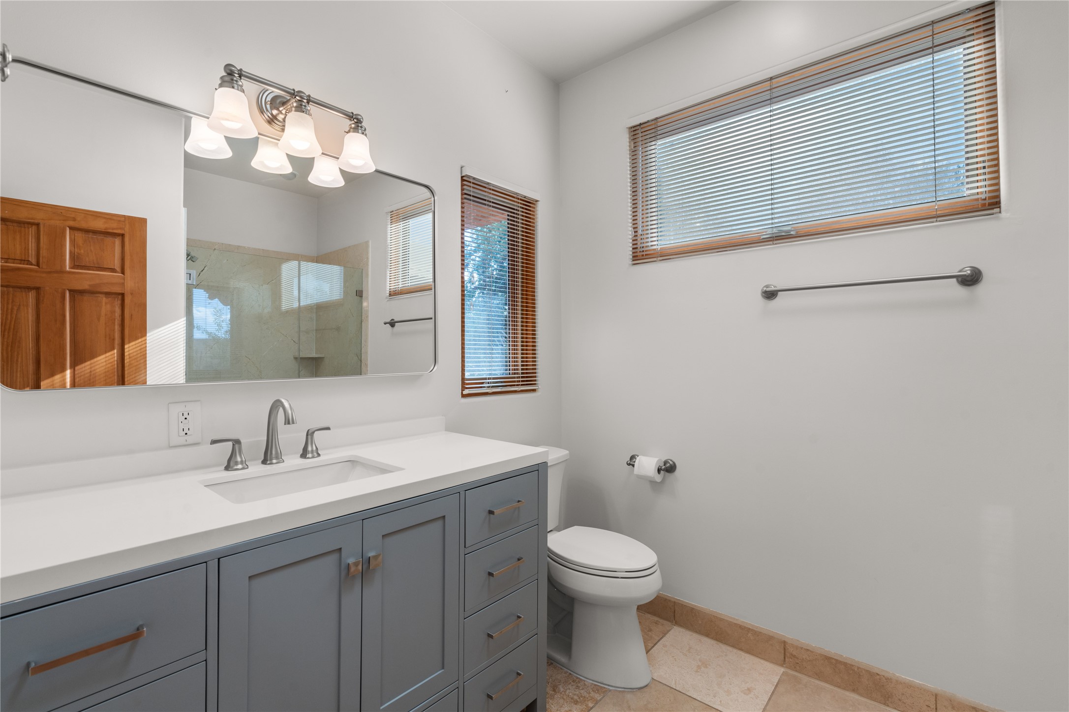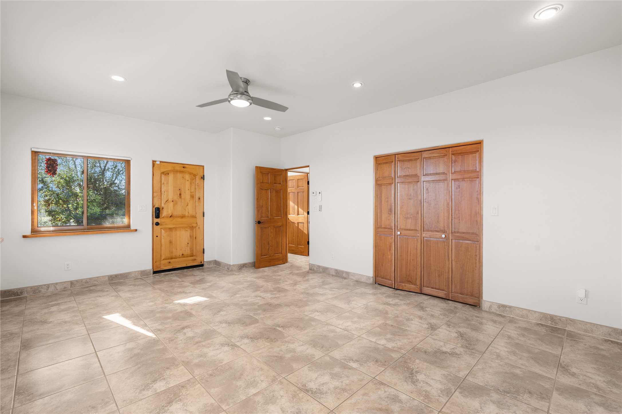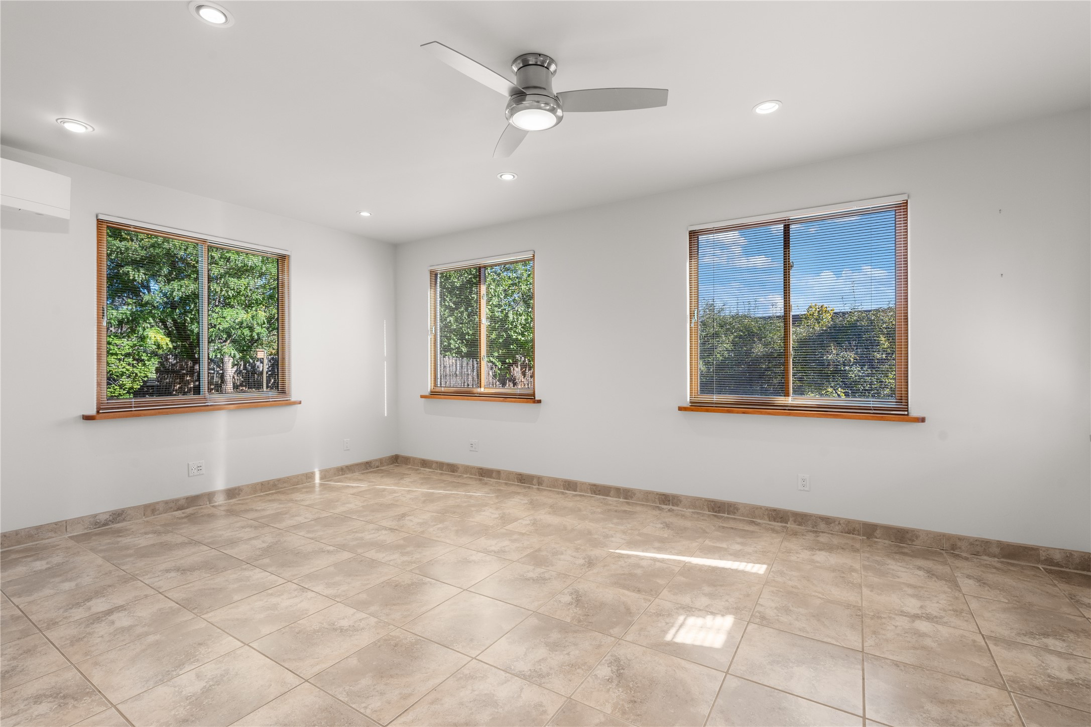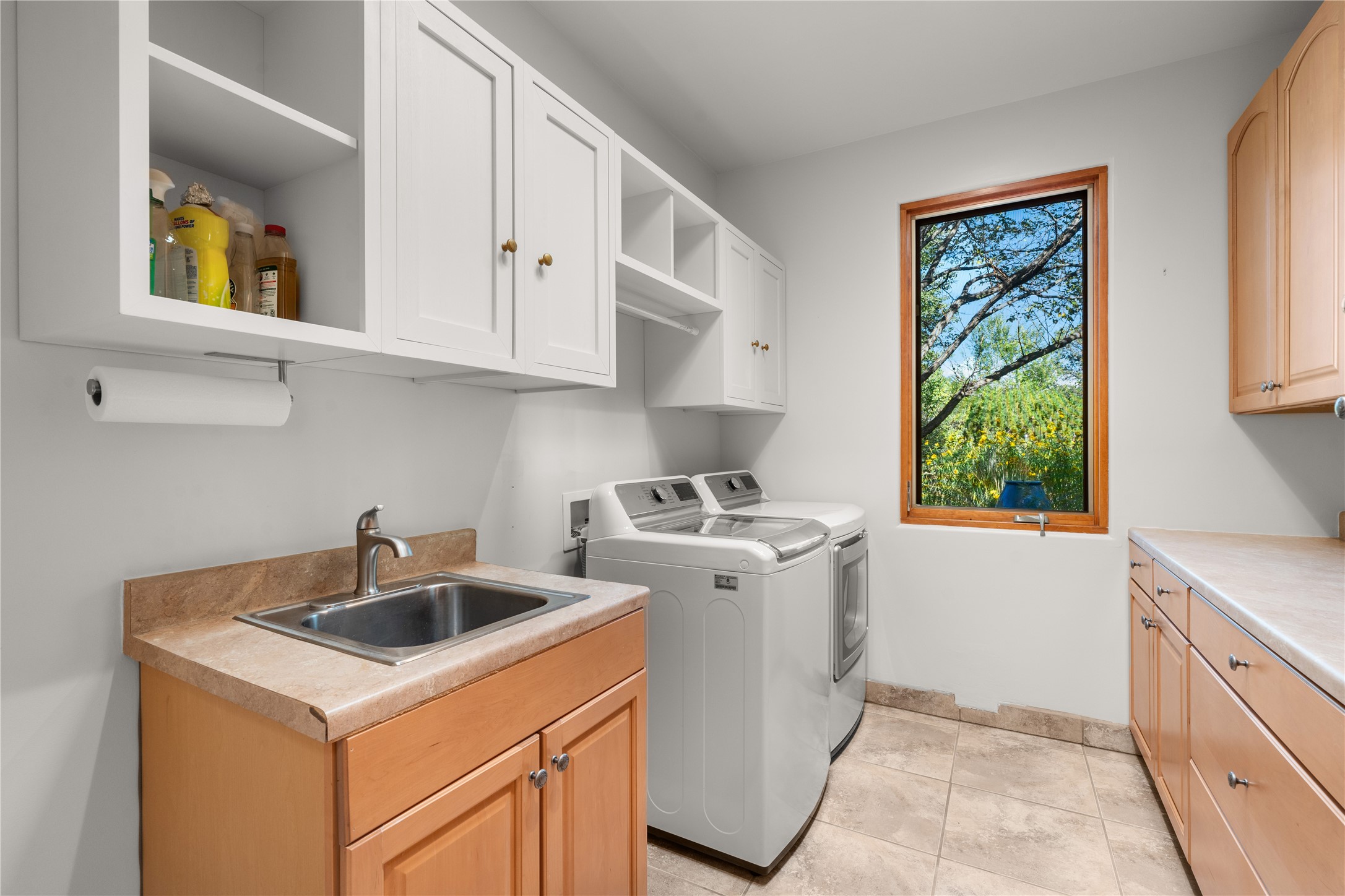 Tucked away off a serene cul-de-sac, this entirely single level, meticulous Santa Fe style home must be seen! Located on the city's lower east side near the medical district and St. Michael's High School, everything you need is a short drive away. The home is situated on a huge, beautifully landscaped lot with a peak of mountain views. For the enjoyment of your private sanctuary, there is a 455 sq. ft. portal with vigas and wood decking above and flagstone flooring below that is a true extension of your living space with Santa Fe's delightful climate many months of the year. The home is immaculate and offers incredible flexibility with a spacious studio or office addition. With a private entrance, this light and airy room with a multitude of windows could also function as a mother-in-law suite with a beautiful bathroom nearby featuring a walk-in shower. The living room boasts soaring ceilings with vigas and wood ceiling and an amazing kiva fireplace that commands attention. The primary bedroom is private and spacious and the remodeled bath with a gorgeous shower and huge walk-in closet will not disappoint. The home also features three other bedrooms with beautifully renovated guest bath. The kitchen is lovely with quartz counter tops and high end stainless steel appliances and more than sufficient storage for all your culinary needs. For your dining requirements, the home offers a charming breakfast nook replete with windows bringing the lovely outdoors in as well as a more formal dining space. There is a fabulous laundry room with cabinets, built in sink, and a window to the backyard. The home also features 7 nearly new mini-splits which offer both heating and cooling for year round comfort and a two car attached garage. This home is truly a gem! If you are seeking a home full of Santa Fe charm, character, and thoughtful upgrades- all in a prime location that allows for privacy and convenience, this property is not to be missed!