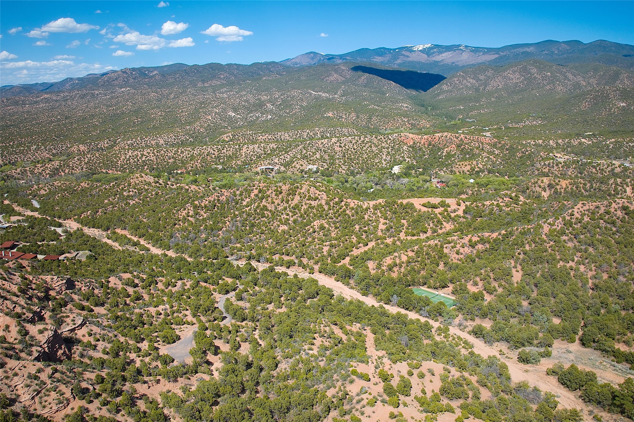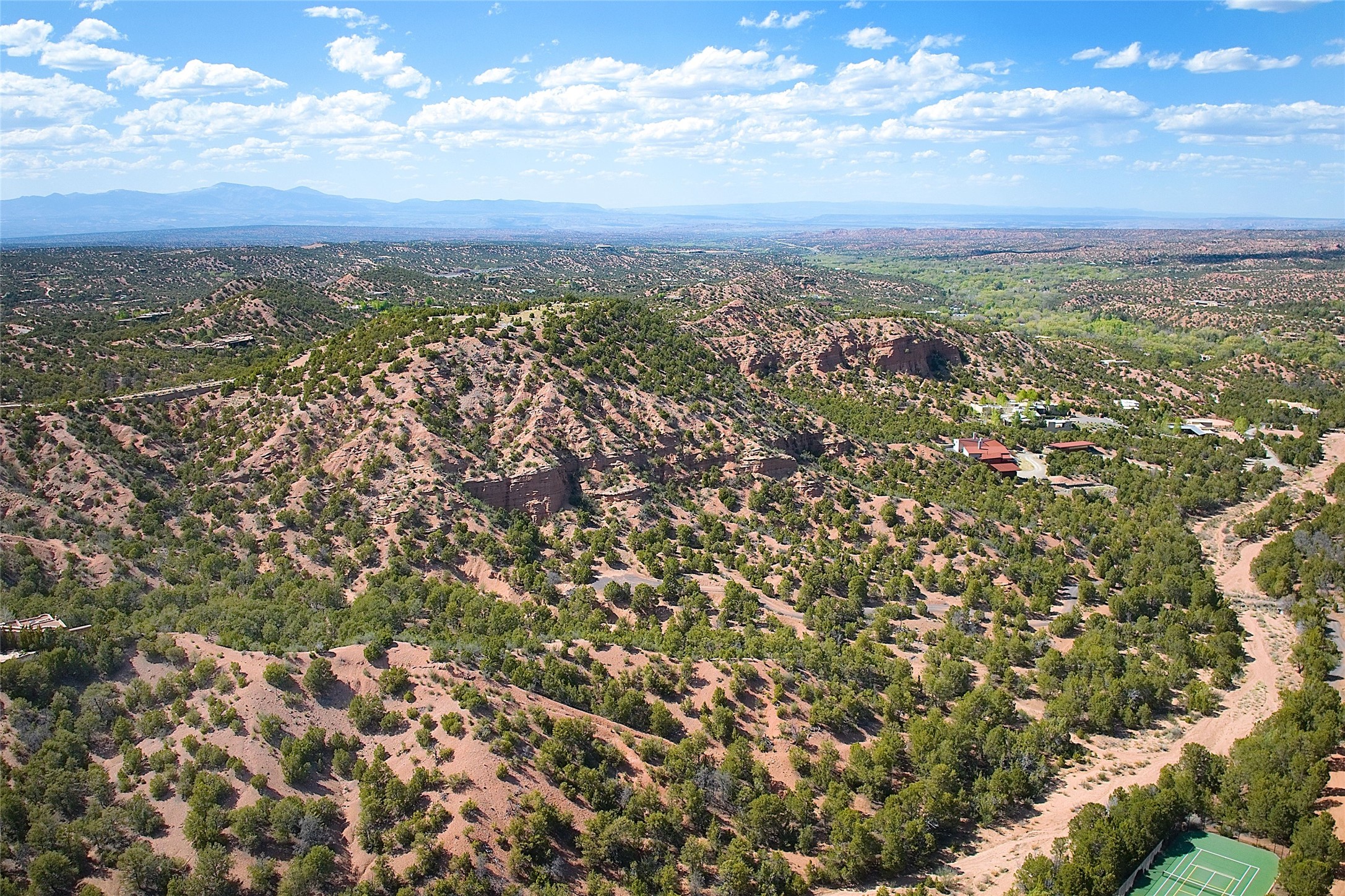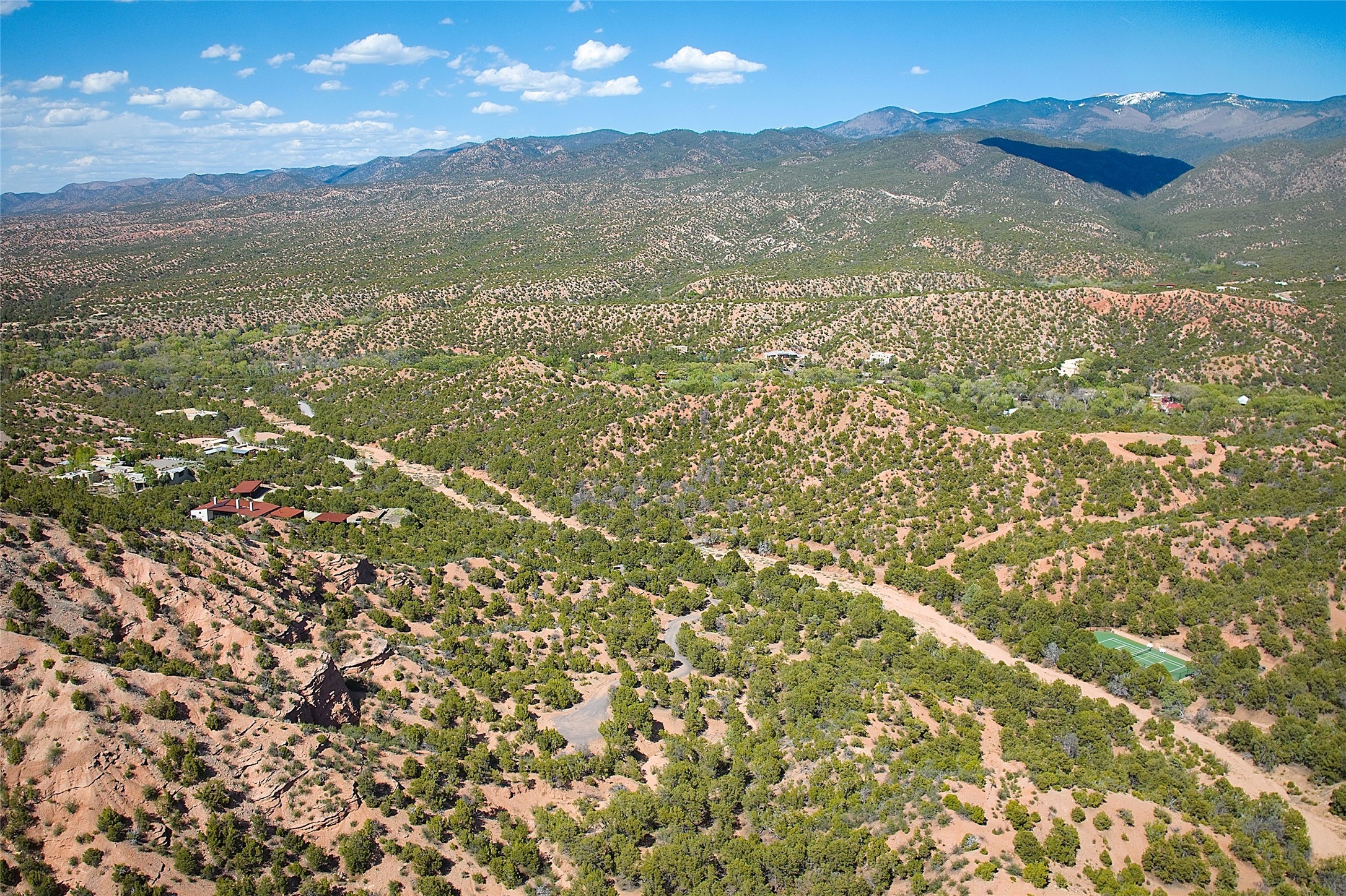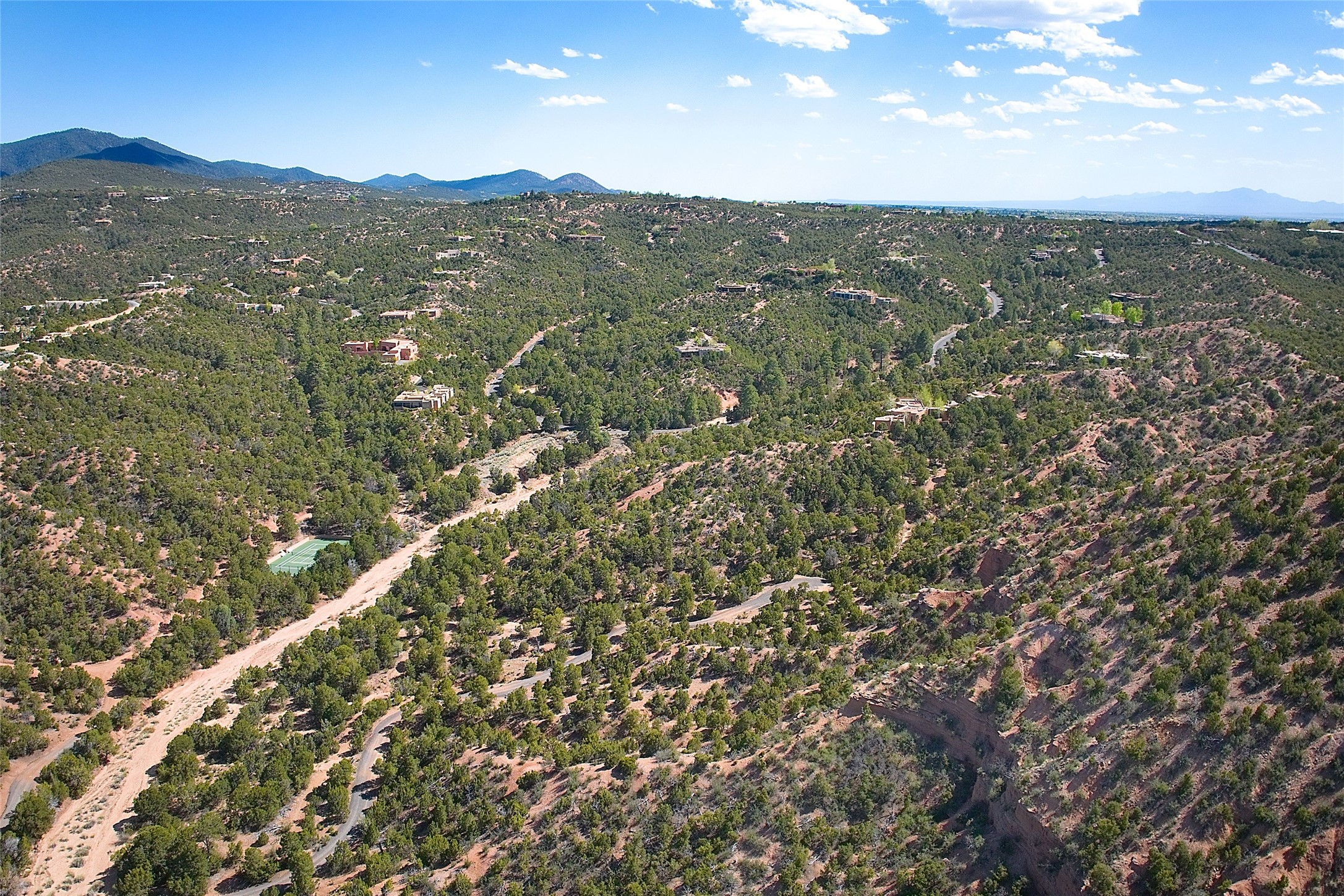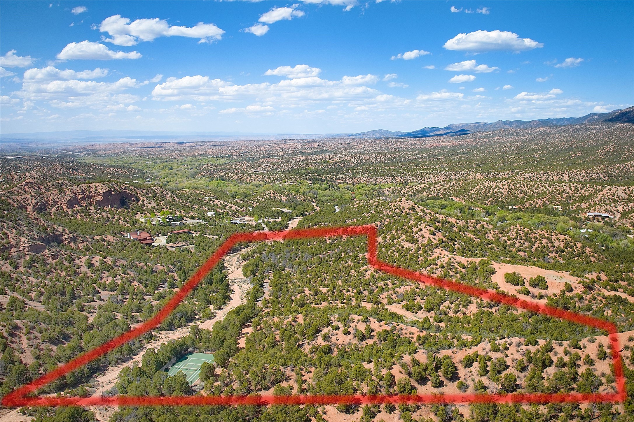 Rare opportunity to own 23.01-acres of residential land offering spectacular panoramic views of the Sangre de Cristo Mountains and the tranquil Tesuque Valley. This unique parcel consists of two separately deeded contiguous lots. Accessed through the prestigious gated Circle Drive Compound, this property ensures a sense of privacy and exclusivity while remaining connected to a vibrant community. With several designated building envelopes, you have the creative freedom to design a residence that perfectly complements the stunning surroundings. One of the deeded lots features a finished tennis court, a luxurious amenity that enhances your outdoor lifestyle while allowing for community access. Imagine enjoying sunny afternoons on the court or hosting gatherings with friends and family, all set against the backdrop of breathtaking natural beauty. Full plans for 4,738 sq. ft. 3 bedroom, 4 bath main house (with an approved permit for pool) and 1608 sq. ft. 2 bedroom, 2 bath casita from Craig Hoopes Architects could be included with sale. Underground utilities, and one shared well permitted for multiple domestic households. Zoning is Residential Fringe; District Density: RES-F; 1 dwelling per 5 acres. This prime location combines the best of both worlds: the serenity of rural living and the convenience of nearby amenities. Experience the rich culture and outdoor adventures that New Mexico has to offer, all while enjoying the comfort of your own private retreat.