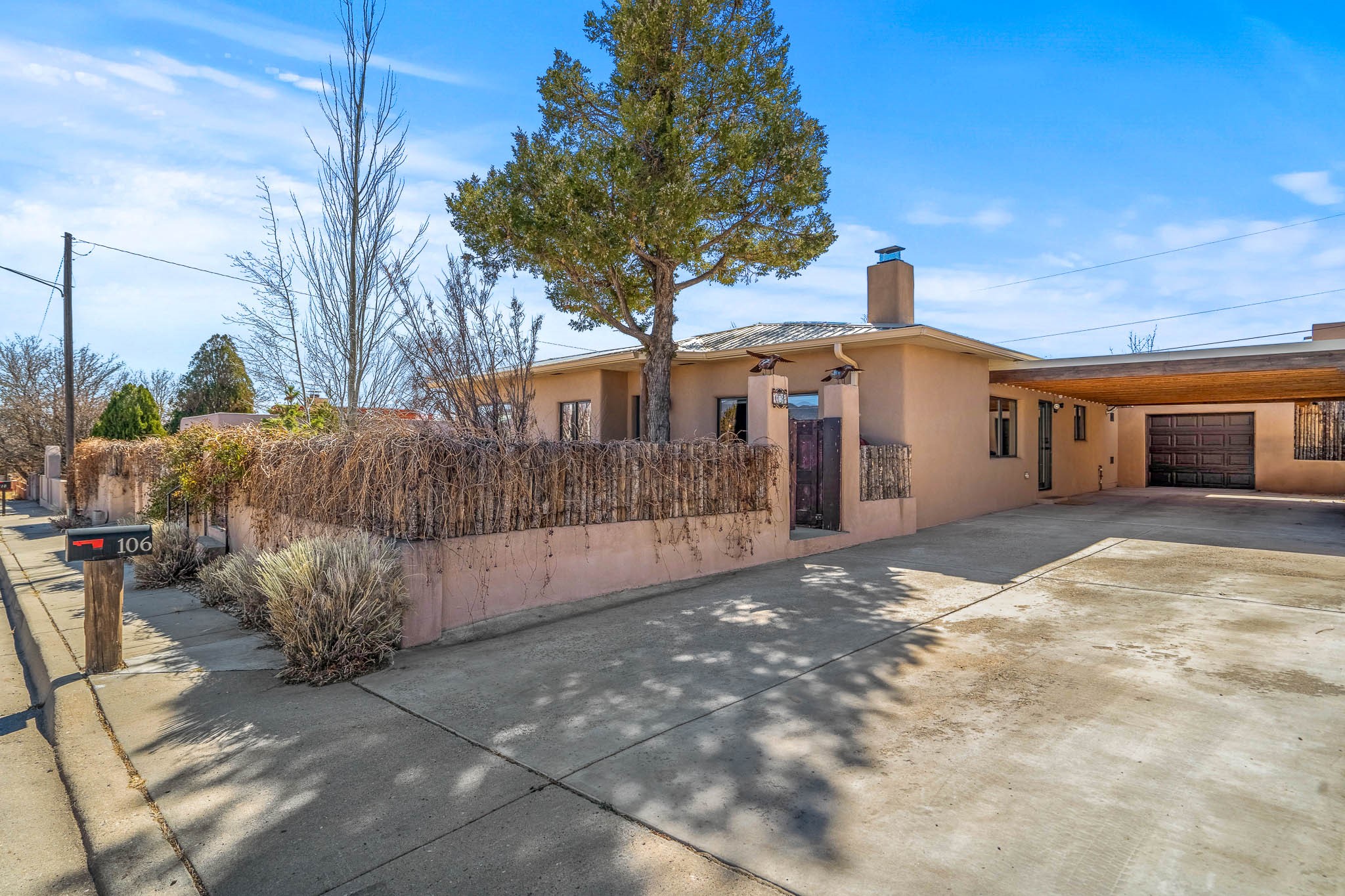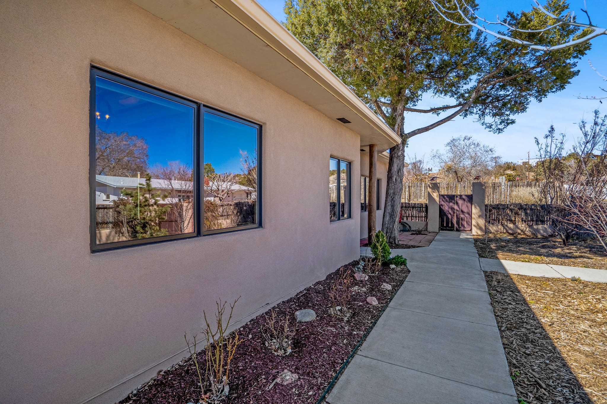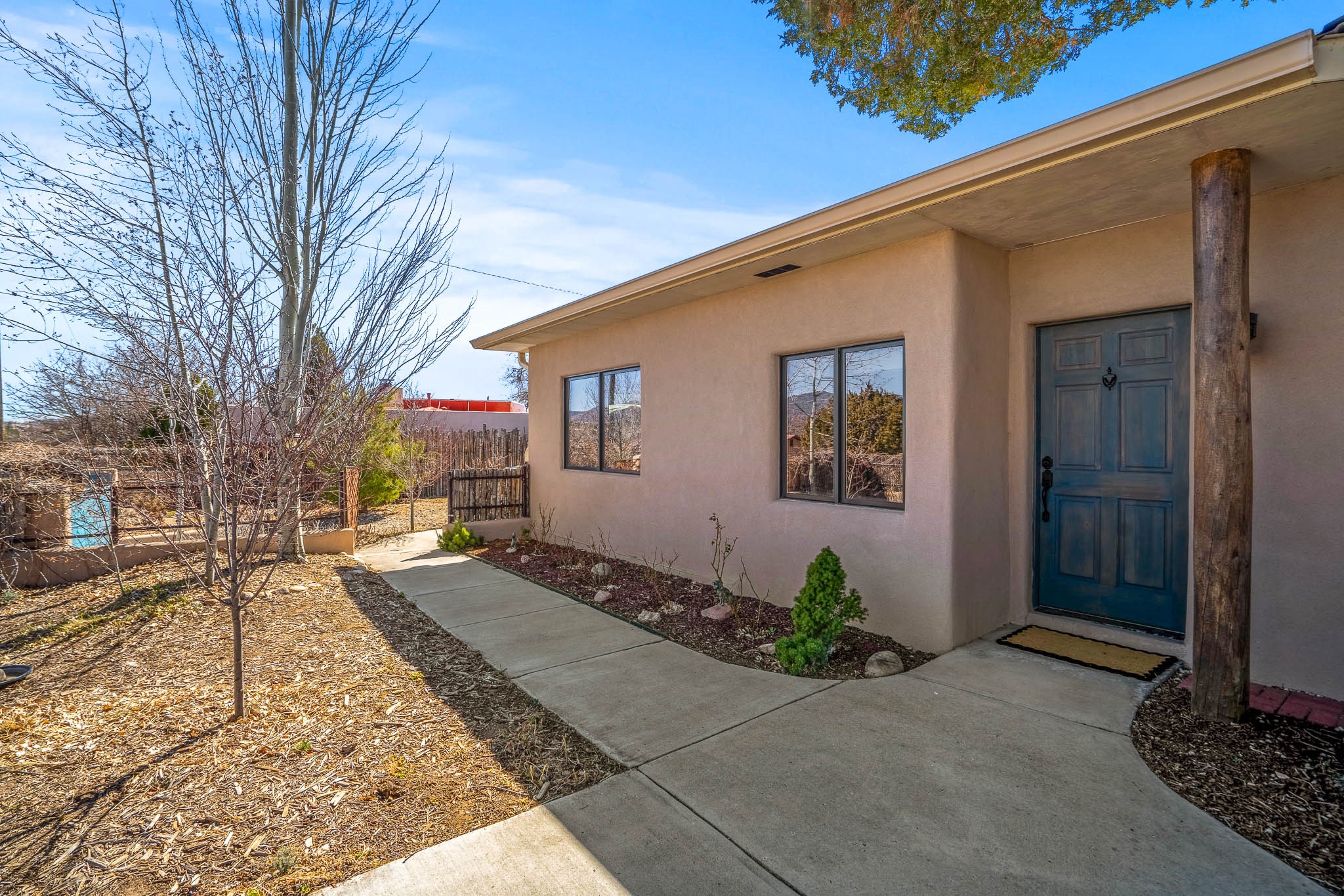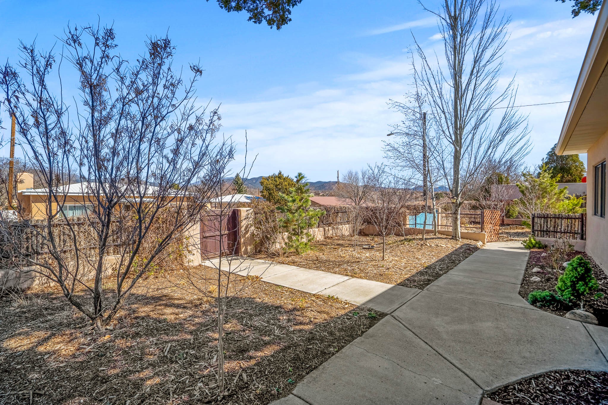 This delightful Santa Fe gem, nestled on a generous 1/4-acre city lot, was completely renovated about 8 years ago and offers approximately 1,913 sq. ft. of living space. Boasting classic Santa Fe charm, the home features traditional vigas, a large country kitchen, granite countertops, and beautiful champagne plaster walls. Enjoy ample storage throughout, gas cooking, and custom details including nichos and wood and Saltillo tile floors.With 3 bedrooms and 2 full baths, this home includes two cozy fireplaces, forced air heating, and central A/C. The pitched roof adds to the Southwestern style, while the newly constructed, expansive portal with a reinforced roof is perfect for taking in both city and mountain views.The property also offers a wealth of additional amenities: two carports (one with ample space for 3-4 cars), a one-car garage, shed, and large driveway gates that easily accommodate an RV or trailer. Beautifully landscaped grounds are complemented by a professionally installed manifold for a sprinkler system. This versatile property is private and in a great location near the Santa Fe River and the River Trail, Alto Park and the Casa Solana Shopping Center. Come See!
