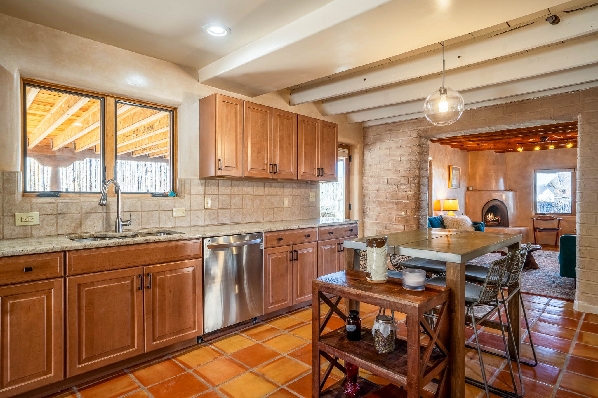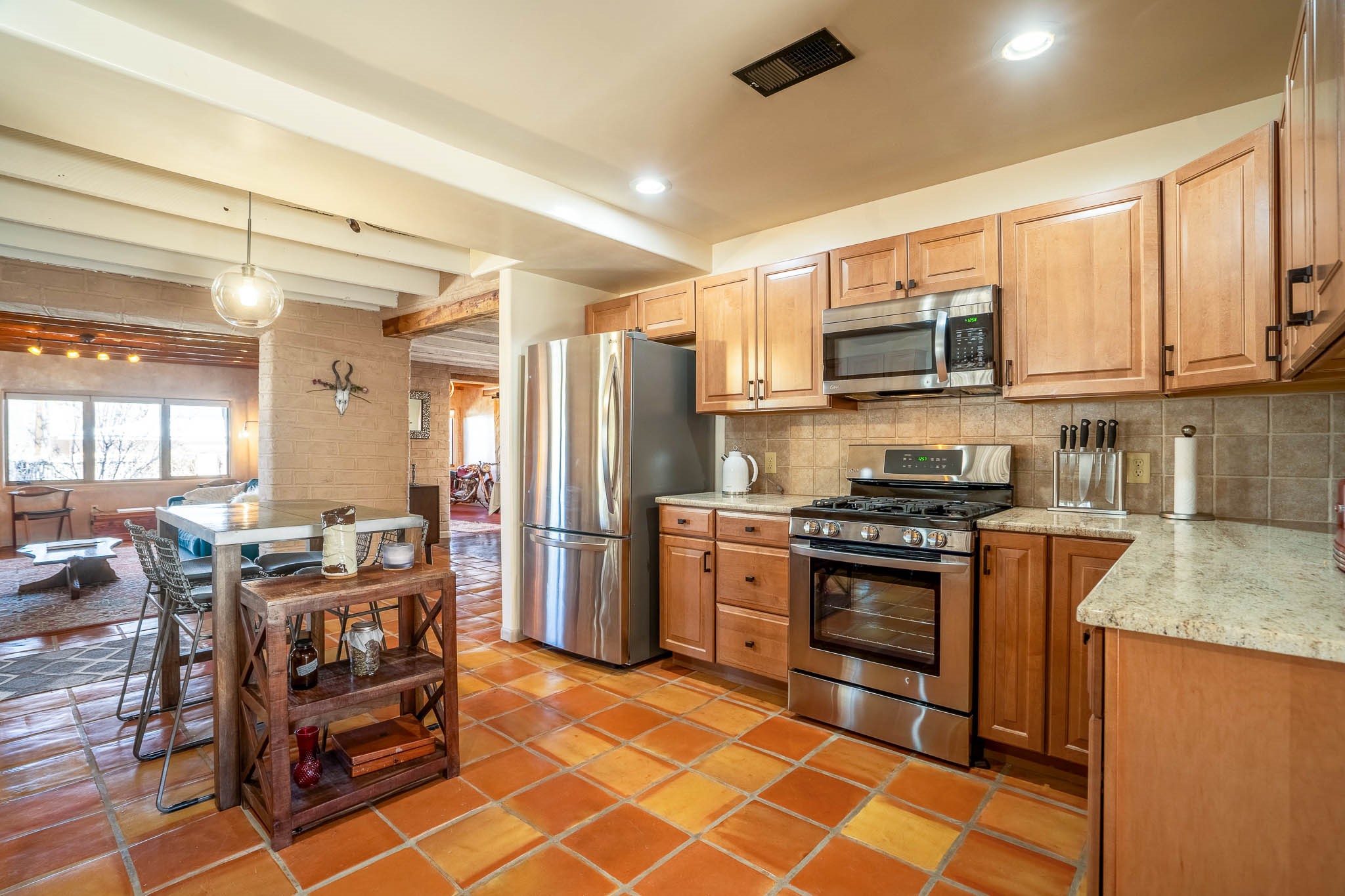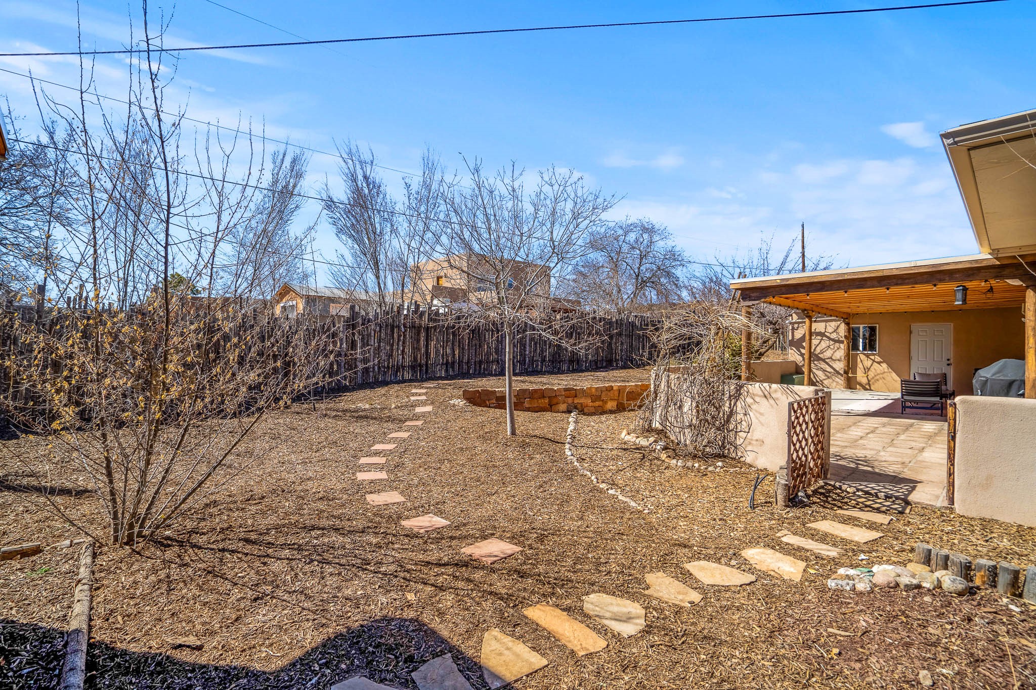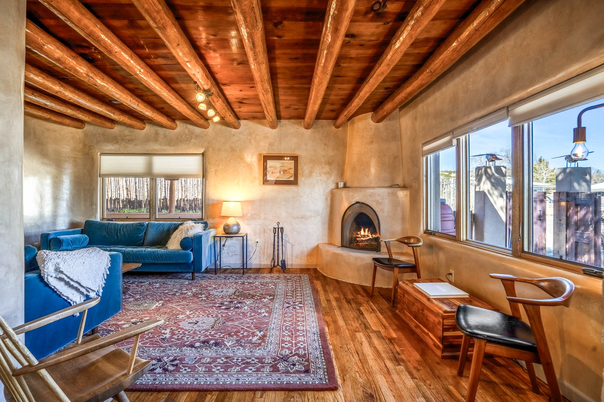 This delightful Santa Fe gem, nestled on a generous 1/4-acre city lot, was completely renovated about 8 years ago and offers approximately 1,913 sq. ft. of living space. Boasting classic Santa Fe charm, the home features traditional vigas, a large country kitchen, granite countertops, and beautiful champagne plaster walls. Enjoy ample storage throughout, gas cooking, and custom details including nichos and wood and Saltillo tile floors.With 3 bedrooms and 2 full baths, this home includes two cozy fireplaces, forced air heating, and central A/C. The pitched roof adds to the Southwestern style, while the newly constructed, expansive portal with a reinforced roof is perfect for taking in both city and mountain views.The property also offers a wealth of additional amenities: two carports (one with ample space for 3-4 cars), a one-car garage, shed, and large driveway gates that easily accommodate an RV or trailer. Beautifully landscaped grounds are complemented by a professionally installed manifold for a sprinkler system. This versatile property is private and in a great location near the Santa Fe River and the River Trail, Alto Park and the Casa Solana Shopping Center. Come See!