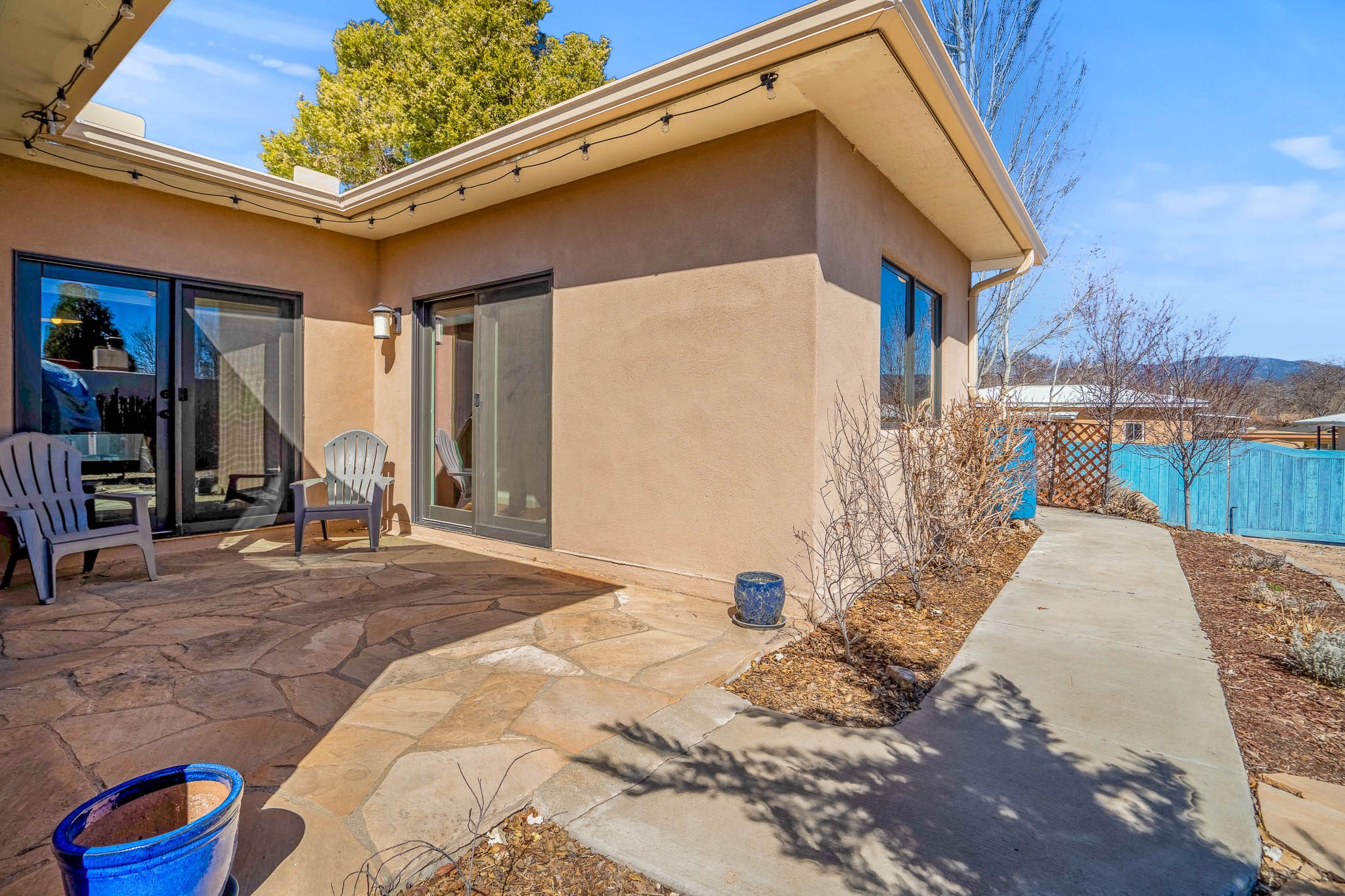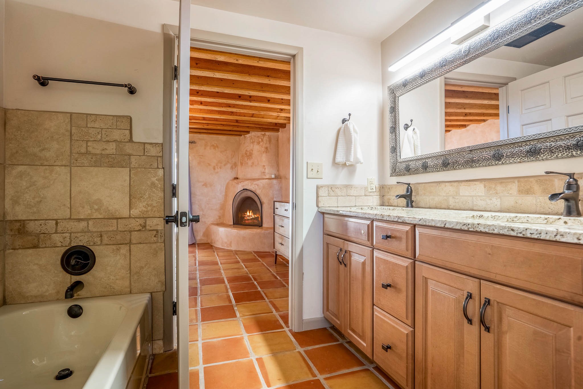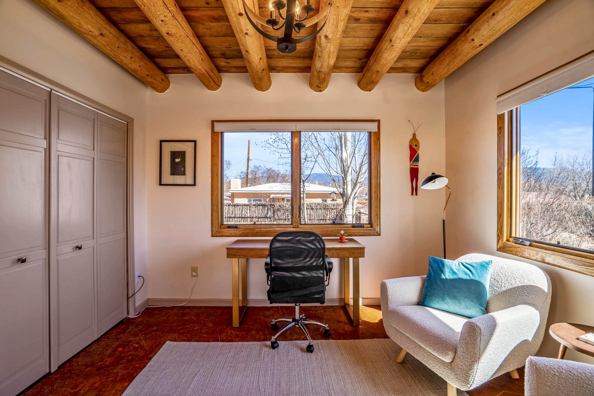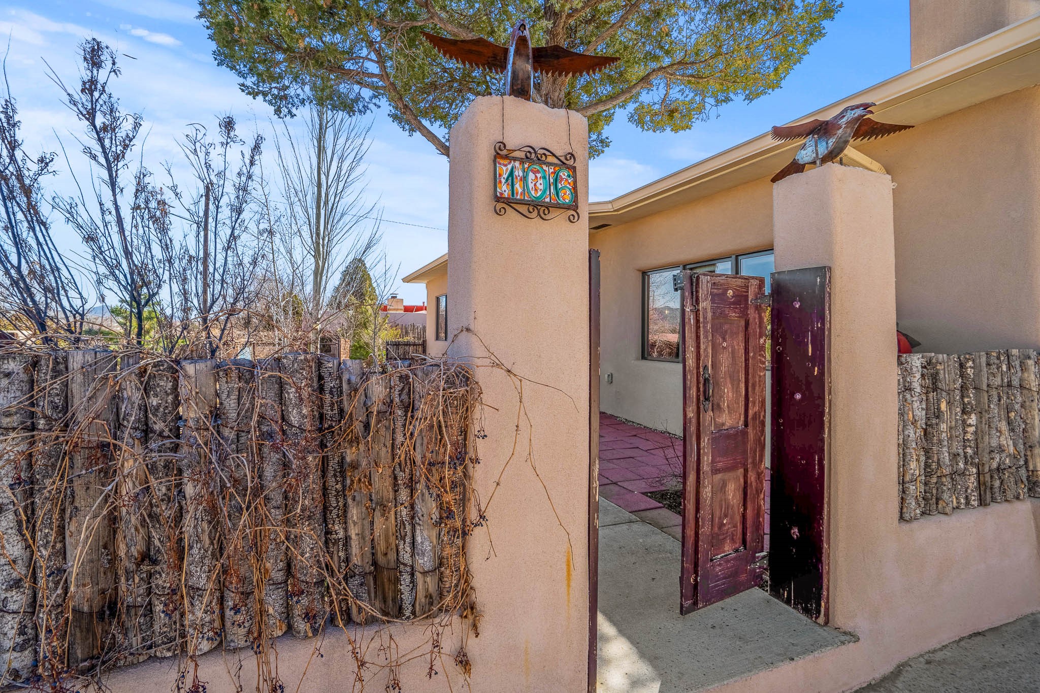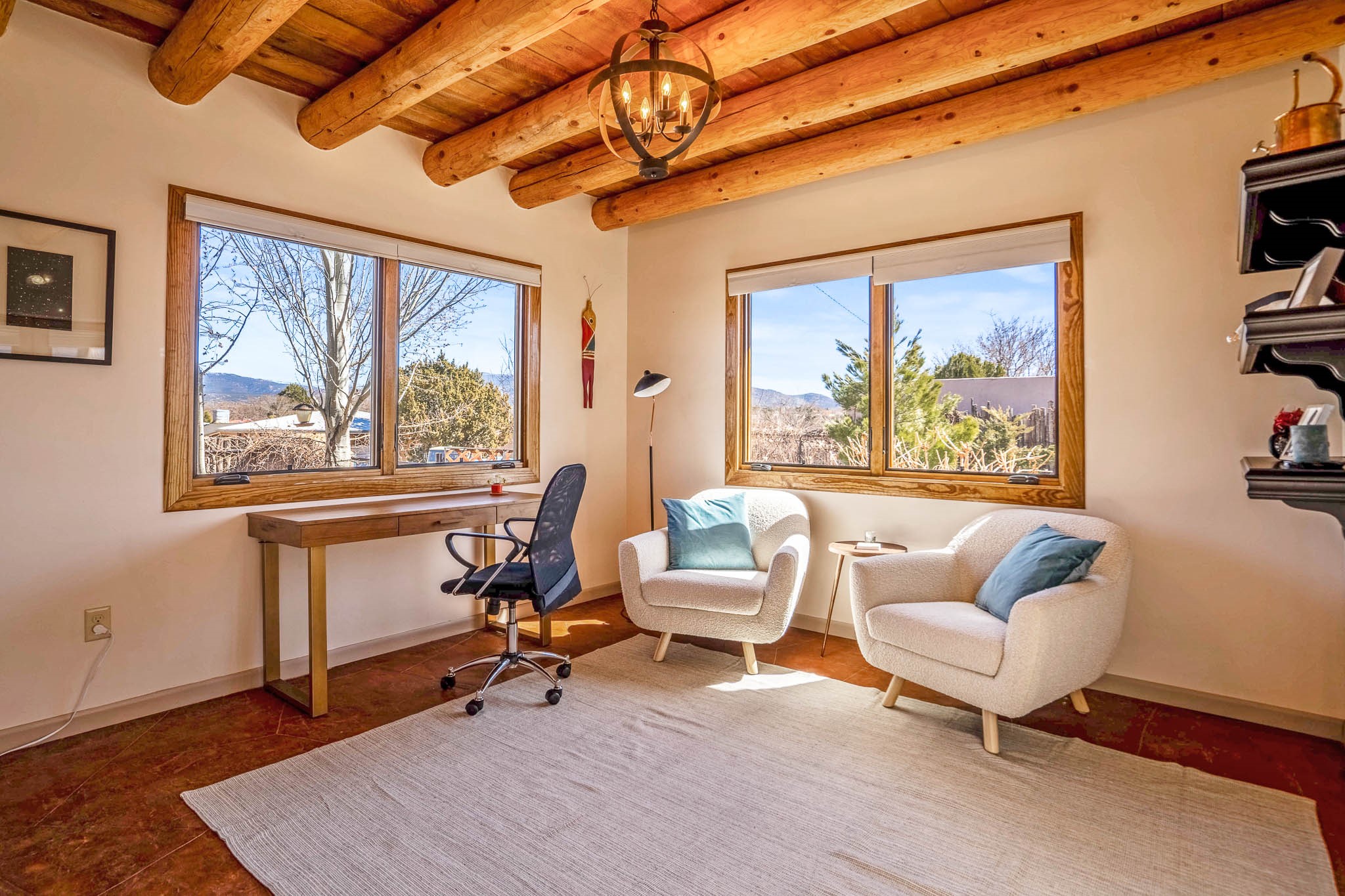 This delightful Santa Fe gem, nestled on a generous 1/4-acre city lot, was completely renovated about 8 years ago and offers approximately 1,913 sq. ft. of living space. Boasting classic Santa Fe charm, the home features traditional vigas, a large country kitchen, granite countertops, and beautiful champagne plaster walls. Enjoy ample storage throughout, gas cooking, and custom details including nichos and wood and Saltillo tile floors.With 3 bedrooms and 2 full baths, this home includes two cozy fireplaces, forced air heating, and central A/C. The pitched roof adds to the Southwestern style, while the newly constructed, expansive portal with a reinforced roof is perfect for taking in both city and mountain views.The property also offers a wealth of additional amenities: two carports (one with ample space for 3-4 cars), a one-car garage, shed, and large driveway gates that easily accommodate an RV or trailer. Beautifully landscaped grounds are complemented by a professionally installed manifold for a sprinkler system. This versatile property is private and in a great location near the Santa Fe River and the River Trail, Alto Park and the Casa Solana Shopping Center. Come See!