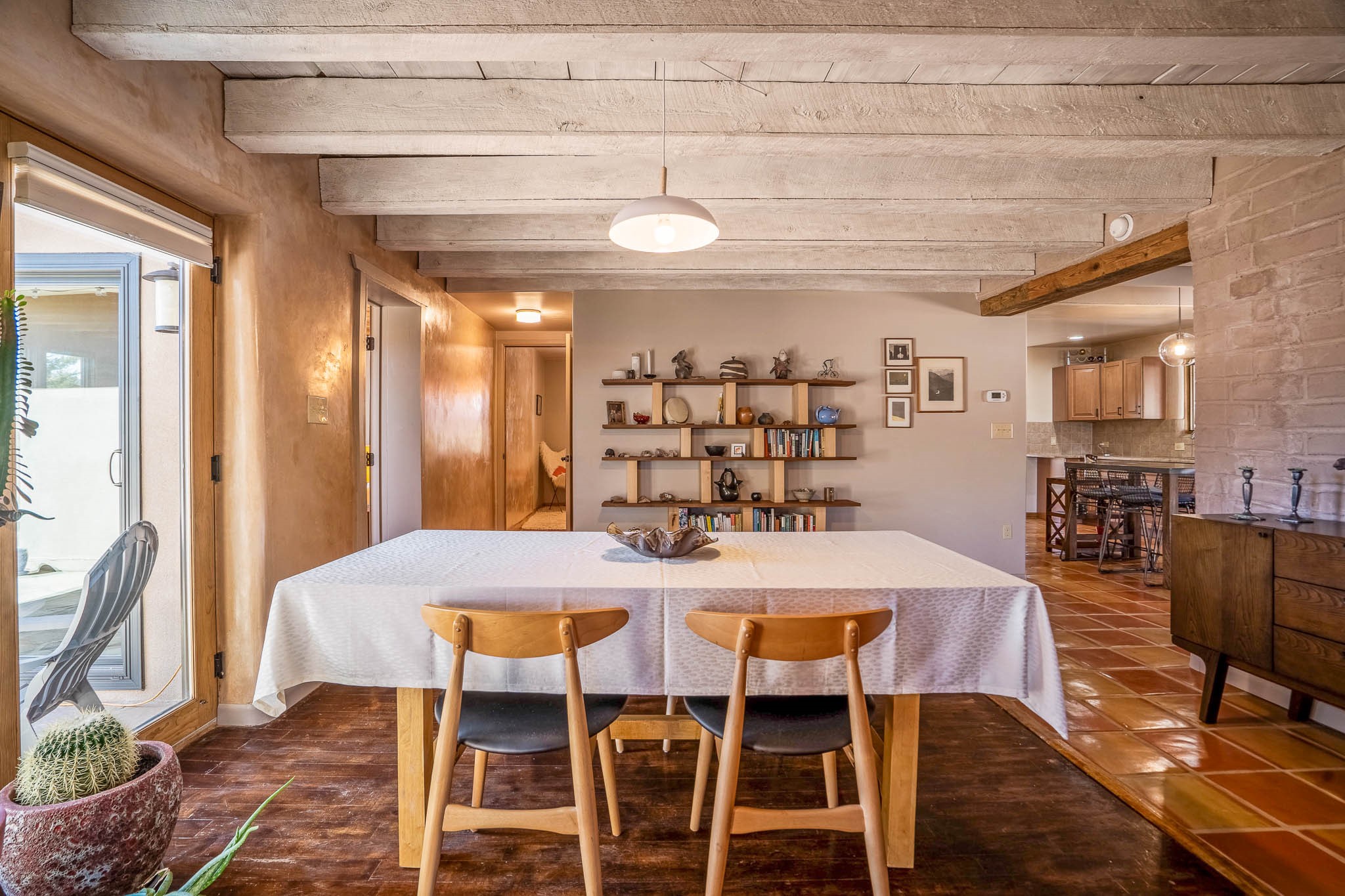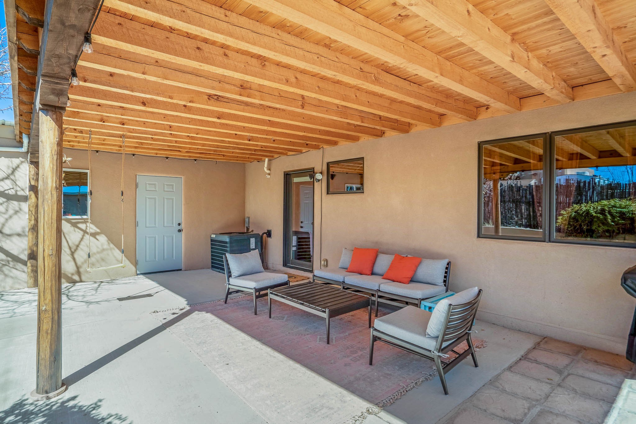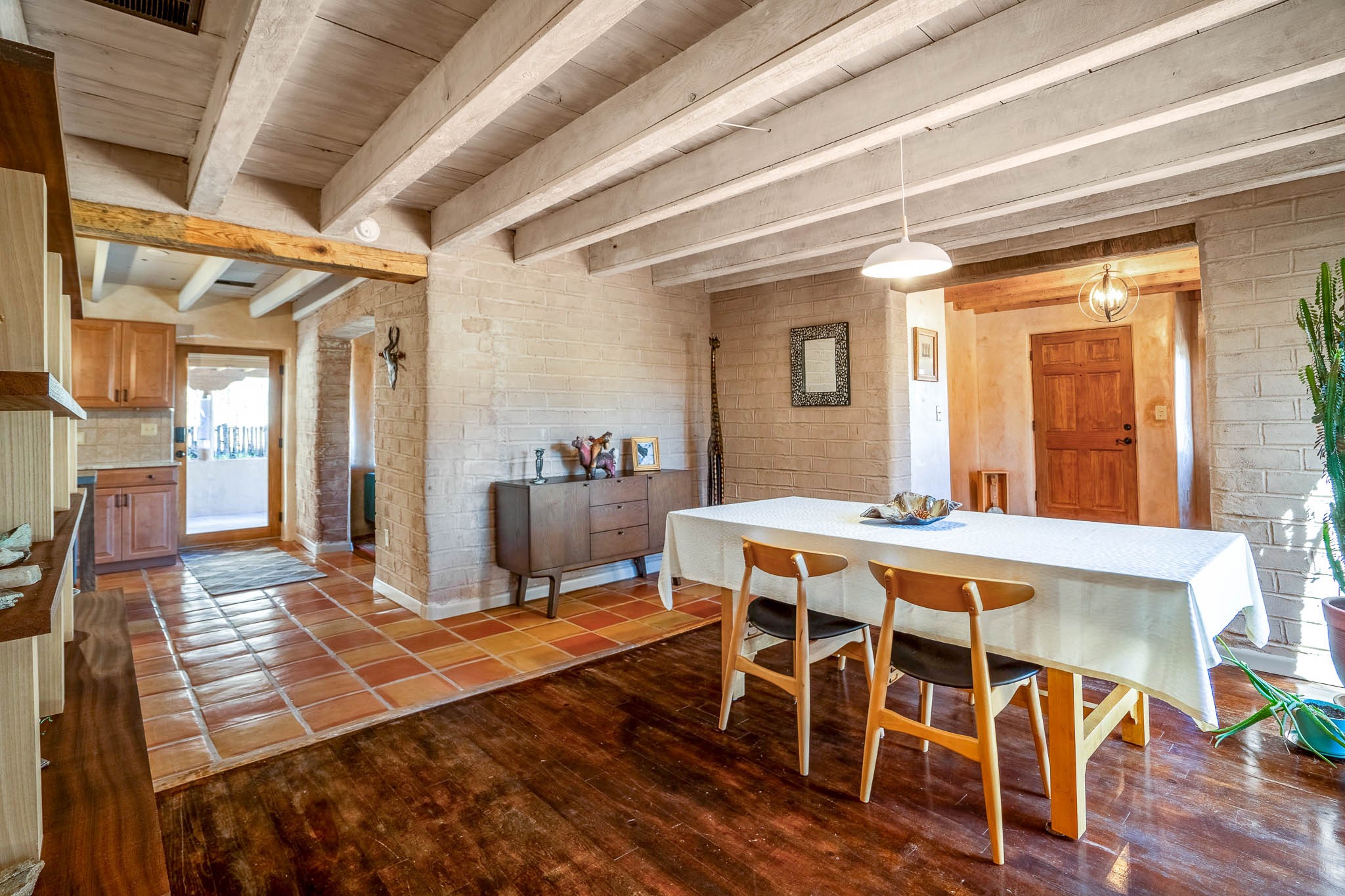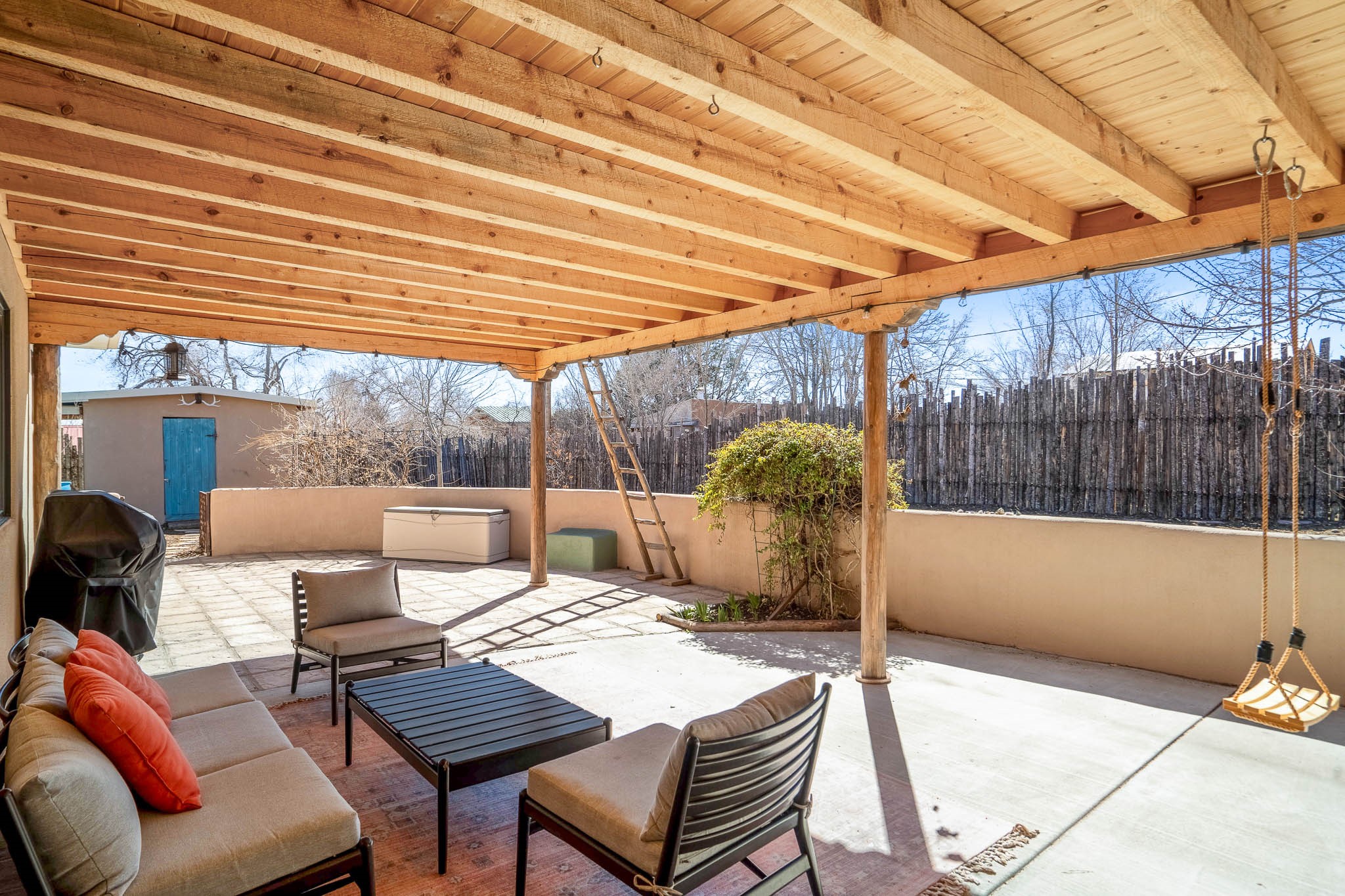 This delightful Santa Fe gem, nestled on a generous 1/4-acre city lot, was completely renovated about 8 years ago and offers approximately 1,913 sq. ft. of living space. Boasting classic Santa Fe charm, the home features traditional vigas, a large country kitchen, granite countertops, and beautiful champagne plaster walls. Enjoy ample storage throughout, gas cooking, and custom details including nichos and wood and Saltillo tile floors.With 3 bedrooms and 2 full baths, this home includes two cozy fireplaces, forced air heating, and central A/C. The pitched roof adds to the Southwestern style, while the newly constructed, expansive portal with a reinforced roof is perfect for taking in both city and mountain views.The property also offers a wealth of additional amenities: two carports (one with ample space for 3-4 cars), a one-car garage, shed, and large driveway gates that easily accommodate an RV or trailer. Beautifully landscaped grounds are complemented by a professionally installed manifold for a sprinkler system. This versatile property is private and in a great location near the Santa Fe River and the River Trail, Alto Park and the Casa Solana Shopping Center. Come See!