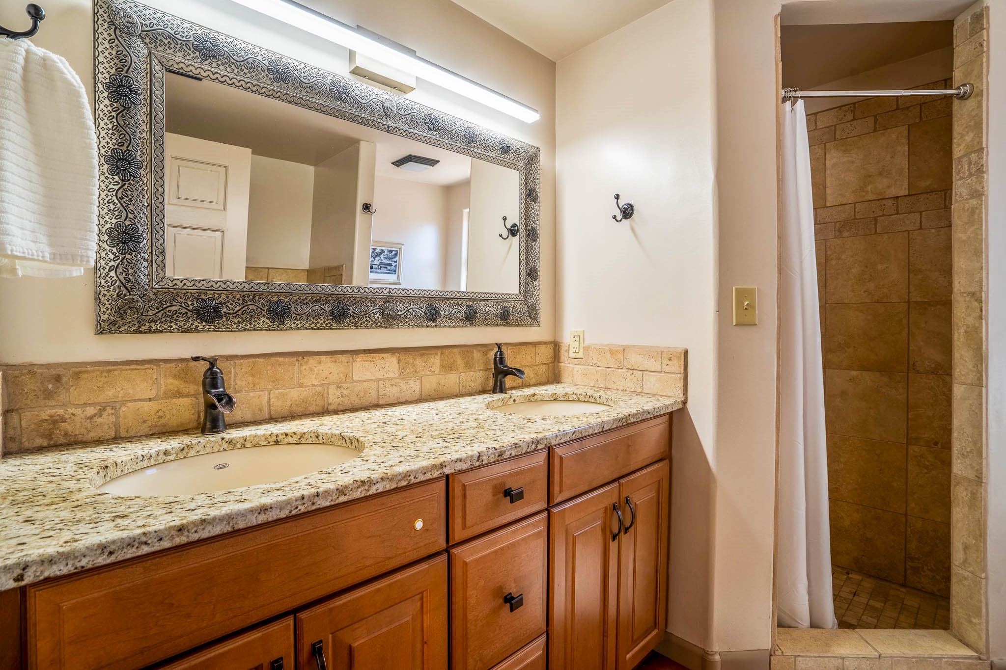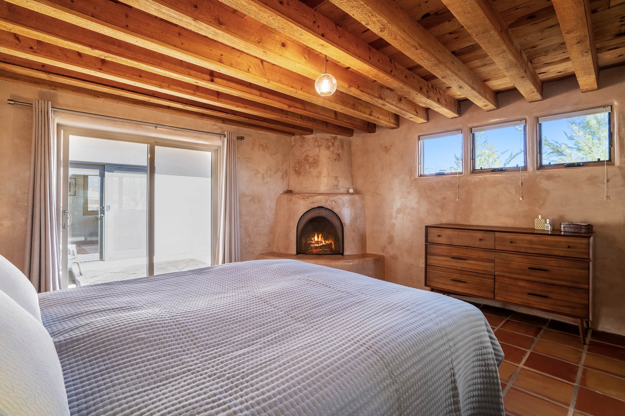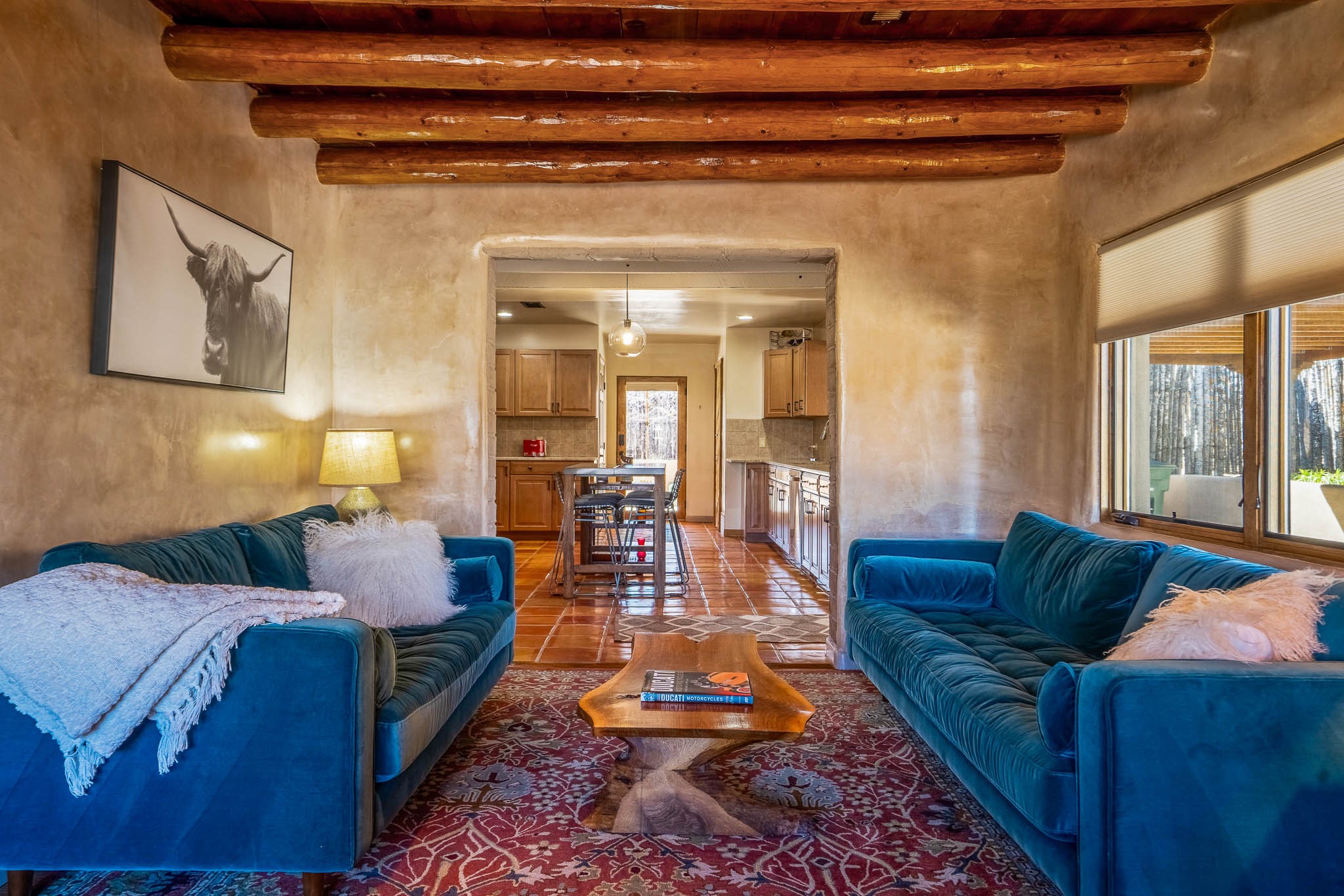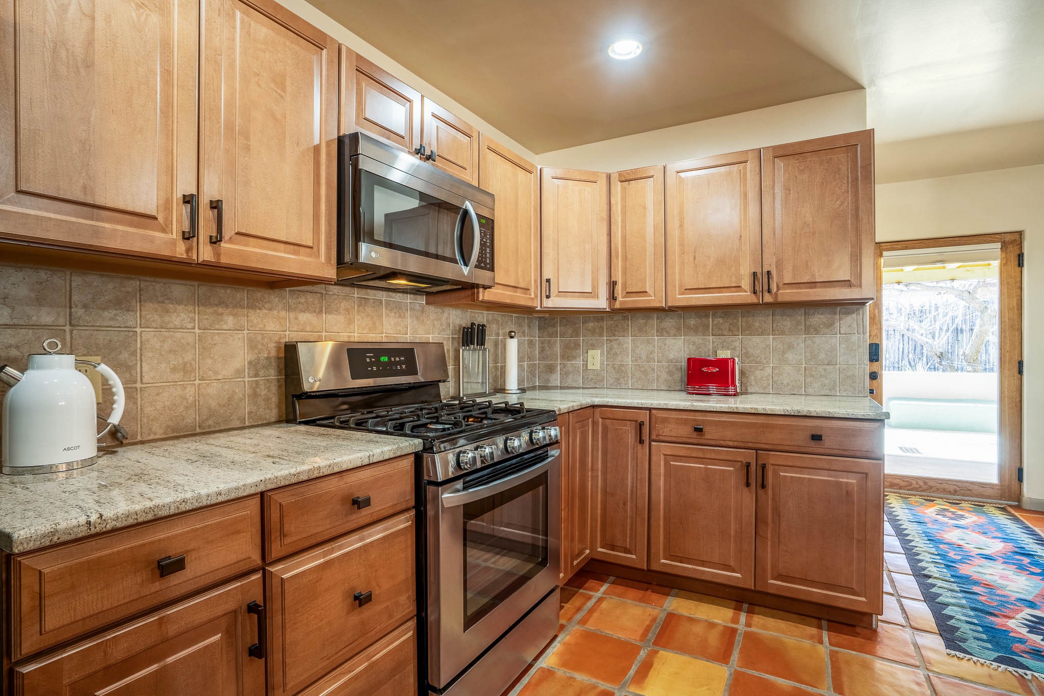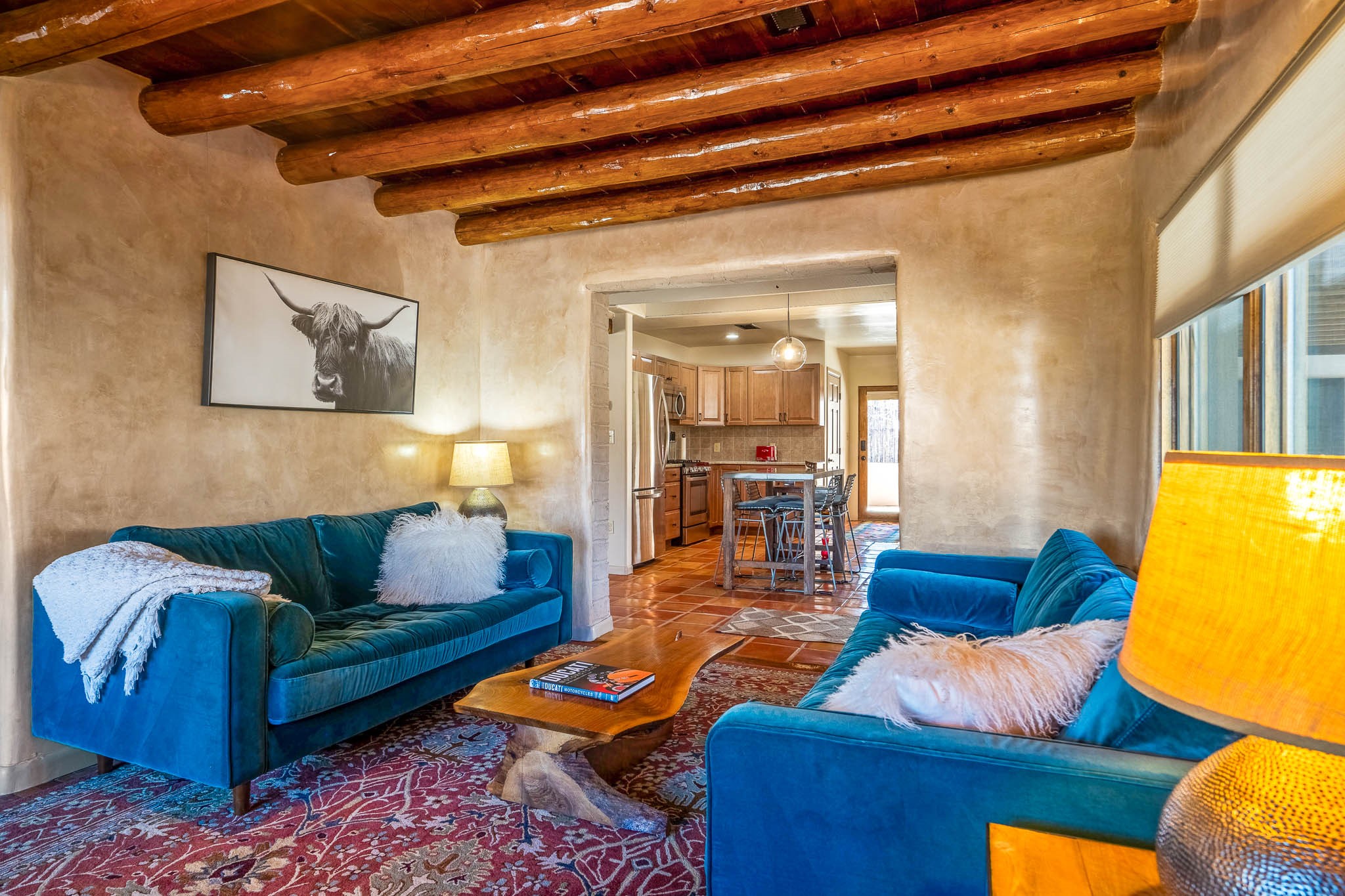 This delightful Santa Fe gem, nestled on a generous 1/4-acre city lot, was completely renovated about 8 years ago and offers approximately 1,913 sq. ft. of living space. Boasting classic Santa Fe charm, the home features traditional vigas, a large country kitchen, granite countertops, and beautiful champagne plaster walls. Enjoy ample storage throughout, gas cooking, and custom details including nichos and wood and Saltillo tile floors.With 3 bedrooms and 2 full baths, this home includes two cozy fireplaces, forced air heating, and central A/C. The pitched roof adds to the Southwestern style, while the newly constructed, expansive portal with a reinforced roof is perfect for taking in both city and mountain views.The property also offers a wealth of additional amenities: two carports (one with ample space for 3-4 cars), a one-car garage, shed, and large driveway gates that easily accommodate an RV or trailer. Beautifully landscaped grounds are complemented by a professionally installed manifold for a sprinkler system. This versatile property is private and in a great location near the Santa Fe River and the River Trail, Alto Park and the Casa Solana Shopping Center. Come See!