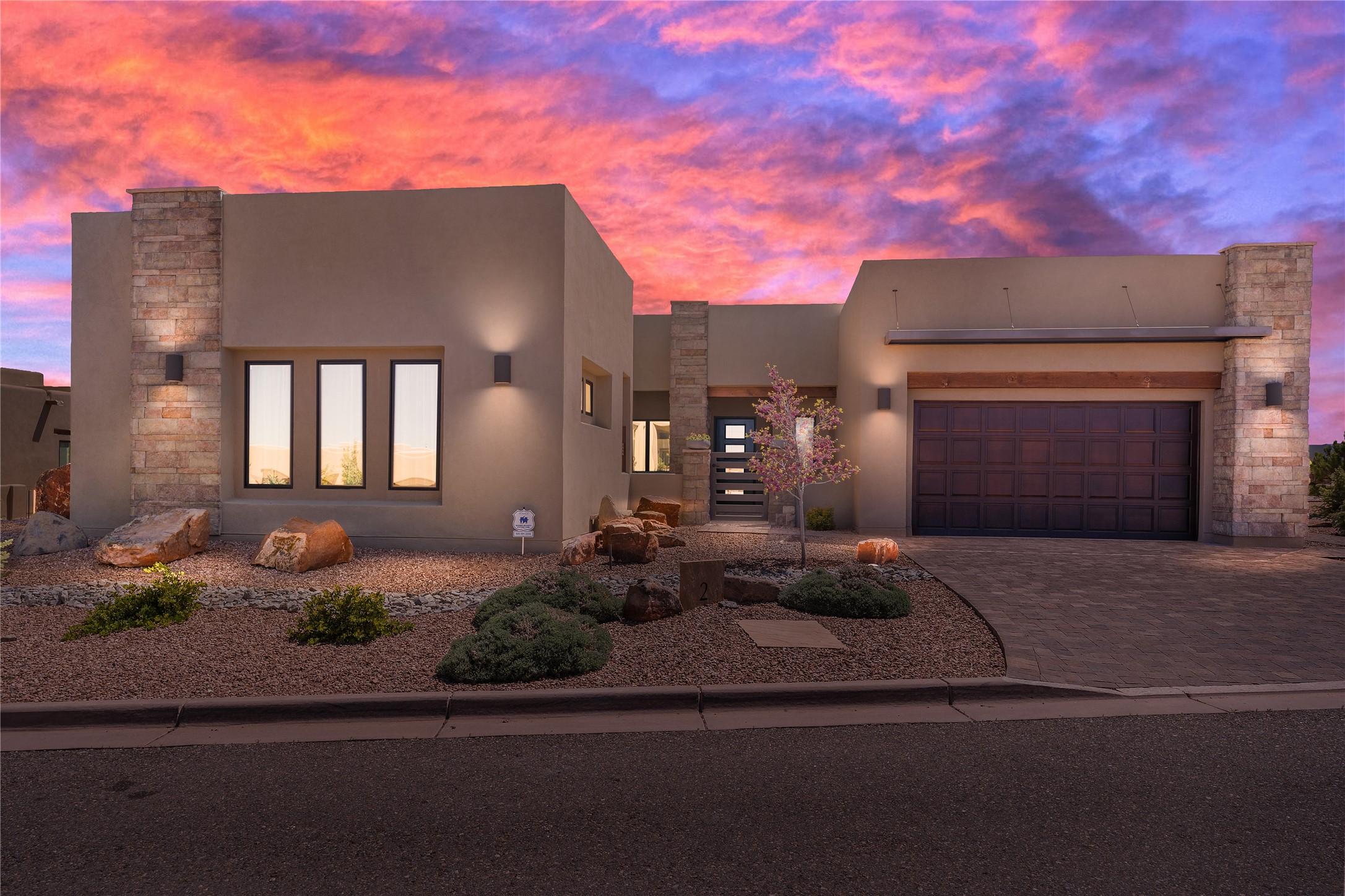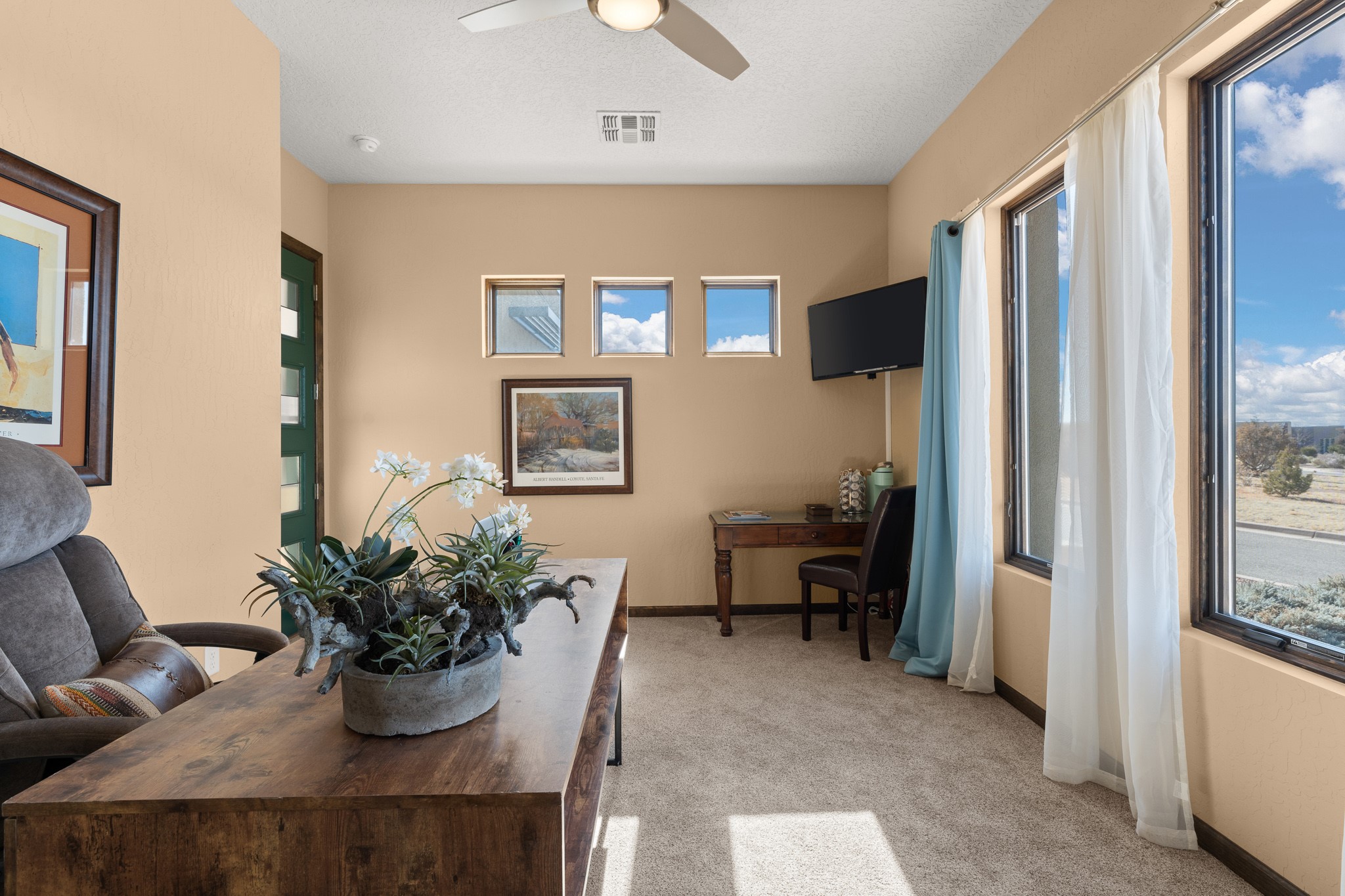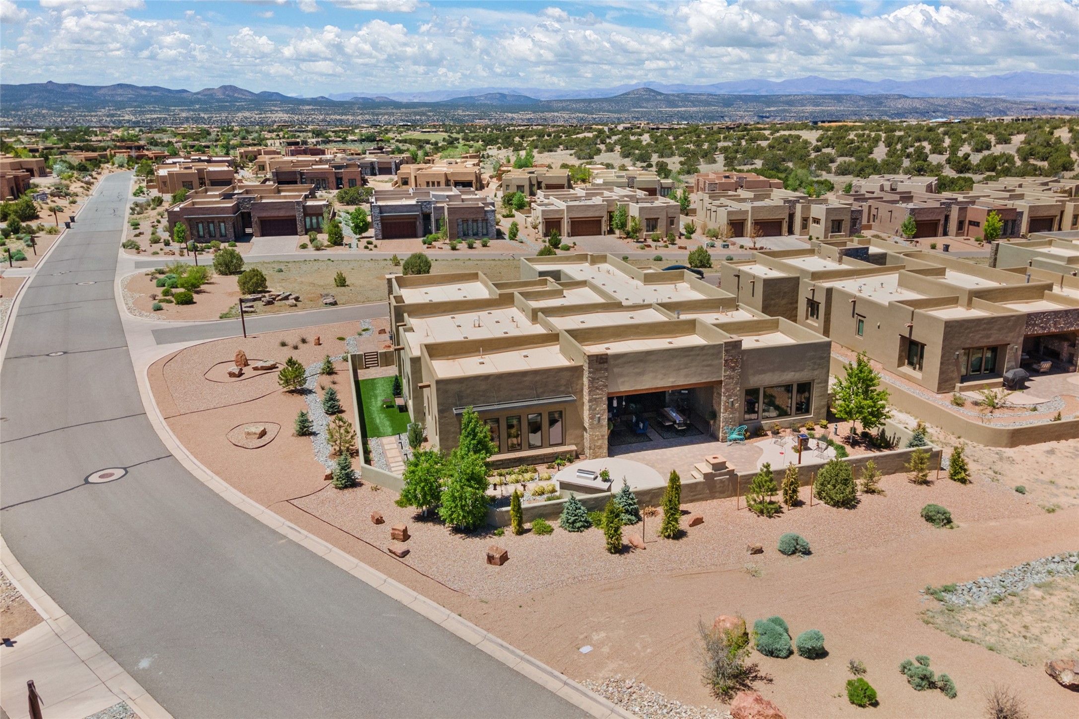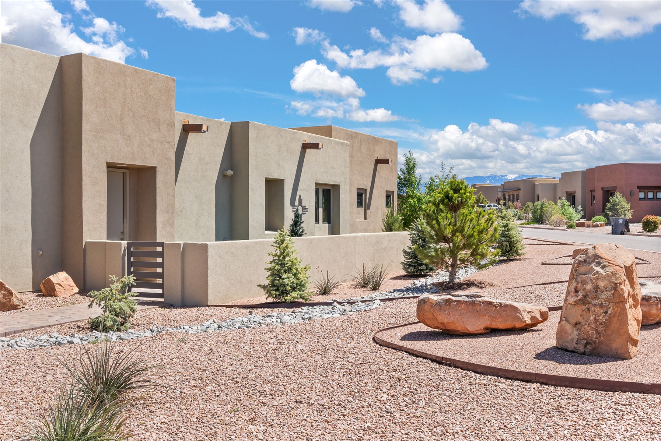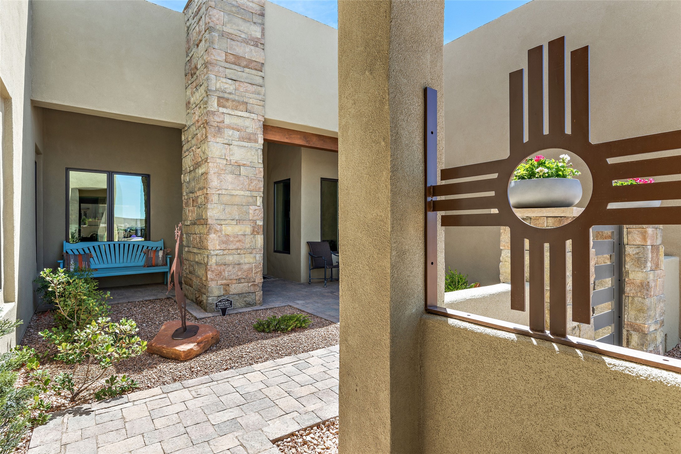 This immaculate, semi-custom Las Campanas home offers a wonderful blend of privacy, space, and mountain views. Set on a desirable corner lot, the outdoor living spaces are superb. Beautifully landscaped brick and stone areas flow from the interior for seamless al fresco living. Thoughtfully designed, this home balances traditional Santa Fe elements with a contemporary finish. A welcoming courtyard sets the tone and leads to a spacious floor plan ideal for relaxation, entertainment, or hosting out-of-town guests. The 5 bed/5 bath plan contains ample space for all aspects of life. Abundant light streams through the large east windows in the primary bedroom, great room, and sunroom. With smart-home functionality, stone walls, high arches, tray ceilings, and elegant finishes, this home stands apart. Extensive upgrades include a 5-foot linear gas fireplace with double wood mantels, a deep portal with kiva-inspired wood-burning fireplace and an integrated outdoor gas kitchen. The living room's 4 panel sliding doors enable fluid indoor-outdoor entertainment. Indulge culinary explorations in the Chef's kitchen with top-tier appliances,12x6 ft. granite island, wine cooler and walk-in pantry. The dining room easily seats 8-10 guests. The primary suite offers an oversized bedroom, spa-like soaking tub, extra-large walk-in shower, and double closet. 3 additional bedrooms surround a spacious hub perfect for hobbies, media, meditation, or workout. The casita offers flexibility as an office or serene guest quarters. 3 green belts surround the home and frame the Sangre de Cristo and Jemez mountains with sunrises and sunsets. Evergreens and xeriscaping provide year-round beauty and a forum for birdwatching in this Audubon Sanctuary neighborhood. Minutes from The Club at Las Campanas, enjoy convenient access to resort amenities in Santa Fe's only gated golf course community. *Seller has identified personal property available as a separate Bill-of-Sale for a move-in-ready transaction.